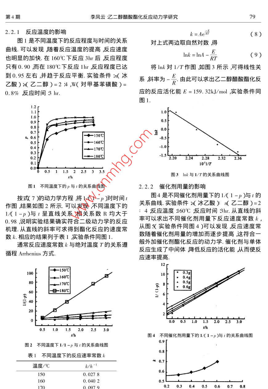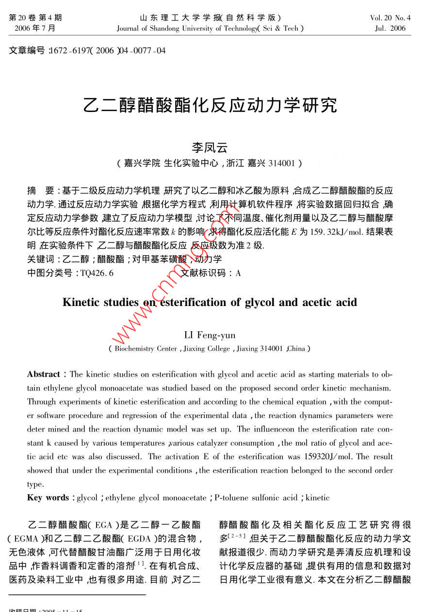 第20卷第4期山東理工大學(xué)學(xué)報(bào)自然科學(xué)版Vol 20 No 42006年7月Journal of Shandong University of Technolog Sci TechJul.2006文章編號(hào)672-6197(206)04-0077-04乙二醇醋酸酩化反應(yīng)動(dòng)力學(xué)研究李鳳云(嘉興學(xué)院生化實(shí)驗(yàn)中心,浙江嘉興314001)摘要:基于二級(jí)反應(yīng)動(dòng)力學(xué)機(jī)理研究了以乙二醇和冰乙酸為原料合成乙二醇醋酸酯的反應(yīng)動(dòng)力學(xué)通過反應(yīng)動(dòng)力學(xué)實(shí)驗(yàn)根據(jù)化學(xué)方程式利用計(jì)算機(jī)軟件程序?qū)?shí)驗(yàn)數(shù)據(jù)回歸擬合確定反應(yīng)動(dòng)力學(xué)參數(shù)建立了反應(yīng)動(dòng)力學(xué)模型討論了不同溫度、催化劑用量以及乙二醇與醋酸摩爾比等反應(yīng)條件對(duì)酯化反應(yīng)速率常數(shù)k的影響求得酯化反應(yīng)活化能E為159.32 kJ/mol.結(jié)果表明在實(shí)驗(yàn)條件下乙二醇與醋酸酯化反應(yīng)反應(yīng)級(jí)數(shù)為準(zhǔn)2級(jí).關(guān)鍵詞:乙二醇;醋酸酯;對(duì)甲基苯磺酸;動(dòng)力學(xué)中圖分類號(hào):TQ426.6文獻(xiàn)標(biāo)識(shí)碼:AKinetic studies on esterification of glycol and acetic acideng-yunBiochemistry Center Jiaxing College Jiaxing 3 14001 ChinaAbstract: The kinetic studies on esterification with glycol and acetic acid as starting materials to obtain ethylene glycol monoacetate was studied based on the proposed second order kinetic mechanismThrough experiments of kinetic esterification and according to the chemical equation with the computer software procedure and regression of the experimental data, the reaction dynamics parameters weredeter mined and the reaction dynamic model was set up. The influenceon the esterification rate con-stant k caused by various temperatures warious catalyzer consumption, the mol ratio of glycol and ace-tic acid ete was also discusThe activation E of the esterification was 159320.J/mol. The resultshowed that under the experimental conditions, the esterification reaction belonged to the second ordertyKey words: glycol ethylene glycol monoacetate P-toluene sulfonic acid kinetic乙二醇醋酸酯(EGA)是乙二醇一乙酸酯醇醋酸酯化及相關(guān)酯化反應(yīng)工藝研究得很EGMA)和乙二醇二乙酸酯(ECDA)的混合物,多2-51但關(guān)于乙二醇醋酸酯化反應(yīng)的動(dòng)力學(xué)文無色液體可代替醋酸甘油酯廣泛用于日用化妝獻(xiàn)報(bào)道很少.而動(dòng)力學(xué)研究是弄清反應(yīng)機(jī)理和設(shè)品中作香料調(diào)香和定香的溶劑在有機(jī)合成、計(jì)化學(xué)反應(yīng)器的基礎(chǔ)提供有用的信息和數(shù)據(jù)對(duì)醫(yī)藥及染料工業(yè)中也有很多用途.目前對(duì)乙二日用化學(xué)工業(yè)很有意義本文在分析乙二醇醋酸山東理工大學(xué)學(xué)撇自然科學(xué)版)2006年酯合成工藝原理的基礎(chǔ)上,研究了以對(duì)甲基苯磺冰醋酸分子中的羥基發(fā)生縮水反應(yīng)生成12酸為催化劑合成乙二醇醋酸酯的反應(yīng)條件對(duì)反應(yīng)乙二醇醋酸單酯由于乙酰基CH3COO-的空間速率常數(shù)的影響研究了不同溫度催化劑用量以位域比羥基HO-的空間位域大得多增加12及醋酸與乙二醇摩爾比等反應(yīng)條件下乙二醇醋酸乙二醇醋酸單酯中的羥基與另一個(gè)醋酸分子中的酯化動(dòng)力學(xué)過程從而獲得了相應(yīng)反應(yīng)條件下的羧基進(jìn)一步縮水成酯的難度因此本反應(yīng)比一元反應(yīng)速率常數(shù)k和反應(yīng)活化能E.羧酸、一元醇的酯化反應(yīng)復(fù)雜.該反應(yīng)存在如下化學(xué)平衡1實(shí)驗(yàn)CH3COOH+HOCH,CH2OH冷→CH, COOCH, CH,OH +H,O1.1實(shí)驗(yàn)原料平衡常數(shù)可表示為乙二醇含量99%L CH, COOCH, CH,OH I H,O]冰醋酸含量≥98%K= CH, COOH I HOCH, CH, OH] (2對(duì)甲基苯磺酸進(jìn)一步乙二醇醋酸單酯與冰醋酸反應(yīng)生成乙1.2實(shí)驗(yàn)過程醇二醋酸酯反應(yīng)如下式表示將計(jì)量的冰醋酸加入干燥的三口瓶中,加入CH3COOH+CH3 COOCH2CH2OH臺(tái)→對(duì)甲基苯磺酸催化劑混合均勻后把過量的乙二CH COOCH, CH, OOCCH3+H2O醇放入滴液漏斗中滴液漏斗置于三口瓶上端與根據(jù)該機(jī)理反應(yīng)速度可表示為之相連,三口瓶上安裝攪拌器在室溫下開動(dòng)攪拌器控制乙二醇滴加速度約0.5h滴加完畢d st這一操作為預(yù)反應(yīng)反應(yīng)過程中放出熱量.預(yù)反應(yīng)結(jié)束后將三口瓶置于TC-15套式恒溫器中隨k,[ CH, COOH I CH, COOCH, CH,OH] (3)時(shí)將溫度控制在預(yù)定的溫度范圍內(nèi)進(jìn)行回流反將式2)入式3)得應(yīng)1hr這一過程為初反應(yīng).為控制反應(yīng)的激烈程d st 1度防止碳化現(xiàn)象的出現(xiàn)初反應(yīng)階段應(yīng)將調(diào)壓器h A[ CH, COoh I CH, COOH I HOCH, CH, OH J置于100V左右為宜初反應(yīng)結(jié)束后為得到純度[H2O](4)較高的乙二醇醋酸酯進(jìn)行常壓反應(yīng)蒸餾將反應(yīng)為了簡(jiǎn)化求解假設(shè)〔i)由于本實(shí)驗(yàn)采用生成的水及時(shí)蒸出嚴(yán)衡向目的產(chǎn)物方向移動(dòng)控乙二醇大量過量其濃度在反應(yīng)過程中可近似為制加熱速度與水生成量一致同時(shí)控制蓋液溫度常數(shù)(i)由于水的生成量隨時(shí)利用反應(yīng)蒸餾蒸不易過高以防止產(chǎn)品分解.反應(yīng)總計(jì)3h出其濃度在反應(yīng)過程中變化不大特別是在反應(yīng)1.3反應(yīng)動(dòng)力學(xué)試驗(yàn)程度不大的情況下這種假設(shè)是合