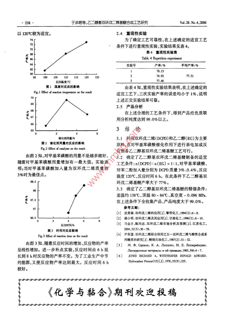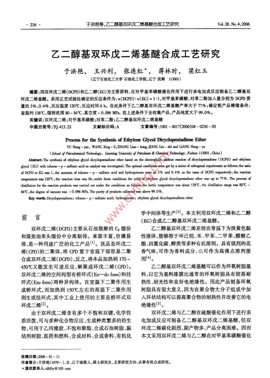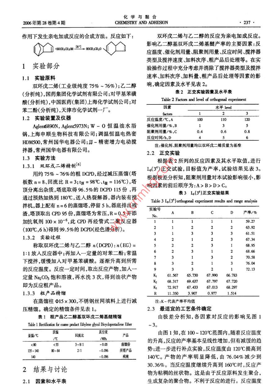 于洪艷等,乙二醵基雙環(huán)戊二矯基醚合成工藝研究vdl.28.No4,2006乙二醇基雙環(huán)戊二烯基醚合成工藝研究于洪艷,王興利,張連紅,蔣林時(shí),梁紅玉(遼寧石油化工大學(xué)石油化工學(xué)院遼寧撫順11301)摘要用雙環(huán)戊二烯(DCPD)和乙二醇(EG)為主要原料,在對(duì)甲基苯磺酸催化作用下進(jìn)行親電加成反應(yīng)制備乙二醇基雙環(huán)戊二烯基醚。采用正交試驗(yàn)法確定的反應(yīng)條件為:n(DPT):n(EC)=1:1,對(duì)甲基苯磺酸、對(duì)苯二酚加入量分別為DCPD質(zhì)量的3%、0.4%,反應(yīng)溫度10℃,反應(yīng)時(shí)間6h。在此條件下乙二醇基雙環(huán)戊二烯基醚產(chǎn)率大于7%;確定粗產(chǎn)品精餾條件:釜溫約38℃,餾程范圍80~84℃、真空度-0.096MPa.在上述條件下全收集產(chǎn)品,產(chǎn)品純度大于99.0%。關(guān)鍵詞:雙環(huán)戊二烯;對(duì)甲基苯磺酸;對(duì)苯二酚;乙二醇基雙環(huán)戊二烯基醚中圖分類(lèi)號(hào):TQ413.23文獻(xiàn)標(biāo)識(shí)碼:A文章編號(hào):1001-0017(200604-0236-0Process for the Synthesis of Ethylene Glycol Dicyclopentadiene EtherYU Hong-yan, WANG Xing-li, ZHANG Lian-hong, JIANG Lin-shi and LIANG Hong-yuSchool f Petrochemical Technology, Liooning University of Petroleun& Chemial Tecnology, Fushun 113001, China)bstract: The synthesis o ethylene dyood dicyclopentadiene ether based on the electrophilic addtion reaction of dicyclopentadiene( DCPD)and ethylenedycol(EG)with toluene-p-ulfonic acid as catalyst was investigated. The optimal conditions were got by a series of orthogonal experiments as follows: the ratioo DCPD to EG was 1, the amounts of toluene-p-slfonic acid and hydroquinone were as 3% and 0.4% as the mass of DCPD respectively, the reactionature was 120'C, the reaction time was 6h, under these conditions the yeild of ethylene glycol dicyclopentadiene ether was up to 77%. The process dtion for the reaction products was carried out under the conditions as follows: the kettle temperature was about 138C, the distillation range was 80C84C, the degree of vacuum was-0.096 MPa. The purity of products collected was above 99Key words: Dicyclopentadiene: toluene-p-sulfonic acid; hydroquinone: ethylene glycol dicyclopentadiene ether前言學(xué)中間體等生產(chǎn)3。本文利用雙環(huán)戊二烯和乙二醇(EG)合成乙二醇基雙環(huán)戊二烯基醚。雙環(huán)戊二烯(DCPD)主要從石油裂解的C餾份乙二醇基雙環(huán)戊二烯基醚在常溫下為淡黃色黏和煤焦油苯頭餾份中分離制得。來(lái)源豐富,價(jià)廉易性液體能夠溶于環(huán)己烷、苯、甲苯、二甲苯、醋酸乙得,是一種用途廣泛的化工產(chǎn)品1。該品是環(huán)戊二酯、四氯化碳、醇類(lèi)等多種有機(jī)溶劑。具有強(qiáng)烈的花烯(CPD)的二聚體,將CPD置于室溫下很容易二聚香氣味,可作為香料成分,也可作為高沸點(diǎn)溶劑使合成雙環(huán)戊二烯(DCPD),反之,將本品加熱到170-用(4450℃又能發(fā)生可逆反應(yīng),解聚成環(huán)戊二烯(CPD)。乙二醇基雙環(huán)戊二烯基醚可以作為環(huán)氧樹(shù)脂基雙環(huán)戊二烯的空間構(gòu)型有橋環(huán)式(Em- do fom)和掛料,以它為基料漆膜比通常的環(huán)氧樹(shù)脂具有較高耐環(huán)式( Exo fom)兩種異構(gòu)體。在室溫下二聚作用生熱性、耐光性和良好電絕緣性。用此產(chǎn)品制備環(huán)氧成橋環(huán)式,而加熱到150℃左右的高溫下二聚作用樹(shù)脂具有很大意義,因?yàn)樵诰酆衔锎蠓肿咏M成中加則生成掛環(huán)式,其中工業(yè)上使用的主要是橋環(huán)式雙環(huán)狀結(jié)構(gòu)可以提高聚合物的耐熱性并改善它的電環(huán)戊二烯2絕緣性{由于雙環(huán)戊二烯含有多個(gè)不飽和雙鍵,化學(xué)性雙環(huán)戊二烯與乙二醇在硫酸催化作用下進(jìn)行親質(zhì)活潑,可與多種化合物反應(yīng)生成種類(lèi)繁多的衍生電加成反應(yīng)可制備乙二醇基雙環(huán)戊二烯基醚但雙物,可用于乙丙橡膠、不飽和聚酯、合成石油樹(shù)脂、黏環(huán)戊二烯碳化劇烈副產(chǎn)物多,產(chǎn)品分離困難。因而結(jié)劑樹(shù)脂、醫(yī)藥和燃料、合成材料、合成香料、有機(jī)化本文釆用雙環(huán)戊二烯與乙二醇在對(duì)甲基苯磺酸催化收稿日期:2006-01-11作者簡(jiǎn)介:于洪艷(1979-),女,遼寧凌源人,碩士研究生,主要研究方向:從事有機(jī)合成研究。通訊聯(lián)系人;lhly@163.c和化學(xué)與黏合2006年第28卷第4期CHEMISTRY AND ADHESION237作用下發(fā)生親電加成反應(yīng)的合成方法。反應(yīng)如下:雙環(huán)戊二烯與乙二醇的反應(yīng)為親電加成反應(yīng)。4B0CH2 CH aH [H'1-H0CR a1-0影響乙二醇基雙環(huán)戊二烯基醚產(chǎn)率的主要因素:反應(yīng)溫度、催化劑用量阻聚劑用量、反應(yīng)時(shí)間、攪拌器類(lèi)型及攪拌速度、加料次序、粗產(chǎn)品后處理等。在實(shí)1實(shí)驗(yàn)部分驗(yàn)操作過(guò)程中充分考慮并消除了攪拌器類(lèi)型及攪拌1.1實(shí)驗(yàn)原料速率、加料次序、加料量、粗產(chǎn)品后處理等因素的影雙環(huán)戊二烯(工業(yè)級(jí)純度75%-76%);乙二醇響確定因素及水平見(jiàn)表2(分析純),國(guó)藥集團(tuán)化學(xué)試劑有限公司;對(duì)甲基苯磺表2正交實(shí)驗(yàn)因素及水平表酸(分析純),中國(guó)醫(yī)藥(集團(tuán))上?;瘜W(xué)試劑公司;對(duì)Table 2 Factors and level of orthogonal experiment苯二酚(分析純),天津市化學(xué)試劑一廠因素水平lelfactors1.2實(shí)驗(yàn)裝置及儀器反應(y