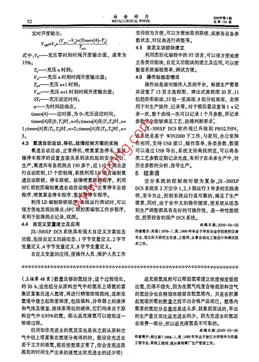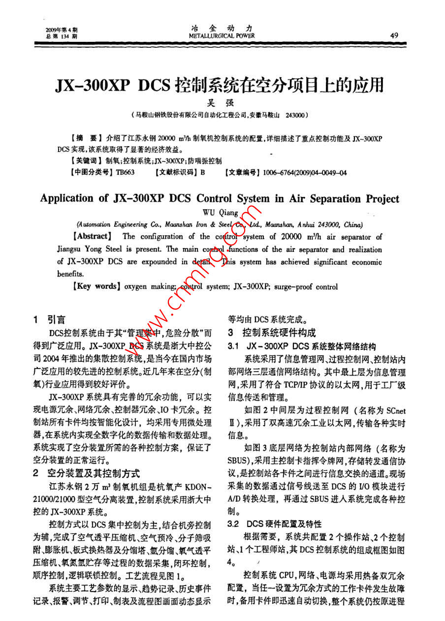 冶金動力134METALLURGICAL POWERJX-300 XP DCS控制系統(tǒng)在空分項目上的應(yīng)用吳強(馬鞍山鋼鐵股份有限公司自動化工程公司,安徽馬鞍山243000【摘要】介紹了江蘇永鋼2000mh制氧機控制系統(tǒng)的配置詳細(xì)描述了重點控制功能及X-300XPCS實現(xiàn),該系統(tǒng)取得了顯著的經(jīng)濟效益?!娟P(guān)鍵詞】制氧;控制系統(tǒng);』X-30XP;防喘振控制【中圖分類號】TB6【文獻標(biāo)識碼】B【文章編號】10067642094004904Application of JX-300XP DCS Control System in Air Separation ProjectwU Qian(Automation Engineering Co., Maashan Iron Steel Co., Lud, Maanshan, Anhui 243000, China)Abstract] The configuration of the control system of 20000 mm/h air separator ofJiangsu Yong Steel is present. The main control functions of the air separator and realizationof JX-300XP DCS are expounded in detail. This system has achieved significant economicbenefits[Key words] oxygen making: control system; JX-300XP; surge-proof control引言等均由DCS系統(tǒng)完成。DCS控制系統(tǒng)由于其“管理集中,危險分散”而3控制系統(tǒng)硬件構(gòu)成得到廣泛應(yīng)用。X-300 XP DCS系統(tǒng)是浙大中控公3.1JX-300 XP DCS系統(tǒng)整體網(wǎng)絡(luò)結(jié)構(gòu)司2004年推出的集散控制系統(tǒng)是當(dāng)今在國內(nèi)市場系統(tǒng)采用了信息管理網(wǎng)過程控制網(wǎng)控制站內(nèi)廣泛應(yīng)用的較先進的控制系統(tǒng)。近幾年來在空分(制部網(wǎng)絡(luò)三層通信網(wǎng)絡(luò)結(jié)構(gòu)。其中最上層為信息管理氧)行業(yè)應(yīng)用得到較好評價。網(wǎng)采用了符合TCPP協(xié)議的以太網(wǎng),用于工廠級JX-300XP系統(tǒng)具有完善的冗余功能,可以實信息傳送和管理現(xiàn)電源冗余網(wǎng)絡(luò)冗余、控制器冗余、IO卡冗余??厝鐖D2中間層為過程控制網(wǎng)(名稱為 CNet制站所有卡件均按智能化設(shè)計,均采用專用微處理Ⅱ),采用了雙高速冗余工業(yè)以太網(wǎng)傳輸各種實時器,在系統(tǒng)內(nèi)實現(xiàn)全數(shù)字化的數(shù)據(jù)傳輸和數(shù)據(jù)處理。信息系統(tǒng)實現(xiàn)了空分裝置所需的各種控制方案,保證了如圖3底層網(wǎng)絡(luò)為控制站內(nèi)部網(wǎng)絡(luò)(名稱為空分裝置的正常運行。BUS),采用主控制卡指揮令牌網(wǎng)存儲轉(zhuǎn)發(fā)通信協(xié)2空分裝置及其控制方式議是控制站各卡件之間進行信息交換的通道?,F(xiàn)場江蘇永鋼2萬m3制氧機組是杭氧產(chǎn)KDON-采集的數(shù)據(jù)通過信號線送至DCs的W模塊進行2100021000型空氣分離裝置控制系統(tǒng)采用浙大中AD轉(zhuǎn)換處理,再通過SBUS進人系統(tǒng)完成各種控控的JX-300XP系統(tǒng)。制??刂品绞揭訢CS集中控制為主,結(jié)合機旁控制32Dcs硬件配置及特性為輔完成了空氣透平壓縮機、空氣預(yù)冷、分子篩吸根據(jù)需要,系統(tǒng)共配置2個操作站、2個控制附膨脹機、板式換熱器及分餾塔、氬分餾、氧氣透平站、1個工程師站其DCS控制系統(tǒng)的組成框圖如圖壓縮機、氧氮氬貯存等過程的數(shù)據(jù)采集,閉環(huán)控制,4。順序控制邏輯聯(lián)鎖控制。工藝流程見圖1??刂葡到y(tǒng)CPU,網(wǎng)絡(luò)、電源均采用熱備雙冗余系統(tǒng)主要工藝參數(shù)的顯示趨勢記錄歷史事件配置,當(dāng)任一設(shè)置為冗余方式的工作卡件發(fā)生故障記錄、報警、調(diào)節(jié)打印制表及流程圖畫面動態(tài)顯示時,備用卡件即迅速自動切換,整個系統(tǒng)仍按原進程冶金動力20年第4METALLURGICAL POWER總第134污氮放空空氣氧壓縮系統(tǒng)預(yù)冷系統(tǒng)分餾塔系統(tǒng)空氣過濾系統(tǒng)氮壓縮系統(tǒng)空氣氬儲存分離系統(tǒng)空氣壓縮系統(tǒng)污氮純化系統(tǒng)污氮放空圖1空分裝置各個工藝系統(tǒng)工作,不影響整個系統(tǒng)的工作狀態(tài),工作備用卡件喪1系統(tǒng)規(guī)模表之間的運行狀態(tài)同步速度達1Mbp序號信號類型實際配置選用卡件備注14-20mA模擬量輸入操作站工程師站網(wǎng)卡網(wǎng)卡網(wǎng)卡網(wǎng)卡23454-20mA輸出數(shù)字量輸人數(shù)字量輸出合計SOnetⅡ33工程師站和操作站應(yīng)廠方要求,均采用西門子工控機,支持USB接口配有 SUPCON專用工業(yè)鍵盤及19"DELL液晶圖2 CNet‖網(wǎng)絡(luò)冗余結(jié)構(gòu)顯示器。操作系統(tǒng)采用 WINDOWS2000sP4配有主控制卡主控制卡雙 ScnetIl網(wǎng)卡。工程師站,配有 SUPCON的系統(tǒng)組態(tài)軟件,可進行系統(tǒng)組態(tài),控制回路程序(語言+圖形)編制流程圖制作,趨勢圖和報警組態(tài),報表制作|數(shù)梨特數(shù)*|o機蹇34JX-300 XP DCS系統(tǒng)組態(tài)特點X-300 XP DCS系統(tǒng)的組態(tài)工作是通過 SCKeySBUS-SI組態(tài)軟件來完成 SCKey組態(tài)軟件(含實時監(jiān)控軟10卡0件)是一個全面支持該系統(tǒng)各類控制方案的組態(tài)軟件平臺,是運用面向?qū)ο?O0P)技術(shù)和對象鏈接與圖3SBUS總線結(jié)構(gòu)示意嵌入(OLE2)技術(shù),基于中文 WINDOWS系列操作系操作站1操作站2工程師站統(tǒng)開發(fā)的32位應(yīng)用軟件界面友好(通過簡明的下拉菜單和彈出式對話框建立友好的人機對話界面),功能強大具有強大的在線幫助功能所有幫助均為中文組態(tài)方便簡單??亟M態(tài)軟件 SCKey集控制程序和監(jiān)控畫面的編制于一身,用戶可以根據(jù)自身特點選用常規(guī)控制方案及自定義方案,可選擇編程語言:SCX語言、SCC圖4DCS系統(tǒng)