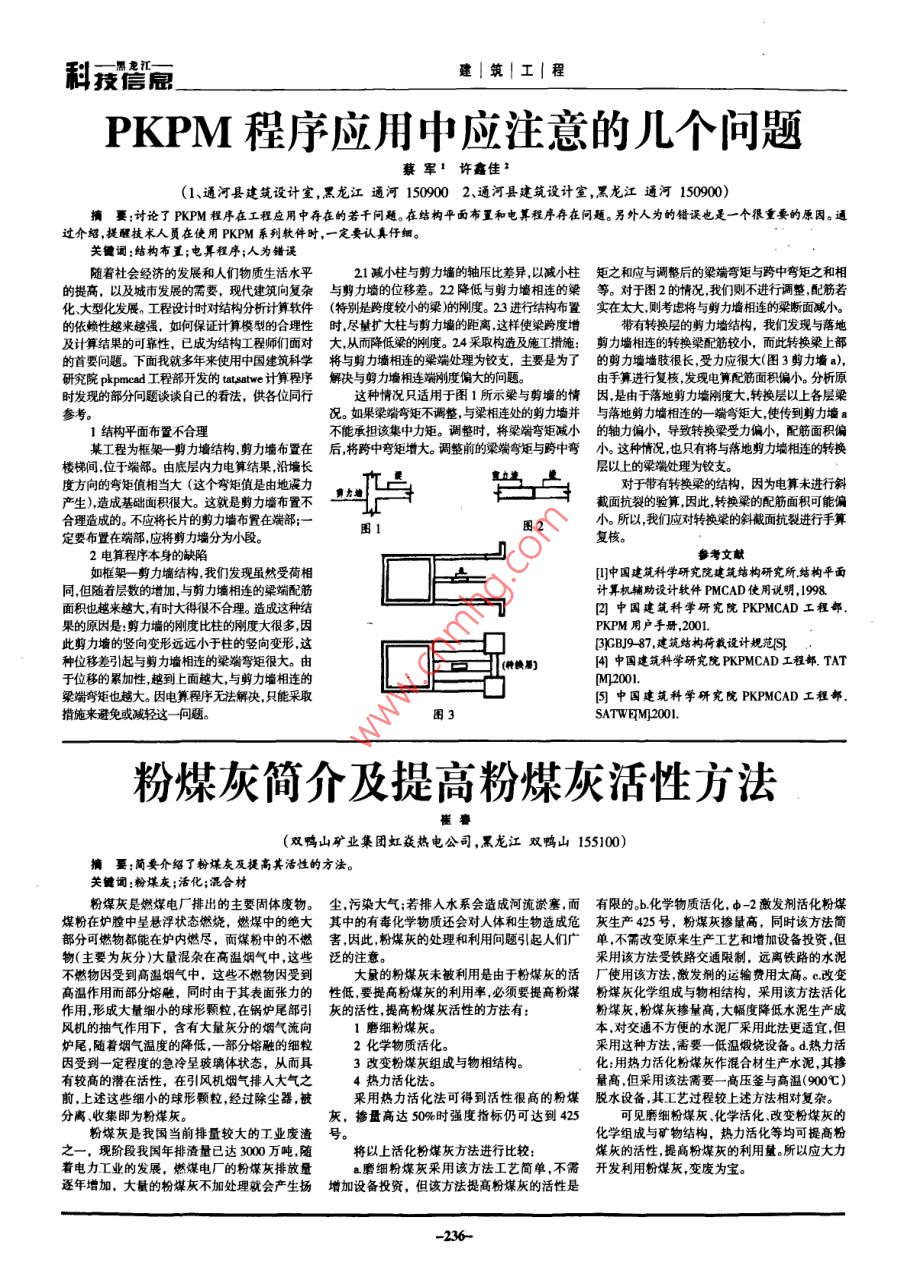 刮技信屈建|筑|工|程PKPM程序應用中應注意的幾個問題蔡軍1許鑫佳(Ⅰ、通河縣建筑設計室,黑龍江通河1509002、通河縣建筑設計室,黑龍江通河150900擴要:討論了PKPM程序在工程應用中存在的若干問題。在結構平面布置和電算程序存在問題。另外人為的錯誤也是一個很重要的原因。通過介紹,提醒技術人員在使用PKPM系列軟件時,一定要認真仔細關鍵詞:結構布工;電算程序;人為錯誤隨著社會經濟的發(fā)展和人們物質生活水平21減小柱與剪力墻的軸壓比差異,以減小柱矩之和應與調整后的梁端彎矩與跨中彎矩之和相的提高,以及城市發(fā)展的需要,現代建筑向復雜與剪力墻的位移差。22降低與剪力墻相連的梁等。對于圖2的情況我們則不進行調整配筋若叱、大型化發(fā)展。工程設計時對結構分析計箅軟件(特別是跨度較小的梁)剛度。23進行結構布置實在太大則考慮將與剪力墻相連的梁斷面減小。的依賴性越來越強,如何保證計算模型的合理性時,盡觸擴大柱與剪力墻的距離,這樣使梁跨度增帶有轉換層的剪力墻結構,我們發(fā)現與落地及計算結果的可靠性,已成為結構工程師們面對大從而降低梁的剛度。24采取構造及施工措施:剪力墻相連的轉換梁配筋較小,而此轉換梁上部的首要問題。下面我就多年來使用中國建筑科學將與剪力墻相連的梁端處理為鉸支,主要是為了的剪力墻墻肢很長受力應很大(圖3剪力墻a),研究院 pkpmcad工程部開發(fā)的 tatsatwe計箅程序解決與剪力墻相連端剛度偏大的向題。由手算進行復核,發(fā)現電算配筋面積偏小。分析原時發(fā)現的部分問題談談自己的看法,供各位同行這種情況只適用于圖1所示梁與剪墻的情因是由于落地剪力墻剛度大轉換層以上各層梁參考。況。如果梁端彎矩不調整,與梁相連處的剪力墻并與落地剪力墻相連的一端彎矩大,使傳到剪力墻a1結構平面布置不合理不能承擔該集中力矩。調整時,將梁端彎矩減小的軸力偏小,導致轉換梁受力偏小,配筋面積偏某工程為框架剪力墻結構剪力墻布置在后將跨中彎矩增大。調整前的梁端彎矩與跨中彎小。這種情況也只有將與落地剪力墻相連的轉換樓梯間位于端部。由底層內力電算結果沿墻長層以上的梁端處理為鉸支。度方向的彎矩值相當大(這個彎矩值是由地震力對于帶有轉換梁的結構,因為電算未進行斜產生)造成基礎面積很大。這就是剪力墻布置不截面抗裂的驗算因此轉換梁的配筋面積可能偏合理造成的。不應將長片的剪力墻布置在端部;一圖2小。所以我們應對轉換梁的斜截面抗裂進行手算定要布置在端部應將剪力墻分為小段2電算程序本身的缺陷參考文獻如框架一剪力墻結構我們發(fā)現雖然受荷相]中國建筑科學研究院建筑結構研究所結構平面計算機輔助設計軟件 PMCAD使用說明,1998面積也越來越大有時大得很不合理。造成這種結岡中國建筑科學研究院 PKPMCAD工程部果的原因是:剪力墻的剛度比柱的剛度大很多因PKPM用戶手冊,2001此剪力墻的豎向變形遠遠小于柱的豎向變形這阝3B987,建筑構荷載設計規(guī)范種位移差引起與剪力墻相連的梁端彎矩很大。由種換果中國建筑科學研究院 PKPMCAD工程部TAT于位移的累加性越到上面越大,與剪力墻相連的p2001梁端彎矩也越大。因電算程序無法解決只能采取]中國建筑科學研究院 PKPMCAD工程部措施來避免或減輕這一問題SATWEM:2001粉煤灰簡介及提高粉煤灰活性方法(雙鴨山礦業(yè)集團虹焱熱電公司,黑龍江雙鴨山155100)擴要:簡要介紹了粉煤灰及提高其活性的方法。關鍵詞:粉煤灰;活化;混合材粉煤灰是燃煤電廠排出的主要固體廢物。塵,污染大氣;若排入水系會造成河流淤塞,而有限的。b化學物質活化,中-2激發(fā)劑活化粉煤煤粉在爐膛中呈懸浮狀態(tài)燃燒,燃煤中的絕大其中的有毒化學物質還會對人體和生物造成?;疑a425號,粉煤灰摻量高,同時該方法簡部分可燃物都能在爐內燃盡,而煤粉中的不燃害,因此粉煤灰的處理和利用問題引起人們廣單,不需改變原來生產工藝和增加設備投資,但物(主要為灰分)大量混雜在高溫煙氣中,這些泛的注意。釆用該方法受鐵路交通限制,遠離鐵路的水泥不燃物因受到高溫煙氣中,這些不燃物因受到大量的粉煤灰未被利用是由于粉煤灰的活廠使用該方法激發(fā)劑的運輸費用太高。c改變高溫作用而部分熔融,同時由于其表面張力的性低,要提高粉煤灰的利用率,必須要提高粉煤粉煤灰化學組成與物相結構,采用該方法活化作用形成大量細小的球形顆粒在鍋爐尾部引灰的活性提高粉煤灰活性的方法有:粉煤灰,粉煤灰摻量高,大幅度降低水泥生產成風機的抽氣作用下,含有大量灰分的煙氣流向1磨細粉煤灰本,對交通不方便的水泥廠采用此法更適宜,但尾隨著煙氣溫度的降低,一部分熔融的細粒2化學物質活化采用這種方法需要一低溫煅燒設備。d熱力活因受到一定程度的急冷呈玻璃體狀態(tài),從而具3改變粉煤灰組成與物相結構?;脽崃罨勖夯易骰旌喜纳a水泥,其摻有較高的潛在活性,在引風機煙氣排入大氣之4熱力活化法。量高但采用該法需要一高壓釜與高溫(900℃)前,上述這些細小的球形顆粒經過除塵器,被采用熱力活化法可得到活性很高的粉煤脫水設備,其工藝過程較上述方法相對復雜。分離、收集即為粉煤灰?;?摻量高達50%時強度指標仍可達到425可見磨細粉煤灰化改變粉煤灰的粉煤灰是我國當前排量較