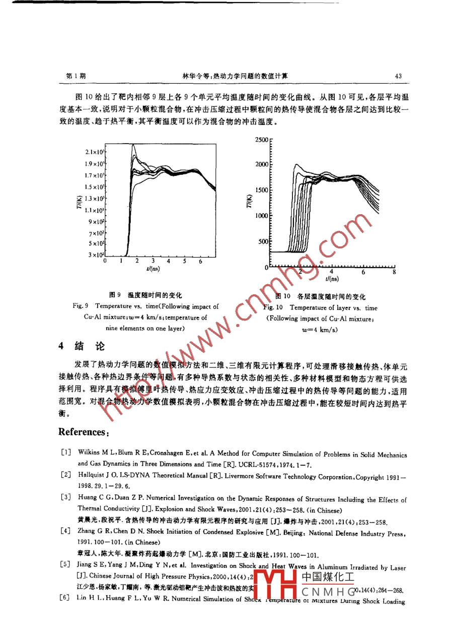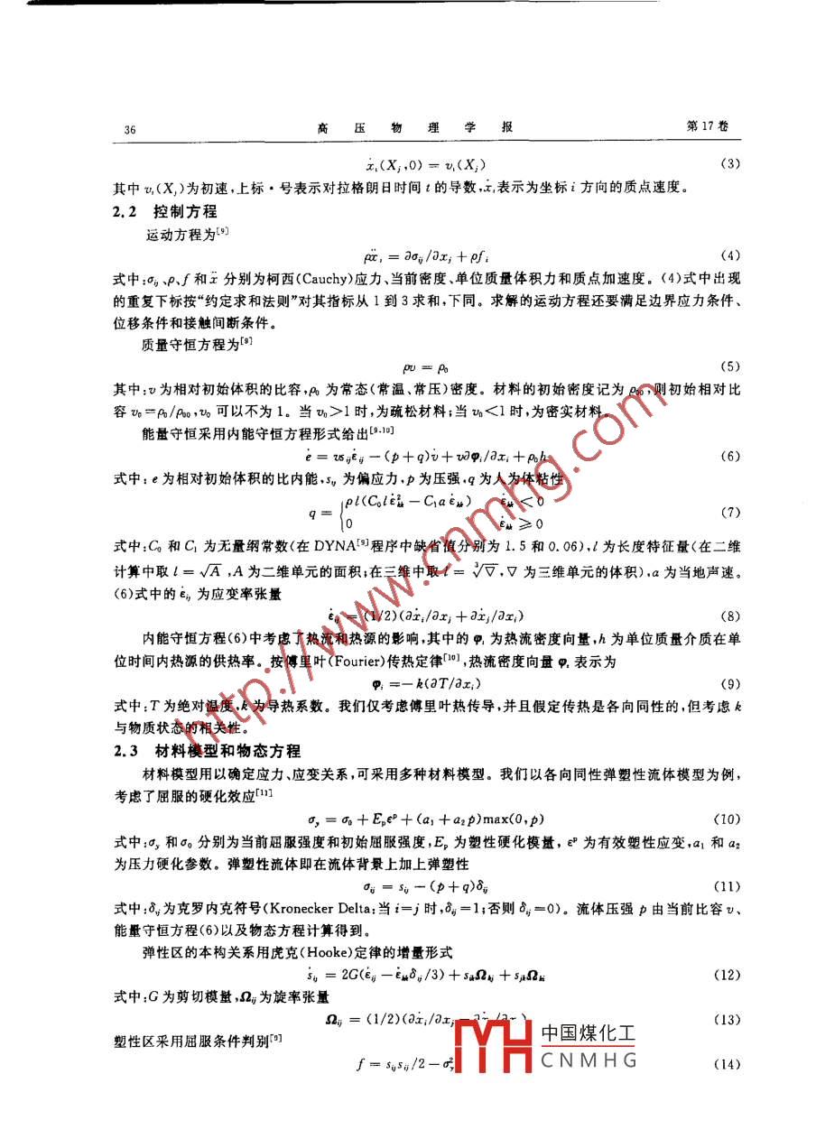 第17卷第1期高壓物理學(xué)報(bào)Vo.17,No.12003年3月CHINESE JOURNAL OF HIGH PRESSURE PHYSICS文章編號(hào):10005773(2003)01-0035-10熱動(dòng)力學(xué)問題的數(shù)值計(jì)算林華令,黃風(fēng)雷(北京理工大學(xué),北京100081)摘要:對(duì)含熱傳導(dǎo)的流體動(dòng)力學(xué)方程組,用有限元方法進(jìn)行數(shù)值求解。采用傅里葉熱傳導(dǎo)計(jì)算熱流、用熱流連續(xù)條件計(jì)算單元間接觸面的溫度、用三角形傳熱法計(jì)算體單元表面的熱流,考慮各向同性彈塑性流體材料模型、三項(xiàng)式物態(tài)方程和導(dǎo)熱系數(shù)與狀態(tài)的相關(guān)性,給出了傅里葉熱傳導(dǎo)、接觸傳熱、熱應(yīng)力應(yīng)變效應(yīng)、以及混合物沖擊壓縮特性等算例。對(duì)混合物沖擊溫度的數(shù)值模擬表明,小顆粒混合物在沖擊壓縮過程中,顆粒間的溫度有差別、稍有波動(dòng),并隨時(shí)間趨向于一致,以至熱平衡。關(guān)詞:熱動(dòng)力學(xué);有限元法;數(shù)值模擬;熱效應(yīng);混合物中圖分類號(hào):O521;O241.82文獻(xiàn)標(biāo)識(shí)碼:A1引言由受熱或受沖擊引起的熱動(dòng)力過程涉及物質(zhì)的運(yùn)動(dòng)變形、熱傳導(dǎo)和狀態(tài)變化等數(shù)值模擬中通常根據(jù)問題所側(cè)重的方面將物質(zhì)輸運(yùn)和熱輸運(yùn)分離進(jìn)行數(shù)值分析,因而研制的計(jì)算程序可能需要兩套,套用于數(shù)值模擬動(dòng)力學(xué)過程另一套用于數(shù)值模擬熱傳導(dǎo)過程,兩套程序通過外部數(shù)據(jù)文件交換初始現(xiàn)場(chǎng)和計(jì)算結(jié)果,其復(fù)雜性和近似性顯而易見,當(dāng)然也限定了其適用性和通用性。也有含熱傳導(dǎo)的動(dòng)力學(xué)計(jì)算程序,但計(jì)算方法中往往在某些問題方面進(jìn)行了簡(jiǎn)化,通常采用近似的能量與溫度關(guān)系、不考慮溫度對(duì)熱力學(xué)狀態(tài)的影響3,當(dāng)然對(duì)數(shù)值模擬的能力也就有了一定的限制。對(duì)于物質(zhì)運(yùn)動(dòng)變形與傳熱時(shí)間尺度相差懸殊的問題,采用物質(zhì)輸運(yùn)和熱輸運(yùn)分離的方法是可取的;但在一些特定的問題中熱傳導(dǎo)可能對(duì)物質(zhì)的運(yùn)動(dòng)變形、以至狀態(tài)變化有較大的影響,分離的數(shù)值模擬方法對(duì)結(jié)果的準(zhǔn)確性影響就不可小視,得到的結(jié)果甚至可能不真實(shí)。在航天飛行器受氣流沖擊、炸藥起爆、強(qiáng)激光對(duì)物質(zhì)熱沖擊5、混合物的沖擊壓縮、沖擊壓縮后的熱傳導(dǎo)和熱輻射1等研究方面,可能涉及高溫高壓、而又需要考慮物質(zhì)間傳熱的問題。研制一個(gè)含熱傳導(dǎo)適用于高溫高壓、可處理流體彈塑性及失效、處理模型能力較強(qiáng)的計(jì)算程序是很有必要的。2計(jì)算方法2.1坐標(biāo)描述在固定的直角坐標(biāo)系中,質(zhì)點(diǎn)的初始(t=0)構(gòu)形為x(j=1,2,3),在t時(shí)刻的現(xiàn)時(shí)構(gòu)形為x(i1,2,3),表示成(X;,t)(1)初始條件x;(X1,0)=X(2)收稿日期:200204-18;修回日期:200206-30中國(guó)煤化工作者簡(jiǎn)介:林華令(1963-),男,碩士,高級(jí)工程師CNMHG高壓物理學(xué)報(bào)第17卷x(X,0)=v(X)其中v(X)為初速,上標(biāo)·號(hào)表示對(duì)拉格朗日時(shí)間t的導(dǎo)數(shù),x,表示為坐標(biāo)i方向的質(zhì)點(diǎn)速度。2.2控制方程運(yùn)動(dòng)方程為9式中:o、P、f和x分別為柯西( Cauchy)應(yīng)力當(dāng)前密度、單位質(zhì)量體積力和質(zhì)點(diǎn)加速度。(4)式中出現(xiàn)的重復(fù)下標(biāo)按“約定求和法則”對(duì)其指標(biāo)從1到3求和,下同。求解的運(yùn)動(dòng)方程還要滿足邊界應(yīng)力條件位移條件和接觸間斷條件質(zhì)量守恒方程為pu Po其中:v為相對(duì)初始體積的比容,A為常態(tài)(常溫、常壓)密度。材料的初始密度記為m0,則初始相對(duì)比容v=P/P,v可以不為1。當(dāng)w>1時(shí),為硫松材料;當(dāng)v<1時(shí),為密實(shí)材料能量守恒采用內(nèi)能守恒方程形式給出9:1e=一(p+q)v+w甲/3x;+ah(6)式中:e為相對(duì)初始體積的比內(nèi)能,s為偏應(yīng)力,p為壓強(qiáng),q為人為體粘性Pl(colEm-C1a Es)(7)EM≥0式中:C和C1為無量綱常數(shù)(在DYNA程序中缺省值分別為1.5和0.06),l為長(zhǎng)度特征量(在二維計(jì)算中取l=√A,A為二維單元的面積;在三維中取l=√,V為三維單元的體積),a為當(dāng)?shù)芈曀佟?6)式中的E,為應(yīng)變率張量(1/2)(ax;/0x;+x/7x;)內(nèi)能守恒方程(6)中考慮了熱流和熱源的影響,其中的平為熱流密度向量,h為單位質(zhì)量介質(zhì)在單位時(shí)間內(nèi)熱源的供熱率。按傅里葉( Fourie)傳熱定律0,熱流密度向量q表示為P,=-k(aT/3x;)式中:T為絕對(duì)溫度為導(dǎo)熱系數(shù)。我們僅考慮傅里葉熱傳導(dǎo),并且假定傳熱是各向同性的,但考慮k與物質(zhì)狀態(tài)的相關(guān)性2.3材料模型和物態(tài)方程材料模型用以確定應(yīng)力、應(yīng)變關(guān)系,可采用多種材料模型。我們以各向同性彈塑性流體模型為例考慮了屈服的硬化效應(yīng)[10,=0o+Epe+(a+a2 p)max(o, p)(10)式中:,和分別為當(dāng)前屈服強(qiáng)度和初始屈服強(qiáng)度,E為塑性硬化模量,eP為有效塑性應(yīng)變,a1和a2為壓力硬化參數(shù)。彈塑性流體即在流體背景上加上彈塑性σ=5-(p+q)6式中:為克羅內(nèi)克符號(hào)( Kronecker Delta:當(dāng)t=j時(shí),=1;否則b=0)。流體壓強(q