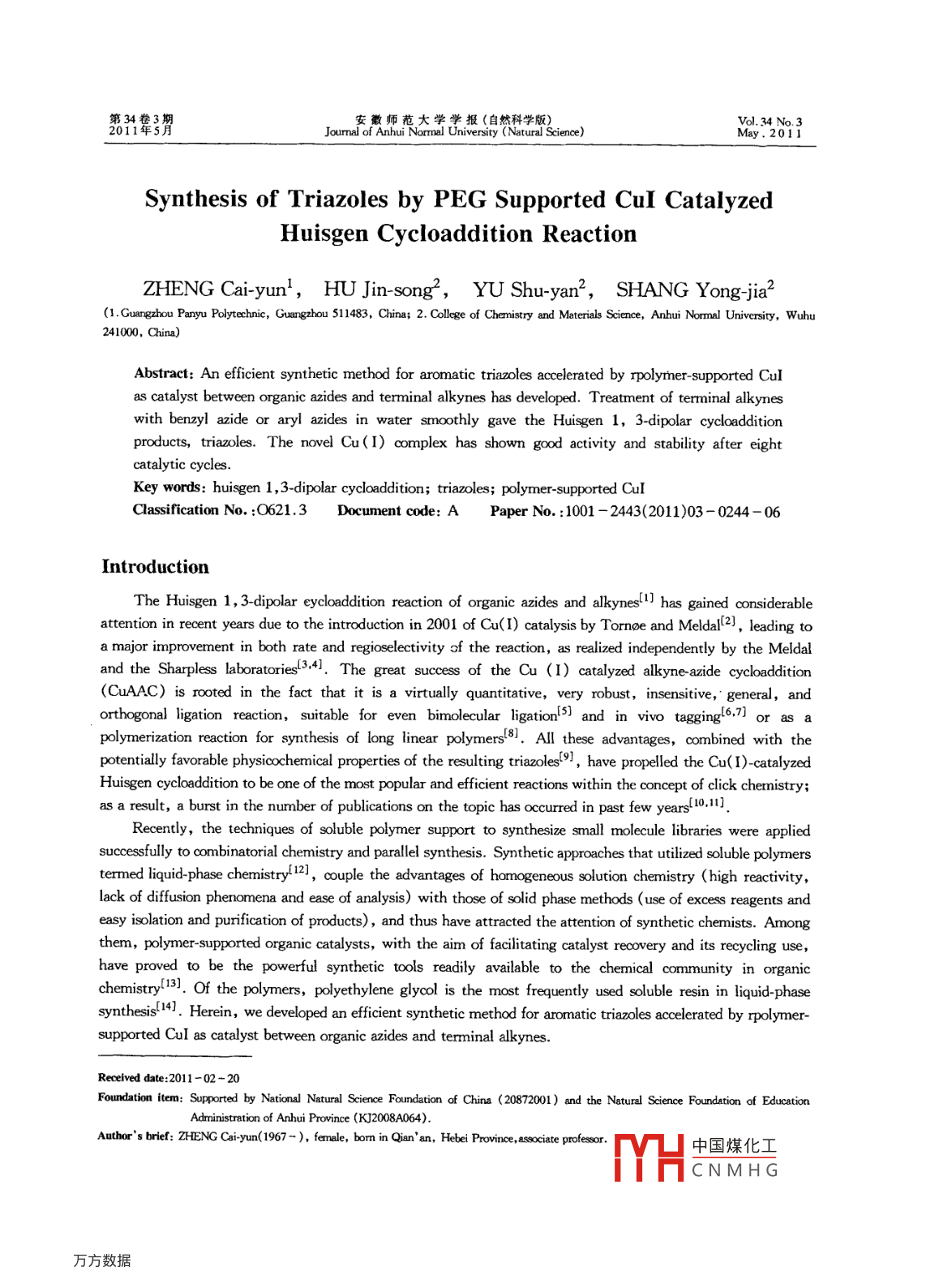 聚乙二醇支持的CuI催化Huisgen環(huán)加成反應(yīng)合成三氮唑