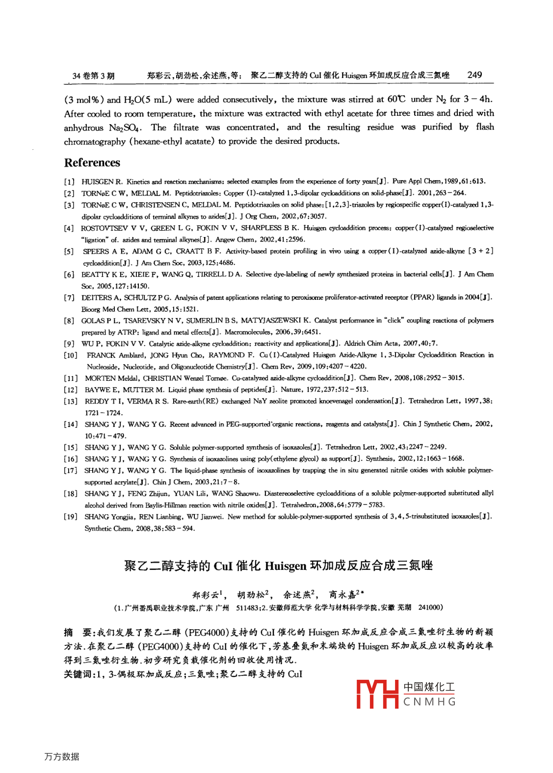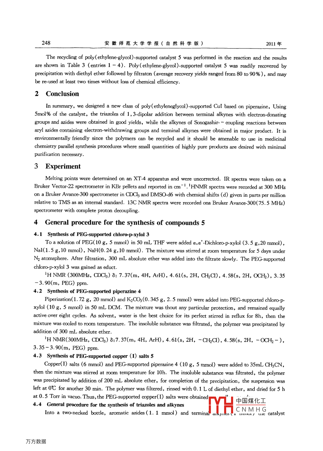 20314年3月安徽師范大學(xué)學(xué)報(自然科學(xué)版)Journal of Anhui Normal University ( Natural Science)May.201Synthesis of Triazoles by PEG Supported CuI CatalyzedHuisgen Cycloaddition ReactionZHENG Cai-yun' ,HU Jin-song2 ,YU Shu-yan2,SHANG Yong jia2(1. Guangzhou Panyu Polytechnic, Guangzhou 511483, China; 2. Collge of Chermistry and Materials Science, Anhui Normal University, Wuhu241000,China)Abstract: An efficient synthetic method for aromatic triazoles accelerated by rpolymer -supported Culas catalyst between organic azides and terminal alkynes has developed. Treatment of terminal alkyneswith benzyl axide or aryl azides in water smoothly gave the Huisgen 1, 3-dipolar cycloadditionproducts, triazoles. The novel Cu(I) complex has shown good activity and stability after eightcatalytic cycles.Key words: huisgen 1,3-dipolar cycloaddition; triazoles; polymer -supported CulClassification No. :0621.3 Document code: A Paper No. : 1001 - 2443(2011)03 - 0244-06IntroductionThe Huisgen 1, 3-dipolar eycloaddition reaction of organic azides and alkynest1] has gained considerableattention in recent years due to the introduction in 2001 of Cu(I) catalysis by Tornoe and Meldal(2}, leading toa major improvement in both rate and regioselectivity of the reaction, as realized independently by the Meldaland the Sharpless laboratoriesls.4. The great success of the Cu (I) catalyzed alkyne azide cyecloaddition(CuAAC) is rooted in the fact that it is a virtually quantitative, very robust, insensitive," general, andorthogonal ligation reaction, suitable for even bimolecular ligationfs) and in vivo taggingl6,7] or as apolymerization reaction for synthesis of long linear polymers81. All these advantages, combined with thepotentially favorable physicochemical properties of the resulting triazoles9! , have propelled the Cu( I)- catalyzedHuisgen cycloaddition to be one of the most popular and efficient reactions within the concept of click chemistry;asa result, a burst in the number of publications on the topic has occurred in past few yearslo,11.Recently, the techniques of soluble polymer support to synthesize small molecule libraries were appliedsuesfully to combinatorial chemistry and parall synthesis. Synthetic approaches that utilized soluble polymerstermed liquid phase chemistry12], c∞ouple the advantages of homogeneous solution chemistry (high reactivity,lack of diffusion phenomena and ease of analysis) with those of solid phase methods (use of excess reagents andeasy isolation and purification of products) , and thus have attracted the attention of synthetic chermists. Amongthem, polymer-supported organic catalysts, with the aim of facilitating catalyst recovery and its recycling use,have proved to be the powerful synthetic tools readily available to the chermical community in organicchemistrylis. Of the polymers, polyethylene glycol is the most frequently used soluble resin in liquid-phasesynthesis-14]. Herein, we developed an eficient synthetic method for aromatic triazoles accelerated by rpolymer-supported CuI as catalyst between organic azides and terminal alkynes.Received date:2011-02 - 20Foundation item: Supported by National Natural Science Foundation of China (20872001) and the Naturel Science Foundation of EducationAdninistration of Anbui Province (KJ2008A064).Author' s brief: ZHENG Cai-yun(1967 - ), femnale, bom in Qian' an, Hebei Province, sociate peoessor.中國煤化工MHCNMHG34卷第3期鄭彩云,胡勁松,余述燕,等:聚乙二醇支持的 Cul催化Huisgen環(huán)加成反應(yīng)合成三氮唑2451 Results and DiscussionAs part of our ongoing research into the liquid-phase synthesishi5 8,we chose to perform our reactions onthe soluble polymer supported poly ethyene glyol(PEG) with an average moleular weight of 4000 for its uniquenaturel19]. As depicted in scheme 1, the novel PEG supported-Cux are readily accessible in three steps startingwith PEG and a,a'-Dichloro-p xylol. Treatment of dihydroxy-PEG 4000 with NaH in THF in the presence ofNal, fllowed by addition of 1, 4-bis ( chloromethy!1) benzene could afford the polymeric benzyl chloride 3 innearly quantitatively yield. The polymeric benzy| chloride was converted to PEG-supported piperazine 4 byadding excess piperazine in the presence of K2CO3 in CH2Ch.And then the evaluation of its catalytic activity in Huisgen 1 ,3-dipolar cycloadditon was carried out.OoH.cCcme-oUaHNC NHgaNH_CuxCHgCN,tKxCO3 DCM, efu_CuXx=I.Br.CIScheme 1 The synthesis of the polymer supported-CuXInitially, screening of proper Cu complex was made in a model reaction of octyne and phenyl azide indichloromethane at 60C for 4 hours by using 5mol% catalyst (relative to octyne) (Table 1).N=5mol% catalystCH2Clz,60CTable 1 Screening of Cu complexes for the reaction of octyne and phenyl azideAzideAlkyneTime/hYielde.(5mol%)4)6zCuBrO)-Ns9<-Ns87Cul>-Nomnva. All the reactions were crried out in N. alkyme(1mmo), azide(1. 1mmo)b. Yields of isolated yield after flash chromatographyAs shown, in contrast with unmodified Cul, the polymer-supported-CuX showed more satistactory catalyticproperty, even for commonly deactivated CuBr and CuC, the resuling triazole were formed with 90% and 87%yields (entry 2, 3), respectively. Notably, the polymer-supported-CuI provided the desired product with thebest yield (entry 1). The unprecedented activity may be attributed to itsIn order to中國煤化工optimize this transformation, different reaction parameters (solvent, tempeTHCNM H G2.catalyst)were examined with the polymer -supported-CuI as catalyst. Some selected r246安徽師范大學(xué)學(xué)報(自然科學(xué)版)2011年After setle down with polymer- supported-CuI as catalyst, we further optimized this reaction, and theresults are summarized in Table 2. This reaction can be carried out in a variety of solvents, such as THF, DMF,DCM, benzene, dioxane and water. To our delight, water turns out to be the best solvent for this reaction,which is a choice for its safe