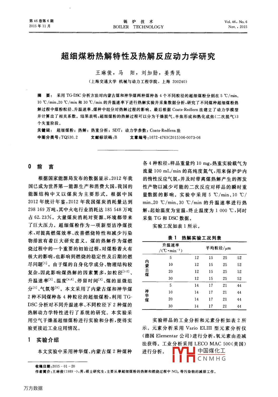 第46卷第6期鍋爐技術(shù)Vol 46, No 62015年11月BOILER TECHNOLOGYNov.,2015超細(xì)煤粉熱解特性及熱解反應(yīng)動(dòng)力學(xué)研究王琳俊,馬陽,劉加勛,姜秀民(上海交通大學(xué)機(jī)械與動(dòng)力工程學(xué)院,上海200240)摘要:采用TGDC分析方法對(duì)內(nèi)蒙古煤和神華煤兩種煤種各4個(gè)不同粒徑的超細(xì)煤粉分別在5℃/min10℃/min、20℃/min和30℃/min的升溫速率下進(jìn)行熱解實(shí)驗(yàn)并采集數(shù)據(jù)分析,研究了不同煤種超細(xì)煤粉熱解過程中煤粉粒徑、升溫速率煤種中組分對(duì)熱解過程的影響。最后根據(jù) Coats-Redfern法建立了動(dòng)力學(xué)模型并計(jì)算出了相關(guān)系數(shù)。結(jié)果表明:超細(xì)煤粉的熱解過程可以分為干燥脫氣、半焦形成和熟化成焦(二次脫氣)3個(gè)失重階段。關(guān)鍵詞:超細(xì)煤粉;熱解;熱重分析;SDT;動(dòng)力學(xué)參數(shù); Coats-Redfern法中圖分類號(hào):TQ530.2文獻(xiàn)標(biāo)識(shí)碼:B文章編號(hào):1672-4763(2015)06-0073-060前言各4種粒徑,樣品重量約10mg,熱重實(shí)驗(yàn)載氣為流量100mL/min的高純度氮?dú)?用來保護(hù)爐內(nèi)根據(jù)國家能源局發(fā)布的數(shù)據(jù)顯示,2012年我的惰性反應(yīng)氣氛,并及時(shí)帶離煤熱解產(chǎn)生的揮發(fā)國已成為世界第一能源生產(chǎn)和消費(fèi)大國,我國的性產(chǎn)物以減少可能的二次反應(yīng)對(duì)樣品的瞬時(shí)重能源結(jié)構(gòu)中又以煤炭為主要形式。根據(jù)中國量數(shù)據(jù)的影響。實(shí)驗(yàn)中采用5℃/min、10℃2012年統(tǒng)計(jì)年鑒,2012年我國煤炭消耗量達(dá)到min、20℃/min30℃/min的升溫速率進(jìn)行熱298169萬噸,其中火電行業(yè)消耗達(dá)185548萬噸解,起始溫度為室溫,終止溫度為1000℃,同時(shí)占62.23%。大量煤炭消耗對(duì)資源、環(huán)境都帶來集TG和DSC數(shù)據(jù)了巨大壓力。超細(xì)煤粉作為一項(xiàng)新型潔凈煤技實(shí)驗(yàn)工況如表1所示。術(shù),對(duì)提高燃煤效率、改善燃燒特性和減少污染物排放有著巨大研究意義。煤的熱解作為煤燃表1熱解實(shí)驗(yàn)工況列表燒過程中的一個(gè)重要的初始過程,對(duì)煤粉著火有升溫速率/(℃·min-1)平均粒徑/μm極大的影響,也影響到燃燒的穩(wěn)定性及后期的燃內(nèi)盡問題1。由于煤的自身化學(xué)成分、物理結(jié)構(gòu)較蒙復(fù)雜,因此影響煤熱解的因素繁多,如粒徑21525升溫速率(3、溫度3、停留時(shí)間、煤的顯微組分、氣氛等。本文采用了內(nèi)蒙古煤和神華煤244442種不同煤種各4種粒徑的超細(xì)煤粉,利用TGDSC分析對(duì)不同升溫速率、不同粒徑下2種煤的1444熱解動(dòng)力學(xué)特性進(jìn)行了系統(tǒng)的研究。本實(shí)驗(yàn)采用空氣于燥基超細(xì)煤粉進(jìn)行實(shí)驗(yàn)和分析,使得實(shí)實(shí)驗(yàn)樣品的工業(yè)分析和元素分析如表2所驗(yàn)更接近工業(yè)應(yīng)用情況。示。元素分析采用 Vario elli型元素分析儀1實(shí)驗(yàn)介紹(德國 Elementar公司)進(jìn)行分析,氧元素由差減法獲得。工業(yè)分析采用 LECO MAC500(美國)本文實(shí)驗(yàn)中采用神華煤、內(nèi)蒙古煤2種煤種進(jìn)行分析。中國煤化工CNMHG收稿日期:2015-01-20作者簡介:王琳俊(1989-),男,碩士研究生,主要從事超細(xì)煤粉的熱解和燃燒過程中NOx等污染物的減排工作。74鍋爐技術(shù)第46卷表2內(nèi)蒙古煤和神華煤的工業(yè)分析與元素分析工業(yè)分析/%元素分析/%w(Md) w(vd) w(A,d) w(FC.d) w(Cad) w(h,d) w(Od) w(Nad) w(S,d)神華煤(SH)11.5024.2210.7053.5863.133.629.940.70內(nèi)蒙古煤(NMG)14.7235.6910.6438.9554.824.3914.580.630.22實(shí)驗(yàn)采用儀器為由美國TA公司生產(chǎn)的型我們選取平均粒徑為14pm的神華煤在號(hào)為SDTQ600同步熱分析儀,測溫范圍為室溫5℃/min、10℃/min、20℃/min和30℃/min的1400℃,測溫準(zhǔn)確度為±0.001℃,天平靈敏升溫速率下的4個(gè)工況進(jìn)行對(duì)比分析,得到SH14度為01gg,DSC靈敏度為1W,量熱準(zhǔn)確度的TG以及DTG曲線如圖1及圖2所示。由圖為士2%。1000℃以下允許最大升溫速率可知:第一階段最大失重速率發(fā)生在80℃左右,該80℃/min,1000℃~1400℃允許最大升溫速階段以自由水的大量蒸發(fā)脫出為開始跡象,后續(xù)率為20℃/min,800℃以上不能進(jìn)行恒溫實(shí)驗(yàn)。伴隨其他氣體的不斷析出,使得試樣失重。第二在做實(shí)驗(yàn)之前,使用藍(lán)寶石作為參考材料,進(jìn)行階段最大失重速率發(fā)生在450℃左右。第三階段同步熱分析系統(tǒng)溫度校正,同時(shí)也要對(duì)熱天平的失重不明顯,失重最大速率發(fā)生在700℃左右,說靈敏度進(jìn)行校正。同步熱分析( TG-DSC)將熱重明二次脫氣過程氣體析出量較少。分析TGA與差示掃描量熱DSC結(jié)合為一體,在對(duì)比4個(gè)工況的失重速率曲線我們發(fā)現(xiàn)隨同一次測量中利用同一樣品可同步得到熱重與著升溫速率的增加,一方面熱解失重速率的峰值差熱信息,據(jù)某一熱效應(yīng)是否對(duì)應(yīng)質(zhì)量變化,有增大,煤粉熱解過程更加劇烈。另一方面上述3助于判別該熱效應(yīng)所對(duì)應(yīng)的物化過程個(gè)階段的最大失重速率峰值所對(duì)應(yīng)的溫度向高2實(shí)驗(yàn)結(jié)果與分析溫度區(qū)域偏移,最大失重速率所對(duì)應(yīng)的溫度增加,例如,升溫速率為30℃/min的工況比升