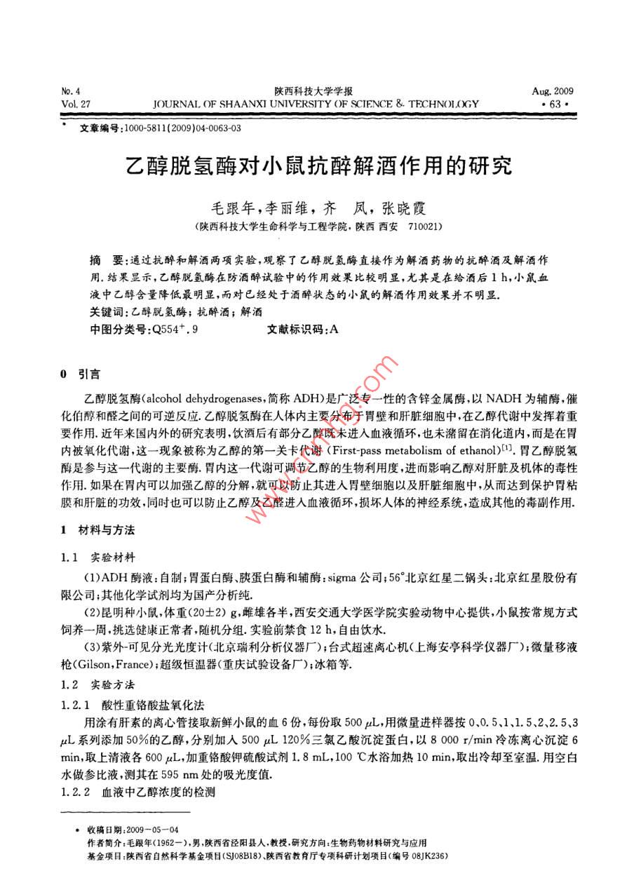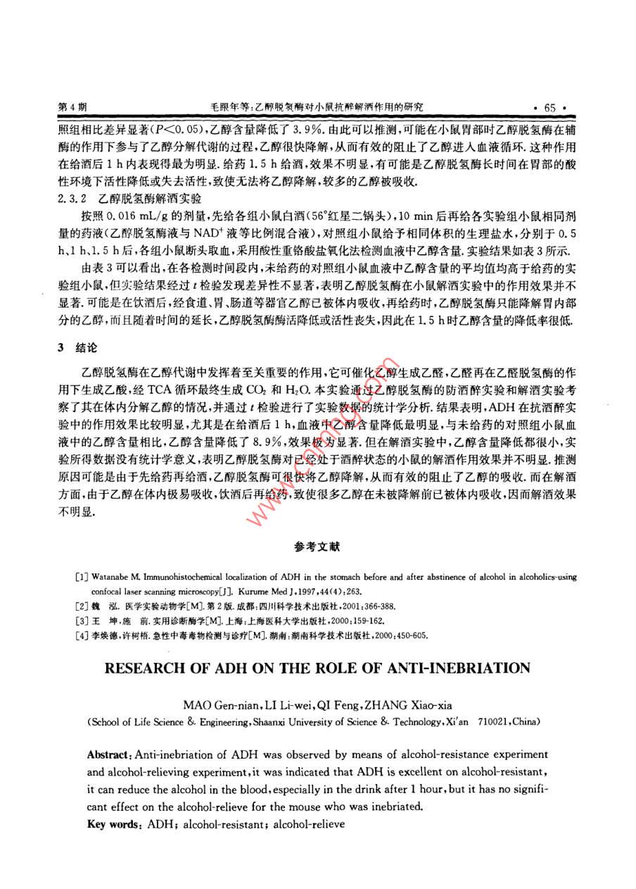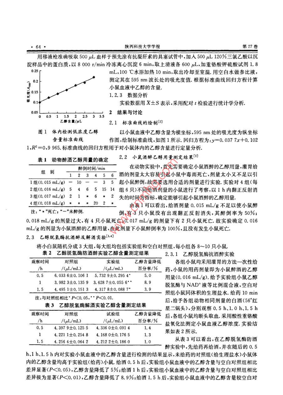 陜西科技大學學報Aug.2009Vo.27JOURNAL OF SHAANXI UNIVERSITY OF SCIENCE & TECHNOLOGY文章編號:1000-5811(2009)04006303乙醇脫氫酶對小鼠抗醉解酒作用的研究毛跟年,李麗維,齊鳳,張曉霞陜西科技大學生命科學與工程學院,陜西西安710021)摘要:通過抗醉和解酒兩項實驗,觀察了乙醇脫氬酶直接作為解酒藥物的抗醉酒及解酒作用.結(jié)果顯示,乙醇脫氬酶在防酒醉試驗中的作用效果比較明顯,尤其是在給酒后1h,小鼠血液中乙醇含量降低最明顯,而對已經(jīng)處于酒醉狀態(tài)的小鼠的解酒作用效果并不明顯關(guān)鍵詞:乙醇脫氫酶;抗醉酒;解酒中圖分類號:Q554+,9文獻標識碼:A0引言乙醇脫氫酶( alcohol dehydrogenases,簡稱ADH)是廣泛專一性的含鋅金屬酶,以NADH為輔酶,化伯醇和醛之間的可逆反應(yīng).乙醇脫氫酶在人體內(nèi)主要分布于胃壁和肝臟細胞中,在乙醇代謝中發(fā)揮著重要作用.近年來國內(nèi)外的研究表明飲酒后有部分乙醇既未進入血液循環(huán),也未潴留在消化道內(nèi),而是在胃內(nèi)被氧化代謝,這一現(xiàn)象被稱為乙醇的第一關(guān)卡代謝( First-pass metabolism of ethanol).胃乙醇脫氡酶是參與這一代謝的主要酶.胃內(nèi)這一代謝可調(diào)節(jié)乙醇的生物利用度,進而影響乙醇對肝臟及機體的毒性作用.如果在胃內(nèi)可以加強乙醇的分解,就可以防止其進入胃壁細胞以及肝臟細胞中,從而達到保護胃粘膜和肝臟的功效,同時也可以防止乙醇及乙醛進入血液循環(huán),損壞人體的神經(jīng)系統(tǒng),造成其他的毒副作用1材料與方法1.1實驗材料(1)ADH酶液:自制;胃蛋白酶、胰蛋白酶和輔酶: sigma公司;56°北京紅星二鍋頭:北京紅星股份有限公司;其他化學試劑均為國產(chǎn)分析純(2)昆明種小鼠體重(20±2)g,雌雄各半,西安交通大學醫(yī)學院實驗動物中心提供,小鼠按常規(guī)方式飼養(yǎng)一周挑選健康正常者隨機分組.實驗前禁食12h,自由飲水(3)紫外可見分光光度計(北京瑞利分析儀器廠);臺式超速離心機(上海安亭科學儀器廠);微量移液槍( Gilson, france);超級恒溫器(重慶試驗設(shè)備廠);冰箱等.1.2實驗方法1.2.1酸性重鉻酸鹽氧化法用涂有肝素的離心管接取新鮮小鼠的血6份每份取500L,用微量進樣器按0、0.5、1、1.5、2、2.5、3L系列添加50%的乙醇,分別加入500L120%三氯乙酸沉淀蛋白,以800r/min冷凍離心沉淀6min,取上清液各600μL,加重鉻酸鉀硫酸試劑1.8mL,100℃水浴加熱10min,取出冷卻至室溫.用空白水做參比液,測其在595nm處的吸光度值1.2.2血液中乙醇濃度的檢測收稿日期:2009-05-04作者簡介:毛跟年(1962-),男陜西省涇陽縣人,教投研究方向:生物藥物材料研究與應(yīng)用基金項目:陜西省自然科學基金項目(SJ08B18)、陜西省教育廳專項科研計劃項目(編號08JK236)陜西科技大學學報第27卷用移液槍準確吸取500L血樣于預先涂有抗凝肝素的具塞試管中,加入500山L120%三氯乙酸以沉淀樣品中的蛋白質(zhì),以8000/min冷凍離心沉淀6min,取上清液各600L,加重鉻酸鉀硫酸試劑1.8mL,100℃水浴加熱10min,取出冷卻至室溫.用空白水做參比液,測定其在595mm波長處的吸光度值根據(jù)標準曲線回歸方程計算小鼠血液中乙醇的含量1.2.3數(shù)據(jù)分析實驗數(shù)據(jù)用X±S表示,采用配對t檢驗進行統(tǒng)計學分析2結(jié)果與討論乙醇含量/AL2.1標準曲線的繪制2圖1體內(nèi)檢測低濃度乙醇以小鼠血液中乙醇含量為橫坐標,595nm處的吸光度為縱坐標含量標準曲線作圖,繪制標準曲線,如圖1所示回歸方程為:y=0.0377x+0.1021,R2=0,9965.標準曲線的回歸方程用于對小鼠體內(nèi)的乙醇含量進行定量分析表1動物醉酒乙醇用量的確定22小鼠酒醉乙醇用量測定結(jié)果1醉倒時間/min在動物實驗中,首先需要確定小鼠酒醉的乙醇用量,灌胃給組別123456酒的劑量太大容易引起小鼠中毒而死亡,劑量太小又不足以引1組(0.015mL/g)-1035起小鼠醉倒,故需要選用合適的劑量進行實驗.實驗對4組(每2組.016mLg)54651514組6只)不同給酒劑量的小鼠進行了考察,以1h內(nèi)翻正反射消3組(0.017mL/g)21失的時間為指標,確定能夠引起小鼠酒醉的乙醇用量4組(0.018mL/g)由表1可以看出,給酒劑量0.015mL/g不足以使小鼠醉注:“*”死亡;“一”未醉倒倒,有3只小鼠沒有出現(xiàn)翻正反射消失,其醉倒率為50%0.018mL/g的劑量過大,有4只小鼠死亡;0.017mL/g的劑量下有2只小鼠死亡故實驗確定0.016mL/g的劑量為小鼠酒醉的乙醇用量,在此劑量下小鼠醉倒率為100%且沒有發(fā)生小鼠死亡2.3乙醇脫氫酶抗酒醉及解酒實驗4將小白鼠隨機分成3大組,每大組均包括實驗組和空白對照組,每小組各8~10只小鼠表2乙醇脫氫酶防酒醉實驗乙醇含量測定結(jié)果2.3.1乙醇脫氫酶抗酒醉實驗觀察時間對照組實驗組乙醇含量降低各組小鼠均采用灌胃的方法一次性給h/(l/ml)/l/m1)百分率/%藥,小鼠的用藥劑量即為小鼠醉酒的乙醇0.56.08360.106157329±0.29545.0用量(0.016mL/g)給予實驗組小鼠乙醇13.9823±0.13593.6287±0.0556·8.9脫氫酶與NAD液等比例混合液,空白對1.54.4951±0.15134.3178±0.08873.9照組小鼠同體積的生理鹽水給藥10min注:與對照組相比·P<0.05,P<0.01后,給予各組動物相同劑量的白酒(56°紅表3乙醇脫氫酶解酒實驗乙醇含量測定結(jié)果察時間對照組試驗組乙醇含量降低后,各組小鼠均斷頭取血采用酸性重鉻酸/h/(uL/mL)/(gL/mL)百分率/%鹽氧化法測定小鼠血液乙醇濃度.實驗結(jié)0.54.3979士0.12554.3360±0.09144.2211±0.25484.1680士0.1765果如表2所示1.54.2564士0.0642
