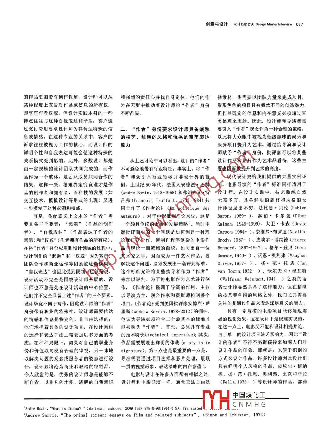 034■ 創(chuàng)意與設(shè)計總第三十一期I 2014.02設(shè)計師:設(shè)計的作者文/楊艷芳(南京師范大學(xué)美術(shù)學(xué)院)Designer- The Author of Design摘要冒設(shè)計師對自身的認(rèn)識和評判,直接影響著作品的面貌。設(shè)計界通過對“作者"概念的引入,使設(shè)計脫離了只是解決問題、或只是服務(wù)于商業(yè)和政治的層面,作為“ 作者”的設(shè)計師具備強烈的自我意識,認(rèn)為設(shè)計具有更純粹更高尚的目標(biāo)。設(shè)計領(lǐng)域內(nèi)的“作者”理論構(gòu)建在設(shè)計實踐的基礎(chǔ)上,是一種反思過程和擴展設(shè)計方法的手段,帶有設(shè)計的專業(yè)性和規(guī)定性,它充實著設(shè)計理念,服務(wù)于設(shè)計實踐,而設(shè)計實踐的發(fā)展也證實了“作者”理論的推動作用。Designer, who understanding and evaluation himself can impact the style of his work directly.Design breaks away from solve problems or service to business and political through the introduction of theconcept of "author'". As "author", designer has a strong self-awareness, think more pure and more noble goalsto design. The "author" theory in the field of design builds on the basis of the design practice, and is a way ofreflection and extension to design process and methods. With the professional and prescriptive of design, itenriches the design concept, in the service of design practice, and the development of design also proved therole of "author" theory.關(guān)鍵詞:設(shè)計師: 作者:起源:權(quán)威:自我表達(dá)Key words: Designer; Author; Origin; Authority; Self- expressionDOI編碼: 10. 3969/J. ISSN. 1674-4187. 2014. 02.005在關(guān)注設(shè)計發(fā)展、反思設(shè)計師職責(zé)的將“作者”概念引入設(shè)計領(lǐng)域的背后,源和方法,因此,思考“作者”這一概念過程中,“作者”(author) 一詞逐漸被涉 及許多有關(guān)設(shè)計起源和方法的理念,這如何合理地服務(wù)于設(shè)計、 如何充實了設(shè)計引入設(shè)計范疇,一系列圍繞 “作者”的理些理念直接影響設(shè)計師的思考,最終決定觀念, 可謂- -項有 益的探索。論探尋也因此而展開。在西方,對“作者”作品的形式。因此,在對設(shè)計領(lǐng)域的“作者”米歇爾●洛克(Michael Rock') 在他概念的探討由來已久(最早的討論大約出概念 展開全面審視和說明之前,首先應(yīng)該1996 年他發(fā)表的文章“The Designer as現(xiàn)在1910年前后),時至今日,它依然是拋開 “作者”一詞的常規(guī)定義,關(guān)注具體Author” 這個觀點,對設(shè)計師的作者身份西方設(shè)計界津津樂道的話題。與此不同的的設(shè)計實例和相關(guān)的可行性理論, 同時反進(jìn)行了評論, 成為當(dāng)時爭論的導(dǎo)火索。盡是,國內(nèi)卻鮮少見到對這類問題的關(guān)注,思 “設(shè)計”的行業(yè)特點。我們對設(shè)計的認(rèn)管這 個頗具爭議的觀點尚未主導(dǎo)設(shè)計師的或許中西文化的差異造成對某些概念的理識往往停留在那些具有視覺沖擊力的圖形、職業(yè)和經(jīng)濟模式, 但已涉及我們對未來設(shè)解出現(xiàn)誤差和偏離是主要原因。然而這種產(chǎn) 品或建筑上,所思考的問題也往往局限計的想像 和討論2。為什么將設(shè)計師視為“作理解誤差經(jīng)過日積月累,終將成為設(shè)計實于如何將創(chuàng)意運用于設(shè)計。我們往往重視者” ?怎樣的設(shè)計師能夠被稱為“作者”?踐和理論研究的障礙,所以,逐步弄清西信息的傳達(dá), 卻忽略了信息的起源,而“作他們又 是如何完成這種自我超越的?要對方的設(shè)計語匯和觀念是不可回避的問題。者”概念的引入恰好探討了有關(guān)的設(shè)計起這些問題做出確切的回答并非易事,但通作者簡介:楊艷芳,南京師范大學(xué)美術(shù)學(xué)院博土研究生,研究方向:設(shè)計藝術(shù)史論。中國煤化工Michael Rock 橫跨學(xué)術(shù)研究和設(shè)計實踐兩大領(lǐng)域,20 世紀(jì)80年代和90年代初,先后就學(xué)于羅德島藝術(shù)事設(shè)計批評。其著作影響深遠(yuǎn)。1996 年他發(fā)表的文章“The Designer as Author",圍繞著“設(shè)計師”和“作者”兩個概念,提t(yī)CN MH G他的觀點至今仍為批評界爭論不休。文章中Rock提出“呼吁平面設(shè)計師成為作者究竟意味著什么? (What does it really mean to call for a graphic designer to be an author?)”的疑問,Rock的經(jīng)歷對設(shè)計理論影響深遠(yuǎn),這篇文章在針對“作者”的眾多討論中具備相當(dāng)?shù)膹V度和深度。Helen Armstrong, “Introduction-- Revisiting the Avant -Garde", Graphic Design Theory. (New York: Princeton Architectural Press, 2009) P9 - 15..