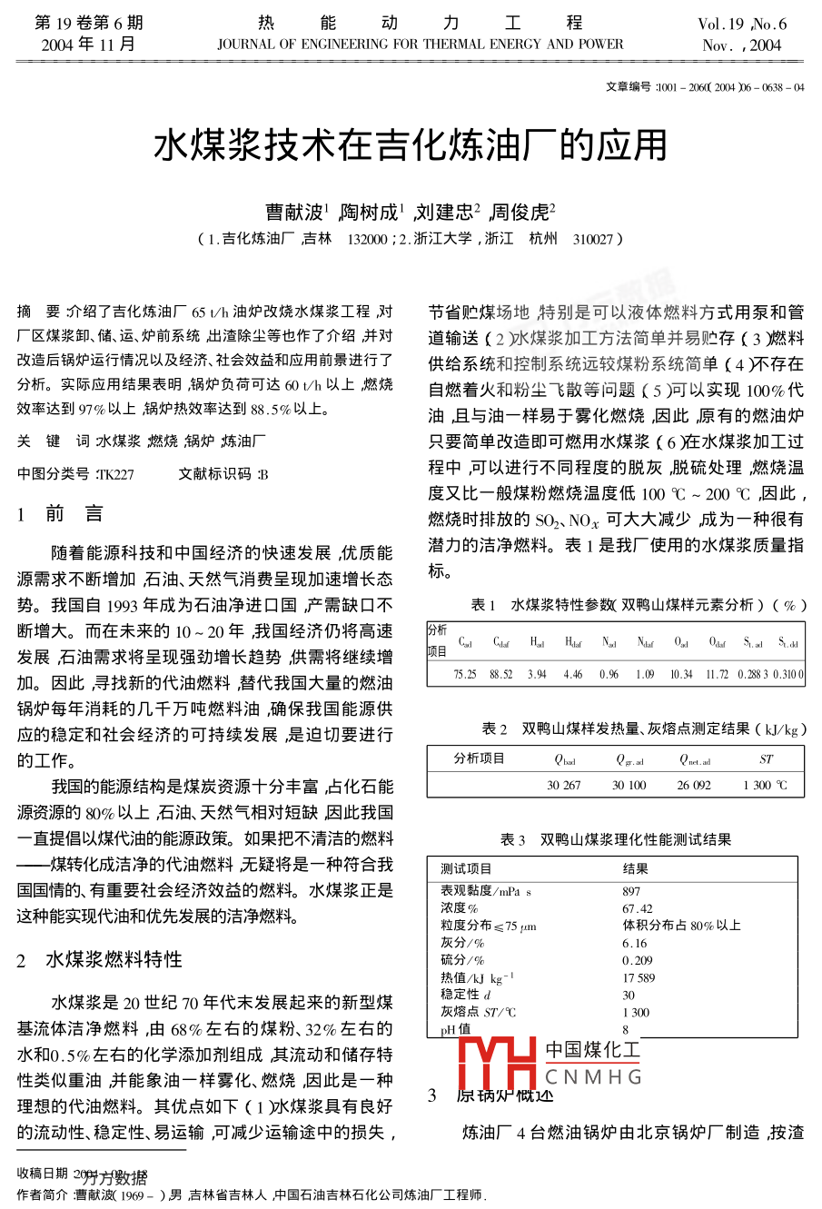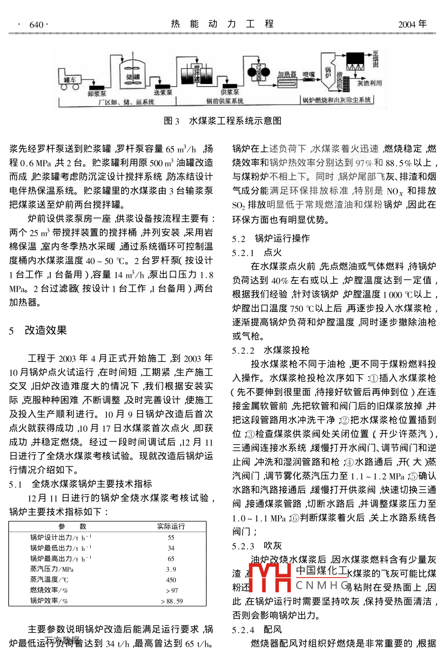 第19卷第6期熱能動力工程Vol 19 No 62004年11月JOURNAL OF ENGINEERING FOR THERMAL ENERGY AND POWERNov.,2004文章編號001-206(2004)6-0638-04水煤漿技術(shù)在吉化煉油廠的應(yīng)用曹獻(xiàn)波'陶樹成↓劉建忠2周俊虎ˉ1.吉化煉油廠吉林132000;2.浙江大學(xué),浙江杭州31007)摘要介紹了吉化煉油廠65υh油爐改燒水煤漿工程對節(jié)省貯煤場地特別是可以液體燃料方式用泵和管廠區(qū)煤漿卸、儲、運(yùn)、爐前系統(tǒng)出渣除塵等也作了介紹并對道輸送(2冰煤漿加工方法簡單并易貯存(3)燃料改造后鍋爐運(yùn)行情況以及經(jīng)濟(jì)、社會效益和應(yīng)用前景進(jìn)行了供給系統(tǒng)和控制系統(tǒng)遠(yuǎn)較煤粉系統(tǒng)簡單(4不存在分析。實(shí)際應(yīng)用結(jié)果表明鍋爐負(fù)荷可達(dá)6h以上燃燒自燃著火和粉塵飛散等問題(5)以實(shí)現(xiàn)100%代效率達(dá)到卯7%以上鍋爐熱效率達(dá)到88.5%以上油且與油一樣易于霧化燃燒因此原有的燃油爐關(guān)鍵詞水煤漿燃燒鍋爐煉油廠只要簡單改造即可燃用水煤漿(6在水煤漿加工過中圖分類號IK227文獻(xiàn)標(biāo)識碼程中可以進(jìn)行不同程度的脫灰脫硫處理燃燒溫度又比一般煤粉燃燒溫度低100℃~200℃因此,前言燃燒時排放的SO2NOx可大大減少成為一種很有源需求不斷增加石油、天然氣消費(fèi)呈現(xiàn)加速增長態(tài)今°的潔凈燃料表1是我廠使用的水煤漿質(zhì)量指隨著能源科技和中國經(jīng)濟(jì)的快速發(fā)展優(yōu)質(zhì)能潛勢。我國自1993年成為石油凈進(jìn)口國產(chǎn)需缺口不表1水煤漿特性參數(shù)雙鴨山煤樣元素分析)(%)斷增大。而在未來的10~20年我國經(jīng)濟(jì)仍將高速Cad Cla ha haf N Naf O Ow Sa sol發(fā)展石油需求將呈現(xiàn)強(qiáng)勁增長趨勢供需將繼續(xù)增F曰加。因此尋找新的代油燃料替代我國大量的燃油鍋爐毎年消耗的幾千萬噸燃料油,確保我國能源供應(yīng)的穩(wěn)定和社會經(jīng)濟(jì)的可持續(xù)發(fā)展是迫切要進(jìn)行表2雙鴨山煤樣發(fā)熱量、灰熔點(diǎn)測定結(jié)果(kJkg)的工作。分析項(xiàng)目Q我國的能源結(jié)構(gòu)是煤炭資源十分豐富占化石能3026730100260921300℃源資源的80%以上石油、天然氣相對短缺因此我國直提倡以煤代油的能源政策。如果把不清潔的燃料表3雙鴨山煤漿理化性能測試結(jié)果——煤轉(zhuǎn)化成潔凈的代油燃料無疑將是一種符合我測試項(xiàng)目結(jié)果國國情的、有重要社會經(jīng)濟(jì)效益的燃料。水煤漿正是表觀黏度/mPas897這種能實(shí)現(xiàn)代油和優(yōu)先發(fā)展的潔凈燃料。濃度%67.42粒度分布≤75m體積分布占80%以上灰分/%6.162水煤漿燃料特性硫分/%熱值/kJkg水煤漿是20世紀(jì)70年代未發(fā)展起來的新型煤穩(wěn)定性d灰熔點(diǎn)ST/℃300基流體潔凈燃料,由68%左右的煤粉、32%左右的H值水和0.5%左右的化學(xué)添加劑組成其流動和儲存特中國煤化工性類似重油并能象油一樣霧化、燃燒因此是一種CNMHG理想的代油燃料。其優(yōu)點(diǎn)如下(1)水煤漿具有良好慨的流動性、穩(wěn)定性、易運(yùn)輸可減少運(yùn)輸途中的損失煉油廠4臺燃油鍋爐由北京鍋爐廠制造按渣收稿日期29方數(shù)擔(dān)作者簡介漕獻(xiàn)波(196-)男吉林省吉林人中國石油吉林石化公司煉油廠工程師第6期曹獻(xiàn)波等水煤漿技術(shù)在吉化煉油廠的應(yīng)用639油設(shè)計型號為Y-653.9-1型。鍋爐采用中壓單燒器該燃燒器為油/水煤漿兩用燃燒器均等布風(fēng)鍋筒、自然循環(huán)、負(fù)壓燃燒、平衡通風(fēng)、Ⅱ型室內(nèi)布方式一次風(fēng)噴(即油/水煤漿兩用燃燒器)層置。爐膛為正方形截面其尺寸為4.5m×4.5m二次風(fēng)口3層。鍋爐啟動點(diǎn)火時先點(diǎn)燃油或燃料鍋爐采用全懸吊結(jié)構(gòu)利用大直徑下降管集中供水。氣)使?fàn)t膛達(dá)到一定的溫度水平后再投入水煤漿,爐膛為密節(jié)距水冷壁水平煙道及尾部煙道上部布然后逐步增加水煤漿槍減少油槍。為了保證燃油置有過熱器和包墻管。水平煙道里分兩級布置了對時蒸汽參數(shù)和燃瓦斯氣需要保留前墻上排兩個旋流過熱器兩級之間裝設(shè)噴水減溫器以調(diào)節(jié)過熱蒸流燃燒器。根據(jù)燃用水煤漿噴嘴的成功經(jīng)驗(yàn)及電站汽溫度。經(jīng)濟(jì)器為單級布置空預(yù)器為臥式尾部垂鍋爐的特點(diǎn)這次改造使用的噴嘴是浙江大學(xué)研制井裝有鋼珠除塵及蒸汽消防設(shè)備。原設(shè)計燃燒裝置的撞擊式多級蒸汽霧化型水煤漿噴嘴。為4只重油燃燒器后改為油/氣兩用)分兩排布置在受熱面改造方面過熱器和噴水減溫裝置不于爐室前墻并采用大風(fēng)箱、切向可動葉片調(diào)風(fēng)器。作改動為了提高熱風(fēng)溫度對經(jīng)濟(jì)器和空預(yù)器的面鍋爐簡圖見圖1。積和布置進(jìn)行調(diào)整即在經(jīng)濟(jì)器上下兩組之間增加級空預(yù)器同時上組經(jīng)濟(jì)器去除6排管子增加下級空預(yù)器的面積使空預(yù)器總面積約增加2000m2改造后的鍋爐示意圖見圖2。此外,鍋爐水冷壁和其他受熱面增加吹灰裝置經(jīng)濟(jì)器和空預(yù)器增加防磨裝置。溫過熱圖1改造前鍋爐示意圖經(jīng)濟(jì)原設(shè)計鍋爐的主要技術(shù)參數(shù)(括號內(nèi)數(shù)據(jù)為改燒水煤漿后參數(shù)鍋爐額定蒸發(fā)量65t(55t/h)額定蒸汽壓力3.9MPa電除塵