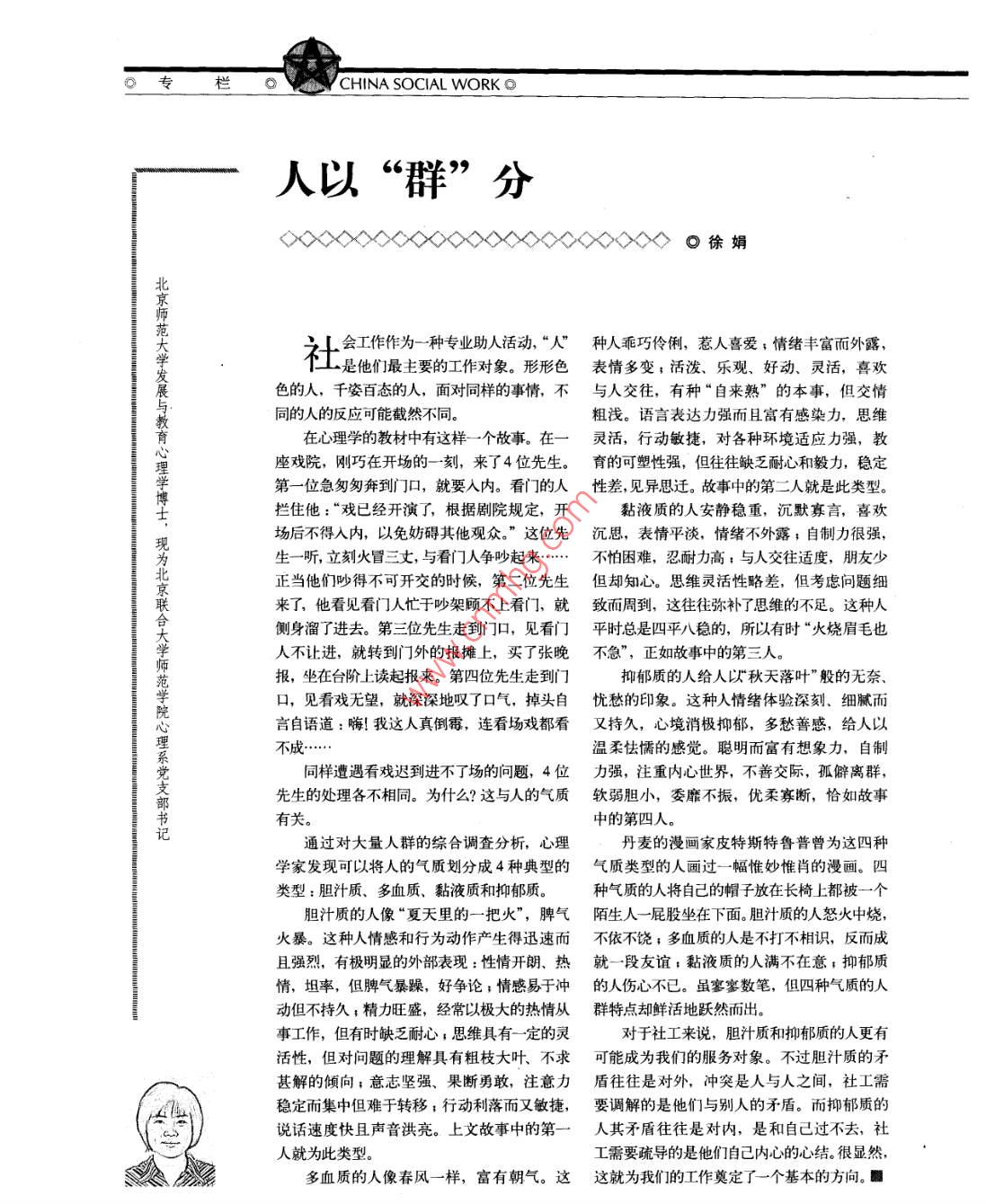 CH| NA SOC| AL WORK◎人以“群”分◇◇◇◎徐娟師范大學(xué)發(fā)展與教育心理學(xué)博社會(huì)工作作為一種專業(yè)助人活動(dòng),“人”種人乖巧伶俐,惹人喜愛;情緒豐富而外露,是他們最主要的工作對(duì)象。形形色表情多變;活潑、樂觀、好動(dòng)、靈活,喜歡色的人,千姿百態(tài)的人,面對(duì)同樣的事情,不與人交往,有種“自來熟”的本事,但交情同的人的反應(yīng)可能截然不同。粗淺。語言表達(dá)力強(qiáng)而且富有感染力,思維在心理學(xué)的教材中有這樣一個(gè)故事。在一靈活,行動(dòng)敏捷,對(duì)各種環(huán)境適應(yīng)力強(qiáng),教座戲院,剛巧在開場(chǎng)的一刻,來了4位先生。育的可塑性強(qiáng),但往往缺乏耐心和毅力,穩(wěn)定第一位急匆匆奔到門口,就要入內(nèi)??撮T的人性差,見異思遷。故事中的第二人就是此類型。理學(xué)博士,現(xiàn)為北京聯(lián)合攔住他:“戲已經(jīng)開演了,根據(jù)劇院規(guī)定,開黏液質(zhì)的人安靜穩(wěn)重,沉默寡言,喜歡場(chǎng)后不得入內(nèi),以免妨礙其他觀眾?!边@位先沉思,表情平淡,情緒不外露;自制力很強(qiáng),生一聽,立刻火冒三丈,與看門人爭(zhēng)吵起來不怕困難,忍耐力高:與人交往適度,朋友少正當(dāng)他們吵得不可開交的時(shí)候,第二位先生但卻知心。思維靈活性略差,但考慮問題細(xì)來了,他看見看門人忙于吵架顧不上看門,就致而周到,這往往彌補(bǔ)了思維的不足。這種人側(cè)身溜了進(jìn)去。第三位先生走到門口,見看門平時(shí)總是四平八穩(wěn)的,所以有時(shí)“火燒眉毛也人不讓進(jìn),就轉(zhuǎn)到門外的報(bào)攤上,買了張晚不急”,正如故事中的第三人報(bào),坐在臺(tái)階上讀起報(bào)來。第四位先生走到門抑郁質(zhì)的人給人以秋天落葉”般的無奈范學(xué)院心理系黨支部書記口,見看戲無望,就深深地嘆了口氣,掉頭自憂愁的印象。這種人情緒體驗(yàn)深刻、細(xì)膩而言自語道:嗨!我這人真倒霉,連看場(chǎng)戲都看又持久,心境消極抑郁,多愁善感,給人以不成…溫柔怯懦的感覺。聰明而富有想象力,自制同樣遭遇看戲遲到進(jìn)不了場(chǎng)的問題,4位力強(qiáng),注重內(nèi)心世界,不善交際,孤僻離群,先生的處理各不相同。為什么?這與人的氣質(zhì)軟弱膽小,委靡不振,優(yōu)柔寡斷,恰如故事有關(guān)。中的第四人通過對(duì)大量人群的綜合調(diào)查分析,心理丹麥的漫畫家皮特斯特魯普曾為這四種學(xué)家發(fā)現(xiàn)可以將人的氣質(zhì)劃分成4種典型的氣質(zhì)類型的人畫過一幅惟妙惟肖的漫畫。四類型:膽汁質(zhì)、多血質(zhì)、黏液質(zhì)和抑郁質(zhì)。種氣質(zhì)的人將自己的帽子放在長椅上都被一個(gè)膽汁質(zhì)的人像“夏天里的一把火”,脾氣陌生人一屁股坐在下面。膽汁質(zhì)的人怒火中燒,火暴。這種人情感和行為動(dòng)作產(chǎn)生得迅速而不依不饒;多血質(zhì)的人是不打不相識(shí),反而成且強(qiáng)烈,有極明顯的外部表現(xiàn):性情開朗、熱就一段友誼;黏液質(zhì)的人滿不在意;抑郁質(zhì)情,坦率,但脾氣暴躁,好爭(zhēng)論;情感易于沖的人傷心不已。雖寥寥數(shù)筆,但四種氣質(zhì)的人動(dòng)但不持久;精力旺盛,經(jīng)常以極大的熱情從群特點(diǎn)卻鮮活地躍然而出。事工作,但有時(shí)缺乏耐心;思維具有一定的靈對(duì)于社工來說,膽汁質(zhì)和抑郁質(zhì)的人更有活性,但對(duì)問題的理解具有粗枝大葉、不求可能成為我們的服務(wù)對(duì)象。不過膽汁質(zhì)的矛甚解的傾向;意志堅(jiān)強(qiáng)、果斷勇敢,注意力盾往往是對(duì)外,沖突是人與人之間,社工需穩(wěn)定而集中但難于轉(zhuǎn)移;行動(dòng)利落而又敏捷,要調(diào)解的是他們與別人的矛盾。而抑郁質(zhì)的說話速度快且聲音洪亮。上文故事中的第一人其矛盾往往是對(duì)內(nèi),是和自己過不去,社人就為此類型。工需要疏導(dǎo)的是他們自己內(nèi)心的心結(jié)。很顯然,多血質(zhì)的人像春風(fēng)一樣,富有朝氣。這這就為我們的工作奠定了一個(gè)基本的方向