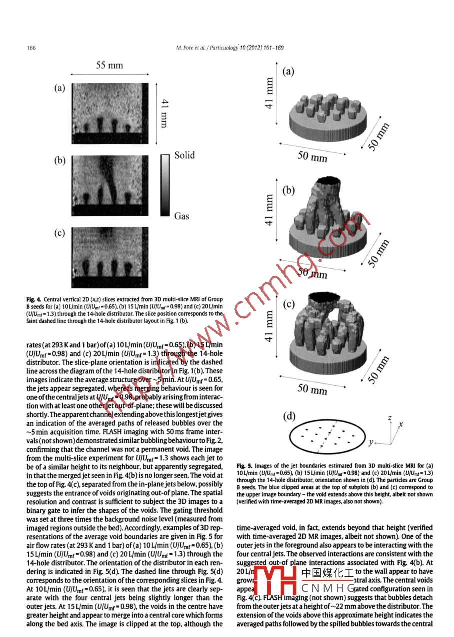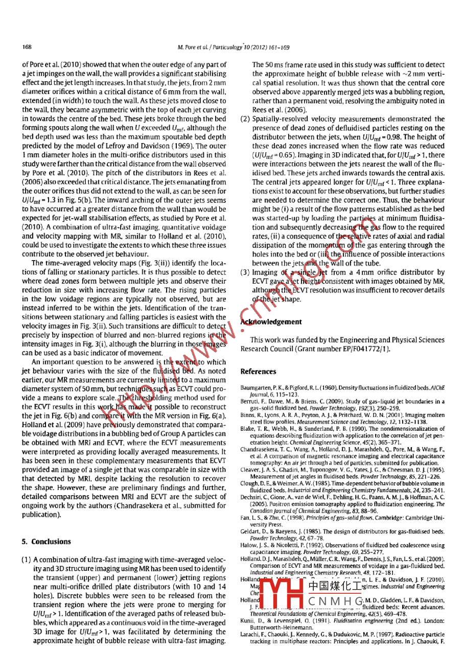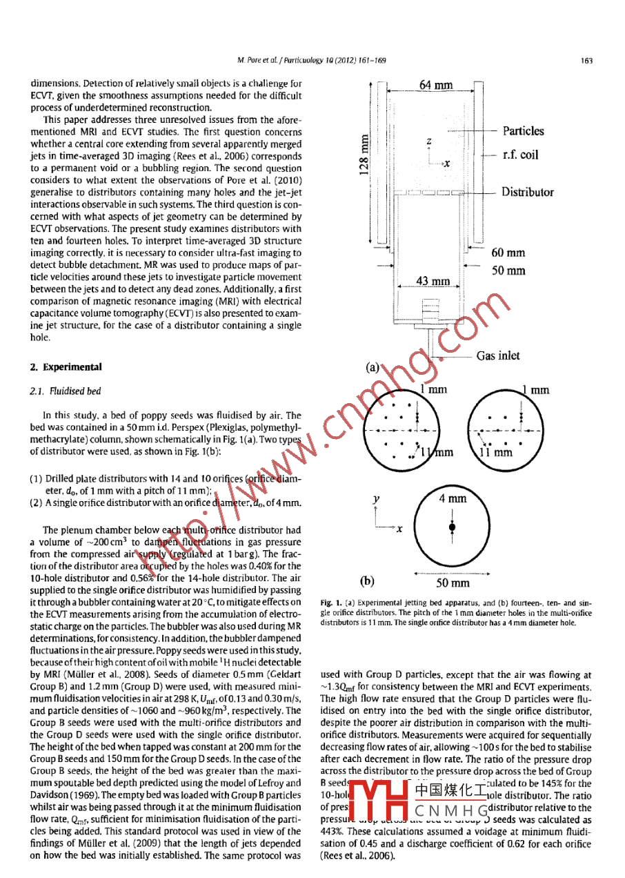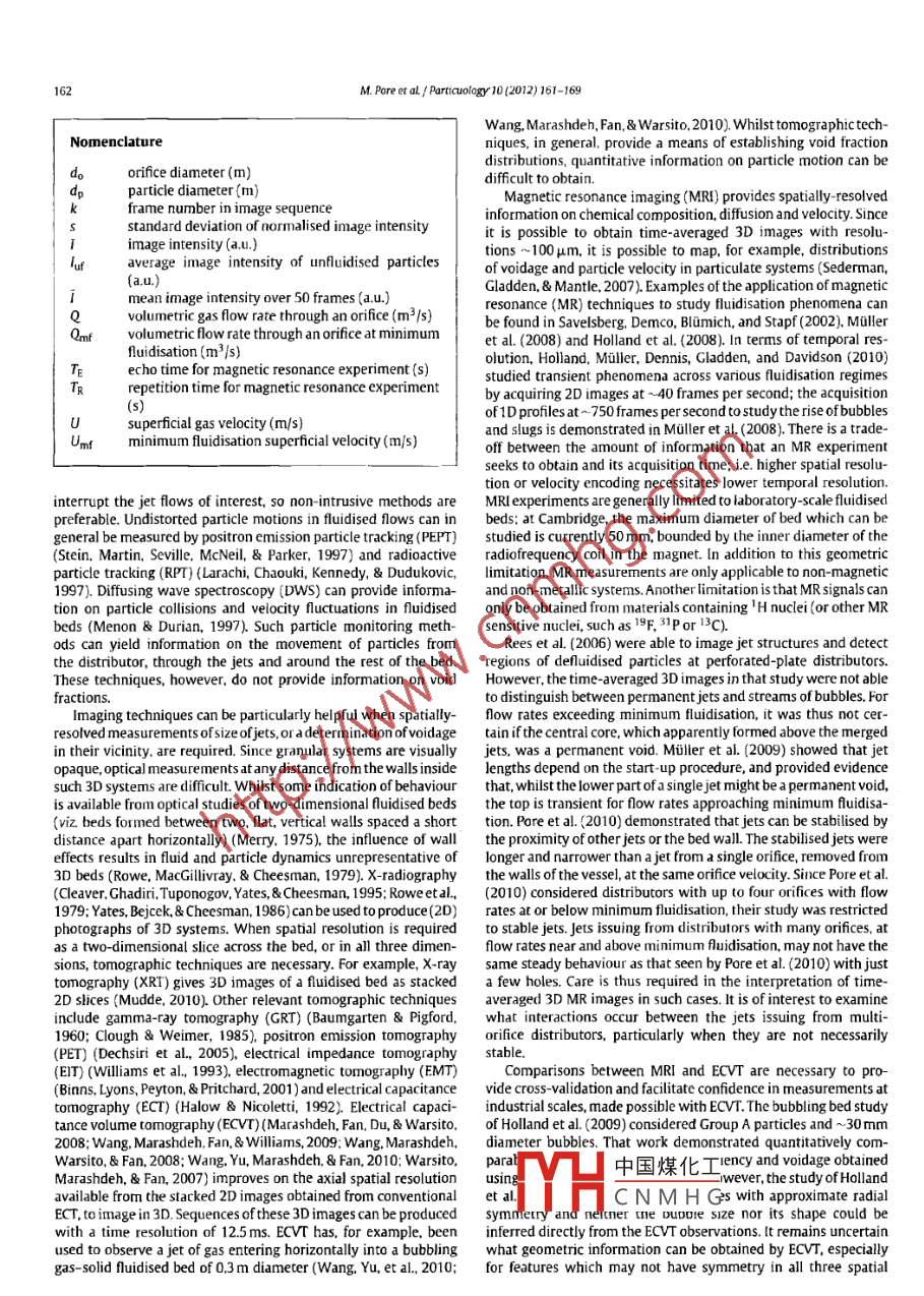 particuology 10(2012)161-169Contents lists available at SciVerse Science DirectParticuologyELSEVIERjournalhomepagewww.elsevier.com/locate/particMagnetic resonance studies of jets in a gas-solid fluidised bedMeenal Pore, Thusara C Chandrasekera, DanielJ. Holland, Aining Wang, Fei WangQussai Marashdehb, Michael D Mantle, Andrew ]. Sederman, Liang-Shih Fanb, Lynn F Gladden.John S. Dennisb The william G. Lowrie Department of Chemical and Biomolecular Engimeering. Ohio State University. Columbus, OH 43210, USA omroke Street, Cambridge CB2 3RARTICLE INFOABSTRACTArticle hMagnetic resonance imaging( MRi) has been used to study the behaviour of jets at the distributor of aReceived 15 August 201150mm diameter fluidised bed of 0. 5 mm diameter poppy seeds. Two perforated-plate distributors wereReceived in revised form 13 October 20Accepred 21 October 2011examined, containing either 10 or 14 holes, each 1 mm diameter. Ultra-fast MR imaging was able toshow the transient nature of the upper parts of the jets, where discrete bubbles are formed. imaging in 3Dshowed that the central jets were the longest for flow rates below minimum fluidisation. Above minimumliaised bedfluidisation, the outer jets, nearest the wall of the fluidised bed, arched inward towards the central axis. Inthis latter case, interpretation of the time-averaged 3D image required the use of ultra-fast MR imaginECVTto identify the approximate height above the distributor at which discrete bubbles were formed. Thapparently continuous void extending along the central axis above this height in the time-averaged 3Dimage was thus identified, using ultra-fast MR imaging, as representing the averaged paths of releasedbubbles. Time-averaged MR velocity mapping was also used to identify dead zones of stationary particlesresting on the distributor between the jets. The dead zones could be observed when thesuperficial velocity Comparable images of a single jet through 1.2 mm diamdl. obseof the gas approached minimum fluidisation, but they were smaller than thoselower gasm MRiand electrical capacitance volume tomography (ECvT)are also demonstrated@2012 Published by Elsevier B V on behalf of Chinese Society of Particuology and Institute ofProcess Engineering, Chinese Academy of Sciences1. Introductioncontribute to poor gas-solid mixing. This poor mixing can lead tosintering. Depending on the design, the gas may issue from eachThe motion of particles in gas-solid fluidised beds, as well as hole in the distributor either as a permanent jet, which eventuallymany other fluidisation phenomena, are still poorly understood. spills off bubbles at its tip, or as a stream of bubbles directly fromThe design and scale-up of fluidised beds has thus been diffi- the orifice(Geldart Baeyens, 1985). where jets are formed, prob-cult, despite their widespread use for, e.g. the catalytic cracking lems might arise owing to the fact that jets can convey particlesof hydrocarbons, gasification and combustion of coal, and liquid at sufficiently high velocities to erode internal parts of the bed infuel synthesis by the Fischer-Tropsch process(Fan Zhu, 1998: the vicinity of the distributor(e.g. heat exchanger tubes and walls).Kunii& Levenspiel, 1991 ) Fluidised beds provide high rates of heat Understanding the behaviour of jets near the distributor is theregas, but, in some cases, the gas distribution can be poor(Thorpe, wamt portant for successful design and forms the subject of thisand mass transfer with a good mixing between the particles and fore imDavidson, Pollitt, Smith, 2002). Small bubbles are helpful forVarious techniques have been used to study the flow of solidsgood mixing of gas and solids. However, insufficient contacting can and fluids in fluidised beds. Low-cost, intrusive measurementsresult from bubble coalescence, forming large gas bubbles which are convenient for studying large-scale systems. Typical examplesquickly ascend the bed, bypassing many of the particles. Dead which have been applied to study jets include measurements byzones of defluidised particles can occur on perforated plate distrib- pressure sensors( Vaccaro, Musmarra, Petrecca, 1997). opticalutors between the gas jets issuing from the holes therein, and also probes(Blake, Webb, Sunderland, 1990; Wen, Deole, Chen1982)therm中國(guó)煤化工We&Bmes2009and2009: McMillan, ZhouCorresponding author. Tel: +44 1223 334787: fax: +44 1223 334796.AryaCNMH GAng, Fan,2000).Theseauap, vn jets. Internal probes als1674-2001/5-see front matter e 2012 Published by Elsevier B V on behalf of Chinese Sociery of Particuology and Institute of Process Engineering, Chinese Academy of Sciences.w. Pore et aL/ Particuology 10(2012)161-169Wang, Marashdeh, Fan, Warsito. 2010). Whilst tomographictech-Nomenclatureniques, in general, provide a means of establishing void fractiondistributions, quantitative information on particle motion can beorifice diameter(m)difficult to obtainparticle diameter(mframe number in image sequenceMagnetic resonance imaging( MRi) provides spatially-resolvedinformation on chemical composition, diffusion and velocity. Sincestandard deviation of normalised image intensityit is possible to obtain time-averaged 3D images with resoluimage intensity (a.u.)average image intensity of un fluidised particletions 100 um. it is possible to map, for example, distributionsof voidage and particle velocity in particulate systems(Sederman,Gladden. Mantle, 2007). Examples of the application of magneticlage intensity over 50 frames(au)resonance(MR)techniques to study fluidisation phenomena canolumetric gas flow rate through an orifice(m /s)Qmf volumetric flow rate through an orifice at minimumbe found in Savelsberg, demco, Blumich and Stapf (2002). Mullerfluidisation(m /s)et al. (2008)and Holland et al. (2008). In terms of temporal res-olution, Holland, Muller, Dennis, Gladden, and Davidson(2010)Te echo time for magnetic resonance experiment(s)studied transient phenomena across various fluidisation regimesrepe