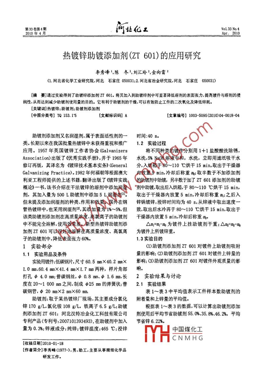 熱鍍鋅助鍍添加劑(ZT 601)的應(yīng)用研究
