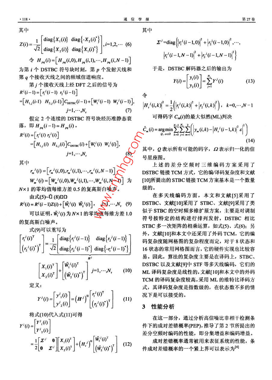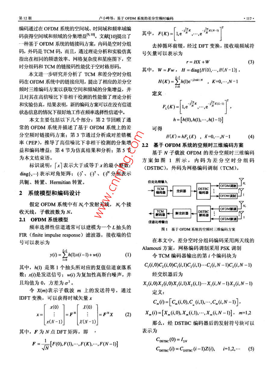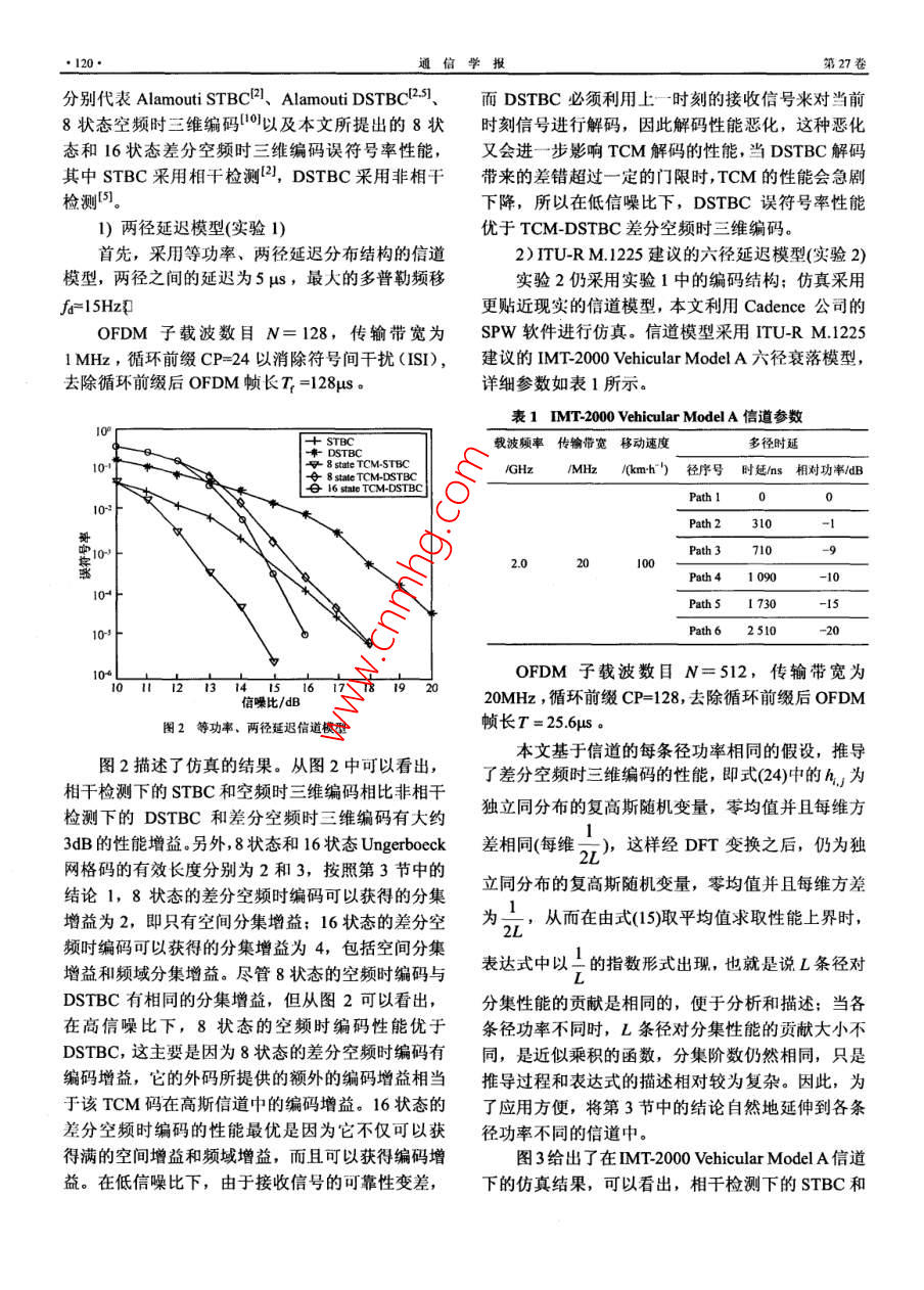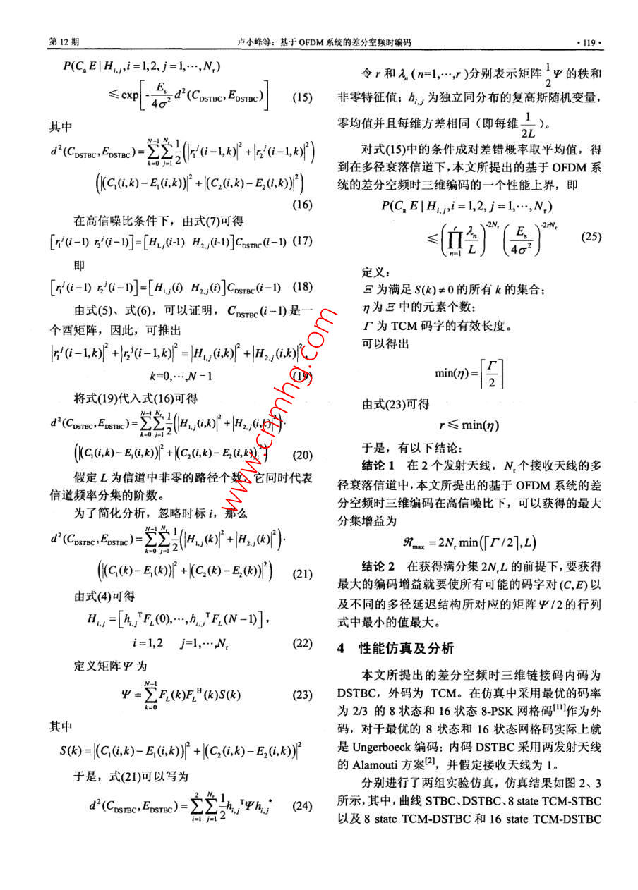 第27卷第12期通信學報Vol 27 No 122006年12月Joumal on CommunicationsDecember 2006基于OFDM系統(tǒng)的差分空頻時編碼盧小峰,朱光喜,韋耿(華中科技大學電子與信息工程系,湖北武漢430074)摘要:基于OFDM(正交頻分復用)系統(tǒng),提出了一種新的空頻時三維編碼,將網(wǎng)格編碼調(diào)制和差分空時分組碼進行組合鏈接設計。在信道狀態(tài)信息很難獲取的情況下,它可以很好地工作在頻率選擇性信道中,進一步分析并推導了非相干檢測下該編碼的性能。仿真結(jié)果表明,這種新的編碼方案可以獲得編碼增益以及滿的空間域和頻域分集增益,很好地支持了理論分析。關鍵詞:正交頻分復用:差分空時分組碼;網(wǎng)格編碼調(diào)制中圖分類號:TN9295文獻標識碼:A文章編號:1000436X(2006)12-01160Differential space-frequency time code design based on ofdm systemsLU Xiao-feng, ZHU Guang-xi, WEI GengDept of Electronic and Information Engineering, HUST, Wuhan 430074, China)Abstract: Based on OFDM system, a novel space-frequency-time code which combined trellis-coded modulation withdifferential space-time block code was proposed. The differential space-frequency-time code performed effectively overfrequency-selective channels in some situations when the accurate channel estimation became very difficult. In addition,the diversity order of the proposed code in the case of noncoherent detection was analyzed and derived. The simulationresults show that the code achieves not only the code gain, but also the frequency and spatial domain diversity offered bychannel, which approves the theoretical analysisKey words: orthogonal frequency division multiplexing; differential space-time block code; trellis-coded modulation1引言( DSTBC)是一種流行的方案,因為它具有正交的發(fā)射矩陣結(jié)構(gòu),所以它的優(yōu)點在于低的譯碼復雜度。最近以來,發(fā)射分集作為一種提高無線衰落信道盡管空時分組編碼有很多優(yōu)點,但它通常只能有通信性能和可靠性的方法得到了廣泛的關注和深入效地工作在平坦衰落信道中,如室內(nèi)或者低速無線通的研究叮,空時分組碼(STBC)就是發(fā)射分集的熱點信系統(tǒng)。正交頻分復用(OFDM)作為一種有效的消技術(shù)之24。大部分的空時分組碼都假定接收機已除符號間干擾(ISI)的調(diào)制方法,得到了廣泛的應用,經(jīng)得到正確的信道狀態(tài)信息,然而,在一些特殊情況它可以將頻率選擇性信道轉(zhuǎn)變成一系列并行的平坦下,如移動臺快速移動時,信道變化很快,精確的信衰落子信道。因此,對于延遲擴展信道,一種有效的道估計變得非常困難。為了避免信道估計,人們提出方法是將空時分組碼應用于OFDM系統(tǒng)中別了差分空時編碼方案,其中,差分空時分組碼為了更充分地利用信道資源,空頻時(SFT)三維收稿日期:2005-12-09;修回日期:20060926基金項目:國家自然科學基金資助項目(60496315);國家高技術(shù)研究發(fā)展計劃(“863”計劃)基金資助項目(2003AA2331005)Foundation Items: The National Natural Science Foundation of China(60496315); The National High Technology Research and Devel-opment Program of China(863 Program)(2003AA12331005)第12期小峰等:基于OFDM系統(tǒng)的差分空頻時編碼碼獲得空間域和頻域的分集增益文獻提出了其中,F()-L,。=,一1編碼通過在OFDM系統(tǒng)的空間域、吋間域和頻率域編種基于OFDM系統(tǒng)的鏈接碼方案,內(nèi)碼是空時分組去掉循環(huán)前綴,經(jīng)過DFT變換,接收端頻域符碼,外碼是TCM碼,而且,通過理論分析和實驗仿真號矢量可以表示為指出在相同的頻譜效率、網(wǎng)格復雜度和星座圖下,空r= HX+W時分組碼和TCM的鏈接碼性能優(yōu)于空時格形碼。本文進一步研究并分析了TCM和差分空時分組其中,W=Fw,H=dag(0),…,H(N-1)},碼在OFDM系統(tǒng)中的鏈接應用,提出了相應的差分空H()=∑hOe,k=0,…,N-1頻時三維編碼方案以獲取空間和頻域的分集增益,并且對其在高信噪比下非相干檢測的性能做了理論分析定義和實驗仿真,結(jié)果表明,新的編碼方案可以在沒有信道FL(K)=L,e狀態(tài)信息的情況下很好地工作在頻率選擇性信道中。本文主要包括以下幾個部分:第2節(jié)回顧了通=[A(O),(),…,(-常的OFDM系統(tǒng)并描述了基于OFDM系統(tǒng)上的差可得分空頻時鏈接碼方案;第3節(jié)通過分析成對差錯概H(A)=hF(A),=0,…N(4)率(PEP),推導了高信噪比下非相干檢測的分集增22基于OFDM系統(tǒng)的空頻時三維編碼方案益和編碼增益;第4節(jié)為仿真結(jié)果和分析;第5節(jié)基于N子載波OFDM的差分空頻時三維編碼為本文結(jié)束語。標識說明:「x1表示大于或等于x的最小整數(shù);( DSTBC),外碼為網(wǎng)格編碼調(diào)制(TcMdiag,…}表示對角矩陣;()’、()、()分別表示共軛、轉(zhuǎn)置、 Hermitian轉(zhuǎn)置。住處比特輸入創(chuàng)OFDM調(diào)制TCM2系統(tǒng)模型和編碼設計交織器DFDM調(diào)制假定OFDM系統(tǒng)中有M個發(fā)射天線,N個接收天線,子載波數(shù)為N21OFDM系統(tǒng)模型言息比特輸出頻率選擇性信道通常可以建模為一個L抽頭的圖1基于OFDM系統(tǒng)的空頻時三維編碼方案FR( finite impulse response)濾波器,接收端的信號可以表示為在本文中,差分空時分組碼編碼采用兩天線的Alamouti方案,網(wǎng)格編碼調(diào)制采用PSK調(diào)制y(=∑hO)x(-D)+w(令TCM編碼器輸出的第i個編碼塊為其中,h()是第1個抽頭所對應的復值信道衰落系C()C2(i,0)C1(i1)C2(i,1)…C1(iN-1)C2(iN-1)數(shù);x(是發(fā)送信號;w(1為復加性高斯白噪聲,并經(jīng)交