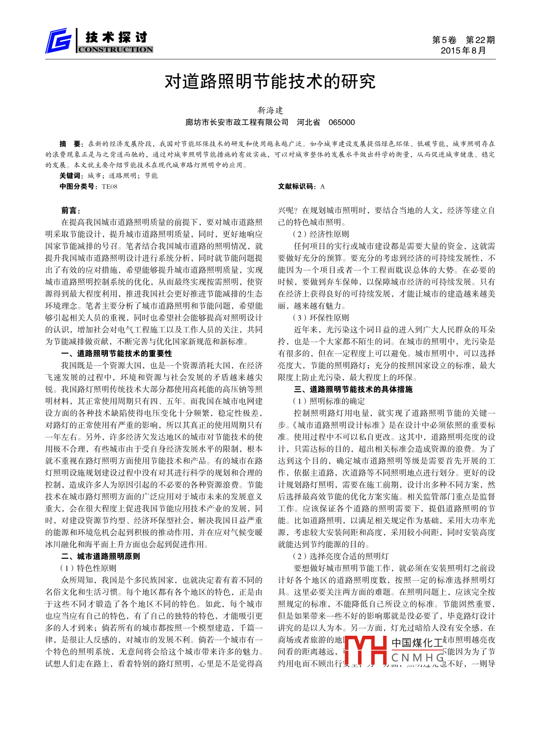 后L技術(shù)探過第5卷第22期CONSTRUCTION2015年8月對道路照明節(jié)能技術(shù)的研究靳海建廊坊市長安市政工程有限公司河北省065000摘要:在新的經(jīng)濟(jì)發(fā)展階段,我國對節(jié)能環(huán)保技術(shù)的硏發(fā)和使用越來越廣泛。如今城市建設(shè)發(fā)展提偈録色環(huán)保、低碳節(jié)能,城市照明存在的浪費(fèi)現(xiàn)象正是與之背道而馳的,通過對堿市照眀明節(jié)能措施的有效實(shí)施,可以對城市整伓的發(fā)展水平攽岀科學(xué)的衡量,從而促進(jìn)城市健康、穩(wěn)定的發(fā)展。本文就主要介紹節(jié)能技術(shù)在現(xiàn)代堿市路燈照明中的應(yīng)用。關(guān)鍵詞:城市;道路照明;節(jié)能中圖分類號:TEO8文獻(xiàn)標(biāo)識碼:A前言興呢?在規(guī)劃城市照明時(shí),要結(jié)合當(dāng)?shù)氐娜宋?經(jīng)濟(jì)等建立自在提高我國城市道路照明質(zhì)量的前提下,要對城市道路照已的特色城市照明明采取節(jié)能設(shè)計(jì),提升城市道路照明質(zhì)量,同時(shí),更好地響應(yīng)(2)經(jīng)濟(jì)性原則國家節(jié)能減排的號召。筆者結(jié)合我國城市道路的照明情況,就任何項(xiàng)目的實(shí)行或城市建設(shè)都是需要大量的資金,這就需提升我國城市道路照明設(shè)計(jì)進(jìn)行系統(tǒng)分析,同時(shí)就節(jié)能問題提要做好充分的預(yù)算。要充分的考慮到經(jīng)濟(jì)的可持續(xù)發(fā)展性,不岀了有效的應(yīng)對措施,希望能夠提升城市道路照明質(zhì)量,實(shí)現(xiàn)能因?yàn)橐粋€(gè)項(xiàng)目或者一個(gè)工程而耽誤總體的大勢。在必要的城市道路照明控制系統(tǒng)的優(yōu)化,從而最終實(shí)現(xiàn)按需照明,使資時(shí)候,要做到棄車保帥,以保障城市經(jīng)濟(jì)的可持續(xù)發(fā)展。只有源得到最大程度利用,推進(jìn)我國社會更好推進(jìn)節(jié)能減排的生態(tài)在經(jīng)濟(jì)上獲得良好的可持續(xù)發(fā)展,才能讓城市的建造越來越美環(huán)境理念。筆者主要分析了城市道路照明和節(jié)能問題,希望能麗,越來越有魅力夠引起相關(guān)人員的重視,同時(shí)也希望社會能夠提高對照明設(shè)計(jì)(3)環(huán)保性原則的認(rèn)識,增加社會對電氣工程施工以及工作人員的關(guān)注,共同近年來,光污染這個(gè)詞日益的進(jìn)入到廣大人民群眾的耳朵為節(jié)能減排做貢獻(xiàn),不斷完善與優(yōu)化國家新規(guī)范和新標(biāo)準(zhǔn)。拎,也是一個(gè)大家都不陌生的詞。在城市的照明中,光污染是道路照明節(jié)能技術(shù)的重要性有很多的,但在一定程度上可以避免。城市照明中,可以選擇我國既是一個(gè)資源大國,也是一個(gè)資源消耗大國,在經(jīng)濟(jì)亮度大,節(jié)能的照明路燈;充分的按照國家設(shè)立的標(biāo)準(zhǔn),最大飛速發(fā)展的過程中,環(huán)境和資源與社會發(fā)展的矛盾越來越尖限度上防止光污染,最大程度上的環(huán)保銳。我國路燈照明傳統(tǒng)技術(shù)大部分都使用高耗能的高壓鈉等照三、道路照明節(jié)能技術(shù)的具體措施明材料,其正常使用周期只有四、五年。而我國在城市電網(wǎng)建(1)照明標(biāo)準(zhǔn)的確定設(shè)方面的各種技術(shù)缺陷使得電壓變化十分頻繁,穩(wěn)定性極差,控制照明路燈用電量,就實(shí)現(xiàn)了道路照明節(jié)能的關(guān)鍵對路燈的正常使用有嚴(yán)重的影響,所以其真正的使用周期只有步。《城市道路照明設(shè)計(jì)標(biāo)準(zhǔn)》是在設(shè)計(jì)中必須依照的重要標(biāo)年左右。另外,許多經(jīng)濟(jì)欠發(fā)達(dá)地區(qū)的城市對節(jié)能技術(shù)的使準(zhǔn)。使用過程中不可以私自更改。這其中,道路照明亮度的設(shè)用極不合理,有些城市由于受自身經(jīng)濟(jì)發(fā)展水平的限制,根本計(jì),只需達(dá)標(biāo)的目的,超出相關(guān)標(biāo)準(zhǔn)會造成資源的浪費(fèi)。為了就不重視在路燈照明方面使用節(jié)能技術(shù)和產(chǎn)品。有的城市在路達(dá)到這個(gè)目的,確定城市道路照明等級是需要首先開展的工燈照明設(shè)施規(guī)劃建設(shè)過程中沒有對其進(jìn)行科學(xué)的規(guī)劃和合理的作,依據(jù)主道路,次道路等不同照明地點(diǎn)進(jìn)行劃分。更好的設(shè)控制,造成許多人為原因引起的不必要的各種資源浪費(fèi)。節(jié)能計(jì)規(guī)劃路燈照明,需要在施工前期,設(shè)計(jì)出多種不同方案,然技術(shù)在城市路燈照明方面的廣泛應(yīng)用對于城市未來的發(fā)展意義后選擇最高效節(jié)能的優(yōu)化方案實(shí)施。相關(guān)監(jiān)管部門重點(diǎn)是監(jiān)督重大,會在很大程度上促進(jìn)我國節(jié)能應(yīng)用技術(shù)產(chǎn)業(yè)的發(fā)展,同工作。應(yīng)該保證各個(gè)道路的照明需要下,提倡道路照明的節(jié)時(shí),對建設(shè)資源節(jié)約型、經(jīng)濟(jì)環(huán)保型社會,解決我國日益嚴(yán)重能。比如道路照明,以滿足相關(guān)規(guī)定作為基礎(chǔ),采用大功率光的能源和環(huán)境危機(jī)會起到積極的推動(dòng)作用,并在應(yīng)對氣候變暖源,考慮較大安裝間距和髙度,采用較小間距,同時(shí)安裝高度冰川融化和海平面上升方面也會起到促進(jìn)作用就能達(dá)到節(jié)約能源的目的。二、城市道路照明原則