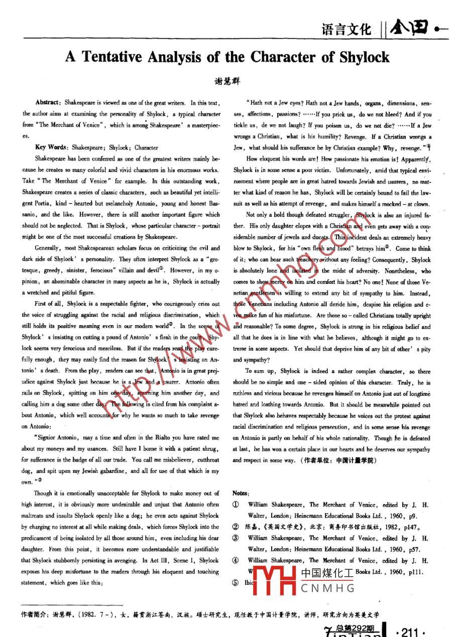 語言文化||公田。A Tentative Analysis of the Character of Shylock謝慧群“Hath not a Jew eyes? Hath not a Jew hands, organs, dimensions, sen-the author ainms at examining the personality of Shylck, a sypical charater ses, afectinse, psins? ... you prick s, do we not bleed? And if youfrom“The Merchant of Venice",which is among Shakespeare' s mastepiec tickle us, de we not laugh? If you pisonus, do we not die? ... a Jewwrongs a Christian, what is his humility? Revenge. If a Christian wrongs aKey Words: Shakespeare; Shylock; CharncterJew, what should his suferance be by Christian example? Why, revenge. ”電Shakespeare has been confered嶼one of the greatest writers mainly be-How eloxquent his words are! How psionate hie emotion is! Apparenly,cause he creates so many colorful and vivid characlers in his enormous works.Shylock is in sone sense a poor victirn. Unforunately, anid that typical envi-Take“The Merchant of Venice" for exmple. In this outstanding work,ronment whene people are in great hatred towards Jewish and usurers, no mat-Shakespeare creates a series of casics cheracters, such as beautiful yet itelli- ler what kind of reason he has, Shylock will be certainly bound to faill the law-gent Portia, kind - hearted but melancholy Antonio, young and honest Bas- suit as well as his atempt of revenge, and makes himself a mocked - at clown.sanio, and the like. However, there is still another important figure whichNot only a bold though deated stuge, Shylock is alo an injured 血should not be neglected. That is Shylock, whose particular character - portrait ther. His only daughter elopes with 8 Christian and even gets away with a cop-might be one of the mot sccsful creations by Shakepeare.siderable number of jewcls and ducats. This incident deals an extremely hevyCeneally, most Shakespearean scholars focus on citicing the evil and blow to Shylock, for his”own flesh and blood" betrays him9. Come to thinkdark side of Shylock' s psonality. They oft.on itepet Shylock sa“go of it: wbo can ber such treachery wihout any felin? Consequenly, Shylockeque, greedy, sinister, ferocious" vllain and deri. However, in my 0-is abeoutely lone and iolated in the midst of adversit. Noneheles, whopinion, an aborinable character in many apecte as he is, Shylock is actully comes to show mercy on him and comifort his heart? No one! None of those Vo-a wrelched and piful fgure.First of all, Shylock is a respectable fighter, who couregeously cries out thoe Venetians ineluding Antonio all deide him, despise his religion and ethe voice of stuggling against the racial and religious diserimination, whichstill holds its positive meaning even in our modem world. In the scene of and reasonable? To some degree, Shylock is strong in his religjous belief andshylock' s insting on cuting a pound of Antonio' s fesh in the count, Shyall that he does is in line with what he believes, although it might go to exlock seems very ferocious and mriless. But if the readers read the play care- treme in sone aspects. Yet should that deprive him of any bit of other' 8 pityfully enough, they may easily find the reason for Shyock' s isisting on An-and sympethy?onio' s death. From the play, readers can see that, Antorio is in geat prej-To 8um up, Shylock is indeed a rather complex character, so thereudice agint Shylock just because he is a Jew and a utsurer. Anionio ofenshould be no simple and one - sided opinion of this character. Tnily, he israils on Shylock, sitting on him one day, spuming him another day, and ruhess and vicious because he revenges himself on Antonio just out of lngtimiealling him a dog some obher day. The fllowing is cited from his complaint ahatred and loathing towards Antonio. But it sbould be meanwhile pointed outbout Antonio, which well accounts for why he wants so much to take revengethat Shylock alo behaves respectably because he voices out the protest agpinston Antonio:racial discrimination and religious persecution, and in some senae his revenge“Signior Antonio, may a time and often in the Rialto you have rated meon Antonio is parly on behalf of his whole nationality. Though he is defeatedabout my moneys and my usances. Still have 1 borme it with a patient shrug,at last, he has won 8 certain place in our hearts and he deserves our sympathyfor sfferance is the badge of all our trade. You call me misbeliever, cuthroatand respect in some way. (作者單位: 中國計隆學院)dog,and spit upon my Jewish gabardine, and all for use of that which is myown. "Though it is emotionally unaceeptable for Shylock to make moncy out of Notes: .high interest, it is obviously more undesirable and unjust that Antonio oftenD William Shakepeare, The Merchant of Venice, edited by J H.maltreats and insults Shylock openly like a dog; he even acts against ShylockWalter, London; Heincmenn Educational Books Ld., 1960, p9.by changing no interest at all while making deals, which forces Shylock into theD陳嘉,《英國文學史》,北京:商務印書館出版社, 1982, pl47。predicament of being isolated by all those around him, even including his dear③Wilian Sakespeare, The Merchant of Venice, edited by J. H.daughter. From this point, it becomes more understandable and justifiableWaler, London: Heinemann Educational Books ldd, 1960, p57.thal Shyloeck subbomly persiting in avenging. In Act II,Scene 1, Shylock④Wllim Shakespere, The Merchent of Venice, edited by J. H.exposes his deep misotune to the readers through his eloquent and touching中國煤化工Books Ld, 1960, p1statement, which goes like this;YHCNMHG作者簡介:謝慧群,(1982. 7-), 女籍貫浙江蒼南,漢族。碩士研究生,現(xiàn)任教于中國計量學院,講師,研究方向為英美文學總第292期JinTian .211.