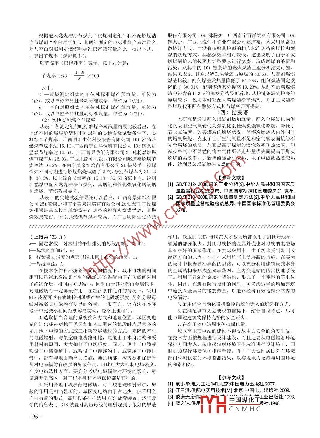 2009年第11期大眾科技No.11 ,2009(總第123期)DA ZHONG KEJ1(C umulatively No.123)燃煤潔凈節(jié)煤劑在燃煤燃燒中增熱節(jié)煤技術(shù)機(jī)理的研究陳其厚1,林文業(yè)2,林葵2,黃潤(rùn)均1,陳霓1( 1.廣西南寧霖榮盎環(huán)保能源科技有限責(zé)任公司,廣西南寧530007 ;2.廣西分析測(cè)試研究中心,廣西南寧530022 )[摘要] 文章旨對(duì)燃煤潔凈節(jié)煤燃燒中增氧、強(qiáng)氧化燃燒綜合增熱技術(shù)機(jī)理進(jìn)行研究,通過(guò)在燃煤中配入具有增氧劑和將空氣氧轉(zhuǎn)化固定為強(qiáng)氧化劑的催化增效作用的燃煤潔凈節(jié)煤劑,使燃煤由一般氧化燃燒轉(zhuǎn)變?yōu)榻档椭瘘c(diǎn)溫度的強(qiáng)氧化燃燒和增氧燃燒,克服了由于空氣氧量不足和空氣氧僅從煤炭表面接觸及空氣氧氧化性不強(qiáng),燃燒不完全的缺陷,提高了煤炭的燃燒效率和新增熱源增熱作用;同時(shí)減少空氣中不助燃惰性氣體所帶走的熱量損失,從而提高了煤炭燃燒的綜合熱效率,達(dá)到綜合增熱節(jié)煤的目的。[關(guān)鍵詞]燃燒效率;熱效率;增氧增熱燃燒;節(jié)煤率;強(qiáng)氧化燃燒;強(qiáng)氧化劑;催化增效劑[中圖分類號(hào)] TQ534.2[文獻(xiàn)標(biāo)識(shí)碼] A[文章編號(hào)] 1008- 120090111 0094- 03煤炭燃燒效果是以煤炭是否完全燃燒的燃燒效率,及燃2.要求燒了的煤炭所產(chǎn)生的熱量是否完全被利用的熱效率的集成結(jié)具有計(jì)煤量的地磅秤或磅秤,有計(jì)量蒸汽產(chǎn)量的蒸汽累果集中為節(jié)煤率。一方面要 盡量使煤炭全部燃燒,減少不完計(jì)流量計(jì),有顯示爐膛溫度,蒸汽壓力等測(cè)定計(jì)量用儀表。全燃燒所造成的煤炭浪費(fèi)損失,追求高的燃燒效率產(chǎn)生更多選用其通常燃燒的同--煤種的混合煤作為對(duì)照試驗(yàn)測(cè)定煤的熱量;另一方面要盡量使產(chǎn)生的熱量在傳導(dǎo)加熱過(guò)程中減樣,并抽取煤樣進(jìn)行煤發(fā)熱量的工業(yè)分析。少熱量損失,追求高的熱效率以獲取更高的增熱節(jié)煤效果。(二)試樣的制備和測(cè)定在實(shí)際生產(chǎn)中考察燃煤燃燒效率,熱效率的方法。本研究是1.燃煤試樣的制備采用對(duì)照測(cè)定節(jié)煤率的方法來(lái)驗(yàn)證增氧、強(qiáng)氧化燃燒增熱節(jié)根據(jù)各試驗(yàn)點(diǎn)的燃煤鍋爐爐型、窯型和所燃燒的煤種以煤的效果。影響煤炭燃燒效率的主要因素,有煤炭中的可燃性物質(zhì)及計(jì)劃確定的燃煤總量,按確定煤量比例的燃煤潔凈節(jié)煤劑碳、揮發(fā)分、硫化物等多種不同組分的燃燒特點(diǎn)及伴生不燃量配入煤炭中,經(jīng)充分混合均勻后,進(jìn)行燃燒對(duì)比試驗(yàn)。2.測(cè)定方法燒的灰分組分量多少的影響;燃燒中空氣助燃的氧氣與煤炭(1)通過(guò)相同的煤種和相同的煤量,在同一鍋爐的燃燒燃燒方式及伴隨不助燃的惰性氣體的影響;各種爐窯的不同條件下進(jìn)行配與不配燃煤潔凈節(jié)煤劑的對(duì)照試驗(yàn),測(cè)定記錄燃燒方式等因素的影響。在以上的各種影響因素中,要獲取其產(chǎn)蒸汽總量和實(shí)際耗煤總量,最后以噸標(biāo)準(zhǔn)煤產(chǎn)蒸汽量計(jì)增熱節(jié)煤效果最重要的因素是如何改變空氣中氧量不足;空算出其配燃煤潔凈節(jié)煤劑實(shí)際生產(chǎn)中增熱節(jié)煤的效果。氣氧與煤炭?jī)H從表面接觸助燃及空氣氧氧化性不強(qiáng)與煤燃燒(2)先燃燒測(cè)定不配燃煤潔凈節(jié)煤劑的對(duì)照組煤樣,測(cè)著火點(diǎn)溫度高的缺陷。研究在燃煤中增氧和強(qiáng)氧化燃燒增熱定記錄其產(chǎn)蒸汽總量和實(shí)際耗煤總量。作用的機(jī)理,通過(guò)在煤炭燃燒中從煤內(nèi)部增加氧量燃燒和轉(zhuǎn)(3)接著燃燒測(cè)定配燃煤潔凈節(jié)煤劑的試驗(yàn)組煤樣,測(cè)化空氣氧的一般氧化燃燒為強(qiáng)氧化燃燒,克服了由于空氣氧量不足和空氣氧僅與煤炭表面接觸不完全燃燒,著火點(diǎn)溫度(4)各試驗(yàn)點(diǎn)燃煤煤樣發(fā)熱量的工業(yè)分析。高的缺陷,提高了煤炭的燃燒效率,同時(shí)減少空氣中不助燃其測(cè)定結(jié)果記錄統(tǒng)計(jì)如表1、表2。的惰性氣體所帶走的熱量損失,并通過(guò)強(qiáng)氧化燃燒的氧化一(三)結(jié)果分析與討論還原反應(yīng),固硫生成硫酸鹽生成熱和電子電磁波熱效應(yīng)新增1.煤炭燃燒效率的主要影響因素?zé)嵩吹木C合增熱節(jié)煤的目的。(1)煤炭中的可燃性物質(zhì)碳、揮發(fā)分、硫化物等多種不(一)實(shí)驗(yàn)設(shè)備及要求同組分燃燒特點(diǎn)及伴生的不可燃性物質(zhì)灰分組分量多少的影1.實(shí)驗(yàn)設(shè)備響。主要表現(xiàn)在:碳是固體可燃性物質(zhì),是通過(guò)表面與空氣分別在廣西明陽(yáng)生化科技股份有限公司10t 沸騰爐、廣接觸由表及里逐步燃燒,大塊煤過(guò)大時(shí)多燒不過(guò)心而造成損西南寧百洋飼料有限公司10t 鏈條爐、廣西粵景漿紙有限公失,揮發(fā)分是煤中可燃性物質(zhì)的重要組分,它與可燃物質(zhì)碳司25t 粉煤爐、廣西北流仲禮瓷業(yè)有限公司手工投煤爐條隧不同,它是碳、氫元素組成的烴類有機(jī)化合物,在常溫時(shí)是道窯、南寧美泉組培苗有限公司2t快裝手工投煤爐排鍋爐進(jìn)以大分子結(jié)構(gòu)的固體與碳伴生存在,當(dāng)遇高溫時(shí)大分子鏈瞬行應(yīng)用試驗(yàn)測(cè)