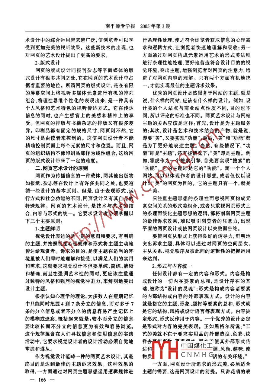 第24卷3期南平師專學(xué)報(bào)Vol. 24 No. 32005年7月.JOURNAL OF NANPING TEACHERS COLLEGE .July. 2005網(wǎng)頁(yè)設(shè)計(jì)研究孫迎春(南平師范高等專科學(xué)校藝術(shù)系,福建武夷山354300)摘要本文將網(wǎng)頁(yè)藝術(shù)設(shè)計(jì)與其他藝術(shù)設(shè)計(jì)形式進(jìn)行比較,嘗試從網(wǎng)頁(yè)藝術(shù)設(shè)計(jì)的內(nèi)容、原則和特點(diǎn)等三個(gè)方面,對(duì)這個(gè)新的藝術(shù)設(shè)計(jì)領(lǐng)域進(jìn)行初步的歸納總結(jié)和理論探討。關(guān)鍵詞交互性持續(xù)性多維性綜合性中圖分類號(hào): 1P393.092文獻(xiàn)標(biāo)識(shí)碼: A文章編號(hào): 1008- 5963(2005)03 - 0165 - 04Study on Webpage DesignSUN Yingchun(An Department of Nanping Teachers College, Wuyishan, Fujian 354300)Abstract The aricle sunmarizes and systematicallyl discusses the content, priciple and feature o webpage art designing. It also cm-Pares webpage art designing with other types of art designing.Key words interactive durative multidimensional integrative隨著時(shí)代的發(fā)展,網(wǎng)站建設(shè)越來越接近于一門實(shí)際上,它不僅是一種技能,更是藝術(shù)與技術(shù)的高藝術(shù)而不僅僅是一項(xiàng)技術(shù)。網(wǎng)頁(yè)的藝術(shù)設(shè)計(jì),日益.度統(tǒng)一。被網(wǎng)站建設(shè)者所注重。在目前國(guó)內(nèi)對(duì)此領(lǐng)域研究一、網(wǎng)頁(yè)藝術(shù)設(shè)計(jì)的內(nèi)容甚少的情況下,本文將網(wǎng)頁(yè)藝術(shù)設(shè)計(jì)與其他藝術(shù)設(shè)設(shè)計(jì)活動(dòng)中包含耆主觀和客觀兩方面的因素,計(jì)形式進(jìn)行比較,嘗試從網(wǎng)頁(yè)藝術(shù)設(shè)計(jì)的內(nèi)容、原在確立了網(wǎng)頁(yè)主題之后,首先要明確和熟悉設(shè)計(jì)的則和特點(diǎn)等三個(gè)方面,對(duì)這個(gè)新的藝術(shù)設(shè)計(jì)領(lǐng)域進(jìn)對(duì)象和構(gòu)成的要素。網(wǎng)頁(yè)藝術(shù)設(shè)計(jì)涉及的具體內(nèi).行初步的歸納總結(jié)和理論探討。網(wǎng)頁(yè)藝術(shù)設(shè)計(jì)是容很多,可以概括為視聽元素和版式設(shè)計(jì)兩個(gè)方藝術(shù)與技術(shù)的高度統(tǒng)-,本文指出網(wǎng)頁(yè)藝術(shù)設(shè)計(jì)包面。含視聽元素與版式設(shè)計(jì)兩項(xiàng)內(nèi)容;以主題鮮明、形1.視聽元素式與內(nèi)容相統(tǒng)--.、強(qiáng)調(diào)整體為設(shè)計(jì)原則;具有交互這里所說的視聽元素,主要包括:文本、背景、性與持續(xù)性、多維性、綜合性、版式的不可控性、藝按鈕、圖標(biāo)、圖像、表格、顏色、導(dǎo)航工具、背景音樂、術(shù)與技術(shù)結(jié)合的緊密性等五個(gè)特點(diǎn)。在明確了網(wǎng)動(dòng)態(tài)影像等。無論是文字、圖形、動(dòng)畫,還是音頻、頁(yè)藝術(shù)設(shè)計(jì)與網(wǎng)站主題的關(guān)系的基礎(chǔ)上,提出了視頻,網(wǎng)頁(yè)設(shè)計(jì)者所要考慮的是如何以感人的形式“美"和“功能”都是為了更好地表達(dá)網(wǎng)站主題這一把它們放進(jìn)頁(yè)面這個(gè)“大畫布” 里。多媒體技術(shù)的觀點(diǎn)。運(yùn)用大大豐富了網(wǎng)頁(yè)藝術(shù)設(shè)計(jì)的表現(xiàn)力。網(wǎng)頁(yè)藝術(shù)設(shè)計(jì)是伴隨著計(jì)算機(jī)互聯(lián)網(wǎng)絡(luò)的產(chǎn)以上各視聽元素大多數(shù)瀏覽器本身都可以顯生而形成的視聽設(shè)計(jì)新課題,是網(wǎng)頁(yè)設(shè)計(jì)者以所處示或收聽,無需任何外部程序或模塊支持。比如,時(shí)代所能獲取的技術(shù)和藝術(shù)經(jīng)驗(yàn)為基礎(chǔ),依照設(shè)計(jì)大部分瀏覽器都可以顯示GIF、JPEG圖形和GIF動(dòng)目的和要求自覺地對(duì)網(wǎng)頁(yè)的構(gòu)成元素進(jìn)行藝術(shù)規(guī)畫。還有些多媒體文件(如MP3音樂)需要先下載劃的創(chuàng)造性思維活動(dòng),必然要成為設(shè)計(jì)藝術(shù)的重要到本地硬盤上,然后啟動(dòng)相應(yīng)的外部程序來播放。組成部分,并隨著網(wǎng)絡(luò)技術(shù)的發(fā)展而發(fā)展。表面上另外,在瀏覽器使甩插件可以播放更多格式的多媒看,它不過是關(guān)于網(wǎng)頁(yè)版式編排的技巧與方法,而體文件中國(guó)煤化工元素在網(wǎng)頁(yè)藝YHCNMHG收稿日期:2005 -04- 15作者簡(jiǎn)介:孫迎春(1977-),女,漢族,助教,主要研究方向:網(wǎng)頁(yè)設(shè)計(jì)。-165-南平師專學(xué)報(bào)2005 年第3期術(shù)設(shè)計(jì)中的綜合運(yùn)用越來越廣泛,使瀏覽者可以享行條理性處理,使之符合瀏覽者獲取信息的心理需受到更加完美的視聽效果。這些新技術(shù)的出現(xiàn),也求和邏輯方式,讓瀏覽者快速地理解和吸收;另一對(duì)網(wǎng)頁(yè)的藝術(shù)設(shè)計(jì)提出了更高的要求。方面通過對(duì)網(wǎng)頁(yè)構(gòu)成元素運(yùn)用藝術(shù)的形式美法則2、版式設(shè)計(jì)進(jìn)行條理性地處理,更好地營(yíng)造符合設(shè)計(jì)目的的視網(wǎng)頁(yè)的版式設(shè)計(jì)同報(bào)刊雜志等平面媒體的版覺環(huán)境,突出主題,增強(qiáng)瀏覽者對(duì)網(wǎng)頁(yè)的注意力,增式設(shè)計(jì)有很多共同之處,它在網(wǎng)頁(yè)的藝術(shù)設(shè)計(jì)中占進(jìn)了對(duì)網(wǎng)頁(yè)內(nèi)容的理解。只有兩個(gè)方面有機(jī)地統(tǒng)據(jù)著重要的地位。所謂網(wǎng)頁(yè)的版式設(shè)計(j