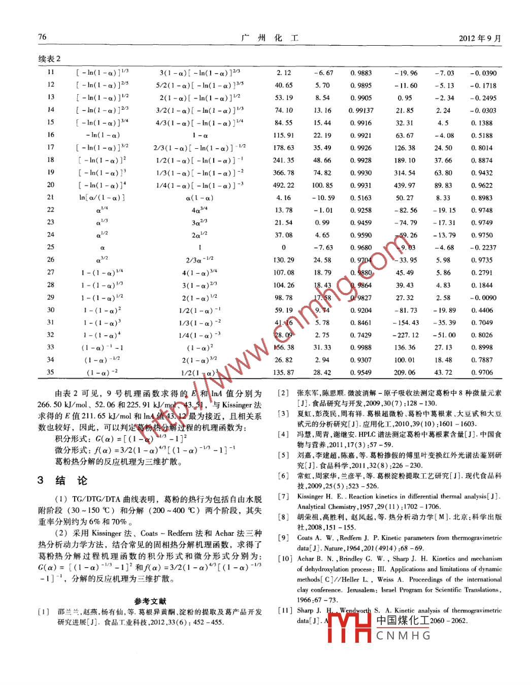 第40卷第18期廣州化工012年9月Guangzhou Chemical IndustrySeptember 2012葛粉的非等溫動力學研究周日輝,項少云2,李金江!,陳樸青1江西師范大學理化測試中心,江西南昌33022;2江西省廣豐五都中學,江西上饒334600)摘要:利用TG/DTA技術(shù),考察不同升溫速率下葛粉的熱分解特性,研究葛粉熱分解動力學,運用 Kissinger法、 CoatsRedfern法和 Achar法對非等溫動力學數(shù)據(jù)進行了分析。研究結(jié)果表明:在氮氣氣氛下,葛粉在280℃左右開始分解,至400℃以上基本分解完畢,反應(yīng)機理函數(shù)的積分形式和微分形式分別為:G(a)=[(1-a)13-1]2和f(a)=3/2(1-a)3[(1-a)l31]1,對應(yīng)的機理為三維擴散模型。關(guān)鍵詞:葛粉;熱重差熱分析;非等溫動力學;Coas- Redfern; Achar中圖分類號:0643文獻標識碼:A文章編號:1001-9677(202)18-0074-03Non-isothermol Kinetics Analysis of Kudzu StarchZHOU Ri-hui, XIANG Shao-yun, LI Jin-jiang, CHEN Pu-qing(1 Analytical and Testing Center, Jiangxi Normal University, Jiangxi Nanchang 3300222 Guangfeng Wudu Middle School, Jiangxi Shangrao 334600, ChinaAbstract: Kinetics and thermal decomposition behavior of kudzu starch were investigated using TG/ DTA technique atvarious heating rates. The non-isothermal kinetic data were analyzed with Kissinger method, Coats-Redfern method andAchar method. The results showed that the decomposition of kudzu starch was initiate at 280C and complete entirely above 400 C in nitrogen atmosphere. The integral and differential mechanism function were G(a)=[(1-a)--1land f(a)=3/2(1-a)[(1-a)-1], respectively. The mechanism was three -dimensional diffusion model.Key words: kudzu starch; TG/DTA; non-isothermol kinetics; Coats-Redfern: Achar葛是我國富有自然資源,除西藏、青海、新疆外,其他省區(qū)均在N2氣氛中(N2流速為100mLmn)分別以5、10、15、20℃/min有分布。近年來,國內(nèi)外對葛粉資源的品種、有效成分與藥理的升溫速率進行熱分析,實驗溫度范圍為30~900℃,實驗時以作用、提取方法與檢測技術(shù),以及在保健品領(lǐng)域中的應(yīng)用等方面a-Al2O3為參比物。進行了較多的研究25,但葛粉的熱行為和熱分解動力學機理函數(shù)尚未見報導本文采用熱重差熱分析(TGDA)技術(shù)對葛2結(jié)果與討論粉的熱行為進行研究,并利用模型函數(shù)法對葛粉的熱分解過程2.1葛粉的熱行為所遵循的動力學機理進行了探討,旨在為葛粉的開發(fā)和利用提供理論依據(jù)。測試了不同升溫速率對葛粉TG/DTG/DTA曲線的影響實驗結(jié)果表明,升溫速率的改變,對每個失重階段的溫度范圍1實驗部分略有影響;隨著升溫速率的加大,熱分析曲線整體向高溫方向移動,且DTA曲線的吸熱峰面積也隨之增大,此為升溫速率的1試劑與儀器增加造成的熱滯后效應(yīng),但每個失重階段的失重率基本保持不實驗所用的純天然葛粉,按照文獻的方法自行制備,在變。DZF-6020干燥箱中干燥12h,于研缽中充分研磨,裝人試劑瓶圖1給出了在氮氣氣氛下,升溫速率為10℃/min時葛粉的中密封待用。TG/DTG/DTA曲線,其中TG為熱重曲線,DTG為微分熱重曲TG/DTA6300型綜合熱分析儀,日本精工電子納米科技有限線,DTA為差熱曲線。圖2為葛粉在不同升溫速率下的TG曲公司制造。由圖1中的TG/DTG/DTA曲線可知,在整個升溫過程中,葛1.2實驗方法與條件粉有兩個明一險巴》粉中吸附自由水的失取葛粉試樣25mg左右,于容積為60uL的A2O3坩堝中,重,其溫度范中國煤化工6%,在DTA曲線上CNMHG作者簡介:周日輝(1980-),男,實驗師,主要從事熱分析及分子光譜研究,通訊作者項少云(1978-),女,中學一級,主要從事中學生物及化學教學工作。李金江(1982-),男,實驗師,主要從事分子光譜研究。陳樸青(1983-),男,實驗師,主要從事元素分析研究。第40卷第18期周日輝等:葛粉的非等溫動力學研究只有極其微弱的吸熱峰;第二階段為葛粉的分解階段,其溫度范式中,T為DTG的峰溫;B為升溫速率;R為氣體常數(shù);E為圍為200-400℃,失重率約為70%,在DTA曲線上表現(xiàn)為一個活化能:A為指前因子。以血(B/7)對1/7作圖(見圖3),由很強的吸熱峰,其吸熱焓為86.9J/g。400℃之后是殘留物的緩直線的斜率可求出E為21165kJ/mol,截距求出lnA為43.12。慢分解,曲線趨于平緩,最終熱解成炭和灰分。表1不同升溫速率下葛粉分解過程的基本數(shù)據(jù)Table 1 Basic data thermal decomposition of kudzu starchat various heating rates(B/7P)577.91.730l1.109I002003004005006007008001.70610.590.510.054596.29.786圖1葛粉的TG/DTG/DTA曲線(10℃/min)Fig. 1 TG/DTG/DTA curves for kudzu starch at heating rate of 10 C/min15℃/min10/Tp(K)圖3ln(B/T)對1/T曲線0℃/mFig 3 In(B/T: )vs. I/T2.2.2 Coats- Redfern法和 Achar法采用 Coats- Redfern法和 Achar法,結(jié)合常見的固相熱分解機理函數(shù),對葛粉的非等溫熱分析曲線進行數(shù)據(jù)分析,圖2葛粉在不同升溫速率下的TG曲線究葛粉熱分解的動力學。所用兩種方法的數(shù)學表達式為Fig 2 TG curves for kudzu starch at different heating rateCoats- Redfern方程9:In[ G(a/T ]= In(AR/BE)-E/RT(2)2.2葛粉的非等溫熱分解動力學Achar方程0-112.2.1 Kissinger法In[( da/dt)]/f(a)=InA-E/RT根據(jù)表1列出的不同升溫速率下葛粉分解過程的基本數(shù)式中:a是溫度為T時的分解率(即失重率);t為反應(yīng)時據(jù),利用 Kissinger方程間;da/dt為分解反應(yīng)速率;G(a)和f(a)分別為積分和微分形式的機理函數(shù)。以5℃/min的升溫速率的熱分析曲線為例(1)分別計算各種機理函數(shù)的活化能E和指前因子1nA值及相關(guān)系數(shù)r,結(jié)果如表2所示。表2通過 Coats- Redfern和 Achar法