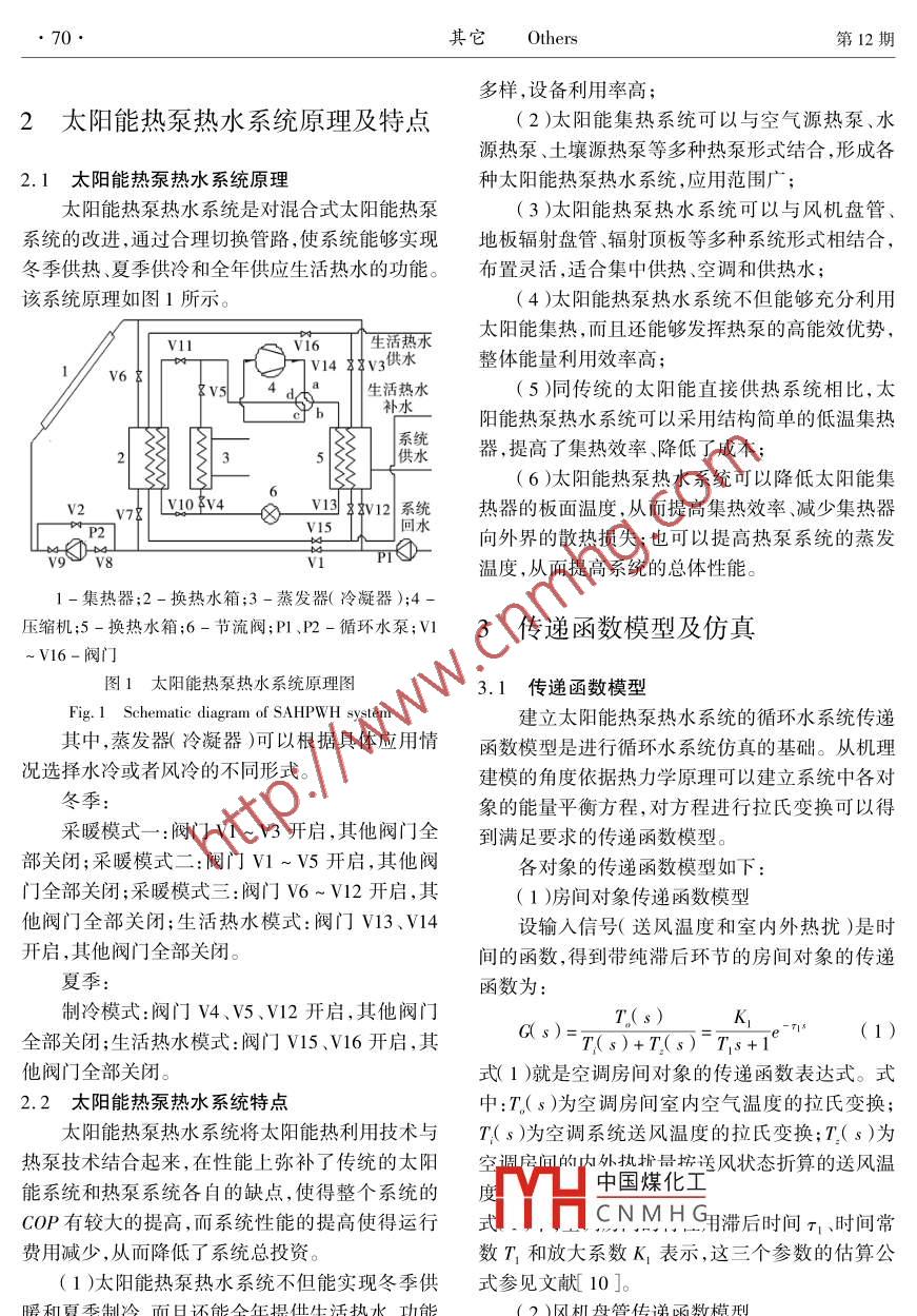 低溫與超導(dǎo)其它Cryo. & Supercond.第38卷第12期OthersVol.38 No. 12太陽(yáng)能熱泵熱水系統(tǒng)循環(huán)水流量控制仿真穆振英,由世俊(天津大學(xué)環(huán)境科學(xué)與工程學(xué)院,天津30002 )摘要:設(shè)計(jì)了一套新的太陽(yáng)能熱泵熱水系統(tǒng),介紹了該系統(tǒng)的工作原理和特點(diǎn),分析表明,該系統(tǒng)既具有普通太陽(yáng)能熱泵的優(yōu)點(diǎn),又能夠?qū)崿F(xiàn)供暖、供冷、全年供應(yīng)生活熱水等多種功能。采用機(jī)理建模的方法建立了房間冷負(fù)荷、風(fēng)機(jī)盤管、執(zhí)行器、傳感器和循環(huán)水系統(tǒng)的傳遞函數(shù)模型。設(shè)計(jì)了太陽(yáng)能熱泵熱水系統(tǒng)的循環(huán)水系統(tǒng)PID控制、模糊控制和模糊自適應(yīng)PID控制三種控制方案,并針對(duì)設(shè)計(jì)的三種控制方案對(duì)系統(tǒng)進(jìn)行了控制仿真。結(jié)果表明,從調(diào)節(jié)時(shí)間、超調(diào)量和階躍響應(yīng)等幾個(gè)方面綜合考慮,由于模糊自適應(yīng)PID控制能夠在線調(diào)整控制系統(tǒng)的特性參數(shù),隨時(shí)適應(yīng)系統(tǒng)的運(yùn)行變化,在太陽(yáng)能熱泵熱水系統(tǒng)的循環(huán)水系統(tǒng)運(yùn)行控制上具有明顯的優(yōu)勢(shì)。關(guān)鍵詞:太陽(yáng)能熱泵熱水系統(tǒng);仿真;PID控制;模糊控制;模糊自適應(yīng)PID控制.Circulating water flow control simulation of solar - assisted heat pumpwater heating ( SAHPWH ) systemMu Zhenying, You Shijun( School of Environment Science and Technology , Tianjin University , Tianjin 300072, China )Abstract: A new kind of solar - assisted heat pump ( SAHP ) system was designed, which not only has the general advanta-ges, but also can heat,cool ,provide domestic hot water throughout the year. Transfer function models for the room cooling load,fan - coil, implementation, sensor and the cireulating water system were established on the mechanism modeling method. Threecontrol scheme were designed, including PID control, fuzzy control and fuzzy adaptive PID control, which were used in the circu-lating water system and the room temperature control system. And all three control scheme were simulated. The results show that ,considering the stting time,overshoot ,the step response,and so on comprehensively, the fuzy adaptive PID contrller can ad-just the control characteristics parameters and adapt to system operation changes at any time. So it has obvious advantages in thecirculating water system operation control of the SAHPWH systemKeywords :SAHPWH system, Simulation, PID control, Fuzzy control, Fuzzy adaptive PID control1前言供暖、也能供冷、還能全年供應(yīng)生活熱水的功能。由于太陽(yáng)能能量密度低、分散,且具有明顯的太陽(yáng)能取之不盡,用之不竭,是一種清潔的可間歇性。因此,太陽(yáng)能熱泵熱水系統(tǒng)的合理控制再生能源,我國(guó)太陽(yáng)能資源豐富,利用空間較調(diào)節(jié)是保證供能效果的重要技術(shù)措施。仿真分析大1。太陽(yáng)能熱泵系統(tǒng)是太陽(yáng)能和熱泵的有機(jī)是確定控制系統(tǒng)方案和控制算法的重要研究方結(jié)合,具有較高的綜合能量利用效率,并且能夠提法,不但安全、方便,而且可大大降低研究成本,應(yīng)供穩(wěn)定的冷熱量[2-4],是--種先進(jìn)的太陽(yáng)能利用用廣泛。方式。為了進(jìn)一步增強(qiáng)太陽(yáng)能熱泵系統(tǒng)的功能,目前,太陽(yáng)能熱利用系統(tǒng)控制調(diào)節(jié)的文獻(xiàn)多擴(kuò)大其使用范圍,本實(shí)驗(yàn)室太陽(yáng)能利用課題組設(shè)以直接膨脹式系統(tǒng)和太陽(yáng)能熱泵系統(tǒng)為研究對(duì)計(jì)了一種全新的太陽(yáng)能熱泵熱水系統(tǒng)(SolarAs-象[5-9],針對(duì)太陽(yáng)能熱泵熱水系統(tǒng)的研究較少。sisted Heat Pump W ater Heating System, SAHP-因此本文以夏季 T況為例,主要針對(duì)太陽(yáng)能熱泵中國(guó)煤化工55問(wèn)題進(jìn)行仿真研究。WH ),通過(guò)對(duì)管路的合理設(shè)計(jì),最終實(shí)現(xiàn)了既能YHCNMHG收稿日期:2010 -06-12基金項(xiàng)目“十一.五”國(guó)家科技支撐計(jì)劃( 2006BAJ04A15 )資助。作者簡(jiǎn)介:穆振英(1978-),女,博士,研究方向?yàn)樘?yáng)能熱利用技術(shù)研究。.70.其它Others第12期多樣,設(shè)備利用率高;2太陽(yáng)能熱泵熱水系統(tǒng)原理及特點(diǎn)(2 )太陽(yáng)能集熱系統(tǒng)可以與空氣源熱泵、水源熱泵、土壤源熱泵等多種熱泵形式結(jié)合,形成各2.1太陽(yáng)能熱泵熱水系統(tǒng)原理種太陽(yáng)能熱泵熱水系統(tǒng),應(yīng)用范圍廣;太陽(yáng)能熱泵熱水系統(tǒng)是對(duì)混合式太陽(yáng)能熱泵. ( 3 )太陽(yáng)能熱泵熱水系統(tǒng)可以與風(fēng)機(jī)盤管、系統(tǒng)的改進(jìn),通過(guò)合理切換管路,使系統(tǒng)能夠?qū)崿F(xiàn)地板輻射盤管、輻射頂板等多種系統(tǒng)形式相結(jié)合,冬季供熱、夏季供冷和全年供應(yīng)生活熱水的功能。布置靈活,適合集中供熱、空調(diào)和供熱水;該系統(tǒng)原理如圖1所示。(4)太陽(yáng)能熱泵熱水系統(tǒng)不但能夠充分利用太陽(yáng)能集熱,而且還能夠發(fā)揮熱泵的高能效優(yōu)勢(shì),V11Vi6T↑生活熱水門V14 *zv3供水整體能量利用效率高;V6本8V5生活熱水( 5 )同傳統(tǒng)的太陽(yáng)能直接供熱系統(tǒng)相比,太補(bǔ)水陽(yáng)能熱泵熱水系統(tǒng)可以采用結(jié)構(gòu)簡(jiǎn)單的低溫集熱器,提高了集熱效率