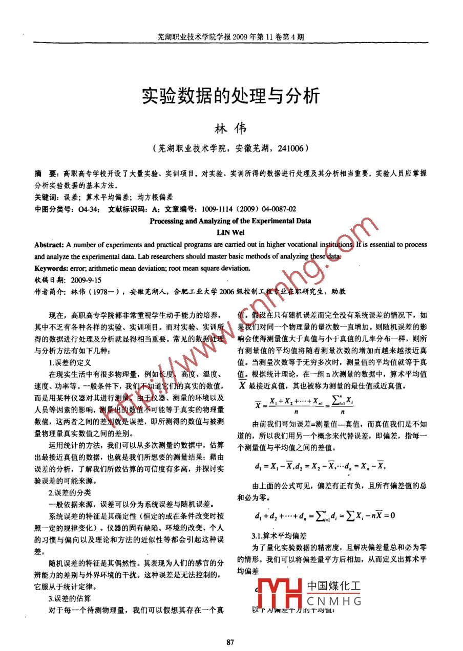 蕪湖職業(yè)技術學院學報2009年第11卷第4期實驗數據的處理與分析林偉(蕪湖職業(yè)技術學院,安徽蕪湖,241006 )摘要:高職高專學校開設了大量實驗、實訓項目.對實驗、實訓所得的數據進行處理及其分析相當重要.實驗人員應掌握分析實驗數據的基本方法。關鍵詞:誤差;算術平均偏差;均方根偏差.中圖分類號: 04-34; 文獻標識碼: A:文章編號: 109-1114 (2009) 04-0087-02Processing and Analyzing of the Experimental DataLIN WeiAbstract: A number of experiments and practical programs are carried out in higher vocational institutions. It is essential to processand analyze the experimental data. Lab researchers should master basic methods of analyzing these data.Keywords: error; arithmetic mean deviation; root mean square deviation.收稿日期: 2009-9-15作者簡介:林偉(1978-),安徽蕪湖人,合肥工業(yè)大學2006級控制工程專業(yè)在職研究生,助教現在,高職高專學院都非常重視學生動手能力的培養(yǎng),值。假設在只有隨機誤差而完全沒有系統(tǒng)誤差的情況下,如其中不乏有各種各樣的實驗、實訓項目。而對實驗、實訓所果我們對同一個物理 量的量次數一直增加。則隨機誤差的影得的數據進行處理及分析就顯得相當重要。常見的數據處理響 會使得測量值大于真值與小于真值的幾率分布一樣,則所與分析方法有如下幾種:有測最值的平均值將隨者測最次數的增加而越米越接近真1.誤差的定義值。當測量次數等于無窮多次時,測量值的平均值就等于真在現實生活中有很多物理量,例如長度、高度、溫度、值。根據統(tǒng)計理論,在一-組n次測最的數據中,算術平均值速度、功率等。一般條件下,我們不知道它們的真實的數值,X 最接近真值,其也被稱為測量的最佳值或近真值。而是用某種儀器對其進行測量。由于儀器、測量的環(huán)境以及x= x+X+.+X._X人員等因素的影響,測量出的數值不可能等于真實的物理量數值,這兩者之間的差別就是誤差,即所測得的數值與被測由前我們可知誤差=測量值-真值, 而真值我們是不知量物理量真實數值之間的差別。道的,所以我們用另一個概念來代替誤差,即偏差,指每- -運用統(tǒng)計的方法,我們可以從多次測量的數據中,估算個測量值與平均值之間的差值。出最接近真值的數據,也就是我們所想要的測量結果:藉由誤差的分析,了解我們所做估算的可信度有多高,并探討實d=x.-x,d2=Xz-..-d.=x.-x,驗誤差的可能來源。由上面的公式可見,偏差有正有負,且所有偏差值的總2.誤差的分類-般依據來源,誤差可以分為系統(tǒng)誤差與隨機誤差。和必為零。系統(tǒng)誤差的特征是其確定性(恒定的或在條件改變時按d,+-.+d,=>"d.=Zx,-nX=0照一定的規(guī)律變化)●儀器的固有缺陷、環(huán)境的改變、個人的習慣與偏向以及理論和方法的近似性等都會引起這種誤3.1.算術平均偏差為了量化實驗數據的精密度,且解決偏差量總和必為零差隨機誤差的特征是其偶然性。其表現為人們的感官的分的情形。我們可以將偏差量平方后相加,從而定義出算術平辨能力的差別與外界環(huán)境的干擾。這種誤差是無法控制的,均偏差它服從于統(tǒng)計定律。中國煤化工3.誤差的估算TH.CNMH G對于每一個待測物理量,我們可以假想其存在一一個真以下川調左丁萬N干均組:87林偉:實驗數據的處理與分析σ =!z(x,-XX+σ>X>X-σ范圍內的機率為68.3%。(2:1)x+20>x>8 -20范圍內的機率為95.4% . (20:1)治Ex -282x.+E劉x+3σ>x>x -3σ范圍內的機率為9.% . (350:1)x+4o>X>X-4σ范圍內的機率為9.9949%9 .(5000:1)Ex} -2nXx3 +nx*)U.U4 [網一=HZx?-x'0.035 t0.03 I0025 t我們計算方差時,可將其簡化為平方的平均值減去平均0.02 t值的平方,這比直接用公式計算更簡單。0.015 t3.2.均方根偏差(方差) :001 |0.005 I計算每一-個測量值與平均值之間的偏差,再取其平方的......100平均值然后開方,此結果被稱為均方根偏差或標準偏差。(:+.+..2匹進行多次測量時,有時候某些數據會與平均值相差較多,究其原因可能是測量時不小心出現觀測錯誤或讀數錯計算n個數據的個別偏差時,需先計算平均值.當有平誤。 就是否該舍去那些可疑數據而言,下面的例子可作為參均值時,只要有n-1個數據便可以算出所有的偏差量。換言考。之,在計算方差(偏差量平方的平均值)時,數據中的獨立例如:測量某物體長度100次,計算出平均值與標準差變數僅有n-1個,因此計算平均值時若將分母改為n-1較為(非平均值的標準差)后,發(fā)現有3組數據落在3倍標準差合理。因此樣本分布(有限次數)數據的標準差被定義為:外,4組落在2倍與3倍之間,其余皆在平均值與標準差之24間。采用常態(tài)分布進行分析,由于數據落在2倍標準內的幾V n-1率有4.6%,因此那4組數據是合理的,而數據落在3倍標準如此一來只測量--次時,上式中分 子分母皆為零,也就差外的幾率應 小于3%。, 因此我們應該重新檢討那3組數據,是無法確定標準差,當n趨于∞時,無論分母為n或n-1, .通常可以將其舍去,再重新計算平均值與標準差。結果已沒有差別。以上定義的標準差代表所有測量數據與平平均值的標準差的意義在于:每組多次實驗所得平均值均值之間平均的偏差量(也就是每-測量數據的精密度的平都不會相同。 這些平均值也會形成-種分布。平均值的標準均值)。差便是代表這些不同的平均值的可能差異性(精密度) .即平均值X的標準差綜合說來,實驗數據的標準差顯示的是單獨-一個測量值與平均值間可能偏差的程