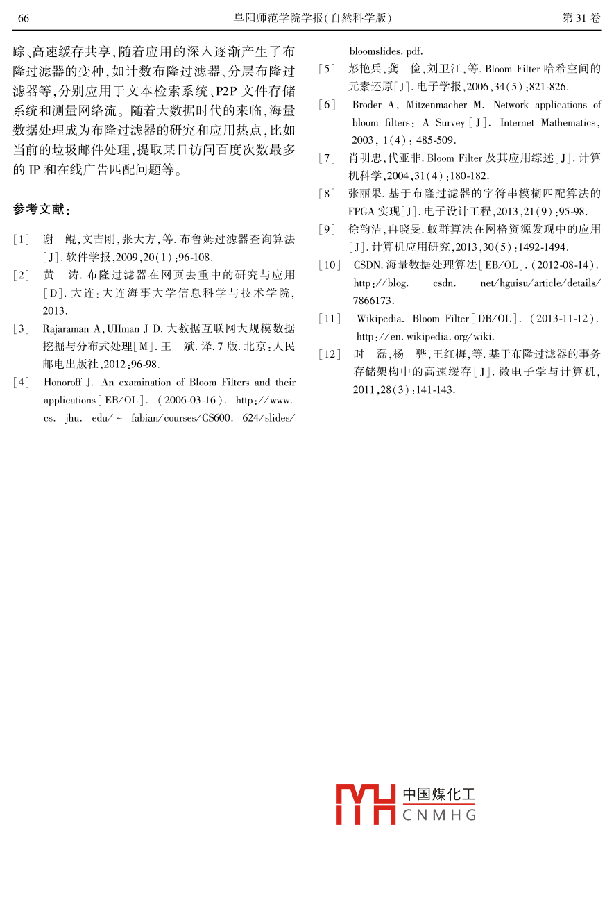 第31卷第3期阜陽師范學(xué)院學(xué)報(自然科學(xué)版)Vol. 31. No. 32014年9月Journal of Fuyang Teachers College( Natural ScienceSep.2014Bloom filter技術(shù)及應(yīng)用張華,鄭世玨2,童德茂(1.阜陽職業(yè)技術(shù)學(xué)院工程科技學(xué)院,安徽阜陽236031;2.華中師范大學(xué)計算機(jī)科學(xué)系,湖北武漢430079摘要; Bloom filter采用位串向量表示數(shù)據(jù)集合,能夠?qū)崿F(xiàn)高效集合查詢的數(shù)據(jù)結(jié)構(gòu)。首先介紹了標(biāo)準(zhǔn)布隆過濾器的概念和工作原理,然后通過實(shí)驗分析布隆過濾器的錯誤率、空間向量和哈希函數(shù)數(shù)量三者之間的動態(tài)相關(guān)關(guān)系,并對獨(dú)立空間布隆過濾器和標(biāo)準(zhǔn)布隆過濾器性能進(jìn)行對比,最后討論了 Bloom filter的變種及應(yīng)用關(guān)鍵詞: Bloom filter;錯誤率;標(biāo)準(zhǔn)布隆過濾器;獨(dú)立空間布隆過濾器中圖分類號:TP301文獻(xiàn)標(biāo)識碼:A文章編號:1004-4329(2014)03-06205Bloom Filter technology and its applicationsZHANG Hua, ZHENG Shi-jue, TONG De-mao(1. Institute of Engineering and Technology, Fuyang Vocational and Technical College, Fuyang Anhui 236031, China;2 Department of Computer Science, Huazhong Normal University, Wuhan Hubei 430079, China)Abstract: Bloom Filter is a data structure that uses bit string vector to represent data set so as to meet efficient membershipqueries. First, the concept and the operating principle of standard Bloom Filter were given. Second, based on experiments, the dynamic relationships among the false positive, the vector space and the numbers of hash function of Bloom Filter were analyzed. Fur-thermore, the performance of independence space Bloom Filter and that of standard Bloom Filter were compared. Finally, applications and development of bloom Filter were discussedKey words: Bloom Filter; false positive; standard Bloom Filter; independence space Bloom Filterloom filter是由 Burton bloom提出的采用位編碼后的位數(shù)比集合元素位數(shù)少,因此節(jié)省了存儲串向量表示數(shù)據(jù)集合,能夠?qū)崿F(xiàn)高效集合査詢的數(shù)空間。編碼位數(shù)取決于你所期望的錯誤率,編碼位據(jù)結(jié)構(gòu)。它是以哈希表為基礎(chǔ)的算法。哈希表數(shù)越多,錯誤就越少,反之則越大,即“正確率換取的基本原理是使用一個容量相對合適的數(shù)組來??臻g”的思想。布隆過濾器就在這一思想下產(chǎn)生。存數(shù)據(jù),在記錄的存儲位置和關(guān)鍵字之間建立一個布隆過濾器算法由于高效的查找速度被廣泛運(yùn)用。確定的對應(yīng)關(guān)系函數(shù)h(即哈希函數(shù)),然后,使每例如 Web cache共享、文本文件檢索系統(tǒng)、P2P網(wǎng)個關(guān)鍵字的內(nèi)容,通過這個哈希函數(shù)計算h(x)來絡(luò)文件存儲系統(tǒng)等網(wǎng)絡(luò)應(yīng)用領(lǐng)域。目前國內(nèi)外的得到該關(guān)鍵字對應(yīng)的存儲位置,之后將該關(guān)鍵字存研究主要有標(biāo)準(zhǔn)布隆過濾器和多種變種,例如壓縮在數(shù)組的相應(yīng)位置中2。人們發(fā)現(xiàn)為了查找而將布隆過濾器、計數(shù)布隆過濾器、分層布隆過濾器、動整個元素都存儲在數(shù)組中,空間需求很大,因此對態(tài)布隆過濾器等。文章重點(diǎn)分析了標(biāo)準(zhǔn)布隆過濾哈希表進(jìn)行改進(jìn),并不直接將集合元素存在數(shù)組器里,而是將每個元素編碼然后將編碼存在數(shù)組里。標(biāo)TH中國煤化衛(wèi)立空間布隆過濾器和CNMHG比較,最后對布隆過濾收稿日期:201402-27基金項目:中央高?;究蒲袠I(yè)務(wù)費(fèi)項目(CCNU11C01003)資助。作者簡介:張華(1975-),女,碩士,副教授。研究方向:數(shù)據(jù)挖掘。第3期張華,鄭世玨,童德茂: Bloom filter技術(shù)及應(yīng)用器的相關(guān)變種及應(yīng)用做了簡單綜述。的結(jié)果是 false,說明該元素肯定不在集合內(nèi);如果1標(biāo)準(zhǔn)布隆過濾器返還的是true,說明元素可能存在于集合中。由前面分析知道,使用 Bloom filter判斷一個一個布隆過濾器由以下幾部分組成(3。元素是否屬于集合時,可能岀現(xiàn)錯判,可能把不屬(i) Bloom filter用一個長度為m的位向量V于這個集合的元素誤判為屬于這個集合( False表示集合中的元素,每個位的初始值都設(shè)為0。Positive)4,但是,不會把屬于這個集合的元素誤(i)k個相互獨(dú)立均勻分布的哈希函數(shù)組成的判為不屬于這個集合。下面通過計算來估計發(fā)生集合H。“假陽性”錯誤率P的大小。(i)n個元素組成的集合S。當(dāng)集合S={x1,x2,…,xn}的所有元素都被k布隆過濾器的工作原理分為兩步:個哈希函數(shù)映射到長為m的向量V中時,對于一個第一步,數(shù)據(jù)裝入。k個相互獨(dú)立的哈希函數(shù)鍵值在m個空間的向量中,被映射為1的概率是分別將集合S中的n個元素映射到向量V中的相應(yīng)1/m,則對立事件,被映射為0的概率是1-1/m位置,將V中相應(yīng)位置為1,如圖1所示。k*n個鍵值都被映射為0的概率為(1-1/m)。第二步,數(shù)據(jù)判斷。當(dāng)新元素y到來時,對y進(jìn)也就是,當(dāng)集合中所有元素都映射完畢后,V向量行k次哈希運(yùn)算,檢查所有的h1(y),h2(y),任一位為0的概率為(1-1/m),它的對立事件h2(y)對應(yīng)向量V中的位是否全部為1,如果是,則當(dāng)集合中所有元素都映射完畢后,V向量任一位為元素y屬于集合S,否則,認(rèn)為y不屬于集合S1的概率L為1-(1-1/m)。即L=1又當(dāng)m趨向無窮