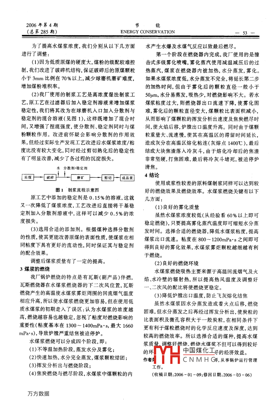2006年第4期ENERGY CONSERVATION(總第285期)低質(zhì)原料煤制備水煤漿及其燃燒趙立鴻,姜成(沈陽石蠟化工有公司,遼寧沈陽110141)摘要:介紹了使用低質(zhì)原料煤制漿的方法及燃燒情況,說明燃用低濃度水煤漿悶樣可以得到較好的效關(guān)鍵詞:水煤漿;燃燒;霧化;潔凈中圖分類號:TQ5344文獻標識碼:B文章編號:1004-7948(2006)04-0052-021前言水煤漿控制指標中的濃度與粘度這兩個參數(shù)是水煤漿是一種以煤代油的潔凈燃料,即將煤研互相制約的,分散劑使煤粉顆粒親水性增強,減小煤磨成一定粒度(平均粒徑30μm左右),與水、添加劑顆粒間的相互引力,從而使煤漿流動性增強。穩(wěn)定混合熟化后制成的一種煤基漿體。水煤漿濃度一般劑則是使煤粉顆粒間形成具有一定強度的骨架結(jié)構(gòu)控制在66%以上,表觀粘度1000mPas左右,可以來防止其沉淀。濃度增加則煤漿著火所需熱量降泵迭、霧化、貯存與穩(wěn)定著火燃燒。由于水煤漿與燃低,同時粘度也必然增加,給煤漿霧化造成困難。所料重油在相同熱值下相比,其價格僅為重油的1/2以制漿過程既要提高煤漿濃度還要盡量降低煤漿粘左右,以水煤漿代油具有顯著的經(jīng)濟效益同時也是度,這樣才能提供較好的燃燒條件。從表1可以看節(jié)約原油的重要措施。出某種成漿性較差的原料煤的粘度隨著濃度的變化燃用水煤漿與直接燒煤粉相比,具有燃燒效率而發(fā)生變化。高、負荷易調(diào)控、節(jié)能和環(huán)境效益好等優(yōu)點,但制漿表1我廠某原料煤制漿數(shù)據(jù)的成本卻高于制粉的成本,所以在能夠保證鍋爐穩(wěn)粘度(25℃)穩(wěn)定劑添加率分散劑添加率定燃燒的前提下為了降低蒸汽成本,不得不選擇價濃度/%穩(wěn)定性/mPa's格較低、成漿性較差的原料煤來制漿。如果每噸煤節(jié)省100元,每噸漿節(jié)省70元,燃燒劣質(zhì)煤的蒸發(fā)63.3熱損失及燃料不完全燃燒損失按水煤漿熱值的15%計算,每噸蒸汽耗漿按01t計算,則全年可節(jié)約50萬元左右。0.15我廠自備電廠的一臺75u/h燃油鍋爐2003年11380.105(36%)造成水煤漿鍋爐,使用低質(zhì)原料煤制漿,取得了較6110460.10好的經(jīng)濟效益。61,66.02提高水煤漿質(zhì)量表2邢臺東龐煤礦制漿廠制漿數(shù)據(jù)低質(zhì)原料煤本身理化性能直接影響煤的成漿性,特點是哈氏可磨指數(shù)低(一般小于50)、揮發(fā)分濃度/%粘度(25℃)分散劑添加率穩(wěn)定性低、灰含量大(大于10%)內(nèi)水較高、表面活性差等,這些因素直接影響其制漿質(zhì)量,使煤漿濃度低、" TYH中國煤化工CNMHG5(7%)粘度大、穩(wěn)定性較差,使燃燒更加困難。從表1及表3.02對比可以看出不同煤種制漿的差異。8203.02006年第4期節(jié)能(總第285期)ENERGY CONSERVATION53為了提高水煤漿濃度,我們分別從以下幾方面水產(chǎn)生水爆及水煤氣反應(yīng)以致最后燃盡。進行了調(diào)整:第一個階段在燃燒器內(nèi)完成,我廠使用的是撞(1)因為低質(zhì)原煤的硬度大,煤粉的級配較難控擊式多級霧化噴嘴,霧化蒸汽使用減溫減壓后的過制,我們改進了破碎機結(jié)構(gòu)保證破碎后的原煤顆粒熱蒸汽,煤漿在燃燒器內(nèi)被加熱,水分蒸發(fā),霧化。小于3mm比例在70%以上,減少球磨機磨礦難度,如果水煤漿濃度低,水分蒸發(fā)不完全,將延長第二步增加煤粉堆積率。的加熱時間,但由于霧化后的顆粒直徑一般小于(2)我廠使用的制漿工藝是高濃度濕法制漿工50m,水分易蒸發(fā)吸熱少,對燃燒影響不大。若水藝,原工藝在過濾器后加入穩(wěn)定劑溶液來增加煤漿煤漿粘度過大,則燃燒器出口流速下降,使霧化困穩(wěn)定性,我們將其改為在球磨機入口加入分散劑與難霧化后的顆粒直徑變大煤顆粒比表面積減小穩(wěn)定劑的混合溶液(見圖1),這樣既增加了混合時從而影響了煤顆粒的揮發(fā)分析出速度及焦炭燃盡時間,又增強了捏混強度,使分散劑、穩(wěn)定劑同時與煤間,使火焰后移,爐膛岀口溫度升高。同時由于煤顆粉顆粒作用。改進前懷疑會影響分散劑的作用效粒重量大、流速慢,使其在高溫區(qū)的滯留時間延長果,但經(jīng)過實際生產(chǎn)發(fā)現(xiàn)工藝改進后水煤漿濃度/粘造成灰分在高溫區(qū)熔化粘連(灰熔點1400℃),最后度比沒有較大變化,同時經(jīng)過剪切熟化后的穩(wěn)定性結(jié)成大塊焦渣落入冷灰斗,由于熔化冷卻后的焦渣有了明顯改善,減少了各過程的沉淀損失。非常堅硬,打焦困難,最后將冷灰斗堵死,被迫停爐水分散劑+穩(wěn)定劑清焦}[1口m了一[-區(qū)4結(jié)論使用成漿性較差的原料煤制漿同樣可以達到較圖1制漿流程示意圖好的燃燒效果及燃燒效率。水煤漿燃燒關(guān)鍵有以下原工藝中添加的穩(wěn)定劑是015%的溶液,這就幾方面:又一次降低了煤漿濃度,工藝改進后直接將干基穩(wěn)(1)良好的霧化質(zhì)量定劑加入分散劑溶液中,這樣可以減少0.5%的濃雖然水煤漿濃度較低(從經(jīng)驗看60%以上即可度損失。穩(wěn)定燃燒),只要提高霧化蒸汽溫度即可縮短水分蒸(3)選用合適的添加劑。根據(jù)煤種選擇分散劑發(fā)時間。選擇合適的燃燒器降低水煤漿粘度提高的性質(zhì),使其更能改善原煤的表面性質(zhì),使煤漿在相煤漿出口流速。粘度在800~1200mPa·s之間即可同粘度下具有更好的流動性,同時保證其與穩(wěn)定劑得到良好的霧化效果,水煤漿霧炬顆粒越細越有利的配合效果。于燃燒。調(diào)整