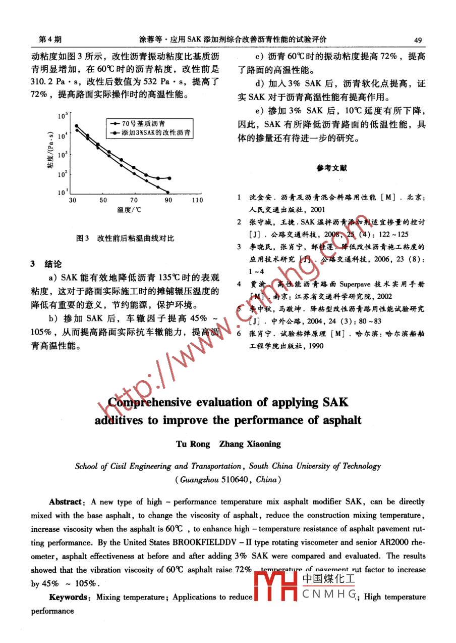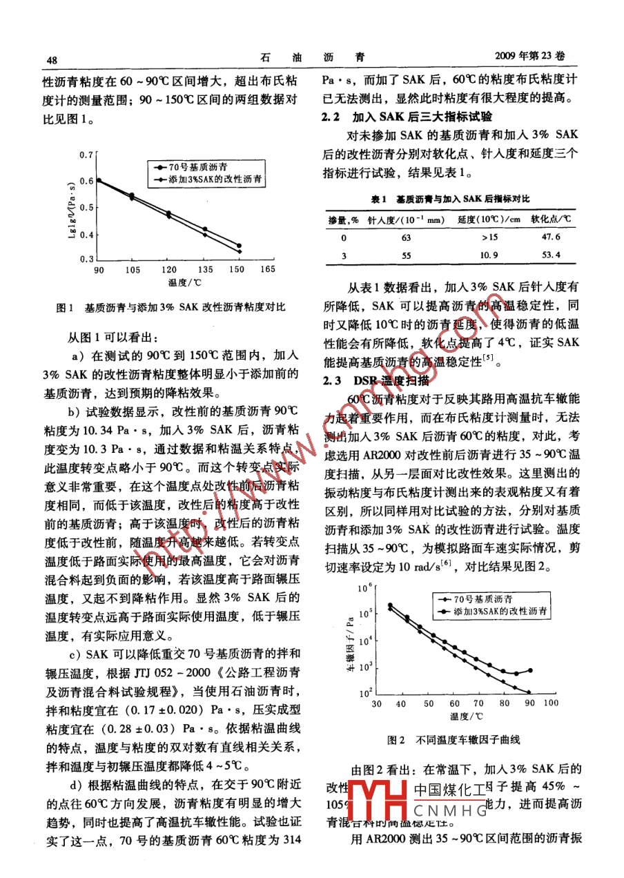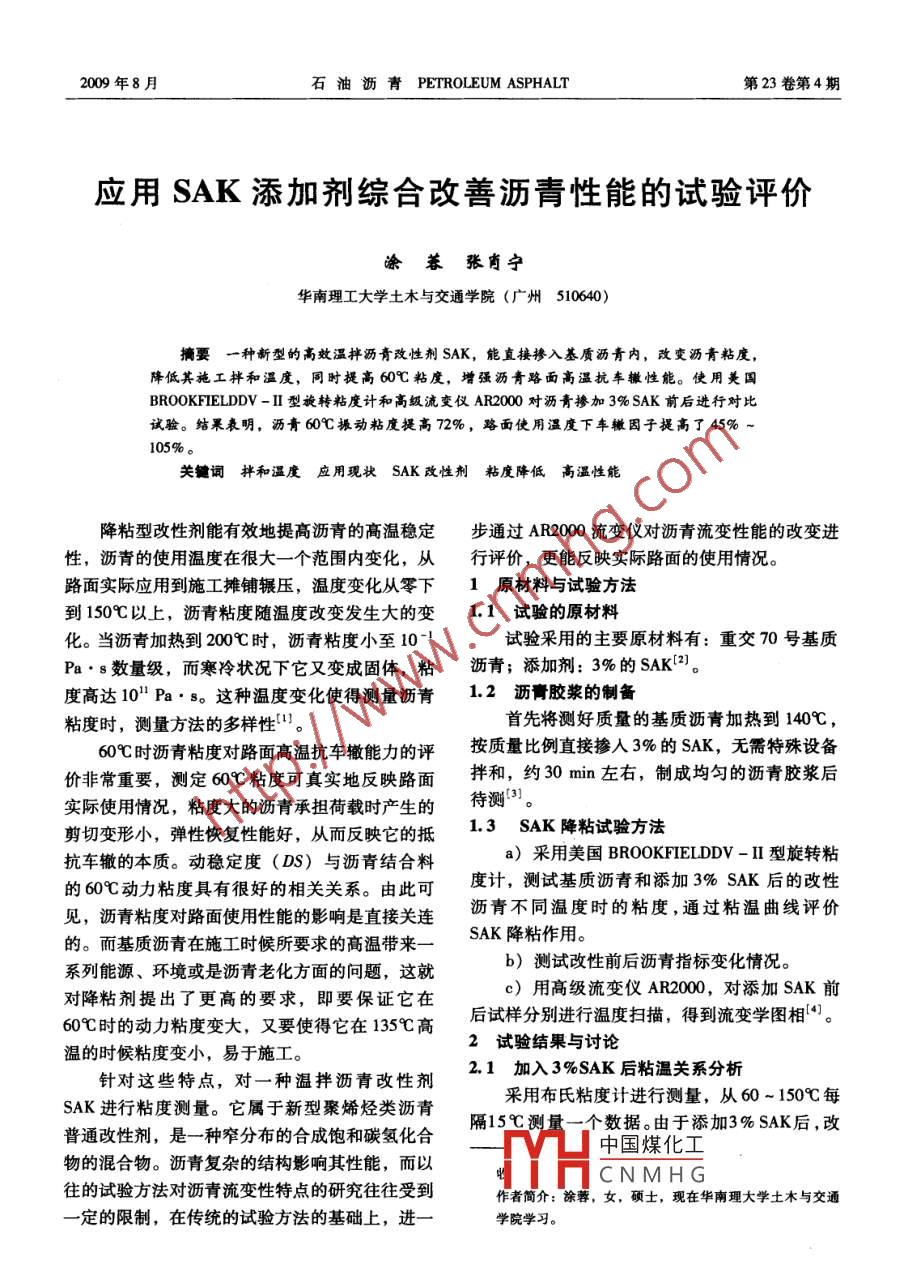 2009年8月石油瀝青PETROLEUM ASPHALT第23卷第4期應(yīng)用SAK添加劑綜合改善瀝青性能的試驗(yàn)評價(jià)涂蓉張肖寧華南理工大學(xué)土木與交通學(xué)院(廣州510640)摘要一種新型 的高效溫拌瀝青改性劑SAK,能直接摻入基質(zhì)瀝青內(nèi),改變?yōu)r青粘度,降低其施工拌和溫度,同時(shí)提高60C粘度,增強(qiáng)瀝青路面高溫抗車轍性能。使用美國BROOKFIELDDV- II型旋轉(zhuǎn)粘度計(jì)和高級流變儀AR2000對瀝青摻加3% SAK前后進(jìn)行對比試驗(yàn)。結(jié)果表明,瀝青60C振動(dòng)粘度提高72%,路面使用溫度下車轍因子提高了45% ~105%。關(guān)鍵詞拌和溫度應(yīng)用現(xiàn)狀SAK 改性劑粘度降低 高溫性能降粘型改性劑能有效地提高瀝青的高溫穩(wěn)定步通過AR2000流變儀對瀝青流變性能的改變進(jìn)性,瀝青的使用溫度在很大-一個(gè)范圍內(nèi)變化,從行評價(jià),更能反映實(shí)際路面的使用情況。路面實(shí)際應(yīng)用到施工攤鋪輾壓,溫度變化從零下1原材料與試驗(yàn)方法到150以上,瀝青粘度隨溫度改變發(fā)生大的變1.1試驗(yàn)的原材料化。當(dāng)瀝青加熱到200C時(shí),瀝青粘度小至10-1試驗(yàn)采用的主要原材料有:重交70號基質(zhì)Pa. s數(shù)量級,而寒冷狀況下它又變成固體,粘瀝青;添加劑: 3%的SAK{2)。度高達(dá)10" Pa. s。這種溫度變化使得測量瀝青1.2瀝青膠漿的制備粘度時(shí),測量方法的多樣性"。首先將測好質(zhì)量的基質(zhì)瀝青加熱到140C,60C時(shí)瀝青粘度對路面高溫抗車轍能力的評按質(zhì)量比例直接摻人3%的SAK,無需特殊設(shè)備價(jià)非常重要,測定60C粘度可真實(shí)地反映路面拌和,約30min左右,制成均勻的瀝青膠漿后實(shí)際使用情況,粘度大的瀝青承擔(dān)荷載時(shí)產(chǎn)生的待測)。剪切變形小,彈性恢復(fù)性能好,從而反映它的抵1.3 SAK 降粘試驗(yàn)方法抗車轍的本質(zhì)。動(dòng)穩(wěn)定度(DS)與瀝青結(jié)合料a)采用美國BROOKFIELDDV - II型旋轉(zhuǎn)粘的60C動(dòng)力粘度具有很好的相關(guān)關(guān)系。由此可度計(jì),測試基質(zhì)瀝青和添加3% SAK后的改性見,瀝青粘度對路面使用性能的影響是直接關(guān)連瀝青不同溫度時(shí)的粘度,通過粘溫曲線評價(jià)的。而基質(zhì)瀝青在施工時(shí)候所要求的高溫帶來一SAK降粘作用。系列能源、環(huán)境或是瀝青老化方面的問題,這就b)測試改性前后瀝青指標(biāo)變化情況。對降粘劑提出了更高的要求,即要保證它在c)用高級流變儀AR2000,對添加SAK前60時(shí)的動(dòng)力粘度變大,又要使得它在135C高后試樣:分別進(jìn)行溫度掃描,得到流變學(xué)圖相(4]。2試驗(yàn)結(jié)果 與討論溫的時(shí)候粘度變小,易于施工。針對這些特點(diǎn),對一種溫拌瀝青改性劑2.1加入3%SAK后粘溫關(guān)系分析SAK進(jìn)行粘度測量。它屬于新型聚烯烴類瀝青采用布氏粘度計(jì)進(jìn)行測量,從60 ~ 150C每普通改性劑,是一種窄分布的合成飽和碳?xì)浠细?5C測量一個(gè)數(shù)據(jù)。由于添加3% SAK后,改中國煤化工物的混合物。瀝青復(fù)雜的結(jié)構(gòu)影響其性能,而以CNMHG往的試驗(yàn)方法對瀝青流變性特點(diǎn)的研究往往受到作者簡介:涂蓉,女,碩士,現(xiàn)在華南理大學(xué)土木與交通- -定的限制,在傳統(tǒng)的試驗(yàn)方法的基礎(chǔ)上,進(jìn)一學(xué)院學(xué)習(xí)。48石油歷青2009年第23卷性瀝青粘度在60~90C區(qū)間增大,超出布氏粘Pa.s,而加了SAK后,60C的粘度布氏粘度計(jì)度計(jì)的測量范圍;90~1509區(qū)間的兩組數(shù)據(jù)對已無法測出,顯然此時(shí)粘度有很大程度的提高。比見圖1。2.2加入 SAK后三大指標(biāo)試驗(yàn)對未摻加SAK的基質(zhì)瀝青和加入3% SAK0.7[后的改性瀝青分別對軟化點(diǎn)、針入度和延度三個(gè)+70號基質(zhì)瀝青指標(biāo)進(jìn)行試驗(yàn),結(jié)果見表1。.0.6+添加3%SAK的改性瀝青I表1基質(zhì)瀝青與加入 SAK后指標(biāo)對比S 0.5|摻量,%針人度/(10-1 mm)_延度(10C)/cm 軟化點(diǎn)/心凹0.406>1547.6R0.3L35:10.953.4301012035 150 165溫度/C從表1數(shù)據(jù)看出,加入3% SAK后針人度有1基質(zhì)瀝青與添加3% SAK改性瀝青粘度對比所降低,SAK可以提高瀝青的高溫穩(wěn)定性,同時(shí)又降低10C時(shí)的瀝青延度,使得瀝青的低溫從圖1可以看出:a)在測試的90C到150C范圍內(nèi),加入.性能會(huì)有所降低,軟化點(diǎn)提高了4C,證實(shí)SAK能提高基質(zhì)瀝青的高溫穩(wěn)定性[5]。3% SAK的改性瀝青粘度整體明顯小于添加前的2.3 DSR溫度掃描基質(zhì)瀝青,達(dá)到預(yù)期的降粘效果。609瀝青粘度對于反映其路用高溫抗車轍能b)試驗(yàn)數(shù)據(jù)顯示,改性前的基質(zhì)瀝青90C力起著重要作用,而在布氏粘度計(jì)測量時(shí),無法粘度為10.34 Pa.s,加入3% SAK后,瀝青粘測出加入3% SAK 后瀝青60C的粘度,對此,考度變?yōu)?0.3 Pa.8,通過數(shù)據(jù)和粘溫關(guān)系特點(diǎn),慮選用AR2000對改性前后瀝青進(jìn)行35 ~90C溫此溫度轉(zhuǎn)變點(diǎn)略小于90C。而這個(gè)轉(zhuǎn)變點(diǎn)實(shí)際度掃描。從另一層面對比改性效果。這里測出的意義非常重要,在這個(gè)溫度點(diǎn)處改性前后瀝青粘振動(dòng)粘度與布氏粘度計(jì)測出來的表觀粘度又有著度相同,而低于該溫度,改性后的粘度高于改性區(qū)別,所以同樣用對比試驗(yàn)的方法,分別對基質(zhì)前的基質(zhì)瀝青;高于該溫度