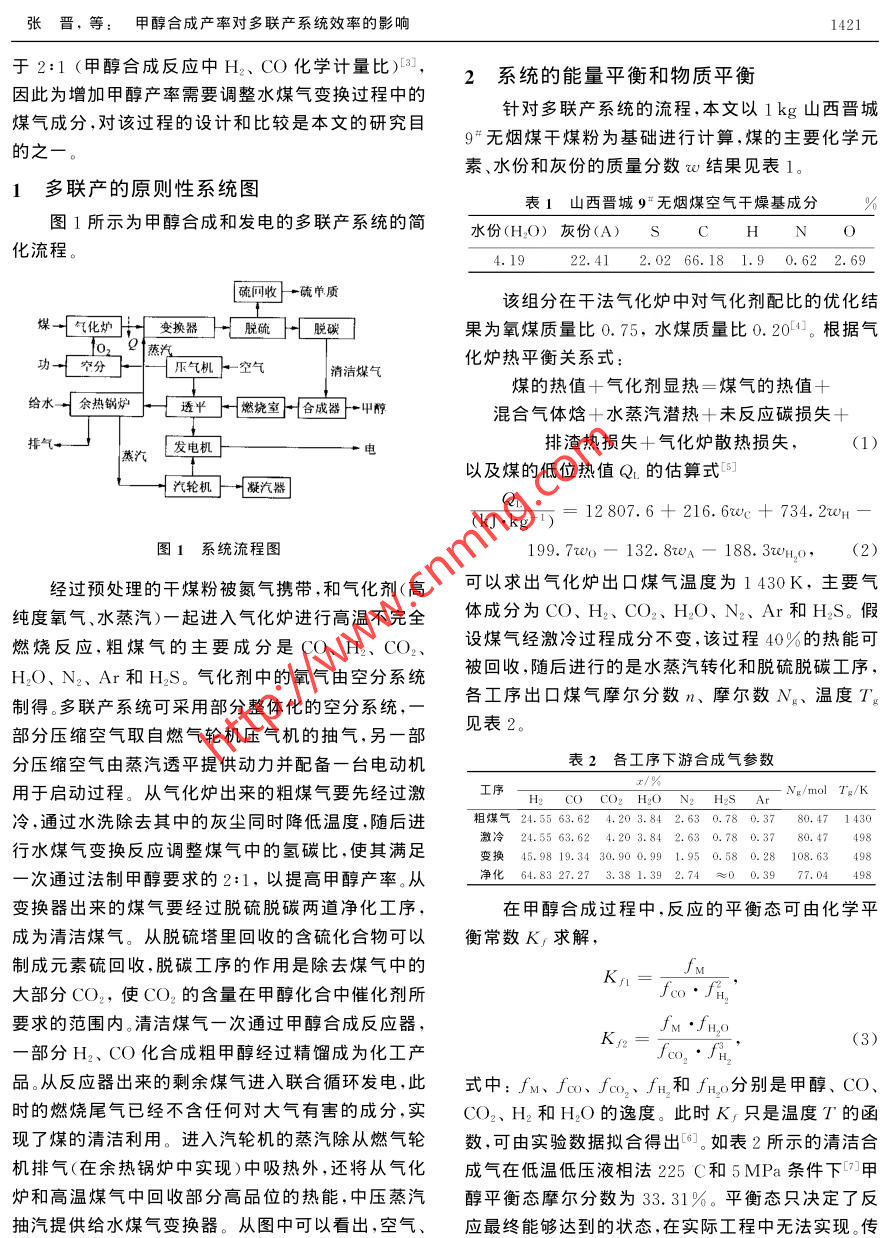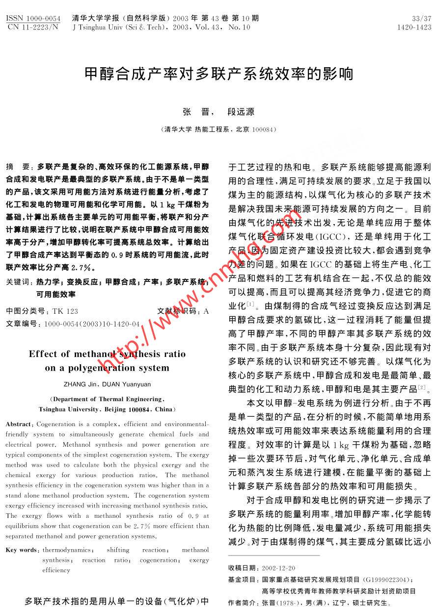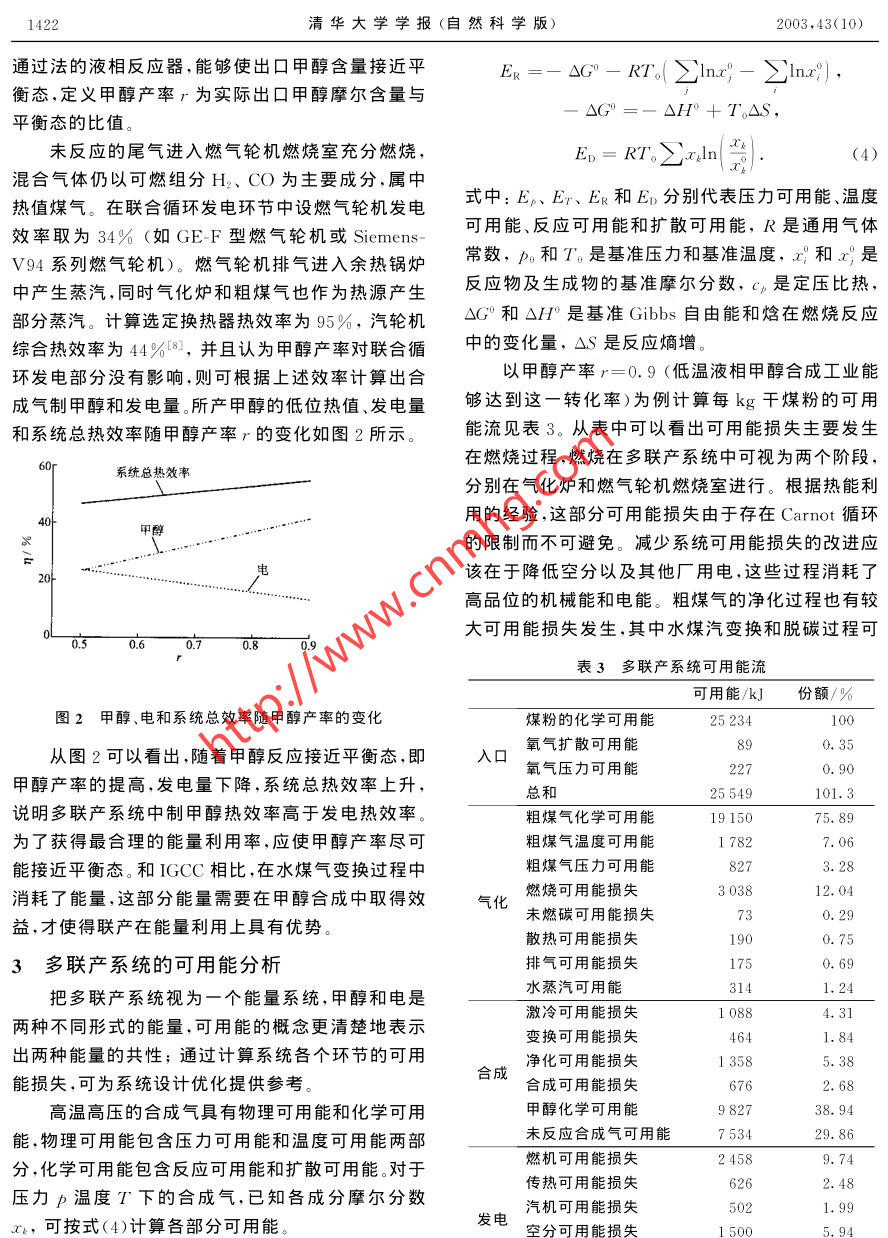 ISSN 1000-0054清華大學(xué)學(xué)報(bào) (自然科學(xué)版)2003年第43卷第10期33/37CN 11-2223/N J Tsinghua Univ (Sci &. Tech),2003, Vol. 43,No. 101420- 1423甲醇合成產(chǎn)率對(duì)多聯(lián)產(chǎn)系統(tǒng)效率的影響張晉,段遠(yuǎn)源(清華大學(xué)熱能工程系,北京100084)摘要:多聯(lián)產(chǎn)是復(fù)雜的、高效環(huán)保的化工能源系統(tǒng),甲醇于工藝過程的熱和電。多聯(lián)產(chǎn)系統(tǒng)能夠提高能源利合成和發(fā)電聯(lián)產(chǎn)是最典型的多聯(lián)產(chǎn)系統(tǒng)。由于不是單一類型用的合理性,滿足可持續(xù)發(fā)展的要求。立足于我國(guó)以的產(chǎn)品,該文采用可用能方法對(duì)系統(tǒng)進(jìn)行能分析,考慮了煤為主的能源結(jié)構(gòu),以煤氣化為核心的多聯(lián)產(chǎn)技術(shù)化工和發(fā)電的物理可用能和化學(xué)可用能。以1 kg干煤粉為是解決我國(guó)未來能源可持續(xù)發(fā)展的方向之一。目前基礎(chǔ),計(jì)算出系統(tǒng)各主要單元的可用能平衡,將聯(lián)產(chǎn)和分產(chǎn)由煤氣化的先進(jìn)技術(shù)出發(fā),無論是單純應(yīng)用于整體.計(jì)算結(jié)果進(jìn)行了比較,說明在聯(lián)產(chǎn)系統(tǒng)中甲醇合成可用能效煤氣化聯(lián)合循環(huán)發(fā)電(IGCC),還是單純用于化工率高于分產(chǎn),增加甲醇轉(zhuǎn)化率可提高系統(tǒng)總效率。計(jì)算給出了甲醇合成產(chǎn)率達(dá)到平衡態(tài)的0.9時(shí)系統(tǒng)的可用能流,此時(shí)產(chǎn)品,因?yàn)楣潭ㄙY產(chǎn)建設(shè)投資比較大,都會(huì)遇到競(jìng)爭(zhēng)聯(lián)產(chǎn)效率比分產(chǎn)高2. 7%。力差的問題。如果在IGCC的基礎(chǔ)上將生產(chǎn)電、化工關(guān)鍵詞:熱力學(xué);變換反應(yīng);甲醇合成;產(chǎn)率;多聯(lián)產(chǎn)系統(tǒng);產(chǎn)品和燃料的工藝有機(jī)結(jié)合在-起,不僅總的能效可用能效率可以提高,而且可以提高其經(jīng)濟(jì)競(jìng)爭(zhēng)力,促進(jìn)它的商中圖分類號(hào): TK 123文獻(xiàn)標(biāo)識(shí)碼: A業(yè)化中。由煤制得的合成氣經(jīng)過變換反應(yīng)達(dá)到滿足甲醇合成要求的氫碳比,這一過程消耗了能量但提文章編號(hào): 1000-0054(2003)10-1420-04 .高了甲醇產(chǎn)率,不同的甲醇產(chǎn)率其多聯(lián)產(chǎn)系統(tǒng)的效率不同。由于多聯(lián)產(chǎn)系統(tǒng)本身十分復(fù)雜,因此現(xiàn)有對(duì)Effect of methanol synthesis ratio多聯(lián)產(chǎn)系統(tǒng)的認(rèn)識(shí)和研究還不夠完善。以煤氣化為on a polygeneration system核心的多聯(lián)產(chǎn)系統(tǒng)中,甲醇合成和發(fā)電是最簡(jiǎn)單、最ZHANG Jin, DUAN Yuanyuan典型的化工和動(dòng)力系統(tǒng),甲醇和電是其主要產(chǎn)品[2]。(Department of Thermal Engineering ,本文以甲醇-發(fā)電系統(tǒng)為例進(jìn)行分析。由于不再Tsinghua University, Beijing 100084, China)是單一類型的產(chǎn)品,在分析的時(shí)候,不能簡(jiǎn)單地用系A(chǔ)bstract: Cogeneration is a complex. efficient and environmental-friendly system to simultaneously generate chemical fuels and統(tǒng)熱效率或可用能效率來表達(dá)系統(tǒng)能量利用的合理程度。對(duì)效率的計(jì)算是以1kg干煤粉為基礎(chǔ),忽略typical components of the simplest cogeneration system. The exergy掉一些次要環(huán)節(jié)后,對(duì)氣化單元、凈化單元、合成單method was used to calculate both the physical exergy and thechemical exergy for various production ratios. The methanol元和蒸汽發(fā)生系統(tǒng)進(jìn)行建模,在能量平衡的基礎(chǔ)上synthesis efficiency in the cogeneration system was higher than in a計(jì)算多聯(lián)產(chǎn)系統(tǒng)各部分的熱效率和可用能損失。stand alone methanol production system. The cogeneration system對(duì)于合成甲醇和發(fā)電比例的研究進(jìn)一步揭示了exergy efficiency increased with increasing methanol synthesis ratio.The exergy flows with a methanol synthesis ratio of 0.9 at多聯(lián)產(chǎn)系統(tǒng)的能量利用率。增加甲醇產(chǎn)率,化學(xué)能轉(zhuǎn)equilibrium show that cogeneration can be 2. 7% more efcient than化為熱能的比例降低,發(fā)電量減少,系統(tǒng)可用能損失separated methanol and power generation systems.減少。對(duì)于由煤制得的煤氣,其主要成分氫碳比遠(yuǎn)小Key words : thermodynamics;shiftingreaction;synthesis; reaction ratio; cogeneration; exergyefficiency收稿日期: 2002-12-20基金項(xiàng)目:國(guó)家重點(diǎn)基礎(chǔ)研究發(fā)展規(guī)劃項(xiàng)目(G1999022304);高等學(xué)校優(yōu)秀青年教師教學(xué)科研獎(jiǎng)勵(lì)計(jì)劃資助項(xiàng)目多聯(lián)產(chǎn)技術(shù)指的是用從單一的設(shè)備(氣化爐)中作者簡(jiǎn)介:張晉(1978-),男(滿),遼寧,碩士研究生。產(chǎn)生的合盛氖來聯(lián)產(chǎn)多種化工產(chǎn)品、液體燃料(甲通訊聯(lián)系人:段遠(yuǎn)源,副教授,醇、FT合成燃料、二甲醚、城市煤氣)、氫氣以及用E- mail: yyduan@ te. tsinghua. edu. cn張晉,等:甲醇合成產(chǎn)率對(duì)多聯(lián)產(chǎn)系統(tǒng)效率的影響1421于2:1 (甲醇合成反應(yīng)中H2、CO化學(xué)計(jì)量比)[3],2系統(tǒng)的能量平衡和物質(zhì)平衡因此為增加甲醇產(chǎn)率需要調(diào)整水煤氣變換過程中的針對(duì)多聯(lián)產(chǎn)系統(tǒng)的流程,本文以1kg山西晉城煤氣成分,對(duì)該過程的設(shè)計(jì)和比較是本文的研究目9