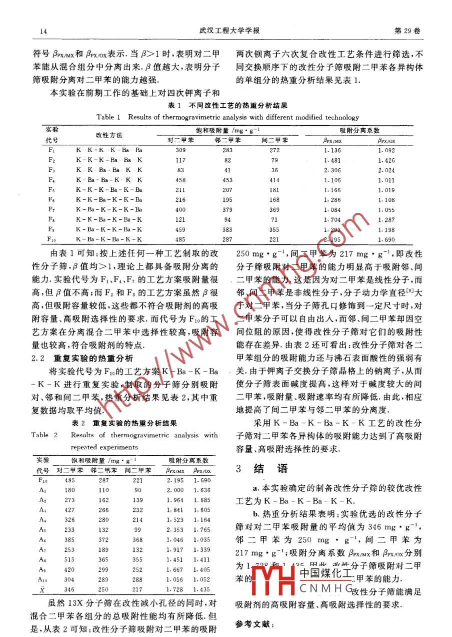 第29卷第2期武漢·工程大學(xué)學(xué)報(bào)Vol 29 No. 22007年03月J. Wuhan Inst. TechMar.2007文章編號(hào):1004-4736(2007)02-0013-03熱重分析改性分子篩吸附分離二甲苯的研究王春蓉(遼寧石油化工大學(xué)職業(yè)技術(shù)學(xué)院化工系,遼寧撫順113001)摘要:用鉀、鋇離子交替交換13X分子篩,經(jīng)六次復(fù)合改性制備了改性分子篩,分別用于吸附二甲苯各異構(gòu)體的實(shí)驗(yàn),并用熱重分析法對(duì)分子篩的改性能力進(jìn)行了研究.實(shí)驗(yàn)結(jié)果表明:制備改性分子篩較優(yōu)改性工藝為K-Ba-K-Ba-K-K;采用該工藝制備的改性分子篩對(duì)鄰、間、對(duì)二甲苯的平均吸附量分別為250mg:g217mg·g-和346mg·g-1;該改性分子篩基本滿(mǎn)足吸附劑應(yīng)具有的高吸附量、高選擇性的要求關(guān)鍵詞:13X分子篩;吸附分離;熱重分析中圖分類(lèi)號(hào):TQ424.25文獻(xiàn)標(biāo)識(shí)碼:A0引言子篩.離子交換方法:用KCl、BaCl2溶液與13X分子篩在75℃下交替交換6次,均交換2h.高溫水在我國(guó),每年都有大量的C芳烴副產(chǎn)品產(chǎn)蒸汽處理方法:將已交換干燥后的分子篩置于管生,其主要組成為鄰、間、對(duì)二甲苯混合二甲苯中式爐的恒溫段,再以一定的速率進(jìn)行升溫焙燒,溫的各同分異構(gòu)體都是重要的化工原料2:間二甲.度升至設(shè)定值后,再通水蒸汽進(jìn)行水熱處理并開(kāi)苯可作為聚脂和苯酐的原料);對(duì)二甲苯主要用始計(jì)時(shí)0.3h.水熱處理溫度即為焙燒最高溫度,于合成對(duì)苯二甲酸或?qū)Ρ蕉姿岫柞スI(yè)活化后即得成品分子篩分離以提高產(chǎn)品附加值和資源利用率凄1.3吸附劑的評(píng)價(jià)方法廉價(jià)出售,資源浪費(fèi)十分嚴(yán)重,有必要將其逐評(píng)選吸附劑的的兩個(gè)指標(biāo)是吸附容量和吸附選擇性采用吸附分離的模擬移動(dòng)床工藝來(lái)分離和提熱重分析方法簡(jiǎn)單程序如下:取0.25~0.42純混合二甲苯的單組分異構(gòu)體口,是一種有效的.mm粒度活化改性分子篩,分別用鄰、間、對(duì)二甲方法.吸附分離工藝關(guān)鍵技術(shù)之一是固體吸附劑苯溶劑密封浸漬,浸漬時(shí)間為12h.用TG/DTA的制備.本研究采用13X沸石分子篩作為改性對(duì)熱分析儀測(cè)量,樣品的失重量為改性分子篩的吸象在徐桂英(等人前期工作的基礎(chǔ)上,對(duì)鉀離子附量.典型TG曲線(xiàn)圖見(jiàn)圖1.和鋇離子交替交換復(fù)合改性的工藝條件進(jìn)行了研究,并采用熱重分析法評(píng)價(jià)改性分子篩對(duì)二甲苯各單組分的吸附性能,同時(shí)還考察了改性工藝的重復(fù)性對(duì)改性效果的影響02.01實(shí)驗(yàn)部分TG 9DTG1.1儀器與試劑13X沸石分子篩,沈陽(yáng)同澤干燥劑廠(chǎng);KCl、Cl2,AR,沈陽(yáng)試劑一廠(chǎng);鄰、間、對(duì)二甲苯,AR,圖1對(duì)二甲苯熱重分析曲線(xiàn)北京金龍化學(xué)試劑公司; Diamond TG/DTA,Fig.1 Thermogravimetric analysis curve for p- xyleneTG/DTA6300,上海珀金埃爾默儀器有限公司吸附劑的制備2結(jié)果與討論選用國(guó)產(chǎn)13X分子篩球狀,經(jīng)粉碎、篩分,取2.1M凵中國(guó)煤化工0.25~0.42mm粒度,細(xì)粒狀分子篩分別與鉀、鋇CNMHG上甲苯(MX)、鄰二離子交替交換,經(jīng)濕焙處理和活化后,制成改性分甲苯(OX)飽和吸附量的比值為吸附分離系數(shù),用收稿日期:2006-10-08費(fèi)猞王春蓉(1974-),女,滿(mǎn)族,遼寧北鎮(zhèn)人,助教,士研究生,研究方向:化工分離14武漢工程大學(xué)學(xué)報(bào)第29卷符號(hào)pxMx和rxox表示.當(dāng)B>1時(shí),表明對(duì)二甲兩次鋇離子六次復(fù)合改性工藝條件進(jìn)行篩選,不苯能從混合組分中分離出來(lái).B值越大,表明分子同交換順序下的改性分子篩吸附二甲苯各異構(gòu)體篩吸附分離對(duì)二甲苯的能力越強(qiáng)的單組分的熱重分析結(jié)果見(jiàn)表1.本實(shí)驗(yàn)在前期工作的基礎(chǔ)上對(duì)四次鉀離子和表1不同改性工藝的熱重分析結(jié)果Table 1 Results of thermogravimetric analysis with different modified technology實(shí)驗(yàn)飽和吸附量/mg·g-1附分離系數(shù)改性方法代號(hào)對(duì)二甲苯鄰二甲苯間二甲苯K-K-K-K309FFFFK-K-K-Ba-Ba-KK-K-Ba- Ba-K-K2.024K-Ba-Ba-K-K-K21501.1061.011K-K-K-Ba-K- Ba1.166FFFFEFK-K-Ba-K-K-Ba2161.108K-K-Ba-K-Ba-K1.287Fs K-Ba-K-K-Ba -K1.293K- Ba-K-Ba-K-K2872.195由表1可知按上述任何一種工藝制取的改250mg·g-1,間二甲苯為217mg·g-1,即改性性分子篩,β值均>1,理論上都具備吸附分離的分子篩吸附對(duì)二甲苯的能力明顯高于吸附鄰、間能力實(shí)驗(yàn)代號(hào)為F1、F4、F的工藝方案吸附量很二甲苯的能力這是因?yàn)閷?duì)二甲苯是線(xiàn)性分子,而高,但β值不高;而F2和F3的工藝方案雖然β很鄰、間二甲苯是非線(xiàn)性分子,分子動(dòng)力學(xué)直徑大高,但吸附容量較低,這些都不符合吸附劑的高吸于對(duì)二甲苯,當(dāng)分子篩孔口修飾到一定尺寸時(shí),對(duì)附容量、高吸附選擇性的要求而代號(hào)為F的工二甲苯分子可以自由出入,而鄰、間二甲苯卻因空藝方案在分離混合二甲苯中選擇性較高,吸附容間位阻的原因,使得改性分子篩對(duì)它們的吸附性量也較高,符合吸附劑的特點(diǎn)能存在差異.由表2還可看出:改性分子篩對(duì)各二2.2重復(fù)實(shí)驗(yàn)的熱重分析甲苯組分的吸附能力還與沸石表面酸性的強(qiáng)弱有將實(shí)驗(yàn)代號(hào)為F1的工藝方案K-