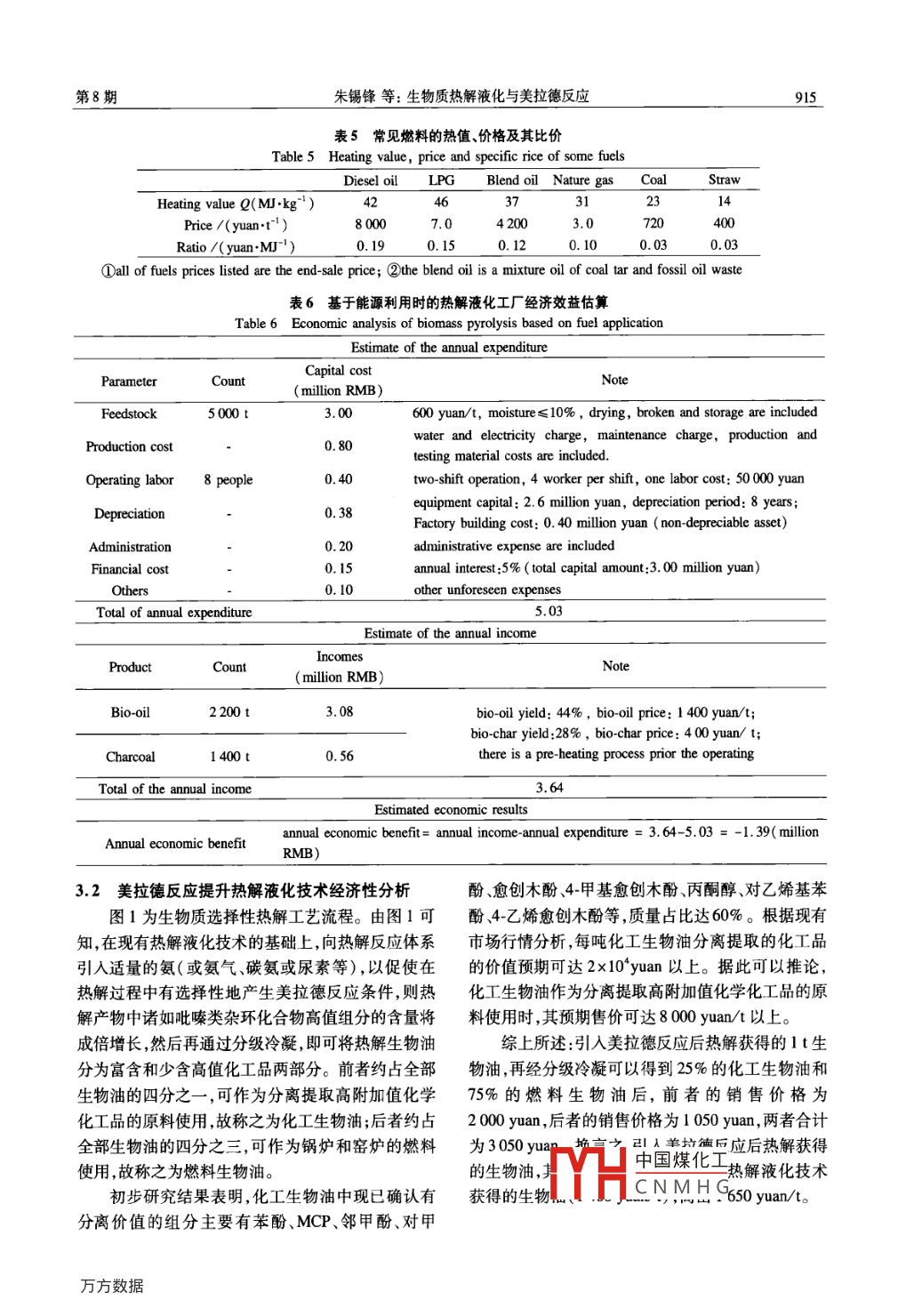 第41卷第8期燃料化學(xué)學(xué)報(bào)Vol 41 No 82013年8月Joumal of Fuel Chemistry and technologyug.2013文章編號(hào):0253-2409(2013)08-0911406生物質(zhì)熱解液化與美拉德反應(yīng)朱錫鋒,朱昌朋(中國(guó)科學(xué)技術(shù)大學(xué)生物質(zhì)潔凈能源安徹省重點(diǎn)實(shí)驗(yàn)室,安徽合肥230026)摘要:對(duì)生物質(zhì)熱解液化和美拉德反應(yīng)進(jìn)行了介紹指出美拉德反應(yīng)不僅存在于生物質(zhì)熱解液化過程中,而且通過引人適量氨等調(diào)控措施,可以促進(jìn)美拉德反應(yīng)有選擇性地生成吡嗪類雜環(huán)化合物等高值化學(xué)品,然后再通過分級(jí)冷凝將生物油分為化工生物油和燃料生物油,前者用于分離提取高值化學(xué)品,后者用于鍋爐和窯爐的燃料。引人美拉德反應(yīng)后,生物質(zhì)熱解液化技術(shù)經(jīng)濟(jì)性將會(huì)得到根本性的改善。關(guān)鍵詞:生物質(zhì);生物質(zhì)熱解;美拉德反應(yīng);生物油中圖分類號(hào):TK6文獻(xiàn)標(biāo)識(shí)碼:ABiomass fast pyrolysis and maillard reactionZHU Xi-feng, ZHU Chang-pengAnhui Key Laboratory for Biomass Clean Energy, University of Science and Technology of China, Hefei 230026, China)Abstract Biomass pyrolysis and Maillard reaction were discussed in this article, Maillard reaction existed notonly in biomass pyrolysis, but also could be facilitated to produce high value-added compounds, such as pyrazineby adding defined ammonia. the condensable gas was condensed into two types of bio-oil which could be usedfor chemical and fuel, respectively. The former could be served as material to obtain valuable chemicals byseparation and extraction, while the latter could be used to burn in boiler or kiln. The economy of biomass fastpyrolysis process would be considerably improved when the Maillard reaction was introducedKey words: biomass; biomass pyrolysis; Maillard reaction; bio-oil生物質(zhì)資源是自然界唯一可再生的碳源,具有化技術(shù)由于具有工藝過程短、原料適應(yīng)性強(qiáng)、反應(yīng)迅數(shù)量巨大、環(huán)境友好、CO2零排放等優(yōu)點(diǎn)。因此,世速、轉(zhuǎn)化率高以及易于商業(yè)化等諸多優(yōu)點(diǎn)故該技術(shù)界各國(guó)都把高效利用生物質(zhì)資源擺在重要位置,中自20世紀(jì)70年代末問世以來,發(fā)展非常迅速6國(guó)更是將生物質(zhì)能利用列為能源領(lǐng)域優(yōu)先發(fā)展的主如荷蘭BTG和加拿大 Dynamotive均于20世紀(jì)90題之一。中國(guó)擁有豐富的生物質(zhì)資源,每年可供年代中期建成萬噸級(jí)示范裝置,中國(guó)科技大學(xué)也于利用的生物質(zhì)資源保守估計(jì)即達(dá)7×10°t標(biāo)煤,實(shí)際2007年通過產(chǎn)學(xué)研合作在合肥建成了中國(guó)第一套可用于能源開發(fā)利用的資源量約合35×10t標(biāo)煤。產(chǎn)業(yè)化示范裝置。但客觀地說,該項(xiàng)技術(shù)迄今在世未來通過技術(shù)進(jìn)步,以及利用邊際土地種植速生林界各國(guó)都沒有真正進(jìn)入市場(chǎng)推廣階段,其原因是多等能源作物將使可用于能源開發(fā)的生物質(zhì)資源高方面的,但根本原因是其經(jīng)濟(jì)性不佳。因此在現(xiàn)有達(dá)10×10t標(biāo)煤2。技術(shù)基礎(chǔ)上加入美拉德反應(yīng)和分級(jí)冷凝措施,使生1982年, bungay在( Science)上提出生物煉物油中高附加值組分的含量顯著增長(zhǎng),從而使之兼制的概念,旨在通過多種技術(shù)途徑將生物質(zhì)轉(zhuǎn)化為其能源產(chǎn)品和化工原料雙重功能,則很可能是提升燃料、電力和化工品等產(chǎn)品。20060年,研究者在生物質(zhì)熱解液化技術(shù)經(jīng)濟(jì)性的重要途徑之一?!?Science)和《Nare)上進(jìn)一步強(qiáng)調(diào),生物煉制1生物質(zhì)熱解液化作為一種新的工業(yè)制造概念,為實(shí)現(xiàn)生物能源和生1.1生物質(zhì)熱解液化物材料的可持續(xù)生產(chǎn)提供了可能,并將成為一種新生物質(zhì)熱解液化是指在中溫(約500℃)缺氧的制造技術(shù)典范條件下使生物質(zhì)快速受熱分解,熱解氣體再經(jīng)快速作為生物煉制的重要手段之一,生物質(zhì)熱解液冷凝而獲得液體產(chǎn)物(生物油)和一部分氣體產(chǎn)物收稿日期:201306-17;修回日期:20130702。中國(guó)煤化工基金項(xiàng)目:國(guó)家自然科學(xué)基金(5090060);國(guó)家高技術(shù)研究發(fā)展計(jì)劃(863計(jì)劃,201THCNMHG署項(xiàng)目(KGZDEW3043)。聯(lián)系作者:朱錫鋒,男,教授,主要從事生物質(zhì)熱解的研究; E-mail:xfhu@ustc.edu.912燃料化學(xué)學(xué)報(bào)第41卷(可燃?xì)?及固體產(chǎn)物(炭粉)的熱化學(xué)轉(zhuǎn)化過程。原因是熱解反應(yīng)為吸熱反應(yīng),吸收的熱量轉(zhuǎn)變?yōu)榛绊懮镔|(zhì)熱解的因素主要有加熱速率、熱解學(xué)能儲(chǔ)藏在了熱解產(chǎn)物之中。反應(yīng)溫度、氣相滯留時(shí)間和熱解高溫氣體的淬冷等。為減少熱解過程對(duì)商品能源的消耗,可以采用在最佳反應(yīng)條件下,農(nóng)林廢棄物生物質(zhì)熱解產(chǎn)物的熱解副產(chǎn)物可燃?xì)饣蛱糠廴紵尫诺臒崃繛闊峤馓岙a(chǎn)率和熱值見表1。由表1可知,不論采用何種原供熱源,從而實(shí)現(xiàn)自熱式熱解。料,三種熱解產(chǎn)物的能量產(chǎn)率之和都大于100%,其表1農(nóng)林廢棄物類生物質(zhì)熱解產(chǎn)物的產(chǎn)率和熱值Table 1 Yields and heating values of pyrolysis products of variousPyrolysis productBio-oi