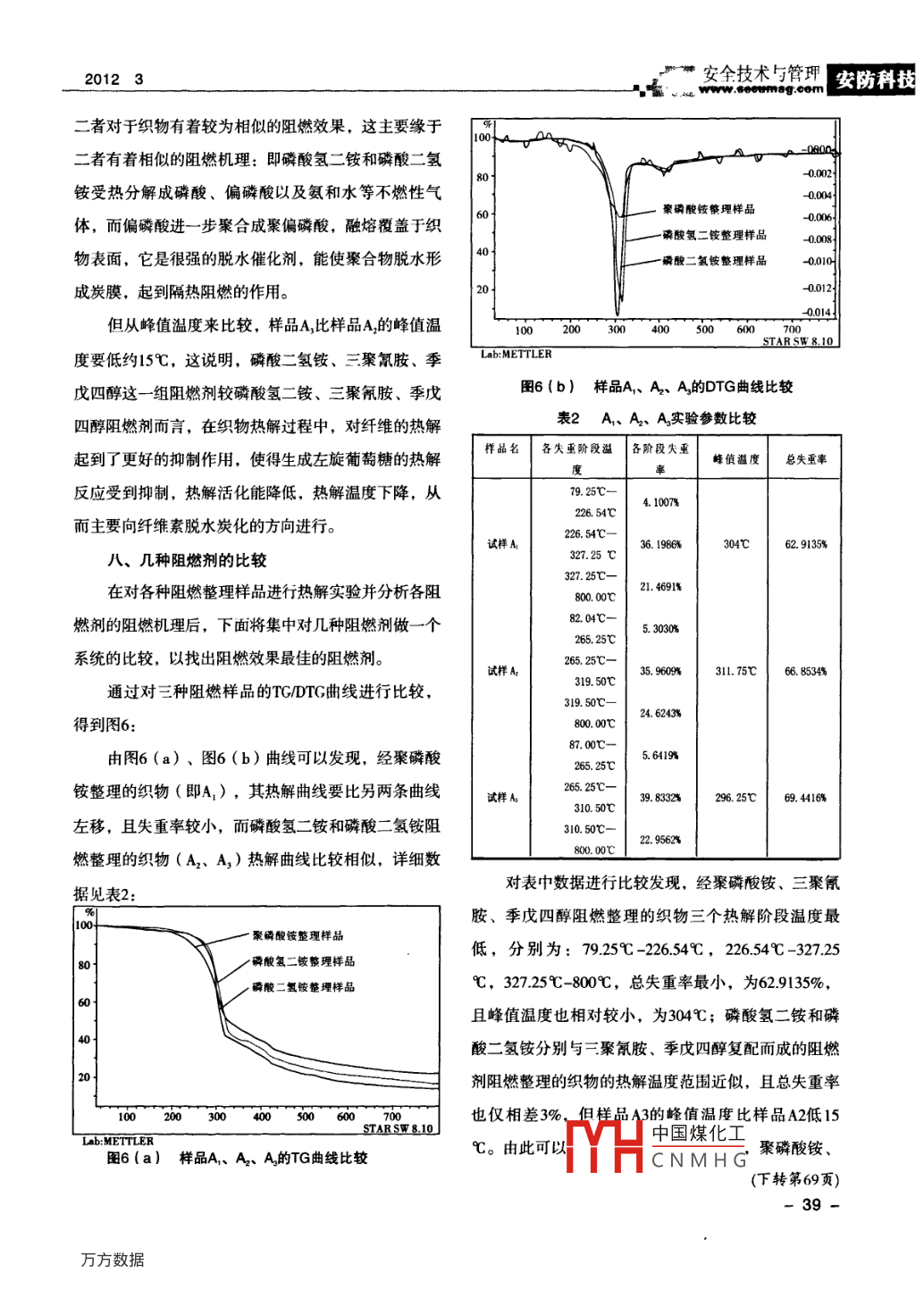 安防科技安全技術(shù)與管理201234.oiag裝飾織物的熱解特性研究安麗麗'高晶1.安順市消防支隊(duì),貴州,5610002.唐山市消防支隊(duì),河北,063000【摘要】本文用三種阻燃配方分別對(duì)織物進(jìn)行阻燃整理,并用熱重分析儀對(duì)各阻燃樣品進(jìn)行熱重實(shí)驗(yàn),得到各樣品的TG曲線和DTG曲線。對(duì)曲線進(jìn)行分析,得到各阻燃樣品各熱解階段的溫度范圍、失重率、主要熱解階段的峰值溫度等參數(shù)?!娟P(guān)鍵詞】裝飾織物阻燃熱解熱重分析引言、阻燃劑的配制及阻燃方案隨著科學(xué)技術(shù)的不斷發(fā)展以及紡織業(yè)的進(jìn)步,織阻燃劑的配制和阻燃方案見(jiàn)表1:物在人們?nèi)粘I罴吧a(chǎn)中的應(yīng)用范圍及數(shù)量大幅增表1阻燃劑的配制及阻燃方案阻燃劑配比(質(zhì)量比)水的用量加,無(wú)論是在居民家庭、辦公場(chǎng)所,還是在賓館飯店、歌舞劇院,為了追求時(shí)尚,營(yíng)造溫馨宜人的環(huán)方案1聚磷酸銨:三聚氟膠:季皮四醇=3.1:1400方案2磷酸氫二銨:三聚氟胺:季戊四醇=3:1:1400g境,各種色彩艷麗、美觀大方的織物被廣泛應(yīng)用,但方萊3“酸氧鐵:二聚胺:季戊四:31這同時(shí)也帶來(lái)了極大的火災(zāi)隱患。按照表1中的方案,將阻燃劑配制成10%的溶1994年的新疆克拉瑪依友誼館火災(zāi)、遼寧阜新藝液,對(duì)織物進(jìn)行阻燃整理,所得阻燃樣品分別標(biāo)記為苑歌舞廳火災(zāi)以及1985年的哈爾濱天鵝飯店火災(zāi),都A,A,A,未阻燃整理織物樣品標(biāo)記為A。是由于織物不具備阻燃性能被引燃并蔓延引起的。三、織物的阻燃整理?yè)?jù)火災(zāi)原因調(diào)查統(tǒng)計(jì),約有20%的火災(zāi)是由于織物引實(shí)驗(yàn)用織物為純棉印花布起的。因此,對(duì)織物進(jìn)行阻燃研究,賦予織物阻滯燃阻燃整理工藝流程:燒的性能,減少其燃燒危險(xiǎn)性以及燃燒時(shí)有毒氣體浸軋阻燃整理液(ih)→◆預(yù)烘(98℃-105的釋放是一項(xiàng)刻不容緩的工作?!?3min)TTH中國(guó)煤化工—≯水洗→烘干(110℃CNMHG20123安全技術(shù)與管理安防科斗四、實(shí)驗(yàn)儀器為三個(gè)階段:初始熱解階段、主要熱解階段和殘?jiān)鼰峤怆A段。各個(gè)階段的熱解溫度范圍及失重率可由圖2中讀出。初始熱解階段溫度范圍為90℃-322.52℃,這個(gè)階段是纖維素?zé)峤獾拈_(kāi)始,主要表現(xiàn)為纖維物理性能的變化及少量失重,失重率為6.8292%;32.52℃一4392℃屬于主要熱解階段,這一階段的失重速率很圖1TGA851型熱重分析儀(瑞士梅特勒公司)快,失重量很大,失重率為750249%,出現(xiàn)最大失重TGA85型熱重分析儀是具有同步DTA及DSC功時(shí)的峰值溫度T為378.85℃;43972℃-800屬于能的最新一代熱重分析儀。它具有溫度范圍寬、溫度殘?jiān)鼰峤怆A段,熱解進(jìn)行到該階段后,脫水、炭化熱準(zhǔn)確度髙、可明確確定氣氛、單坩堝等特點(diǎn)。全程測(cè)解反應(yīng)的方向更加明顯,纖維素燃燒殘?jiān)^續(xù)脫水、量點(diǎn)達(dá)一百萬(wàn)個(gè),最高升溫速率可達(dá)100℃c/min,最脫羧,放出水和二氧化碳等,并進(jìn)行重排反應(yīng),形成高溫度為1600℃,溫度波動(dòng)控制在±0.25℃,重量靈雙鍵、羰基和羧基產(chǎn)物,殘?jiān)刑己吭絹?lái)越高敏度為±0.1μg。,但只表現(xiàn)出少量失重,失重率僅為41791%。CS101-E電熱鼓風(fēng)干燥箱(重慶四達(dá)實(shí)驗(yàn)儀器七、阻燃織物的熱解過(guò)程及分析有限公司)經(jīng)阻燃整理后,纖維的三個(gè)熱解階段仍舊存在五、實(shí)驗(yàn)條件但溫度范圍及失重率有了較大的變化。同時(shí),由于不初始溫度30℃,終止溫度80℃,升溫速率15℃同阻燃劑具有不同的阻燃效果,因此,實(shí)驗(yàn)中使用了/min,天平保護(hù)性氣體N2,流量30 ml/min,反應(yīng)性氣六種不同的阻燃劑分別對(duì)織物進(jìn)行阻燃整理,通過(guò)對(duì)體N2,流量30m/min。熱解曲線( TG/DTG曲線)進(jìn)行比較,得到最佳的阻六、織物熱解的典型過(guò)程燃配方。圖2所示是未阻燃整理樣品(即A)的熱解曲通過(guò)對(duì)聚磷酸銨(APP)、三聚氰胺、季戊四醇線阻燃整理的織物(即樣品A1)進(jìn)行熱解實(shí)驗(yàn),得到曲線如圖3所示:80空白樣:9.7560mg00050010聚磷酸銨、三聚氰胺60李四酶整理樣品00100015001STAR SWLah: METTLER圖2樣品A熱解曲線中國(guó)煤化由圖2可以看出,未經(jīng)阻燃整理的織物熱解可分Lab: METTlERCNMHG37安防科技安個(gè)技術(shù)與理”20123由圖3可以看出,經(jīng)聚磷酸銨、三聚氰胺、季戊℃-3195℃,失重率為359609%;最大失重所對(duì)應(yīng)四醇阻燃整理的織物,其初始熱解階段溫度范圍為的峰值溫度T為311.75℃;殘?jiān)鼰峤怆A段的溫度范圍7925℃-22654℃,失重率為41007%;主要熱解階為3195℃-80℃,失重率為246243%。段溫度范圍為226.54℃-327.25℃,失重率為通過(guò)對(duì)磷酸二氫銨、三聚氰胺、季戊四醇阻燃整361986%,最大失重對(duì)應(yīng)的峰值溫度T。為304℃,殘理的織物(即樣品A3)進(jìn)行熱解實(shí)驗(yàn),得到曲線如圖渣熱解階段溫度范圍為32725℃-800℃,失重率為5所示:21.4691%。在對(duì)聚磷酸銨的阻燃機(jī)理進(jìn)行分析后,發(fā)現(xiàn)聚磷801重二感、聚架酸銨具有以下幾方面作用:00061.釋放出聚磷酸,作為氧的物理屏障,阻隔了織0m08物與氧氣的接觸,起到絕熱和隔絕空氣的作用;2.作為親核劑,可促進(jìn)鄰近的懸垂腈基發(f