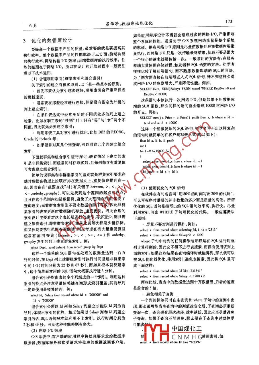 第23卷計算機應(yīng)用Vol. 232003年6月Computer ApplicationsJune, 2003文章編號:1001 -9081(2003)06Z -0172 -03數(shù)據(jù)庫性能優(yōu)化呂華,杜忠軍(四川大學(xué)計算機系,四川成都610065)摘要:文中介紹正確設(shè)計一個數(shù)據(jù)庫的經(jīng)驗,其重點是提高其性能,分析和比較不同設(shè)計方法給數(shù)據(jù)庫性能帶來的影響,同時給初學(xué)者-點建議。關(guān)鍵詞:數(shù)據(jù)庫;性能;優(yōu)化中圖分類號: TP311.53文獻標識碼:A能問題就會不斷出現(xiàn)。如果軟件中還有大量復(fù)雜的數(shù)據(jù)處理引言和數(shù)據(jù)庫對象,又或者涉及到分布式數(shù)據(jù)庫的聯(lián)機分析決策對一個要處理.上百萬數(shù)據(jù)量的大型數(shù)據(jù)庫系統(tǒng),比如聯(lián)支持系統(tǒng),那么整個系統(tǒng)的響應(yīng)速度就會變得很慢,或者根本機事務(wù)處理OLIP或決策支持系統(tǒng)DSS,要求很高數(shù)據(jù)庫端就無法忍受。據(jù)作者實驗表明,兩個同樣功能的數(shù)據(jù)庫軟件的執(zhí)行效率。雖然各種數(shù)據(jù)庫如Sybase、Oracle、SQL Server、在執(zhí)行時的效率比較,在數(shù)據(jù)量達到百萬級,經(jīng)過優(yōu)化和正確DB2有各自的性能優(yōu)勢和優(yōu)化器,但是作為開發(fā)人員還是必設(shè)計的軟件是劣質(zhì)軟件的上百倍甚至是幾百倍。可見對于一需要注意數(shù)據(jù)庫產(chǎn)品的性能調(diào)節(jié)和SQL語句的高質(zhì)量編寫,個系統(tǒng)不是簡單地能實現(xiàn)其功能就可,而是要規(guī)范數(shù)據(jù)庫的否則即使選擇再好的數(shù)據(jù)庫產(chǎn)品也不能彌補軟件設(shè)計的低劣設(shè)計,寫出高質(zhì)量的SQL語句,提高系統(tǒng)的可用性。所帶來的性能損失。作者發(fā)現(xiàn)有很多初學(xué)者把數(shù)據(jù)庫的前端開發(fā)產(chǎn)品(如2數(shù)據(jù)庫產(chǎn)品的選擇.PowerBuilder, Delphi等)作為重點學(xué)習(xí)對象,注重于漂亮的界顯然做數(shù)據(jù)庫項目時后端的數(shù)據(jù)庫用什么產(chǎn)品是個重要面和花哨的功能而忽略了整個數(shù)據(jù)庫端的效率。雖然友好的指標。既要考慮開發(fā)難度,又要考慮數(shù)據(jù)庫產(chǎn)品的性能、產(chǎn)品人機界面也很重要,但軟件的性能和效率也是不容忽視的,否則就會本末倒置。隨著軟件運行后數(shù)據(jù)量的增加,軟件的性不同版本提供的功能和價格因素。以下這個表僅供參考:產(chǎn)品DB性能指標SQL Server 2000Oracle 8iDB2安全性沒有獲得任何安全證書獲得最高認證級別的Iso標準認證執(zhí)行效率多用戶時性能不佳性能最高,保持Windows NT下的TPC-D適用于數(shù)據(jù)倉庫和在線事物處理,性能較高和TPC-C的世界記錄Oraele平行服務(wù)器通過使-組結(jié)點共享DB2具有很好的并行性。DB2把數(shù)據(jù)庫管理并行實施和共存模型并不成熟。很難處理日益同一簇中的工作來擴展 Windows NT的能擴充到了并行的、多節(jié)點的環(huán)境數(shù)據(jù)庫分并行性區(qū)是數(shù)據(jù)庫的一部分, 包含自己的數(shù)據(jù)、索增多的用戶數(shù)和數(shù)據(jù)卷。伸縮性有限力,提供高可用性和高伸縮性的簇的解決引配置文件和事務(wù)日志。數(shù)據(jù)庫分區(qū)有時方案.被稱為節(jié)點或數(shù)據(jù)庫節(jié)點只能在Windows上運行,沒有絲毫的開放性,操作系統(tǒng)的系統(tǒng)的穩(wěn)定對數(shù)據(jù)庫是十分重要能在所有主流平臺上運行(包括能在所有主流平臺上運行(包括Windows)。的。Windows 9X系列產(chǎn)品是偏重于桌面應(yīng)用,Windows)。完全支持所有的工業(yè)標準。最適于海量數(shù)據(jù)。DB2在企業(yè)級的應(yīng)用最為開放性NT Server只適合中小型企業(yè)。而且Windows采用完全開放策略??梢允箍蛻暨x擇最適廣泛,在全球的500 家最大的企業(yè)中兒乎平臺的可靠性,安全性和伸縮性是非常有限的。合的解決方案。對開發(fā)商全力支持85%以上用DB2 數(shù)據(jù)庫服務(wù)器,而國內(nèi)到它不象UNX那樣久經(jīng)考驗,尤其是在處理大1997年約占5%數(shù)據(jù)量的關(guān)鍵業(yè)務(wù)時cIs結(jié)構(gòu),只支持Windows客戶,可以用ADO、較復(fù)雜,同時提供GUI和俞令行.在操作簡單,同時提供GUI 和命令行,在其它評價DAO、 OLEDB. ODBC連接。操作簡單,但只Windows NT和UNX下操作相同。多層Windows NT和UNIX下操作相同??缙脚_,次網(wǎng)絡(luò)計算,支持多種工業(yè)標準,可以用有圈形界面ODBC. JDBC、0CI等網(wǎng)絡(luò)客戶連接多層結(jié)構(gòu),支持0DBC、JDBC等客戶中國煤化工收稿日期:2002-11-25作者簡介:昌華(1978-),男,碩士研究生,主要研究方向:數(shù)據(jù)庫原理及應(yīng),MYHCN M H G杜忠軍(1966-),男,副教授,主要研究方向:數(shù)據(jù)庫原理及應(yīng)用多媒體數(shù)據(jù)庫、面向?qū)ο髷?shù)據(jù)庫.呂華等:數(shù)據(jù)庫性能優(yōu)化6月如果應(yīng)用程序設(shè)計不當(dāng)就會造成過多的網(wǎng)絡(luò)V0,嚴重影響3優(yōu)化的數(shù)據(jù)庫設(shè)計整個系統(tǒng)的性能。通常對于C/S系統(tǒng)網(wǎng)絡(luò)流量是整個系統(tǒng)要提高- -個數(shù)據(jù)庫產(chǎn)品的質(zhì)量,最重要的就是要提高其的瓶頸。提高網(wǎng)絡(luò)vo原則是盡量使數(shù)據(jù)處理在數(shù)據(jù)庫端批執(zhí)行效率。整個數(shù)據(jù)庫產(chǎn)品的性能取決于三方面:前端功能量執(zh