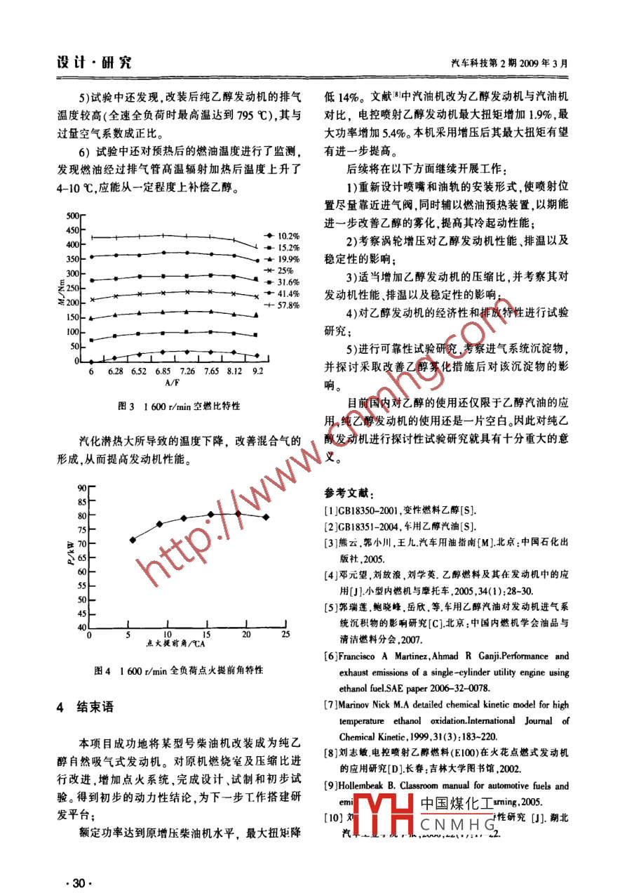 純變性乙醇燃料發(fā)動(dòng)機(jī)的初步研究/程偉,陳小迅,戈銳等設(shè)計(jì)·研究純變性Z醇燃料發(fā)動(dòng)機(jī)的初步研究程偉,陳小迅,戈銳,安濤(東風(fēng)汽車有限公司東風(fēng)商用午技術(shù)中心,武漢4306)楠要:詳細(xì)分析了乙醇燃料的物化特點(diǎn),介紹了以某型號(hào)柴油機(jī)為基礎(chǔ)改裝成純乙醇自然吸氣式發(fā)動(dòng)機(jī)的設(shè)計(jì)方案,并對(duì)其進(jìn)行了初步的試驗(yàn)研究關(guān)鍵詞:乙醇燃料;純乙醇;發(fā)動(dòng)機(jī)試驗(yàn)中圖分類號(hào):TK431文獻(xiàn)標(biāo)志碼:A文章編號(hào):1005-2550(2009)02-0027The Pilot Study of E100 EngineCHENG Wei, CHEN Xiao-xun, GE Rui, AN TaDongfeng Commercial Vehicle Technical Center of DFL, Wuhan 430056, ChinaAbstract In the present thesis, the characteristics of ethanol fuel are analyzed, the method of refitting a diesel engine to anaturally aspirated E100 engine is presented, and the results of some fundamental tests are provided.Key words: ethanol fuel; E100近年來隨著能源危機(jī)和大氣污染日益嚴(yán)重,尋找應(yīng)用起到了技術(shù)保證作用,并陸續(xù)擴(kuò)大試點(diǎn)范圍,已清潔的代用燃料已成為各國(guó)發(fā)動(dòng)機(jī)T作者的研究目取得初步成效。自2002年以來我國(guó)已相繼有9個(gè)標(biāo)。對(duì)車用發(fā)動(dòng)機(jī)而言在眾多的代用燃料方案中乙省市用含有10%乙醇的車用乙醇汽油代替普通汽醇作為一種現(xiàn)實(shí)的可再生的清潔燃料備受矚目油國(guó)。據(jù)相關(guān)報(bào)道,在部分城市的比例甚至達(dá)到在國(guó)內(nèi),發(fā)改委在“十五”規(guī)劃中就在部分省市95%,但燃用純乙醇的汽車尚未見相關(guān)報(bào)道。推行燃料乙醇試點(diǎn)項(xiàng)目,發(fā)布了《變性燃料乙醇》本文工作以某型號(hào)柴油機(jī)為原型,對(duì)其改進(jìn)機(jī)和《車用乙醇汽油》1兩項(xiàng)國(guó)家標(biāo)準(zhǔn),為乙醇的推廣型進(jìn)行了燃用純變性乙醇燃料的實(shí)驗(yàn)研究。收稿日期:2008-12-11作者簡(jiǎn)介:程偉(1967-)男湖南慈利人新燃料發(fā)動(dòng)機(jī)設(shè)計(jì)室主1乙醇的物化特性任,碩土研究生高級(jí)T程師主要從事發(fā)動(dòng)機(jī)燃燒與排放控制,新燃料發(fā)動(dòng)機(jī)設(shè)計(jì)與研究等與汽油相比,乙醇在物化特性方面主要具有以之所以要將故障診斷作為一個(gè)單獨(dú)的解析模通過實(shí)車實(shí)驗(yàn)軟件各部分功能運(yùn)行完好,有一定的塊,是因?yàn)楣收习l(fā)送模式與一般的數(shù)據(jù)幀有所區(qū)別。實(shí)用價(jià)值。在實(shí)驗(yàn)中深感J99協(xié)議的優(yōu)越性能隨當(dāng)很多個(gè)故障同時(shí)發(fā)生時(shí),發(fā)動(dòng)機(jī)先是發(fā)送一個(gè)廣著CAN總線應(yīng)用領(lǐng)域的不斷發(fā)展SAEJ939協(xié)議播報(bào)文提示發(fā)送故障的個(gè)數(shù)以及總字節(jié)數(shù);然后將必將得到更好的應(yīng)用。故障打包發(fā)送。本模塊首先對(duì)報(bào)文拆包,然后解析接收到的故障的FM和SPN,進(jìn)而顯示故障的發(fā)生參考文獻(xiàn):點(diǎn)發(fā)生類型、發(fā)生次數(shù),并在表格中顯示。[1] SAE J1939 Standards Collection, Recommended Practicefor a Serial Control and Communication Vehicle Network4結(jié)論Society of Automotive Engineers. 200[2]SAchicle Application Layer中國(guó)煤化工AE93 Committ本文介紹了基于SAEJ939協(xié)議的發(fā)動(dòng)機(jī)虛擬CNMHG儀表系統(tǒng)的開發(fā)思路。該系統(tǒng)為實(shí)驗(yàn)室發(fā)動(dòng)機(jī)試驗(yàn)(3]程軍輛割系統(tǒng)總線通信和控制協(xié)議SAEJ19世系統(tǒng)的一部分,也可以配合本科生的教學(xué)實(shí)驗(yàn)課程。界汽車,2000,(2):19-21設(shè)計(jì)·酬究汽車科技第2期2009年3月下特點(diǎn):2)相同工況下,純乙醇發(fā)動(dòng)機(jī)的HC排放要大=)乙醇含氧豐富高達(dá)348%,這也是其理論空大低于汽油機(jī)的,且點(diǎn)火提前角對(duì)其的影響很小;僅為9的主要原因3)相同過量空氣系數(shù)下,純乙醇發(fā)動(dòng)機(jī)的NO2)乙醇熱值較低,所需的循壞供應(yīng)量大大增加,排放要比汽油機(jī)的少50%。定程度上影響乙醇發(fā)動(dòng)機(jī)的功率此外,由于乙醇燃燒不完全還會(huì)產(chǎn)生一些微量3)汽化潛熱很高,所產(chǎn)生的冷卻效應(yīng)會(huì)妨礙排放物(乙醛、甲醛、乙酸等)。而如果考慮植物光燃料在低溫起動(dòng)時(shí)的完全汽化,使發(fā)動(dòng)機(jī)冷起動(dòng)合作用所消耗的CO2,則基本上可以認(rèn)為乙醇發(fā)動(dòng)性能惡化,必須采取相應(yīng)措施。但同時(shí)也可以提高機(jī)對(duì)溫室效應(yīng)的影響為零。充氣效率,降低缸內(nèi)溫度,因而壓縮比可以相應(yīng)提高2發(fā)動(dòng)機(jī)本體改造4)蒸汽壓很低而粘度很大影響均勻混合氣的形成和各缸一致性本文實(shí)驗(yàn)中原型機(jī)的技術(shù)參數(shù)如表1所示5)乙醇辛烷值較高,意味著乙醇具有良好的抗表1某型號(hào)柴油機(jī)技術(shù)參數(shù)爆性能,因此乙酶發(fā)動(dòng)機(jī)叮以較汽油機(jī)使用更高的直列六缸、四沖程,水冷增壓壓縮比,從一定程度上彌補(bǔ)乙醇熱值低所帶來的功缸內(nèi)直噴壓燃式發(fā)動(dòng)機(jī)率降低;額定功率轉(zhuǎn)速118 kW/2 600 r/min6)乙醇著火極限范圍較寬,意味著醇有進(jìn)行缸徑x沖程05mmx120稀薄燃燒