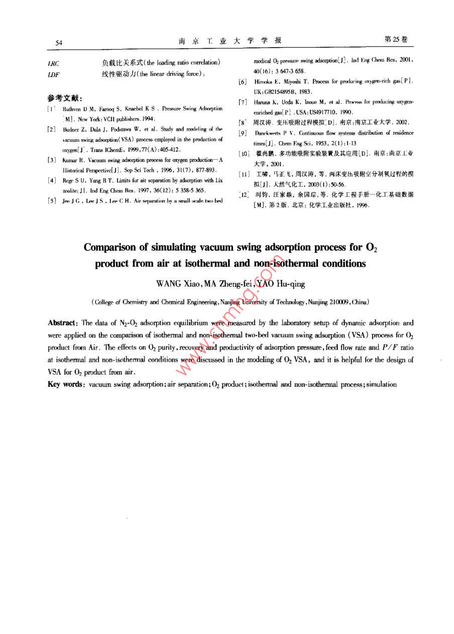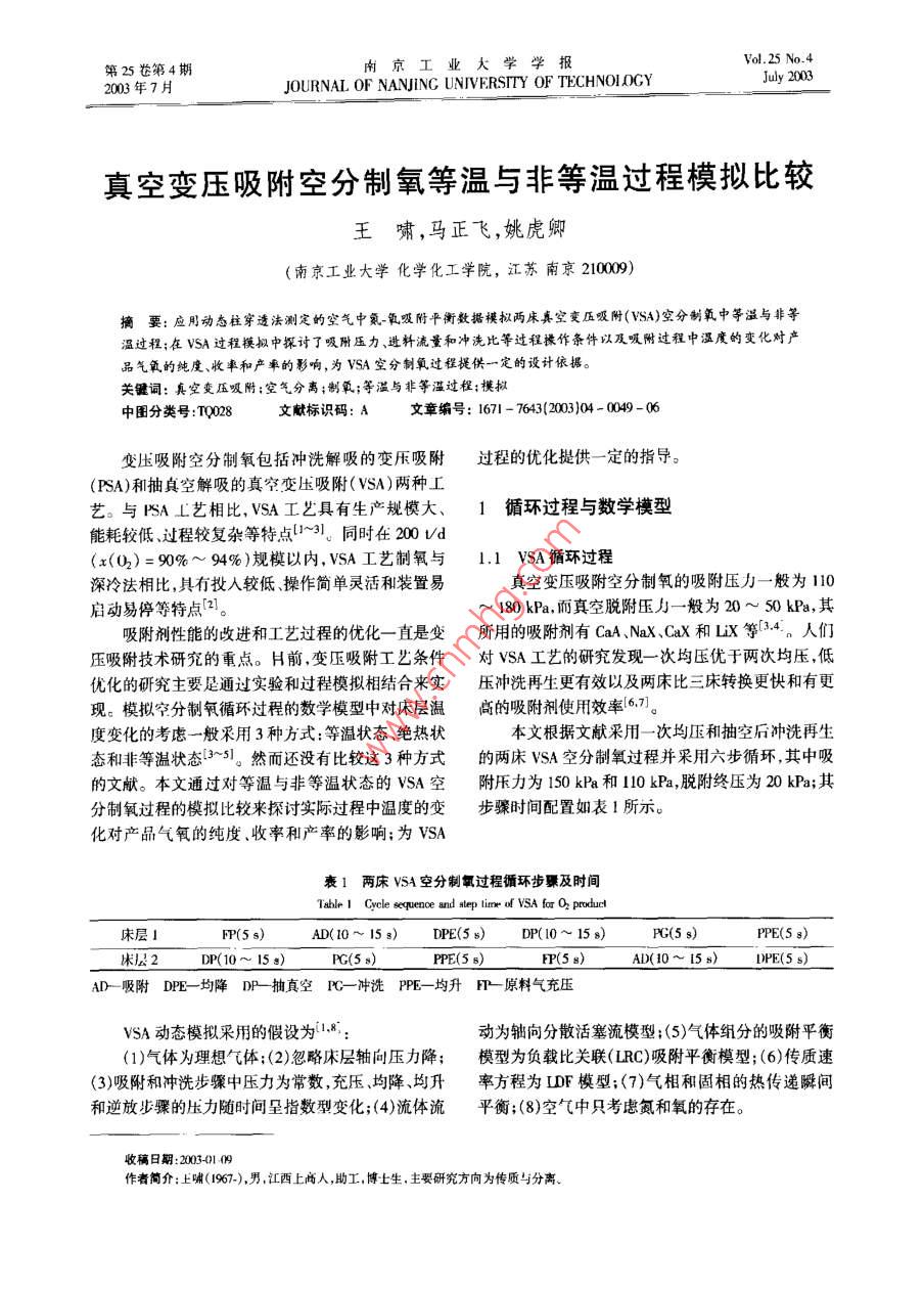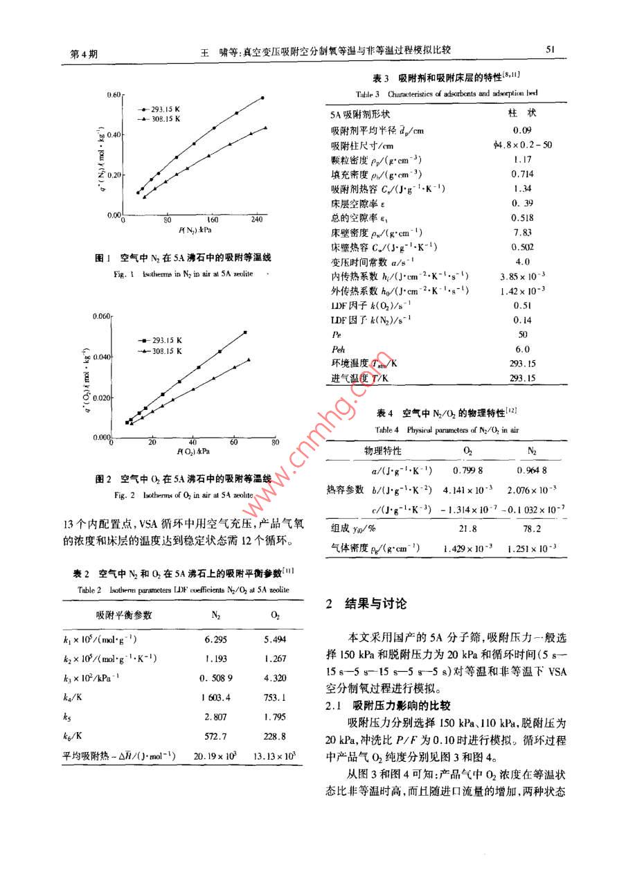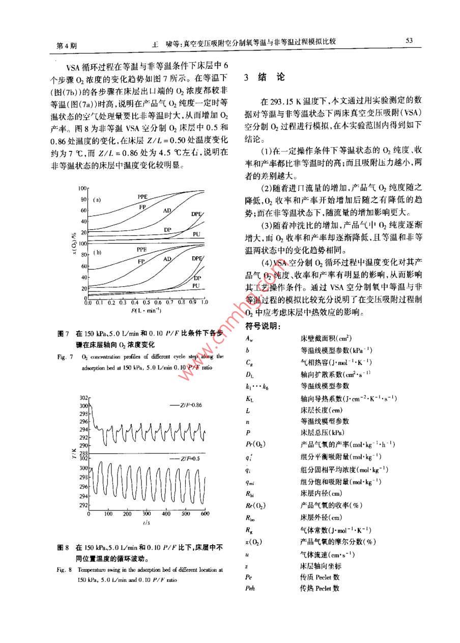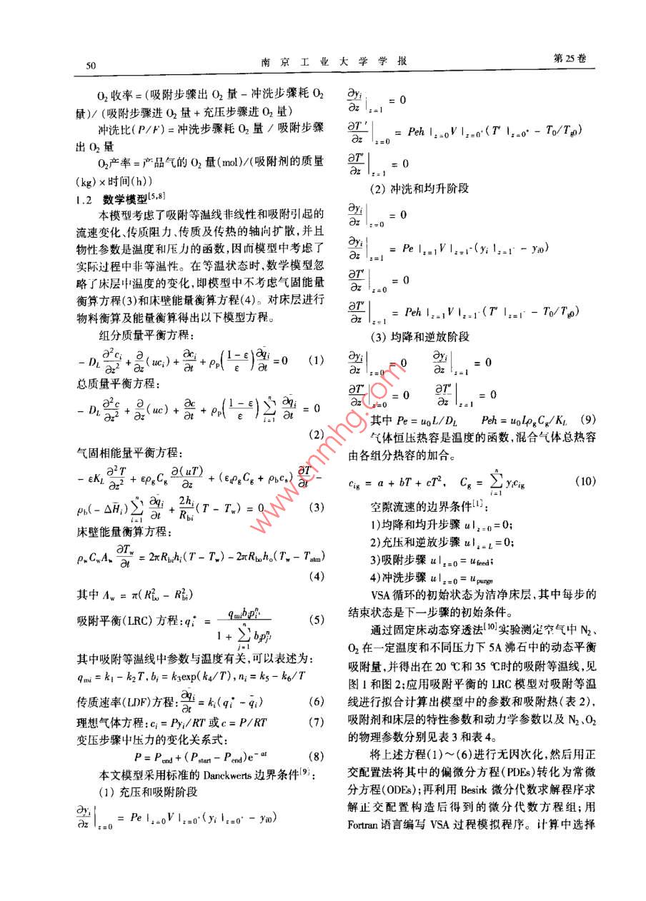 Vol 25 No 4第25卷第4期南京工業(yè)大學(xué)學(xué)報(bào)2003年7月JOURNAL OF NANJING UNIVERSITY OF TECHNOLOGY真空變壓吸附空分制氧等溫與非等溫過程模擬比較王嘯,馬正飛,姚虎卿(南京工業(yè)大學(xué)化學(xué)化工學(xué)院,江蘇南京21000摘要:應(yīng)用動態(tài)柱穿透法測定的空氣中氣-氧吸附平衡數(shù)據(jù)模擬兩床真空變伍吸附(VSA)空分制氧中等溢與非等區(qū)過程;在SA過程糗擬中探討了吸附壓力、遜料流量和沖洗比等過程操作條件以及嗄附過程中濕度的變化對產(chǎn)品氣氧的純度、收率和產(chǎn)率的影響,為ⅤSA空分制氧過程提供一定的設(shè)計(jì)依據(jù)。關(guān)鍵詞:真空變壓吸附;空氣分離;制氧;等濫與非等濫過程:樸擬中圖分類號:T0028文獻(xiàn)標(biāo)識碼:A文章編號:1671-7643(2003104-009-06變壓吸附空分制氧包括沖洗解吸的變壓吸附過程的優(yōu)化提供一定的指導(dǎo)(FSA)和抽真空解吸的真空變壓吸附(VSA)兩種工藝。與閃A工藝相比,ⅤsA工藝具有生產(chǎn)規(guī)模大、1循環(huán)過程與數(shù)學(xué)模型能耗較低、過程較復(fù)雜等特點(diǎn)~引。同時(shí)在200vd(x(O2)=90%~94%)規(guī)模以內(nèi),VSA工藝制氧與1.1WSA循環(huán)過程深冷法相比,其有投入較低操作簡單靈活和裝置易真空變壓吸附空分制氧的吸附壓力一般為110啟動易停等特點(diǎn)21。180kPa,而真空脫附壓力一般為20~50kPa,其吸附劑性能的改進(jìn)和工藝過程的優(yōu)化一直是變所用的吸附劑有CaA、Nax、CaX和Lⅸx等34。人們壓吸附技術(shù)研究的重點(diǎn)。H前,變壓吸附工藝條件對ⅤSA工藝的研究發(fā)現(xiàn)一次均壓優(yōu)于兩次均壓,低優(yōu)化的研究主要是通過實(shí)驗(yàn)和過程模擬相結(jié)合來實(shí)壓沖洗再生更有效以及兩床比三床轉(zhuǎn)換更快和有更現(xiàn)。模擬空分制氧循環(huán)過程的數(shù)學(xué)模型中對床層溫高的吸附劑使用效率67度變化的考慮一般采用3種方式:等溫狀態(tài)、絕熱狀本文根據(jù)文獻(xiàn)采用一次均壓和抽空后沖洗再生態(tài)和非等溫狀態(tài)3然而還沒有比較這3種方式的兩床ⅤSA空分制氧過程并釆用六步循環(huán),其中吸的文獻(xiàn)。本文通過對等溫與非等溫狀態(tài)的ⅤSA空附壓力為10kPa和110kPa,脫附終壓為20kPa;其分制氧過程的模擬比較來探討實(shí)際過程中溫度的變步驟時(shí)間配置如表1所示。化對產(chǎn)品氣氧的純度、收率和產(chǎn)率的影響;為WSA表1兩床VA空分制氯過程循環(huán)步驟及時(shí)間Table I Cycle sequence and atep lime of VSA for O pro床層1FP(5 s)AD(10~15g)DE(5s)DP(10~158)PG(5 s)ppE(5 8)味層2DP(10~15s)G(5s)PPE(5 s)FP(5 sAD(10~15DPE(5 s)AD吸附DPE一均降DP抽真空P一沖洗均升F原料氣充壓VSA動態(tài)模擬采用的假設(shè)為1.8動為軸向分散活塞流模型;(5)氣體組分的吸附平衡(1)氣體為理想氣體;(2)忽略床層軸向壓力降;模型為負(fù)載比關(guān)聯(lián)(LRC)吸附平衡模型;(6)傳質(zhì)速(3)吸附和沖洗步驟中壓力為常數(shù),充壓、均降、均升率方程為IDF模型;(7)氣相和固相的熱傳遞瞬間和逆放步驟的壓力隨時(shí)間呈指數(shù)型變化;(4)流體流平衡;(8)空氣中只考慮氮和氧的存在。收稿日期:20030109作者簡介:上哺(1967-)男江西上尚人,助工,博上生,主要研究方向?yàn)閭髻|(zhì)與分離南京工第25卷O2收率=(吸附步驟出O2量-沖洗步驟耗O2量)/(吸附步驟進(jìn)O2量+充壓步驟進(jìn)O2量)沖洗比(P/F)=沖洗步驟耗O2量/吸附步驟a7Peh l,soV lisn(T I2出O2量O2產(chǎn)率=產(chǎn)品氣的O2量(mol)/(吸附劑的質(zhì)量(kg)×?xí)r間(h))(2)沖洗和均升階段1.2數(shù)學(xué)模型58本模型考慮了吸附等溫線非線性和吸附引起的流速變化傳質(zhì)阻力傳質(zhì)及傳熱的軸向擴(kuò)散,并且物性參數(shù)是溫度和壓力的函數(shù),因而模型中考慮了Pe Iis,VI實(shí)際過程中非等溫性。在等溫狀態(tài)時(shí),數(shù)學(xué)模型忽略了床層中溫度的變化即模型中不考慮氣固能量。-0衡算方程(3)和末壁能量衡算方程(4)對床層進(jìn)行T=Phl2Vl21(r,-70/7)物料衡算及能量衡算得出以下模型方程。az紅分質(zhì)量平衡方程(3)均降和逆放階段a2az總質(zhì)量平衡方程:97Dac其中Pe=u0L/D2Peh=uo4Cx/K.(9)(2)氣體恒壓熱容是溫度的函數(shù),混合氣體總熱容氣固相能量平衡方程由各組分熱容的加合。Ca(uT)CgyCig(10)at Rb(T-T)=0(3)空隙流速的邊界條件1):床壁能量衡算方程:1)均降和均升步驟al:=o=02)充壓和逆放步驟u4L=0;Pw ws a =2xRi h: (T-T)-2xRh(T -Tam)3)吸附步驟a(4)4)沖洗步驟u12=0= lL其中Aw=π(R-R)VSA循環(huán)的初始狀態(tài)為潔凈床層,其中每步的吸附平衡(LRC)方程:q=quip i(5)結(jié)束狀態(tài)是下一步驟的初始條件。+∑b通過固定床動態(tài)穿透法0實(shí)驗(yàn)測定空氣中N2、O2在一定溫度和不同壓力下5A沸石中的動態(tài)平衡其中吸附等溫線中參數(shù)與溫度有關(guān),可以表述為:吸附量,并得出在20℃和35℃時(shí)的吸附等溫線,見qmi=kI-k2T, b,= k3exp ( k4/T), n;= k5-k6/T圖I和圖2;應(yīng)用吸附平衡的RC模型對吸附等溫傳質(zhì)速率(UDP)方程:當(dāng)=(q-)(6)線進(jìn)行擬合計(jì)算出模型中的參數(shù)和吸附熱(表2)理想氣體方程:c=P/F或c=P/RT(7)吸附劑和床層的特性參數(shù)和動力學(xué)參數(shù)以及N2、O2變壓步驟中壓力的變化關(guān)系式:的物理參數(shù)分別見表3和表4P= Pend+(Pturt-Pend)e ar(8)將上述方程(1)~(6)進(jìn)行無因次化,然后用正本文模型采用