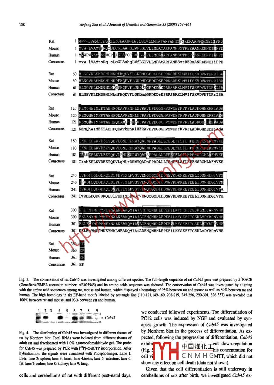 Availableonlineatwww.sciencedirectcomJOURNALOf° SciencedirectGENETICS ANDGENOMICSELSEVIERJ. Genet Genomics 35(2008)153-161The ethanol response gene Cab45 can modulate the impairmentelicited by ethanol and ultraviolet in pc12 cellsYunfeng Zhu, Quanli Wang, Wangru Xu, Sha Liab Department of Transfusion in Beijing 307 Hospital, Fengtai District, Beying 100071, ChinaReceived for publication 15 October 2007: revised 27 November 2007: accepted 7 December 2007AbstractHigh consumption of ethanolic beverages facilitates neurodegeneration, but the mechanism of this process still remained elusive. Sup-pression subtractive hybridization(SSH)is a technique for detection of rare transcripts, With SSH approach, we identified one ethanolresponse gene Cab45, which was down-regulated by ethanol with time-dependent manner in B104 cells. The full-length sequence ofCab45 gene was obtained by 5-RACE(5 Rapid Amplification of cDNA Ends) for the first time in rat. Based on the sequence of deducedamino acid of rat Cab45, the alignment was conducted with its counterparts in different species and displayed a high conservation. Usingdifferent tissues in rat and cell lines, Cab45 was characterized by a ubiquitous expression and differentiation dependent down-regulation.Given that ethanol facilitates some cell differentiation, we hypothesize that Cab45 is involved in ethanol-mediated differentiation. withtransient transfection, the function of Cab45 was investigated by up-regulation and down-regulation in PC12 cells. Ethanol treatment andUV exposure were conducted subsequently and cell proliferations were detected by MTT (Methyl Thiazolyl Tetrazolium) approach. Itrevealed that the up-regulation of Cab45 modulated the impairment elicited by ethanol and UV in transfected cells. As a member of newalcium binding protein family, the exact role of Cab45 still remains unclear.Keywords: ethanol; Cab45: calcium-binding protein; gene identification; subtractive hybridizationIntroductionneurodegeneration in infant rat and mouse brain(Young etaL., 2003). The cause of neurodegeneration by ethanol re-As a major human disease risk factor, ethanol is in- mains to be elusive and considerable research attention hasvolved in many diseases concerned with energy and sub- been focused on identifying the endogenous and environ-strate metabolism, e.g, arteriosclerosis, dementia, diabetes, mental factors that contribute to its etiologyand conditions associated with Zn metabolism(Kim et al.The positive association between ethanol consumption2004; Suter, 2004). High consumption of ethanolic bever- and neurodegeneration was highlighted by recent studies: 1)ages increases the risk of certain cancers(Doll and Peto, ethanol induces apoptotic neurodegeneration during1981; Mufti, 1993; Tonnesen et al, 1994)and facilitates synaptogenesis period of development in rodents(Olney etneurodegeneration(Fein and Sclafani, 2004; Luchsinger et al., 2002); 2)ethanol selectively decreases Purkinje cellal, 2004). It has been reported that ethanol exposure leads expression of tyrosine-kinase B(TrkB)and tyrosine-kinaseto impairments of the cerebra and cerebellum in different C (TrkC)receptors following exposures within postnatalareas, such as agranular insular cortex, anterior piriform days 4-6. These results suggest that ethanol may inducecortex, perirhinal cortex, lateral entorhinal cortex, and the loss of中國(guó)煤化 Neurotrophic regulatemporal dentate gyrus, and triggers widespread apoptotic tion atH102); 3)using a dualmechaCNMHGmethyl-D-aspartatesponding author Fax: +86-10-5112 8448.(MDA) glutamate receptors and excessive activation ofmailaddresszhuyf2004@163.comGABA (A)receptors, ethanol can trigger widespreadYunfeng Zhu et al. /Joumal of Genetics and Genomics 35 (2008)153-161apoptotic neurodegeneration in the developing rat forebrain. Neuron growth factor (NGF) treatment for PC12In humans, vulnerability coincides with the period of synaptogenesis and extends from the sixth month of gestation PC12 cells were cultured in Dulbecco's modified Ea-to several years after birth (Ikonomidou et al., 2000); 4)by gle's medium(DMEM)supplemented with 5% horse se-suppressing neuronal activity through altering glutamate rum and 10% fetal calf serum(Hyclone, South Logan, UT,nd GABA transmission, ethanol causes millions of nerve USA)(ean et al, 2005). For experiments, the PC12 cellscells to commit death in the developing rodent brain. This were incubated with serum-free medium(Dulbecco'pro-apoptotic effect of ethanol provides a likely explana- modified Eagle's medium containing 2 mg/mL bovine se-tion for the diminished brain size and lifelong neurobehavrum albumin, 1 ug/mL insulin, 2 ug/mL transferin, 30ioral disturbances associated with the human fetal ethanol nmol/L Na,SO, and 10 mmol/L HEPES, pH 7. 4)before-syndrome(Farber and olney, 2003)hand for 12 h and followed by treatment with NGF(30Based on the phenomenon of ethanol involvement in the ng/mL). The differentiation of PC12 cells induced by NGFprocess of neurodegeneration, we tried to identify ethanol was evaluated by synapse outgrowthresponse genes using suppressed subtractive hybridization(SSH) method. This method offers two major advantages,Suppressing subtractive hybridizationi.e., the inclusion of all the sequences in the cDNA pooL,and the equalization of rare and abundant messages fol-Using a commercial kit( Clontech Laboratories, Palolowing the initial hybridization(Duguid and DinauerAlto, CA, USA), the subtractive hybridization was per-1990). With this method, we identified an ethanol response formed in B104 cells(rat neuroblastoma cell). Brieflygene, the counterpart of the mouse and human Cab45 gene B104 cells were treated with ethanol (0.2%)for 6 daysin rat. The time course of expression exhibits a time-de- Total RNas derived from both ethanol treated B104 andpendent down-regulation by ethanol treatment. Based oncontrol were isolated by Trizol regent. mRNAs were pre-vestigated Cab45 expression using cell