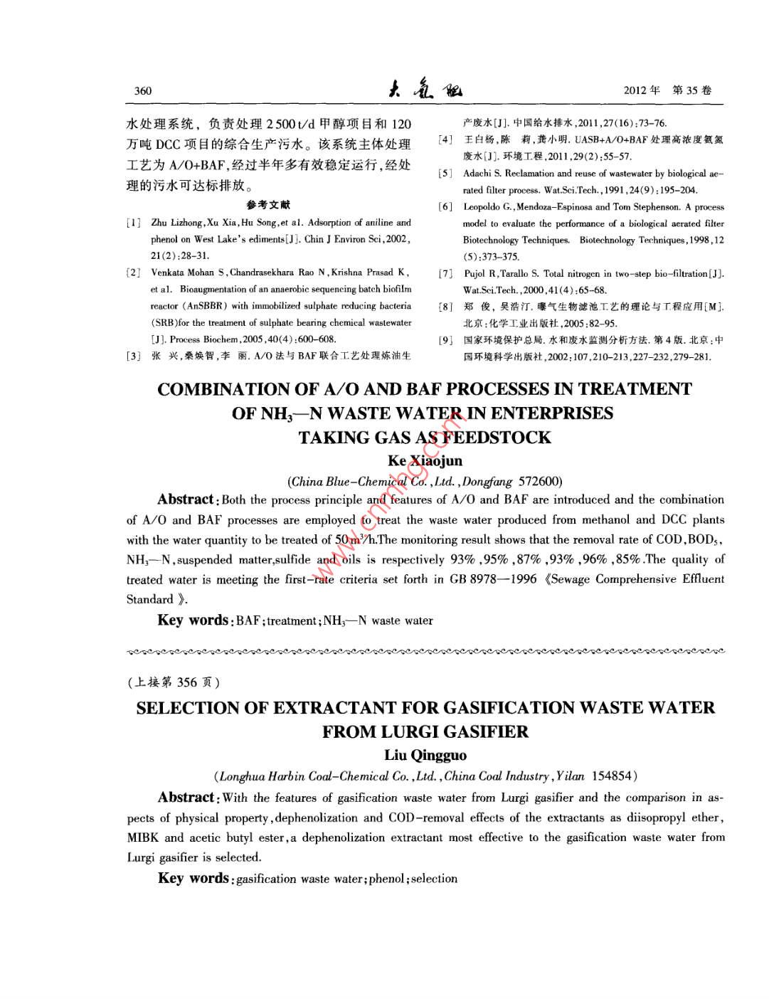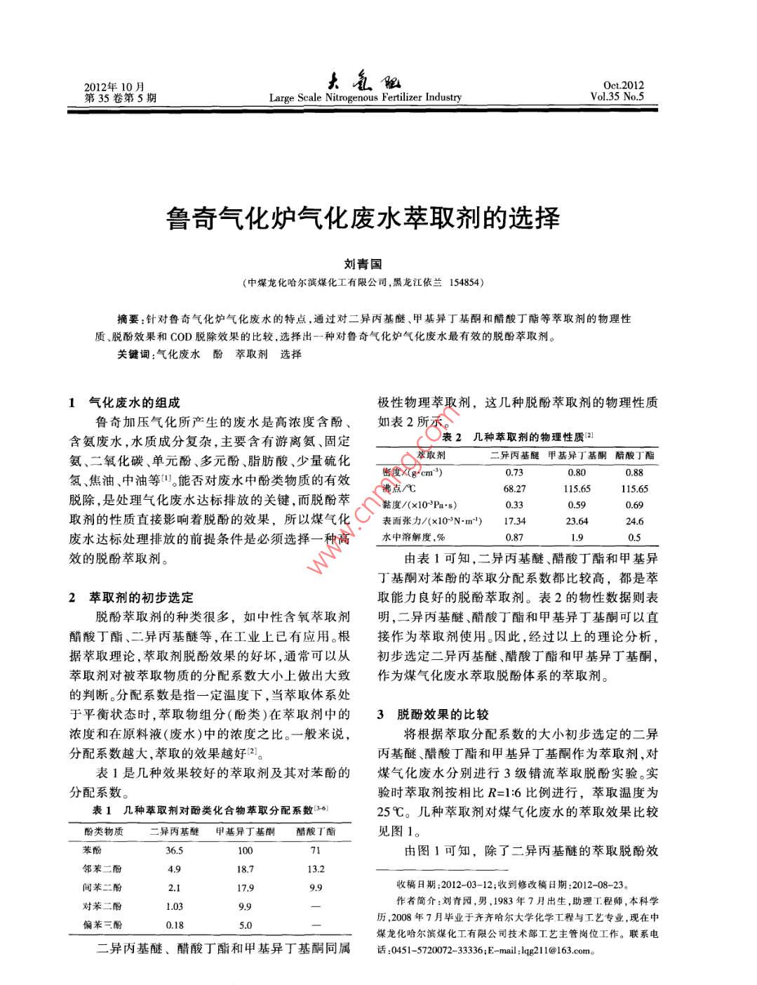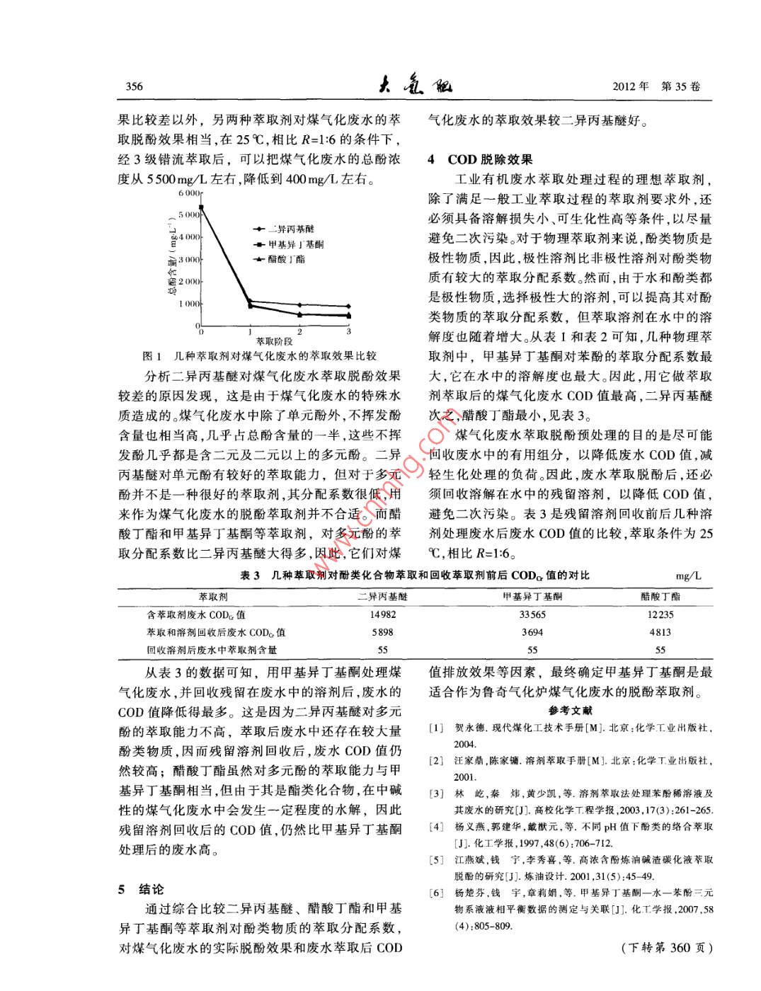 2012年10月大氨配Oct.2012第35卷第5期Large Scale Nitrogenous Fertilizer IndustryVol.35 No.5魯奇氣化爐氣化廢水萃取劑的選擇劉青國(中煤龍化哈爾濱煤化工有限公司,黑龍江依蘭154854)摘要:針對魯奇氣化爐氣化廢水的特點,通過對二異丙基醚、甲基異丁基酮和醋酸丁酯等萃取劑的物理性質(zhì)、脫酚效果和COD脫除效果的比較,選擇出一種對魯奇氣化爐氣化廢水最有效的脫酚萃取劑。關(guān)鍵詞:氣化廢水酚萃取劑選擇1氣化 廢水的組成極性物理萃取劑,這幾種脫酚萃取劑的物理性質(zhì)魯奇加壓氣化所產(chǎn)生的廢水是高濃度含酚、如表2所示。含氨廢水,水質(zhì)成分復雜,主要含有游離氨、固定表2幾種萃取劑的 物理性質(zhì)()萃取劑二異丙基醚甲基異丁基酮酷酸丁酯氨、二氧化碳、單元酚、多元酚、脂肪酸、少量硫化氫、焦油、中油等"]。能否對廢水中酚類物質(zhì)的有效密度/(g.cm*)0.730.800.88沸點/C68.27115.65脫除,是處理氣化廢水達標排放的關(guān)鍵,而脫酚萃黏度/(x10~Pa.s)0.330.590.69取劑的性質(zhì)直接影響著脫酚的效果,所以煤氣化表面張力/(x10*N.m")17.3423.6424.6廢水達標處理排放的前提條件是必須選擇--種高水中溶解度,%0.8710.5效的脫酚萃取劑。由表1可知,二異丙基醚、醋酸丁酯和甲基異丁基酮對苯酚的萃取分配系數(shù)都比較高,都是萃2萃取劑的初步選定取能力良好的脫酚萃取劑。表2的物性數(shù)據(jù)則表脫酚萃取劑的種類很多,如中性含氧萃取劑明,二異丙基醚、醋酸丁酯和甲基異丁基酮可以直醋酸丁酯、二異丙基醚等,在工業(yè)上已有應(yīng)用。根接作為萃取劑使用。因此,經(jīng)過以上的理論分析,據(jù)萃取理論,萃取劑脫酚效果的好壞,通??梢詮某醪竭x定二異丙基醚、醋酸丁酯和甲基異丁基酮,萃取劑對被萃取物質(zhì)的分配系數(shù)大小上做出大致作為煤氣化廢水萃取脫酚體系的萃取劑。的判斷。分配系數(shù)是指-一定溫度下,當萃取體系處于平衡狀態(tài)時,萃取物組分(酚類)在萃取劑中的3脫酚效果的比較濃度和在原料液(廢水)中的濃度之比。- -般來說,將根據(jù)萃取分配系數(shù)的大小初步選定的二異分配系數(shù)越大,萃取的效果越好21。丙基醚、醋酸丁酯和甲基異丁基酮作為萃取劑,對表1是幾種效果較好的莘取劑及其對苯酚的煤氣化廢水分別進行3級錯流萃取脫酚實驗。實分配系數(shù)。驗時萃取劑按相比R=1:6比例進行,萃取溫度為表1幾種萃取劑對酚類化 合物萃取分配系數(shù)(56)25 C。幾種萃取劑對煤氣化廢水的萃取效果比較酚類物質(zhì)二異丙基醚甲基異丁基酮醋酸丁酯見圖1。苯酚10071由圖1可知,除了二異丙基醚的萃取脫酚效鄰苯二酚4:18.73.2間苯二酚2.17.9>9收稿日期:2012-03- 12;收到修改稿日期:2012-08-23.作者簡介:劉青園,男,1983年7月出生,助理工程師,本科學對苯二酚1.09.歷,2008年7月畢業(yè)于齊齊哈爾大學化學工程與工藝專業(yè),現(xiàn)在中偏苯三酚0.185.煤龍化哈爾濱煤化工有限公司技術(shù)部工藝主管崗位工作。聯(lián)系電二異丙基醚、醋酸丁酯和甲基異丁基酮同屬話:0451-5720072- -3336E-mail:lqg21@163.com。3562012年第35 卷果比較差以外,另兩種萃取劑對煤氣化廢水的萃氣化廢水的萃取效果較二異丙基醚好。取脫酚效果相當,在25C,相比R=1:6的條件下,經(jīng)3級錯流萃取后,可以把煤氣化廢水的總酚濃4 COD 脫除效果度從5500mg/L左右,降低到400mg/L左右。工業(yè)有機廢水萃取處理過程的理想萃取劑,6000/除了滿足一般工業(yè)萃取過程的萃取劑要求外,還5000必須具備溶解損失小、可生化性高等條件,以盡量十二異丙基醚94000避免二次污染。對于物理萃取劑來說,酚類物質(zhì)是世甲基異J基酮士醋酸I酯極性物質(zhì),因此,極性溶劑比非極性溶劑對酚類物海200質(zhì)有較大的萃取分配系數(shù)。然而,由于水和酚類都是極性物質(zhì),選擇極性大的溶劑,可以提高其對酚1000類物質(zhì)的萃取分配系數(shù),但萃取溶劑在水中的溶萃取階段解度也隨著增大。從表1和表2可知,幾種物理萃圖1幾種萃取劑對煤氣化廢 水的萃取效果比較取劑中,甲基異丁基酮對苯酚的萃取分配系數(shù)最分析二異丙基醚對煤氣化廢水萃取脫酚效果大,它在水中的溶解度也最大。因此,用它做萃取較差的原因發(fā)現(xiàn),這是由于煤氣化廢水的特殊水劑萃取后的煤氣化廢水COD值最高,二異丙基醚質(zhì)造成的。煤氣化廢水中除了單元酚外,不揮發(fā)酚次之,醋酸丁酯最小,見表3。含量也相當高,幾乎占總酚含量的-半,這些不揮煤氣化廢水萃取脫酚預(yù)處理的目的是盡可能發(fā)酚幾乎都是含二元及二元以上的多元酚。二異回收廢水中的有用組分,以降低廢水COD值,減.丙基醚對單元酚有較好的萃取能力,但對于多元輕生化處理的負荷。因此,廢水萃取脫酚后,還必酚并不是一種很好的萃取劑,其分配系數(shù)很低,用須回收溶解在水中的殘留溶劑,以降低COD值,來作為煤氣化廢水的脫酚萃取劑并不合適。而醋避免二次污染。表3是殘留溶劑回收前后幾種溶酸丁酯和甲基異丁基酮等萃取劑,對多元酚的萃劑處理廢水后廢水COD值的比較,萃取條件為25取分配系數(shù)比二異丙基醚大得多,因此,它們對煤C,相比R=1:6。表3幾種萃取劑對酚類化合物萃取和回收萃取劑前后CODa值的對比萃取劑二異丙基醚甲基異丁基酮酷酸丁酯含萃取劑廢水COD值149823356512235萃取和溶劑回收后廢水CODo值589836944