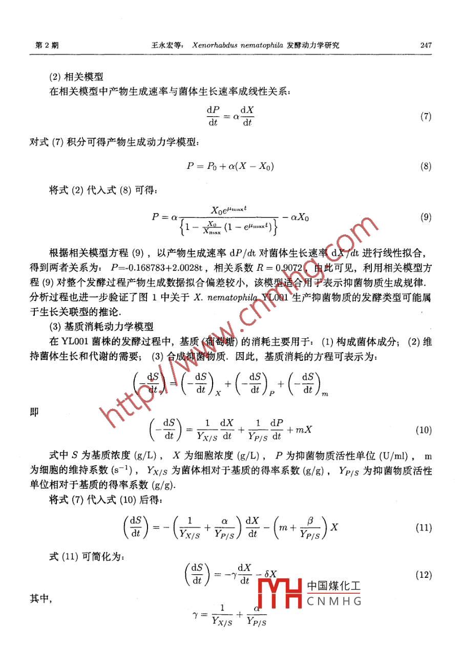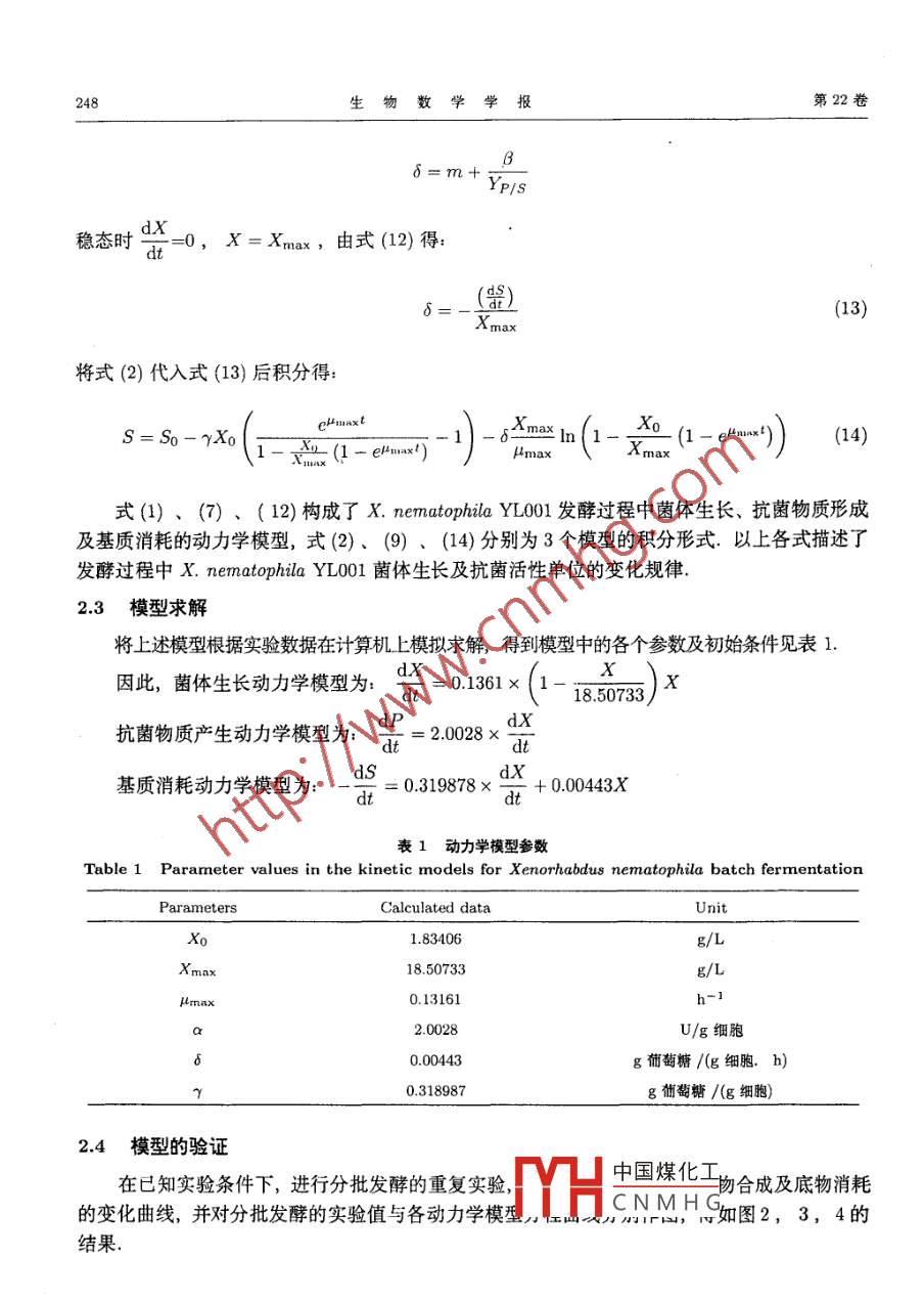 生物數(shù)學(xué)學(xué)報(bào)2007,22(2):243-250 BiomathematicsXenorhabdus nematophila發(fā)酵動(dòng)力學(xué)研究王永宏張興(西北農(nóng)林科技大學(xué)無(wú)公害農(nóng)藥研究服務(wù)中心,陜西楊陵712100)摘要:在分批發(fā)酵中,研究了 Xenorhabdus nematophila YL001的生長(zhǎng)、基質(zhì)消耗及抗菌物質(zhì)產(chǎn)生的特性,基于 Logistic方程和 Luedeking- Piret方程,得到了描述分批發(fā)酵過(guò)程的動(dòng)力學(xué)模型及模型參數(shù),同時(shí)對(duì)實(shí)驗(yàn)數(shù)據(jù)與模型進(jìn)行了驗(yàn)證比較.模型計(jì)算值與實(shí)驗(yàn)數(shù)據(jù)擬合良好,模型基本反映了 Xenorhabdus nematophila yL001分批發(fā)酵過(guò)程的動(dòng)力學(xué)特征.分批發(fā)酵中細(xì)胞生長(zhǎng)與產(chǎn)物合成屬于偶聯(lián)型關(guān)鍵詞: Xenorhabdus nematophila;發(fā)酵動(dòng)力學(xué);數(shù)學(xué)模型中圖分類號(hào):TQ92MR分類號(hào):92C40;92C45文獻(xiàn)標(biāo)識(shí)碼:A文章編號(hào):1001-9626(2007)02-0243080引言Xenorhabdus屬細(xì)菌與昆蟲(chóng)病原線蟲(chóng) Steinernema共生,屬腸桿菌科叫.線蟲(chóng)攜帶共生菌通過(guò)氣孔、肛門(mén)、節(jié)間膜等自然孔口進(jìn)入昆蟲(chóng)體內(nèi),將共生菌釋放到昆蟲(chóng)的血腔中,共生菌在其中大量繁殖,產(chǎn)生毒素和抑菌物質(zhì),使昆蟲(chóng)患敗血癥,一般在48小時(shí)內(nèi)死亡.共生菌具有多種生物學(xué)功能,在昆蟲(chóng)病原線蟲(chóng)的大規(guī)模生產(chǎn)中,共生菌不僅可直接作為線蟲(chóng)的營(yíng)養(yǎng)源,而且可分解寄主組織和培養(yǎng)介質(zhì),為線蟲(chóng)的生長(zhǎng)、繁殖提供營(yíng)養(yǎng);共生菌的次生代謝產(chǎn)物具有抑菌2,、殺蟲(chóng)國(guó)、殺線蟲(chóng)和抗腫瘤間等多種活性;在醫(yī)療衛(wèi)生和農(nóng)業(yè)領(lǐng)域具有較大的應(yīng)用前景和商業(yè)潛力微生物反應(yīng)動(dòng)力學(xué)包括細(xì)胞生長(zhǎng)動(dòng)力學(xué)、基質(zhì)消耗動(dòng)力學(xué)和代謝產(chǎn)物生成動(dòng)力學(xué).通過(guò)發(fā)酵動(dòng)力學(xué)的研究和發(fā)酵模型的建立,能更好的認(rèn)識(shí)微生物發(fā)酵過(guò)程中菌體的生長(zhǎng)和產(chǎn)物形成的機(jī)制,以及影響這些機(jī)制的一些重要環(huán)境因素,最終實(shí)現(xiàn)發(fā)酵過(guò)程的有效控制,達(dá)到提高產(chǎn)物發(fā)酵指標(biāo)的目的.本文對(duì)X. nematophila Yl001的發(fā)酵動(dòng)力學(xué)進(jìn)行了研究,并對(duì)動(dòng)力學(xué)方程進(jìn)行了模擬1材料與方法11試驗(yàn)材料(1)供試共生細(xì)菌收稿日期:200603-27中國(guó)煤化工基金項(xiàng)目:國(guó)家863項(xiàng)目“昆蟲(chóng)病原線蟲(chóng)共生菌殺蟲(chóng)、殺菌劑的CN MH GAA241140)作者筒介:王永宏(1968-),男,陜西鳳翔縣人,副教授,博士. E-mail: hwang68@126com*通訊作者生物數(shù)學(xué)學(xué)報(bào)第22卷昆蟲(chóng)病原線蟲(chóng)共生菌X. nematophila YLool從其寄主線蟲(chóng) Steinernema sp中分離鑒定獲得(2)指示菌蠟狀芽孢桿菌 Bacillus cereus由西北農(nóng)林科技大學(xué)無(wú)公害農(nóng)藥研究服務(wù)中心提供(3)培養(yǎng)基斜面及平板培養(yǎng)基:NA培養(yǎng)基,牛肉膏3.0g、蛋白胨50g、營(yíng)養(yǎng)瓊脂20g、水1000ml、pH72~74;共生菌鑒別培養(yǎng)基:NBTA培養(yǎng)基,NA+(TTC0.04g、BTB0.025g);發(fā)酵培養(yǎng)基:葡萄糖6.13g/L、蛋白胨21.29g/L、MgSO41.50g/L、(NH4)2SO4246g/L、KH2PO40.86g/L、K2HPO41.1g/L、Na2SO41.72g/L、水1000ml,pH72~74.12試驗(yàn)方法(1)共生菌的培養(yǎng)種子培養(yǎng):將種管保存的X. nematophila yl001,劃線于NA培養(yǎng)基平板上活化,28°C培養(yǎng)24~48h,從生長(zhǎng)良好的活化平板上挑取單菌落,再劃線于NBTA培養(yǎng)基平板上,28°C培養(yǎng)24~48h,觀察菌落的顏色變化,區(qū)分初生型和次生型共生菌.菌落為藍(lán)色,周?chē)囵B(yǎng)基中的染料被吸收變?yōu)辄S色的為初生型;菌落為紅色,周?chē)囵B(yǎng)基中的染料不被吸收而保持藍(lán)色的為次生型.用接種環(huán)挑取初生型菌,接種于搖瓶發(fā)酵培養(yǎng)基中,28C、180r/min振蕩培養(yǎng)16h發(fā)酵罐培養(yǎng):使用鎮(zhèn)江東方生物工程設(shè)備技術(shù)公司生產(chǎn)的GUJS-7B型L全自動(dòng)控制發(fā)酵罐進(jìn)行分批發(fā)酵.發(fā)酵罐容積江L,兩層六平直葉攪拌,三擋板.裝料系數(shù)07,接種量9%,發(fā)酵溫度26~28°C,通氣量25L/min,攪拌轉(zhuǎn)速300rpm,發(fā)酵過(guò)程中流加泡敵消泡(2)發(fā)酵過(guò)程參數(shù)檢測(cè)OD的測(cè)定:取不同時(shí)期的培養(yǎng)液,用分光光度計(jì)在600m測(cè)定發(fā)酵液OD值DCW的測(cè)定:在一定的細(xì)胞濃度范圍內(nèi),光密度與細(xì)胞濃度成正比,因而通過(guò)建立光密度與細(xì)胞干重的直線回歸方程來(lái)測(cè)定發(fā)酵過(guò)程中的細(xì)胞干重(DCW)pH測(cè)定:由pH電極在線測(cè)定發(fā)酵過(guò)程中的pHDO測(cè)定:復(fù)膜氧電極在線測(cè)定發(fā)酵過(guò)程中的溶解氧DO還原糖測(cè)定:采用3,5二硝基水楊酸法(DNS)測(cè)定培養(yǎng)過(guò)程中還原糖的變化動(dòng)態(tài)氨基氮測(cè)定:采用甲醛滴定法測(cè)定培養(yǎng)過(guò)程中氨基氮的變化動(dòng)態(tài)抑菌活性測(cè)定:用管碟法測(cè)定X. nematophila YL001的抑菌活性.將熔化的NA培養(yǎng)基冷卻至45°C~50