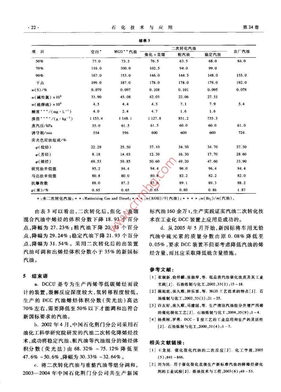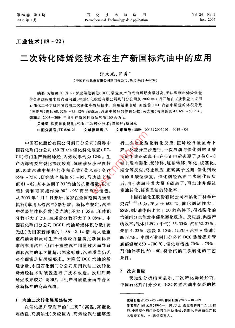 第24卷第1期石化技術(shù)與應用Vol.24 No.12006年1月Petrochemical Technulogy & A pplicationJan.2006工業(yè)技術(shù)(19 ~22 )二次轉(zhuǎn)化降烯烴技術(shù)在生產(chǎn)新國標汽油中的應用.張?zhí)?羅勇"(中國石化股份有限公司期門分公司,湖北荊門448039)摘要:為解央80萬Va深度催化裂化( DCC)裝置生產(chǎn)的汽油烯烴含最過高,無法調(diào)制出烯烴含量符合新國標要求的汽油問題,中國石化股份有限公司荊門分公司從2002年4月開始在工業(yè)裝置上應用石油化工科學研究院汽油二次轉(zhuǎn)化降烯烴技術(shù)。應用結(jié)果表明,回煉前,DCC汽油中烯烴的體積分數(shù)(熒光法)高達68.32% -75. 12% ;回煉后,汽油中烯烴的體積分數(shù)(熒光法)可降低到47.6% - 50.6%。調(diào)和后,2003--2004年共生產(chǎn)新國標商品汽油160余萬to關鍵詞:深度催化裂化;汽油;二次轉(zhuǎn)化技術(shù);降烯烴;新國標中圖分類號:TE626.21文獻標識碼:B文章編號:1009 - 0045(2006>01 - 0019 -04中國石化股份有限公司荊門分公司(簡稱中行二次催化裂化轉(zhuǎn)化反應,使烯烴含量顯著下國石化荊門分公司)80萬t/a催化裂化裝置( DC-降。反應分三步進行:一次汽油與催化劑的B酸CU)專門生產(chǎn)低碳烯烴,丙烯收率約為12%。生反應生成正碳離子;在帶正電荷碳原子β位C-C產(chǎn)內(nèi)烯需要的裂化深度較高,氫轉(zhuǎn)移反應程度較鍵上發(fā)生裂化. .氫轉(zhuǎn)移烷基轉(zhuǎn)移、環(huán)化、烷基化、低,因此汽油中烯烴的體積分數(shù)(熒光法)高達縮合等反應;終止反應,正碳離子脫附,催化劑表65% ~75%, 研究法辛烷值93 -95,馬達法辛烷面的B酸位恢復。催化劑經(jīng)汽油二次轉(zhuǎn)化反應值81 ~82,基本達到了93"汽油的抗爆指數(shù),以前后,由于表面帶著大量正碳離子,可加速并促進稍加調(diào)和可直接作為90* ~93*商品汽油銷售。重油轉(zhuǎn)化,提高重油的轉(zhuǎn)化率。從2003年1月1日開始,國家在全國范圍內(nèi)強制中國石油化工股份有限公司石油化工科學研執(zhí)行《車用無鉛汽油》新標準。新標準規(guī)定,汽油究院[一3認為,在大于600 C,催化劑活性大于中烯烴的體積分數(shù)(熒光法)不大于35% ,苯體積65% ,劑/油體積比大于50的條件下,很難裂化的分數(shù)不大于2% ,硫質(zhì)量分數(shù)不大于0. 08%。中汽油組分也能發(fā)生催化裂化反應。反應后,典型產(chǎn)國石化荊門分公司DCCU汽油烯烴體積分數(shù)(熒物收率:氣體(LPG+干氣) 35. 35% ,汽油52.27%,光法)為國家新標準的1. 86~2.14倍,與大量重柴油4.23%,焦炭8. 15%,(LPG+汽油+柴油)整汽油調(diào)和雖可生產(chǎn)出烯烴含量滿足新國標要86.87%。中國石化荊門分公司DCC裝置提升管求的車用汽油,但由于重整汽油用量過大而導致底部溫度650~700C,催化劑活性70%~75%,調(diào)和汽油的苯含量超出國家標準,汽油質(zhì)量仍無劑/油體積比50 ~60,符合汽油二次轉(zhuǎn)化的工藝法全面滿足新國標要求。為降低DCC汽油的烯條件。烴含量,中國石化荊門分公司采用汽油二次轉(zhuǎn)化降烯烴技術(shù)對裝置進行了技術(shù)改造。投用后降2改造目標烯烴效果較好,調(diào)和后可生產(chǎn)出質(zhì)量全面符合國熒光法分析結(jié)果顯示,二次轉(zhuǎn)化降烯烴前,中國石化荊門分公司DCC裝置汽油中烷烴的體家新標準的商品汽油。1汽油二次轉(zhuǎn)化降烯烴技術(shù)收稿日期:2005 - 05 -09:縫回日期:2005 -10-09在催化提升管底部的“三高"(高溫,高催化:作者簡介:張?zhí)?1966- ).男 .學士.湖北省利川市人,工程師,中國石化荊門分公司生產(chǎn)處處長,長期從事煉油生產(chǎn)技劑活性,高劑油比)反應區(qū)內(nèi),高烯烴汽油能夠進術(shù)管理工作?!?通信聯(lián)系人?!?0.石化技術(shù)與應用第24卷積分數(shù)為15.8% ~ 20.61%,烯烴體積分數(shù)為碳四液化氣區(qū)的反應行程為3.055 ~ 104.000 m,主68.32% ~ 75.12%,芳烴體積分數(shù)為5.14% ~要為汽油發(fā)生裂化反應產(chǎn)生正碳離子。汽油裂化12. 65% , 研究法辛烷值為93.6~95.8,馬達法辛區(qū)的反應行程為64(84)~104m,反應時間小于烷值為79.3-81.1,抗爆指數(shù)為86.5-88.5。雖然1 s.原料區(qū)的反應行程為104 ~ 129 m。辛烷值基本上可以達到93*高辛烷值汽油標準,3.2 催化劑但熒光法烯烴含量嚴重超標。DCC汽油中烯烴汽油二次轉(zhuǎn)化反應使用的催化劑與原料油裂和苯的體積分數(shù)分別按70%及0. 6%計,重整汽化使用的催化劑相同。高溫(700 ~730 C)、高活.油中不含烯烴,苯的體積分數(shù)按6%計,按1:1體性(75% ~78%)再生催化劑首先進人提升管的汽積比將DCC汽油與重整汽油調(diào)和,烯烴含量雖可油反應區(qū),與汽油混合并反應后溫度下降到650弋達到新國標要求,但調(diào)和汽油中苯的體積分數(shù)高左右,活性也有所下降。主催化劑牌號為DCC專達3.3% ,超出新國標2%要求。另-方面,按1:1用CIP-2,助催化劑中擇型分子篩含量較高。擇體積比生產(chǎn)DCC汽油-重整汽油調(diào)和汽油,重整型分子篩中含有稀土和磷元素,具有ZSM-5改性汽油需求量為中國石化荊門分公司重整汽油實沸石結(jié)構(gòu),孔道很小,有利于汽油組分裂解。際產(chǎn)量的250%,重整汽油供給量嚴重短缺。3.3操作條件按自然比例將二次轉(zhuǎn)化DCC汽油-重油催汽油二次轉(zhuǎn)化不改變原有操作條件,裝置的化裂化汽油一重整汽油3種組分調(diào)和,是生產(chǎn)新原料處理量、回煉比、反應再生溫度、原料預熱溫國標汽油的