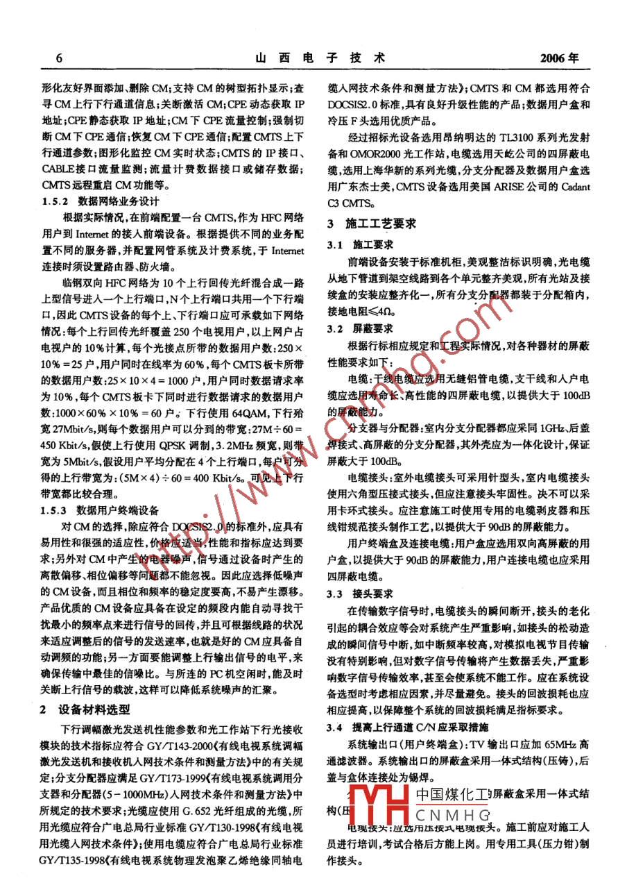 山西電子技術(shù)2006年第1期網(wǎng)絡(luò)時空雙向HFC網(wǎng)絡(luò)的改造王志剛(臨汾鋼鐵公司有線電視臺技術(shù)部,山西臨汾041000)摘要:介紹了臨鋼雙向HF℃網(wǎng)絡(luò)的改造過程中的設(shè)計思路及經(jīng)驗,光節(jié)點、光纜干線及分配網(wǎng)絡(luò)的設(shè)計思路。施工過程中應(yīng)注意的事項以及選擇器材和設(shè)備中的經(jīng)驗。關(guān)鍵詞:匯集均衡;匯集干擾;屏蔽中圖分類號:TN915.62文獻標識碼:A臨汾鋼鐵公司位于臨汾市鐵路東,有兩個生活區(qū),8000術(shù)問題。戶住戶。1996年建成550MHz有線電視系統(tǒng),現(xiàn)已不能滿從信號上行回傳方向看,網(wǎng)絡(luò)的用戶端是上行信號傳輸足有線電視用戶的需求,860MH系統(tǒng)的改造已于2004年5的起始端,信號經(jīng)不同的電纜路徑和不同的光纖路徑在機房月建設(shè)完成。現(xiàn)將改造過程中的設(shè)計思路及經(jīng)驗介紹如下:匯集到上行數(shù)據(jù)解調(diào)器。由于用戶端及電纜引入了各種干1系統(tǒng)模式及整體規(guī)劃擾并匯集成強大的干擾源,造成上行信號的CN值嚴重下降,我們稱這類干擾為“匯集干擾”。由于各用戶上行信號的11建設(shè)目標路由不同,其傳輸增益不同,造成各用戶上行信號回傳匯集將現(xiàn)有550MH網(wǎng)絡(luò)改造成860MH雙向HC寬帶網(wǎng)后呈現(xiàn)的電平值不一致,這就是上行信號的“匯集均衡”問絡(luò)并實現(xiàn)光節(jié)點后無源人戶。每個光節(jié)點覆蓋小于250題。為了解決這些問題在分配結(jié)構(gòu)方面應(yīng)遵循以下幾條原戶,傳送模擬數(shù)字電視節(jié)目、調(diào)頻廣播節(jié)目、開通數(shù)據(jù)業(yè)務(wù)、則:實現(xiàn)雙向互動電視、視頻點播、網(wǎng)上教育、互聯(lián)網(wǎng)接人等多種1)采用集中式分配結(jié)構(gòu)增強系統(tǒng)的可靠性。信息服務(wù)2)采用星型分配原則,盡可能不用傳統(tǒng)的樹枝型分配1.2頻率劃分結(jié)構(gòu),以減小上行通道的不平度。5Mz~65MH為上行業(yè)務(wù)頻段,6MHz~8MHz為過3)采用“單位增益法”(既在一段鏈路上,放大器“增益渡帶,87MH~108MH為調(diào)頻廣播節(jié)目,110MHz和電纜“衰減”應(yīng)當(dāng)相等),保證系統(tǒng)的電平一致性。750MH為模擬電視數(shù)字電視節(jié)目,750MHz~862MH用4)采用“單位功率密度法”(既每Hz平均功率法)確定于數(shù)據(jù)下行業(yè)務(wù)及未來發(fā)展上行系統(tǒng)的輸人電平。13光節(jié)點及光纜干線的設(shè)計分配網(wǎng)絡(luò)路由的設(shè)計盡量采用多級星型傳輸結(jié)構(gòu)既采以光節(jié)點后無源人戶,每個光節(jié)點覆蓋小于250戶為設(shè)用對稱性設(shè)計。因為多級星型傳輸結(jié)構(gòu)由中心到用戶的分計原則,根據(jù)臨鋼樓房結(jié)構(gòu)及分布情況按照選擇路徑最短,配過程,正是由各用戶上行逐級匯集的過程,只要保證了對組成各鏈路的原則將本光傳輸網(wǎng)絡(luò)設(shè)計成星型網(wǎng)絡(luò)每個稱性,上行、下行電平必然一致。這就解決了“匯集均衡”的光接點4芯光纖以便于網(wǎng)絡(luò)開展增值業(yè)務(wù)。光發(fā)射機采用問題。盡量減少網(wǎng)絡(luò)接頭,少使用分只、分配器件,有接頭的1310 nmDFB發(fā)射機,根據(jù)地域分布計算光鏈路的損耗,一生地方盡量集中,并加以屏蔽(如加單元集中分配箱),以減少活區(qū)選用10mw的光發(fā)射機,每個光發(fā)射機接七個光節(jié)點;網(wǎng)絡(luò)噪聲侵入點,減少匯集干擾,并便于維修、檢查。二生活區(qū)10mw的光發(fā)射機,每個光發(fā)射機接四個光節(jié)點,下各種戶型的設(shè)計都必須滿足上行電平304b±4db、下行行光收用-1dm左右接收;上行光鏈路損耗最大3b左右,電平65db±4db所有電纜均采用四屏蔽電纜,用戶終端全上向光發(fā)模塊選用-3dm,上下行光收在-6dm~-8dm部采用帶65MHz高通濾波器的雙向數(shù)據(jù)終端盒計算過程略)。每個光接點選用具有四個獨立RF輸出的15數(shù)據(jù)業(yè)務(wù)的設(shè)計光工作站鏈路指標CN≥52db,CO≥62db,CIB≥68b1.5.1對CM網(wǎng)管要求光站選擇合適位置使光站各個端口的反向輸入電平基本網(wǎng)絡(luò)設(shè)備應(yīng)提供一種機制,可以使網(wǎng)管軟件對整個CM致,以便調(diào)試及以后維護系統(tǒng)上的現(xiàn)有設(shè)備進行統(tǒng)一的監(jiān)測、管理,并對各廠家設(shè)備14分配網(wǎng)絡(luò)的設(shè)計的事中國煤化工理,邏輯和物理的拓撲以通軸電纜為傳輸媒質(zhì)的支線和分配入戶網(wǎng)中,正向傳圖形CNMHG二狀態(tài),是否支持以圖片輸已成熟反向傳輸則存在著“匯集干擾”和“匯集均衡”等技為背,點。提供如下功能圖收稿日期:2005-08-07作者王志剛男42歲工程師6山西電子技術(shù)2006年形化友好界面添加、刪除CM;支持CM的樹型拓撲顯示;查纜入網(wǎng)技術(shù)條件和測量方法》;CMTs和CM都選用符合尋CM上行下行通道信息;關(guān)斷激活OM;CPE動態(tài)獲取 IP DOCSIS.0標準,具有良好升級性能的產(chǎn)品;數(shù)據(jù)用戶盒和地址;CPE靜態(tài)獲取IP地址;CM下CPE流量控制;強制切冷壓F頭選用優(yōu)質(zhì)產(chǎn)品。斷CM下QE通信;恢復(fù)CM下CPE通信;配置CMIS上下經(jīng)過招標光設(shè)備選用昂納明達的T1L3100系列光發(fā)射行通道參數(shù);圖形化監(jiān)控CM實時狀態(tài);CMTs的P接口、備和OMOR000光工作站,