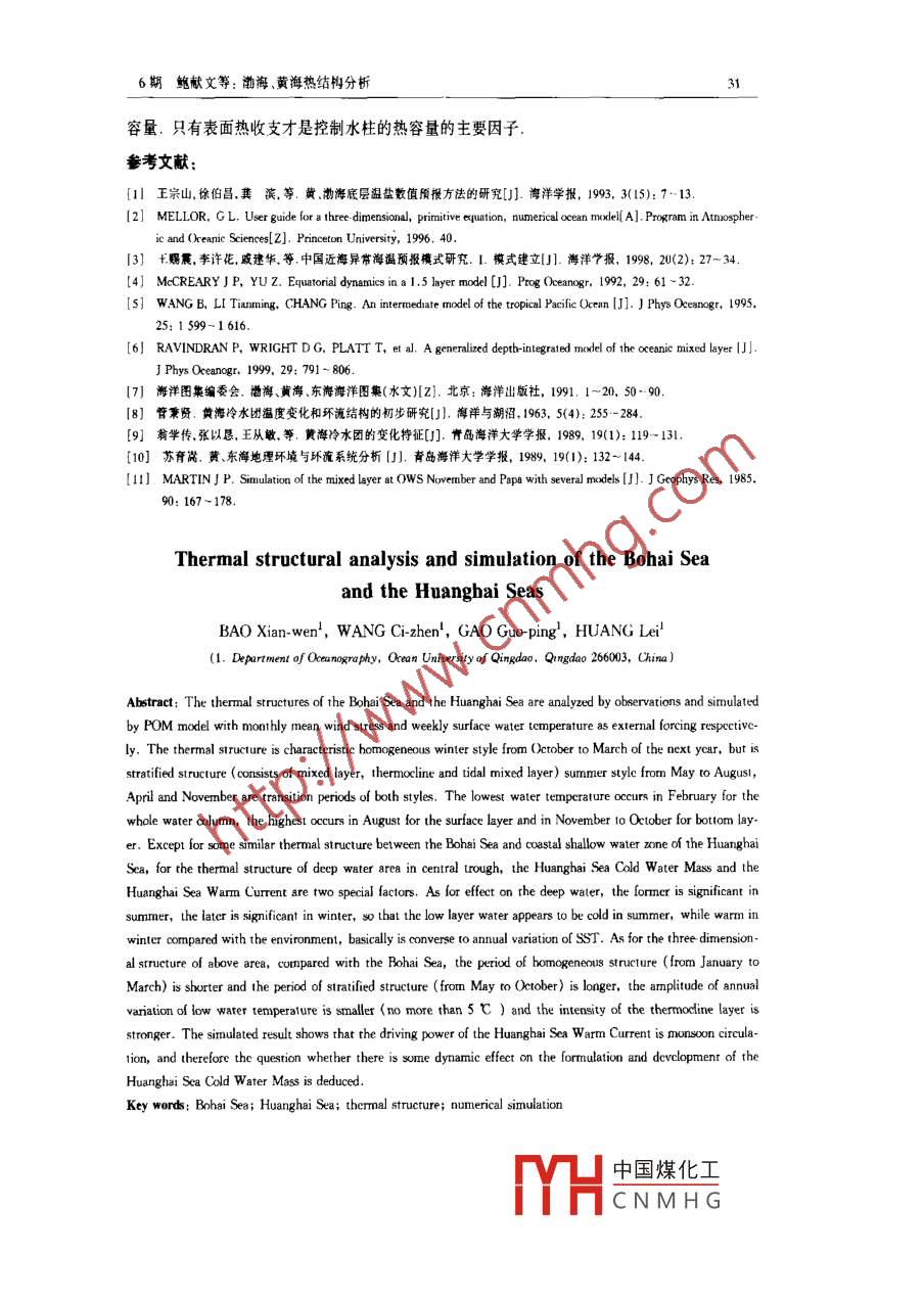 第23卷第6期海洋學報2001-l1ACTA OCEANOLOGICA SINICANovember. 2001渤海、黃海熱結構分析鮑獻文!,王賜震,高郭平1,黃磊(1.青島海洋大學海洋系,山東青島,26600擠要:在多年觀測資料基礎上,以月平均風應力和周平均海表水溫(SST)作為外強迫,對黃海、渤海熱結構迸行了數(shù)值模擬.模擬結果顯示渤海的熱結構特征自10月至翌年3月為水溫垂直均一的冬季型;5~8月為分層結構(由上混合層、躍層、潮混合層組成)的夏季型,4月和9月為兩型的過期,最低水溫出現(xiàn)在2月,最高水溫表層出現(xiàn)在8月,底層則在9~10月.黃?;钸Q淺水區(qū)與渤海有相似的熱結枃,黃海冷水團和黃海暖流對其中央槽深水區(qū)的熱結枃冇重要影響.對底層水的影響而言,前夏李顯著而后者冬季顯著,從而導致黃海(槽)的底層水與環(huán)境相比呈現(xiàn)夏季冷丙冬李瑗旳特征,底層水溫基本上與表面水溫的年變化反相;深水區(qū)的熱結枃與渤海相比,均一型牿構(1~3月)變短,分層型結構(5-11月)變長,底溫年交(5℃以內(nèi))變小,氏層度增強.模擬結果還表明,黃汋暖流的動力仍然是季鳳環(huán)流,而對黃海冷水園的形成和發(fā)展有無動力影啦提出質疑關鍵詞:謝海;黃海;熱結構;數(shù)笪模擬中圖分類號:P73111文獻標識碼:A文章編號:02534193(2001)06-0024-08l引言海洋漁業(yè)與深層海水溫度關系密切海洋水聲又對海洋躍層有著強的依賴性,因此無論從海洋開發(fā)還是從國防建設的急需考慮,中國近海三維熱結構的分析預報研究已勢在必行.王宗山等1對此課題已進行過些有益的探索,但從機理上解決問題仍路途遙遠.目前國際上廣泛應用POM模式( Princeton occan model)研究海洋三維結構已取得顯著成果l2,但用POM進行預預報仍有困難.幸好,已經(jīng)發(fā)展了較為成功的海表溫度(SST)數(shù)值預報模式3-6,我們將聯(lián)合運用POM和SST數(shù)值模式進行三維海溫預報探索研究.本文是這一總體研究計劃的第一部分,即首先從渤海、黃海入手,運用多年調(diào)查資料1與POM的模擬進行比較研究該海域三維熱結構的特征和主要影響因子,為三維預報研充打下基礎2模式POM是一個包含湍封閉的三維溫、鹽、流相耦合的原始方程數(shù)值海洋模式被廣泛應用于收稿日期:2000;修訂日期:2001-05-19基金項目:國家自然科學基金資助項目(400760):教育部科學技術重點項日(99075:000);863-818-Q-12項日作者簡介:鮑獻文(1965-),男,浙江省金華巾人教授,碩士,主要從肀海洋動力過程研究中國煤化工CNMHG6期鮑獻文等;渤海、黃海熱結構分析區(qū)域海洋動力熱力過程的模擬.本研究采用POM模擬渤海、黃海二維熱結構.模式計算海域包括整個渤海、黃海.水平網(wǎng)格問距為(1/2)×(1/2)°,垂直分21個Sgma層,鹽度采用多年平均場形式給定,初值溫度采用經(jīng)、緯度的近30年1月份平均海溫資料(青島海洋大學“七五攻關成果).流場、水位都采用零初始條件.模式僅考慮M2分潮的作用,并通過水位調(diào)和常數(shù)從開邊界引入,海表面采用月平均的海面風場以及周平均海表溫度(SST)場作為強迫場.模式經(jīng)過4a積分,第三年后輸出結果供本文分析.模擬結果得到了多種觀測資料的驗證,詳細的模式配置及驗證結果可參閱另文在討論模式結果時用到的幾個公式如下:d(a)=F(a)×h(1)La(i)=1/12×j+31.5(2)117.5,其中,F(σ=L,2,…,20)=0.00735,0.0147,0.0294,0.0588,0.1176,0.17647,0.2353,0.2941,0.353,0.4118,0.4706,0.5294,0.5882,0.6471,0.7059,0.7647,08235,0.88235,0.94118,1.0;d(a)為a層的幾何深度;h為水深(以m為單位);la(i),Lo()分別為網(wǎng)格點(i,j)的緯度和經(jīng)度以(")為單位3渤海的熱結構渤海是深嵌中國大陸的內(nèi)陸海,主要由北部的遼東灣,西部的勃海灣和南部的萊州灣組成,東部有不足100km的渤海海峽與黃海相連,渤海的平均水深不足20m,受大洋環(huán)流的影響很弱.由這…地理環(huán)境決定了渤海有其獨待的熱結構38"N,n193E在討論渤海海區(qū)的熱結構的特征之前,→摸擬值實測值我們首先對38N剖面上的3個選擇站底層水溫的模擬和觀測值進行比較,結果如圖1所示,3個站分別取之西部淺海區(qū)(h=1.0,0m),深水區(qū)(h=18.2m)和海峽口(h=18.6→模擬值m),站位的經(jīng)度值可由式(2)計算.因為觀測水溫為多年月平均,所以把原本是周平均的數(shù)值模擬資料也換算成月平均從這3個站的比較看淺水站(21,78)離oXNE差較大,在此淺水帶,受強烈的風和潮混合作用,海水的熱結構終年是垂直均勻的,所以底12層溫度的誤差直接反映了SsT的誤差,而SST是作為外強迫給定的,這一誤差主要與圖1渤海38N剖面上3站逐月底層邊界值的不準確有關.除該站之外,其余兩水溫觀測和模擬的比較個深水站模擬與觀測結果很好地一致.圖2是大連至成山頭標準斷面上SQ站位。的0m10m,25m和底層4個標準層模擬海溫的年變化圖.水溫的年變化以3月份最低,約為3t1)鮑獻文高郭平,是德星.黃微海梅溫及環(huán)流結構的模擬研究,海洋與湖沼(待刊)中國煤化工CNMHG海洋學報23卷8月份最高,其表層溫度大于24℃,底層水溫在6~8℃之間.各層溫度分布結果與管秉賢Nl給出的多年實測平均結果很好地吻合,因為模式只強迫了實測的風應力、SST及潮流,而其他層次的溫度是由POM模擬出來的,后者與獨立的觀測值相一致說明,對渤海海區(qū)熱結構的數(shù)值模擬是成功的.在不同層次上,模式結果與觀測也是一致的.正因為數(shù)值模擬的結果布滿整個區(qū)域,在正確模擬的前提下,用模擬“輸出