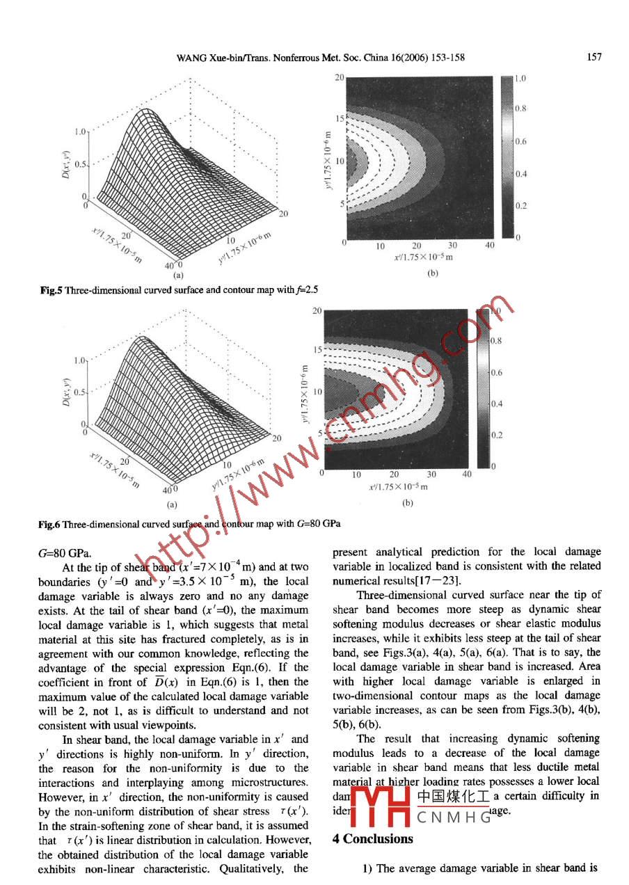 Available online at www. sciencedirect.comBCIENCETransactions ofNonferrous MetalsSociety of ChinaScienceTrans. Nonferrous Met. Soc. China 16(2006) 153 -158Presswww.csu.edu.cn/ysxb/Analysis of damage localization for ductile metalin process of shear band propagationWANG Xue-bin (王學(xué)濱)Department of Mechanics and Engineering Sciences, Liaoning Technical University, Fuxin 123000, ChinaReceived 10 March 2005; accepted 19 April 2005Abstract: Distribution of localized damage in shear band can' t be predicted thereically based on classical elastoplastic theory. Theaverage damage variable in shear band was considered to be a non-local variable. Based on non-local theory, an analytical expression forthe localized damage in strin-oftening region of shear band in the process of shear band propagation was presented using boundarycondition and symmetry of local damage variable, etc. The results show that dynamic shear softening modulus, dynamic shear strengthand shear elastic modulus influence the distribution of the localized damage in shear band. Internal length of ductile metal only govemnsthe thickness of shear band. In the strain softening region of shear band, the local damage variable along shear band's tangential andnormal directions is non-linear and highly non-uniform. The non-uniformities in the normal and tangential directions of shear band stemfrom the interactions and interplaying among microstructures and the non-uniform distibution of shear stress, respectively. At the tail ofthe strain-softening region, the maximum value of local damage variable reaches 1. This means that material at this postion fracturescompletely. At the tip of shear band and upper as well as lower boundaries, no damage occurs. Local damage variable increases asdynamic shear softening modulus decreases or shear elastic modulus increases, leading to difficulty in identification or detection ofdamage for less ductile metal matenial at higher strain rates.Keywords: shear band; ductile metal; damage localization; non-local theory; strain rate; shear stress; strain-softeningalloy and have been studied extensively[7, 11, 12].1 IntroductionWANG et al[13, 14] adopted gradient-dependentplasticity to investigate shear strain localization ofShear localization is an important and oftenductile metals, such as Ti and Ti alloy, in static[13] anddominating deformation and failure mechanism for Tidynamic loadings[14]. WANG[15] proposed a methodand Ti alloy in dynamic loadings[1- -10]. The eventualfor calculation of temperature distribution in adiabaticoutcome of localized deformation is ductile rupture andshear band in terms of the same theory. Beside shearmaterial separation. Shear localization occurs and playsstrainlocalization of ductile metal materials,an important role in engineering applications.gradient-dependent plasticity has been applied intoTo predict the distribution of plastic shear strain ininvestigation of tensile strain localization for Ti and Tishear band and the thickness of the band, somealloy[16]. .modifications and generalization from the standardSome experimental observations[1- 3, 10] showedcontinum description must be caried out. One of thethat for ductile metal materials, at the initial loadingmost promising approaches is the second order gradientstage, microcracks and induced damage appearcontinuum that incorporates the second order spatialrandomly and the distributions of deformation angradients of plastic strain in the yield function. Indamage variable are relatively uniform. With thgradient- dependent plasticity, the characteristic lengthincrease of strain at loading direction, damage and straindescribes the interactions and interplaying amongwithin the specimen progressively accumulate ormicrostructures. For Ti and Ti alloy the texture isconcentrate into a certain narrow zones and localizationheterogeneous to some extent and a certainofdaI中國(guó)煤化工. arrow zone is usuallymicrostructure will be influenced significantly by itsreferband. Afterwards, inneighborhoods. Interactions and interplaying amongthe prHC N M H Gf material, the lengthmicrostructures are of great importance for Ti and Tiof the band is increased and considerable damages andFoundatlon tem; Project(2004F052) supported by the Educational Department of Liaoning Province, Chinarresponding author: WANG Xue bin; Tel: +86 418-3351351; E-mail: wxbbb@ 263.net154WANG Xxue-bin/Trans. Nonferrous Met. Soc. China 16(2006) 153-158deformations are absorbed continuously by the bandband. At the tip of shear band, shear stress is maximumuntil ductile rupture and material separation take place.and attains the shear strength T。。The tip movesDistributions of damage and strain have hitherto beentowards the right in the process of shear bandmodeled numerically based on many kinds of modifiedpropagation. When a certain length of shear band iand generalized elastoplastic theories[17- -23]. However,reached, the shear stress at point 0 decreases to residualanalytical solution of localized damage in shear band inshear strength Tf. At the moment, strain-softeningthe process of shear band propagation has not beenzone is well formed. Afterwards, residual zone appearspresented yet so far.and its length increases. Strain-softening zone movesIn the paper, the average damage variable in sheartowards the right continually. For the sake of calculation,band was considered to be a non-local variable. Basedit is assumed that the shear deformation only occurs inon the non-local theory, an analytical expression forthe horizontal direction. The total length of shear bandlocalized damage in strain-softening region of sbearis L1+L2. The thickness of shear band is d. L is theband in the process of shear band propagation waslength of the residual zone. Lr is the length ofpresented using boundary condition and symmetry ofstrain-softening zone. In front of the tip of shear band,local damage variable, etc. Influences of relatedshear stress is lower tan the shear