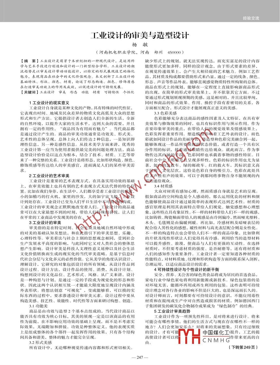 經(jīng)驗(yàn)交流工業(yè)設(shè)計(jì)的審美與造型設(shè)計(jì)楊敏(河南機(jī)電職業(yè)學(xué)院,河鄭州450000 )[摘要]工業(yè)設(shè)計(jì)是萌芽于本世紀(jì)初的一種現(xiàn)代設(shè)計(jì),是運(yùn)用科缺少形式上的規(guī)劃,就無法實(shí)現(xiàn)傳達(dá),而充實(shí)富足的設(shè)計(jì)內(nèi)容學(xué)與藝術(shù)手段進(jìn)行創(chuàng)造和設(shè)計(jì)的一門新型綜合學(xué)科。工業(yè)設(shè)計(jì)的潮能使形式更加多樣。同樣的設(shè)計(jì)觀念,由于形式要素的差異,流趨勢是以審美設(shè)計(jì)帶動(dòng)功能設(shè)計(jì),以特定的形式展現(xiàn)技藝的物化在視覺傳遞效果上,會(huì)產(chǎn)生大相徑庭的藝術(shù)魅力。例如工藝作魅力,表現(xiàn)商品在社會(huì)中的文化價(jià)值觀念。本文剖析了工業(yè)設(shè)計(jì)的.品,其材質(zhì)及構(gòu)成都要借助形式來凸顯,通過一定的線條 、顏色、基礎(chǔ)特性、形狀、顏色、材質(zhì),論述了形態(tài)構(gòu)造、顏色、修飾質(zhì)感.形態(tài)、聲音等作品外表,能夠直觀感覺物質(zhì)特性所構(gòu)架的總體。在打造審美功效.上的作用及成效,以促進(jìn)設(shè)計(jì)的可持續(xù)發(fā)展。商品在形式上的規(guī)劃,能夠在-定程度上直接影響新商品形式. [關(guān)鍵詞]工業(yè)設(shè)計(jì) 審美形態(tài)功能材質(zhì)可持續(xù)性 個(gè)性化的出現(xiàn),在簡單的形式審美效果上,并不依靠其它方面。不過要通過形式規(guī)劃展現(xiàn)預(yù)期的美感,這是相對(duì)的,并且比較單純,1工業(yè)設(shè)計(jì)的現(xiàn)實(shí)意義同時(shí)和商品的形式效果、作用、操控手段有著密切的關(guān)系,各工業(yè)設(shè)計(jì)自身就是某種文化的產(chǎn)物,具有特殊的時(shí)代性征,方面相互配合,形式設(shè)計(jì)才能展現(xiàn)真正意義的美感。它表現(xiàn)出時(shí)間、地域及民眾差異的物質(zhì)文化高低及大眾的思想3.3色彩美感形式和生產(chǎn)方法。它提倡設(shè)計(jì)者去創(chuàng)造人們?nèi)碌纳睿律誓軌虺浞直磉_(dá)商品的感性因素及人文特征,在具有審的自然環(huán)境,以提升大家的生活水平,達(dá)到大眾的需要,并且美效果與修飾效果的同時(shí),也具有標(biāo)識(shí)作用與預(yù)示作用。作為擁有一定的作用性,“商 品因?yàn)橛杏枚绪攘Α?。?dāng)代商品都首要印象審美的重點(diǎn),在帶給人們的視覺效果及情感效果上,是通過設(shè)計(jì)產(chǎn)生的。商品的審美功效通常是功效美、形式美、色彩發(fā)揮著重要作用。塑造模型影響著工藝外表的設(shè)計(jì),而色藝術(shù)性的總體呈現(xiàn),總體上向人們傳達(dá)2種信息,一是知識(shí)即彩就如同設(shè)計(jì)作品的美麗外衣,將造型和色彩完美融合到- -起,理性信息,另一.種是感性信息。從技術(shù)美學(xué)方面來講,優(yōu)秀的能夠體現(xiàn)這--作品所要展現(xiàn)的狀態(tài)價(jià)值,或者打造一-個(gè)具有區(qū).工業(yè)設(shè)計(jì)第--應(yīng)當(dāng)為使用者提供最完美的問題處理方法,商品分作用的標(biāo)識(shí),接著通過眼睛傳達(dá)給觀眾。就此而言,作為事造型設(shè)計(jì)恰恰是以這點(diǎn)為根本,結(jié)合了技術(shù)、材質(zhì)、工藝等帶物傳達(dá)其內(nèi)涵的手段,色彩同樣也承載著事物的感性特征。目來了一種完整的關(guān)系。工業(yè)設(shè)計(jì)是將形態(tài),比如形狀構(gòu)造、顏色、前社會(huì)中分工明確并且呈現(xiàn)多樣性,色彩的標(biāo)識(shí)作用也尤為顯修飾質(zhì)感等傳達(dá)給人的審美感官,進(jìn)而滿足人們的某些審美需著。如白的急救車、綠的郵政車、紅的救火車,其標(biāo)識(shí)意義高于民族、文化層次,這恰是色彩自身的吸引力,色彩在此處具.2工業(yè)設(shè)計(jì)的藝術(shù)審美有無聲勝有聲的效果,可以于剎那間將事物自身不能展現(xiàn)的內(nèi)工業(yè)設(shè)計(jì)是重要的藝術(shù)表現(xiàn)方式,在具備實(shí)用功效的基礎(chǔ)容傳遞給觀眾。上,在審美效能上也具有別的藝術(shù)表現(xiàn)方式無法代替的特色位3.4材質(zhì)感t。比如在我們身旁,在生活中,人們都享受著工業(yè)設(shè)計(jì)的成效,大眾對(duì)材質(zhì)有感知心理,然而質(zhì)感自身就是藝術(shù)的呈現(xiàn)。小的如精巧的打火機(jī),家里的沙發(fā),大的如宇宙飛船,工業(yè)設(shè)假如商品的空間構(gòu)造是令人感動(dòng)的,那么運(yùn)用優(yōu)良的材料和顏計(jì)到處存在。工業(yè)設(shè)計(jì)已變?yōu)槿藗兤饺丈钪胁豢筛钌岬臉?gòu)成,色能夠使商品設(shè)計(jì)通過最簡單的表現(xiàn)形式達(dá)到藝術(shù)性。材質(zhì)的工業(yè)設(shè)計(jì)的審美觀念正默默地改變著人們。工業(yè)設(shè)計(jì)的商品通感官原理是利用其表面特點(diǎn)帶給人們視覺、觸覺感想和心理想??梢栽诖蠹易钕氩坏降臅r(shí)刻,帶給人們特殊的喜悅,讓人們象,這些特點(diǎn)具有象征性。不- -樣的材料帶給人們不- -樣的觀感 ,在平常的工業(yè)商品中發(fā)現(xiàn)美的存在。比如鑄鐵、陶瓷釉面帶給人的觀感是由冷到偏冷,然而啞光塑料、3工業(yè)設(shè)計(jì)的審美木頭、毛毯則是由偏暖到暖。再比如,冷感材料及暗啞表層的審美指的是在特定時(shí)刻、社會(huì)大眾及地域自然環(huán)境中