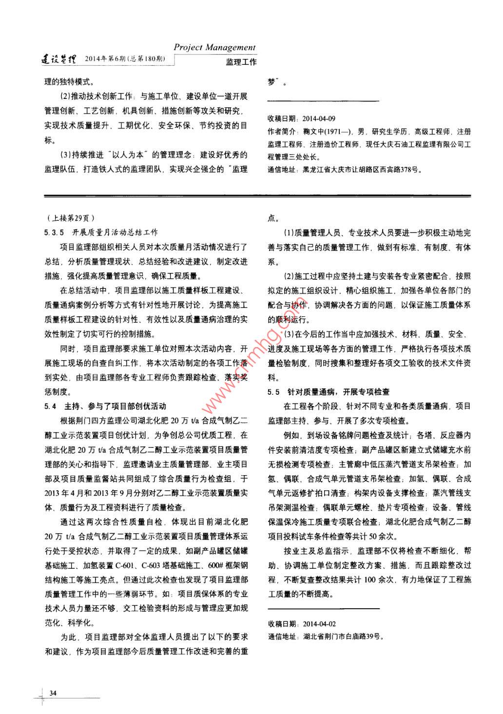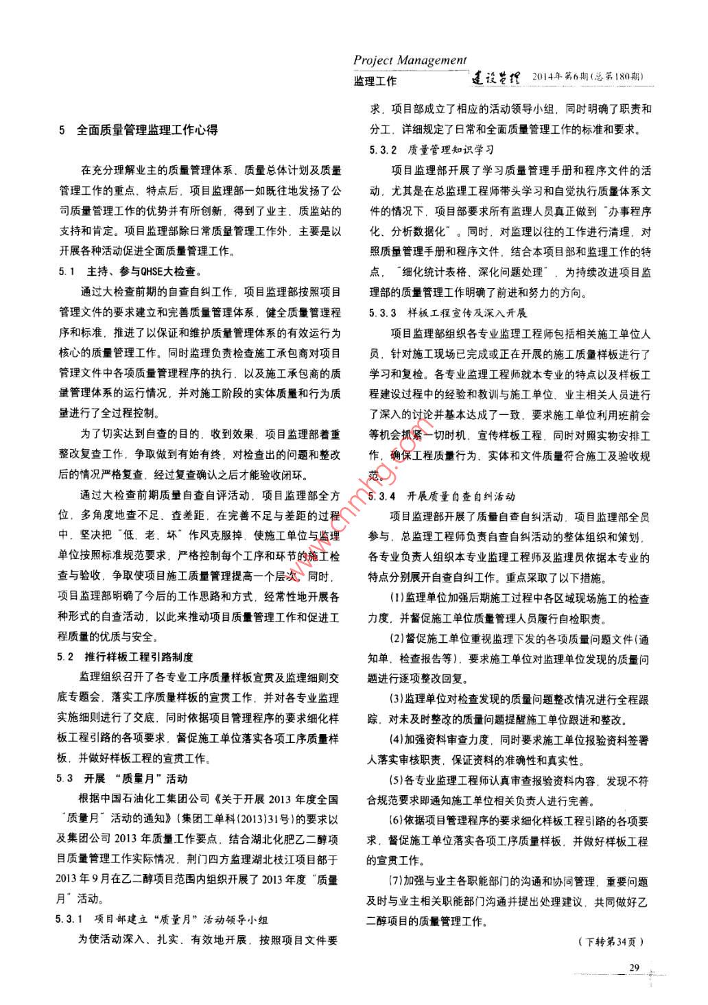 Project Management建設(shè)理2014年第6期(總第180期)監(jiān)理工作乙二醇項(xiàng)目相關(guān)專業(yè)監(jiān)理工作特點(diǎn)及實(shí)踐胡偉華,劉正元(荊門(mén)四方工程建設(shè)監(jiān)理有限責(zé)任公司,湖北荊門(mén)448000)摘要:通過(guò)荊門(mén)四方工程建設(shè)監(jiān)理有限責(zé)任公司枝江項(xiàng)目部在湖北化肥分公司20萬(wàn)t/a合成氣制乙二醇工業(yè)示范裝置建設(shè)中的監(jiān)理過(guò)程,總結(jié)了此示范裝置中監(jiān)理工作的特點(diǎn)和經(jīng)驗(yàn)關(guān)鍵詞:監(jiān)理;質(zhì)量管理;乙二醇工業(yè)示范裝置中圖分類號(hào):TU712文獻(xiàn)標(biāo)識(shí)碼:B文章編號(hào):1007-4104(20106-0026-040引言為8m,樁頂標(biāo)高為-7m~-1.5m等。由于石油化工裝置對(duì)設(shè)備基礎(chǔ)沉降差要求較嚴(yán)格,為防止基礎(chǔ)發(fā)生不均勻沉降造中國(guó)石油化工股份有限公司湖北化肥分公司20萬(wàn)ta合成管道之間.管道與設(shè)備之間拉裂而發(fā)生嚴(yán)重的安全事故,成氣制乙二醇工業(yè)示范裝置由中國(guó)石化上海工程公司等設(shè)項(xiàng)目監(jiān)理部土建專業(yè)組首先針對(duì)現(xiàn)場(chǎng)的實(shí)際情況,對(duì)施工單計(jì),中國(guó)石化第十建設(shè)有限責(zé)任公司總承包,荊門(mén)四方工程位編制的專項(xiàng)施工方案,對(duì)照設(shè)計(jì)圖紙和規(guī)范、勘察資料進(jìn)建設(shè)監(jiān)理有限責(zé)任公司監(jiān)理,投資概算約20億元,于2012行審查、提出相應(yīng)建議:督促施工單位組織施工試驗(yàn)段以驗(yàn)?zāi)?月30日開(kāi)工建設(shè),2013年11月28日完工。證方案的可行性,進(jìn)行優(yōu)化合格后才允許大面積展開(kāi)施工荊門(mén)四方工程建設(shè)監(jiān)理有限責(zé)任公司枝江項(xiàng)目部自2012同時(shí)加強(qiáng)對(duì)進(jìn)場(chǎng)材料、機(jī)具的檢查驗(yàn)收合格后才能用于施年8月正式成立以來(lái),負(fù)責(zé)湖北化肥分公司20萬(wàn)ta合成氣工。其次施工過(guò)程中監(jiān)理對(duì)每道工序嚴(yán)格把關(guān),驗(yàn)收合格后制乙二醇工業(yè)示范裝置的施工、竣工驗(yàn)收及質(zhì)保期各階段的方可進(jìn)入下道工序。通過(guò)監(jiān)理與施工單位的共同努力循環(huán)工程建設(shè)監(jiān)理工作。2013年12月乙二醇工業(yè)示范裝置共13水場(chǎng)涼水塔、合成氣壓縮機(jī)廠房、加氫反應(yīng)器、偶聯(lián)反應(yīng)器個(gè)單元全部中交,在此期間項(xiàng)目監(jiān)理部在質(zhì)量監(jiān)督站業(yè)主的最終沉降值為2cm,滿足設(shè)計(jì)和規(guī)范要求,現(xiàn)場(chǎng)設(shè)備安裝及監(jiān)理公司等有關(guān)領(lǐng)導(dǎo)的幫助下,獲得了一些經(jīng)驗(yàn)并由此在和配管達(dá)到合格標(biāo)準(zhǔn)監(jiān)理工作尤其是質(zhì)量管理方面取得了較明顯的成績(jī)和進(jìn)步。由于石油化工裝置設(shè)備種類多、體型大,平面形狀多種多樣,需預(yù)留、預(yù)埋的螺栓及埋件數(shù)量較大,在本項(xiàng)目中使1土建專業(yè)監(jiān)理工作特點(diǎn)用的此類螺栓有7000多套,最小直徑為A16.最大為A64精度要求偏差不大于2mm,對(duì)施工,監(jiān)理單位的質(zhì)量控制湖北化肥乙二醇項(xiàng)目由合成氣分離裝置、偶聯(lián)裝置、加工作提出了很高的要求。為保證螺栓及預(yù)埋件的預(yù)埋精度符氫裝置、稀硝酸裝置、管廊工程、循環(huán)水場(chǎng)、消防事故池、合要求,項(xiàng)目監(jiān)理部土建組結(jié)合圖紙、規(guī)范和實(shí)踐經(jīng)驗(yàn)建配電室及儀表間罐區(qū)等組成,占地約30余畝議業(yè)主要求設(shè)備生產(chǎn)廠家提供了配套的定位盤(pán)。定位盤(pán)進(jìn)場(chǎng)各類構(gòu)筑物(建筑物)的基礎(chǔ)依據(jù)地質(zhì)勘探資料和設(shè)計(jì)荷后,監(jiān)理與施工單位首先對(duì)定位盤(pán)對(duì)照?qǐng)D紙進(jìn)行了檢查.合載采用天然地基換填級(jí)配砂石)沖擊成孔、灌注樁基礎(chǔ)格后才同意施工單位使用。在定位盤(pán)安裝過(guò)程中監(jiān)理隨時(shí)跟組成。級(jí)配砂石換填地基厚度達(dá)到3.5m灌注孔的有效樁長(zhǎng)蹤檢查定位盤(pán)安裝的方位表面平整度以及定位盤(pán)支撐體系26 Project Management監(jiān)理工作設(shè)理2014年第6期(總第180期)是否牢固。經(jīng)各方檢查合格后,由施工單位組織專人固定安清潔度要求標(biāo)準(zhǔn)高,壓縮機(jī)和大型機(jī)泵較多,特別是PSA裝裝螺栓:在設(shè)備安裝過(guò)程中監(jiān)理隨時(shí)檢查螺栓的規(guī)格、品置共有26臺(tái)大型機(jī)泵,所以監(jiān)理和業(yè)主對(duì)其入口管線施工過(guò)種直徑、長(zhǎng)度、安裝標(biāo)高及定位盤(pán)的質(zhì)量:在隱蔽驗(yàn)收合程中的清潔度進(jìn)行專項(xiàng)檢查,逐條管線進(jìn)行簽字確認(rèn),確保格后進(jìn)行混凝土澆筑的過(guò)程中隨時(shí)檢查定位盤(pán)的中心線及螺萬(wàn)無(wú)一失栓標(biāo)高及時(shí)糾正至穩(wěn)定。經(jīng)過(guò)施工單位與監(jiān)理單位的密切2.4附件較多,安裝精度要求較高配合,施工完后對(duì)螺栓及埋件位置、標(biāo)高、平面尺寸、對(duì)角彈簧支吊架、旋轉(zhuǎn)補(bǔ)償器等涉及管道安全使用的管道線、垂直度等質(zhì)量控制指標(biāo)進(jìn)行了專項(xiàng)檢查合格
