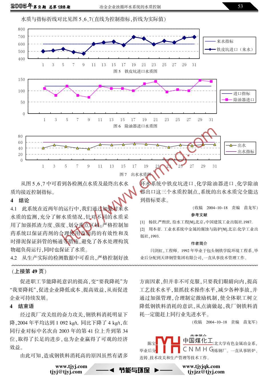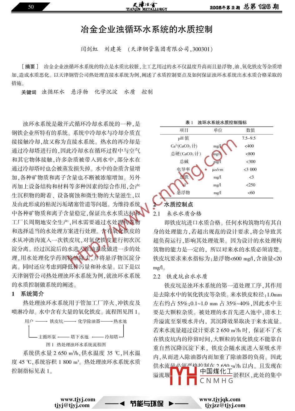 天津冶金50TIANIN METAIJURGY2003年第2期總第126期冶金企業(yè)濁循環(huán)水系統(tǒng)的水質(zhì)控制閆劍虹劉建英(天津鋼管 集團(tuán)有限公司,300301)[摘要]冶金企業(yè)濁循環(huán)水系統(tǒng)的特點(diǎn)是水質(zhì)比較臟,主工藝用過的水不僅溫度升高而且懸浮物、油、氧化鐵皮等雜質(zhì)增加,造成水質(zhì)惡化。以天津鋼管公司熱處理直接水系統(tǒng)為例,闡述了水質(zhì)控制要點(diǎn)及如何保證濁環(huán)水系統(tǒng)出水水質(zhì)合格采取的措施。關(guān)鍵詞濁循環(huán)水懸浮物化學(xué)沉淀 水質(zhì)控制濁環(huán)水系統(tǒng)是敞開式循環(huán)冷卻水系統(tǒng)的一-種,是表1濁環(huán)水系統(tǒng)水質(zhì)控 制指標(biāo)項(xiàng)目單位數(shù)值鋼鐵企業(yè)所特有的系統(tǒng)。系統(tǒng)中冷卻水與冷卻介質(zhì)直pH值7.5- -9.5接接觸冷卻,故又稱為直接水系統(tǒng)。熱水的再冷卻是Ca^(CaCO,計(jì))mg/I<400通過冷卻塔進(jìn)行的,因此冷卻水在循環(huán)過程中與空氣總硬(CaCO,計(jì))ng/l<800和其它物體接觸,許多雜質(zhì)被帶人到水中,部分水在總堿mg/<300通過冷卻塔時(shí)也會被蒸發(fā)損失掉。水中的雜質(zhì)含量增電導(dǎo)率μus/em<3 000加,各種礦物質(zhì)和離子含量也不斷被濃縮增加。另外總鐵mg/l3再加上設(shè)備結(jié)構(gòu)和材料等多種因素的綜合作用,會產(chǎn)<250懸浮物<60生沉積物的附著、設(shè)備腐蝕和微生物的大量滋生,以及由此形成的粘泥污垢堵塞管道等問題。為維持系統(tǒng)2水 質(zhì)控制點(diǎn)中各種礦物質(zhì)和離子含量穩(wěn)定,保證出水水質(zhì)達(dá)標(biāo)和2.1 來水水質(zhì)合格工廠長周期地安全生產(chǎn),回水需要通過水處理構(gòu)筑物即鐵皮坑進(jìn)口水質(zhì)合格。任何水構(gòu)筑物均有其自和選擇適當(dāng)?shù)乃幚矸桨高M(jìn)行處理。含有氧化鐵皮的身的處理能力,若超出規(guī)范的設(shè)計(jì)要求,將會導(dǎo)致其水從沖渣溝流人一次鐵皮坑,對氧化鐵皮進(jìn)行初次沉超負(fù)荷運(yùn)行,影響其處理效果。因?yàn)樵O(shè)計(jì)的水處理構(gòu)淀分離。經(jīng)過沉淀后的水進(jìn)人除油系統(tǒng)做進(jìn)一- 步的處筑物的能力是- -定的,所以對來水的水質(zhì)必須清楚。理,用水處理化學(xué)藥劑將油除去,并將懸浮物沉淀分鐵皮坑要求來水指標(biāo)為:懸浮物<600mg/,含油量<20離。同時(shí)還應(yīng)考慮到降低排污量和補(bǔ)水量。以下是以mg/l。天津鋼管公司熱處理濁環(huán)水系統(tǒng)為例,就濁環(huán)水系統(tǒng)2.2鐵皮坑出水水質(zhì)的水質(zhì)控制做系統(tǒng)的闡述。鐵皮坑是濁環(huán)水系統(tǒng)的第一道處理工序,其作用1系統(tǒng)簡介是去除水中的氧化鐵皮等雜質(zhì)。來水鐵皮粒徑: 1.0mm熱處理濁環(huán)水系統(tǒng)用于管加工廠淬火、沖鐵皮及左右約占55% ;0.1~1.0 mm占35%~40% ,因此水中主噴淋冷卻。水中含有大量的氧化鐵皮。流程圖見圖1。要是大顆粒雜質(zhì)。被處理的水首先進(jìn)人池中,清水上用戶鐵皮坑化學(xué)除油器一一熱水池升溢流至泵吸水井內(nèi),其沉降效果取決于來水流量。若來水流量超過設(shè)計(jì)要求2 650 m/h時(shí),保證不了水-主循環(huán)泵. 塔下水池冷卻塔-在鐵皮坑內(nèi)的停留時(shí)間,大顆粒的氧化鐵皮不能靠自圖1熱處理濁環(huán)水系統(tǒng)流程圖系統(tǒng)供水量2650m/h,供水溫度35C,回水溫重自然沉降沉淀下來,鐵皮會隨水流進(jìn)人泵吸水井度45 C,系統(tǒng)容積1 800 m'。熱處理濁環(huán)水系統(tǒng)水質(zhì)內(nèi),從而進(jìn)人除油器內(nèi)而加重了除油器的負(fù)荷。因此供水流量必循平格控制車? 650 _mn/h以內(nèi)。且發(fā)現(xiàn)在控制指標(biāo)見表1。溢流堰中國煤化工:淤積區(qū),此處的集中YHCNM HGwww.tjyj.com一-<節(jié)能與環(huán)保?-一www.tjyjqk.comtjyj@tjyj.comtjyjzz@tjyj.com2005年第2期總第120期冶金企業(yè)濁循環(huán)水系統(tǒng)的水質(zhì)控制5抓渣事實(shí)證明效果明顯。系統(tǒng)中重碳酸鹽隨蒸發(fā)、濃縮而增加,當(dāng)其濃度達(dá)到在其正常運(yùn)行后,出水水質(zhì):懸浮物<120 mg/,含飽和狀態(tài)時(shí),會發(fā)生下列反應(yīng):.油量<20 mg/l。Ca( HCO3)>=CaCO3↓+CO2↑+H202.3化學(xué)除油 器出水水質(zhì)冷卻水經(jīng)過冷卻塔向下噴林時(shí),溶解在水中的游除油器實(shí)際上是投加除油水處理藥劑的斜管沉離CO2要逸出,這就促使上述反應(yīng)向右進(jìn)行。因此我淀池。它是由平流沉淀池發(fā)展而來的,在沉降區(qū)域設(shè)們投加阻垢分散劑,主要作用是防止管道中有碳酸鈣置許多密集的斜管,使水中的懸浮雜質(zhì)在斜管中進(jìn)行沉淀析出,而在管道上造成結(jié)垢。同時(shí)它也是控制污沉淀。水沿斜管上升流動,分離出的泥渣在重力的作垢的好方法,因?yàn)樗軐⒄澈显谝黄鸬哪鄨F(tuán)雜質(zhì)等分用下沿斜管向下滑至池底,再集中排出。其特點(diǎn)是增散成顆粒使之懸浮于水中,隨水流動而不沉積在傳熱大了沉淀面積,提高了去除率,故也增大了水處理量。表面,從而減少污垢對傳熱的影響,同時(shí)部分懸浮物水利條件改變主要是斜管的直徑、斜板的間距在足夠還可隨排污水排出水系統(tǒng)。其控制量為20 mg/l。殺菌小時(shí),水流處于層流狀態(tài)。此時(shí)顆粒的沉降不受水流劑,采用TS- -809B