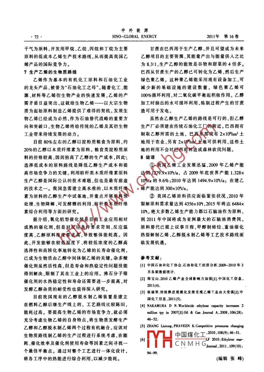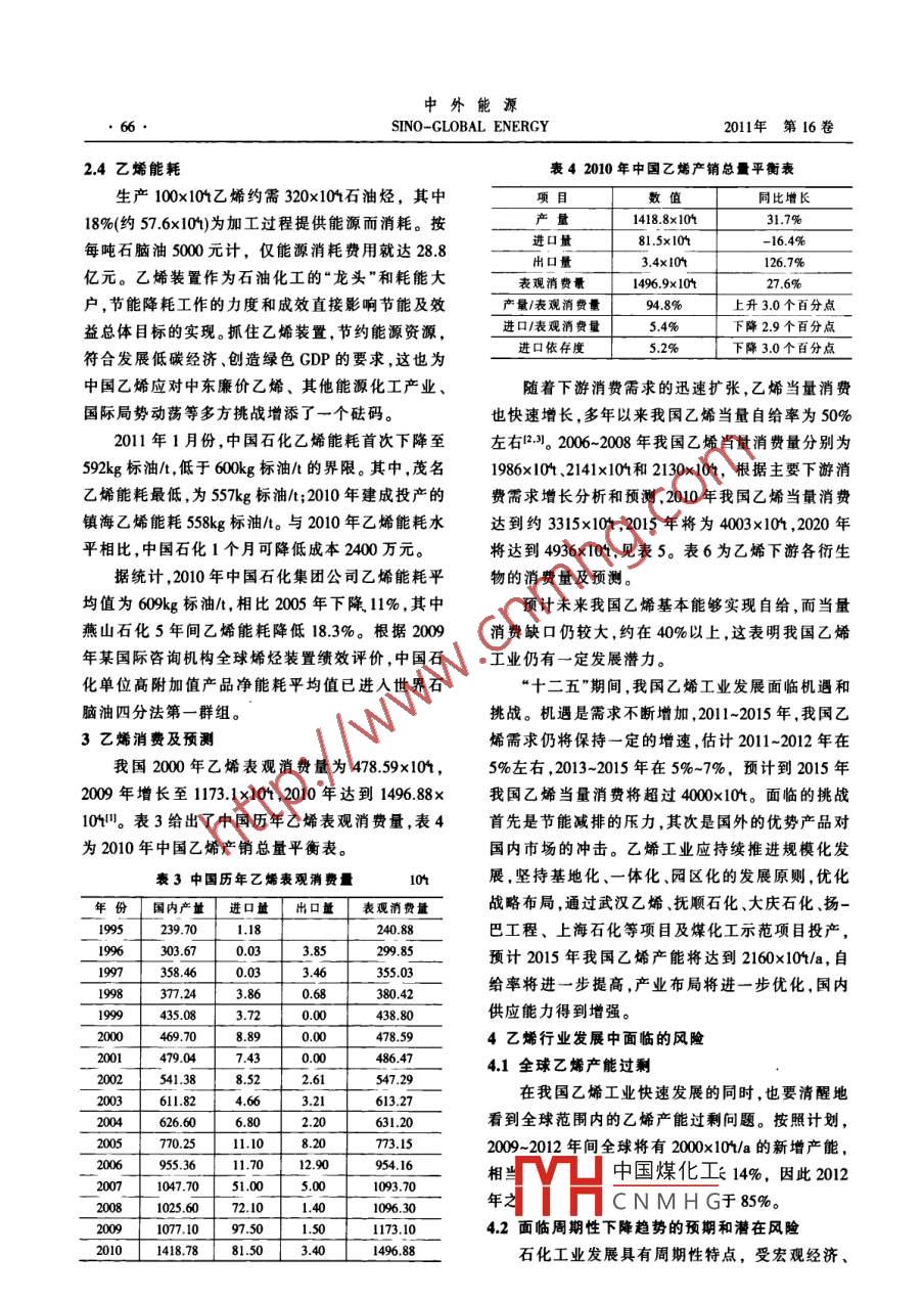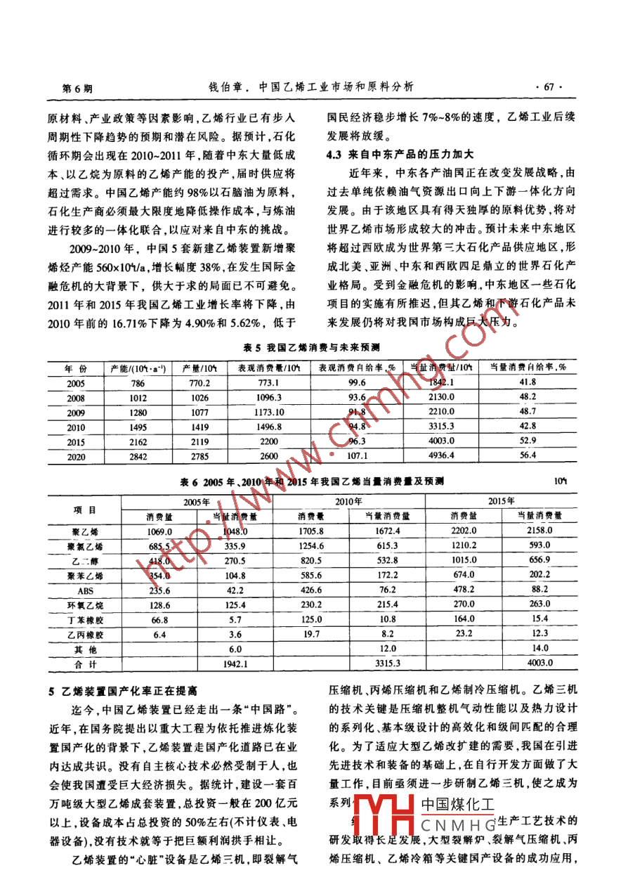 中外能源第16卷第6期●62.SINO-GL0BAL ENERGY2011年6月《煉油與化工技術(shù)>中國乙烯工業(yè)市場(chǎng)和原料分析錢伯章(上海擎督信息科技公司金秋能源石化T.作室,上海200127)摘要近年來我國乙烯T.業(yè)發(fā)展迅猛,2010年乙烯產(chǎn)能達(dá)到1494.9x10t/a,巳投產(chǎn)的27套乙嬌裝置平均規(guī)模達(dá)到55.37x10t/a;在建乙烯產(chǎn)能達(dá)到300x10%/a ;2010年乙烯產(chǎn)量為1418.78x104. 節(jié)能降耗.T.作也取得成效.2011年1月中國石化乙烯能耗首次降至592kg標(biāo)油/1,與2010年乙烯能耗水平相比,1個(gè)月可降低成本2400萬元。2010年我國乙烯表觀消費(fèi)址達(dá)到1496.88x101,乙烯當(dāng)量消費(fèi)也快速增長(zhǎng),2010年達(dá)到約3315x10*.預(yù)計(jì)2015年將達(dá)到4003x10+.乙烯當(dāng)量消費(fèi)缺口較大,表明我國乙烯T.業(yè)仍有一定發(fā)展?jié)摿?。與此同時(shí),乙烯裝暨國產(chǎn)化率正在提高,乙烯三機(jī)等關(guān)鍵設(shè)備“十一五"期間陸續(xù)實(shí)現(xiàn)國產(chǎn)化,目前乙烯裝置國產(chǎn)化率已達(dá)到75%左右。但與國際先進(jìn)水平相比.還存在較大技術(shù)差距,裝備的可靠性和穩(wěn)定性還有待進(jìn)-步提高。在快速發(fā)展的同時(shí),也要清醒地看到我國乙烯行業(yè)發(fā)展正面臨全球乙烯產(chǎn)能過剩、存在步人周期性下降趨勢(shì)的預(yù)期和潛在風(fēng)險(xiǎn)、中東石化產(chǎn)品對(duì)我國市場(chǎng)構(gòu)成巨大壓力等。我國大部分乙烯產(chǎn)能都以石腦油為原料.正面臨原料資源供應(yīng)日趨緊張的問題,預(yù)計(jì)2011年中國將成為亞洲最大的石腦油消費(fèi)國。對(duì)此,應(yīng)密切關(guān)注以煤作為替代原料采用MTO技術(shù)的T.業(yè)化進(jìn)程,同時(shí)要加快開發(fā)新的乙烯生產(chǎn)技術(shù)路線,盡可能以天然氣、干氣為原料,開發(fā)用甲烷,乙烷、丙烷和丁烷為主要原料的低成本乙烯生產(chǎn)技術(shù)路.線。甲醇制烯烴.重油催化熱裂解制乙烯.生物質(zhì)乙醇脫水制乙烯等將面臨發(fā)展機(jī)遇。.關(guān)鍵詞乙烯產(chǎn)能能耗當(dāng)量消費(fèi)國產(chǎn)化原料生物質(zhì)1前言產(chǎn)能785.9x10*/a , 2009年為1279.9x10%/a ,2010年乙烯主要用于生產(chǎn)聚乙烯(高密度聚乙烯、低達(dá)到1494.9x10%/a, 已投產(chǎn)的27套乙烯裝置平均密度聚乙烯、線性低密度聚乙烯)、環(huán)氧乙烷、二氯規(guī)模達(dá)到55.37x104/a,見表1。乙烷/氯乙烯單體和乙苯。截至2011年1月底,高2.1.1 2009 年新建和擴(kuò)能乙烯項(xiàng)目密度聚乙烯為乙烯最大消費(fèi)領(lǐng)域,約占乙烯需求的福建聯(lián)合石油化工公司80x104/a、 上海賽科石1/3,其次是線性低密度聚乙烯和低密度聚乙烯。另油化工有限公司擴(kuò)能29xl0t/a.沈陽石蠟化工有限外,環(huán)氧乙烷消費(fèi)約占全球乙烯需求的11%,二氯公司催化熱裂解制乙烯50x104/a(乙烯15x10/a).乙烷和乙苯次之,其他占7%。德國咨詢公司塞日獨(dú)山子石化公司100x10/a、遼寧華錦化工集團(tuán)公薩拿(Ceresana)的研究報(bào)告稱,到2017年需求增幅司擴(kuò)能45x10/a--新建3套、擴(kuò)能2套,使產(chǎn) 能最大的將是環(huán)氧乙烷,線性低密度聚乙烯和高密度達(dá)到1279.9x10%/ao 2009年我國共有23家乙烯生聚乙烯預(yù)計(jì)將以年均3.5%~4.5%的速度增長(zhǎng)。產(chǎn)企業(yè),25套裝置,裝置平均規(guī)模50.80x10%/a。其經(jīng)過數(shù)十年的發(fā)展,特別是在“十一五”期間,中單套規(guī)模達(dá)到80x104/a以上的有3套,產(chǎn)能合我國乙烯工業(yè)取得了舉世矚目的進(jìn)步,同期世界新計(jì)319x10Y/a;單套規(guī)模在60x10*~80x10t/a的有建的乙烯裝置大多集中在中國。隨著一系列乙烯裝11套,產(chǎn)能合計(jì)772x10%/a;其余11 套為60x10%/a置的建成投產(chǎn),到2010年底我國乙烯總產(chǎn)能達(dá)到1494.9x104/a,成為全球僅次于美國(2755.4x 10t/a)的第二大乙烯生產(chǎn)國。中國煤化工作-98年畢業(yè)于華東理工2中國乙烯產(chǎn)能和產(chǎn)量大MHCNMH G東高橋分公司,現(xiàn)主要2.1產(chǎn)能從事石油化工技術(shù)和經(jīng)濟(jì)信息調(diào)研工作。近年來,我國乙烯工業(yè)發(fā)展迅猛,2005年乙烯E-mail:be cqian@163.com第6期錢伯章,中國乙烯工業(yè)市場(chǎng)和原料分析●63以下的中小乙烯,產(chǎn)能合計(jì)189.9x10t/ao油為原料富產(chǎn)乙烯和丙烯,這是該技術(shù)首次工業(yè)化上海賽科乙烯裝置擴(kuò)能項(xiàng)目于2009年7月15應(yīng)用。由于操作條件緩和、設(shè)備材料要求低、投資相日完成,裝置產(chǎn)能從90x10%/a成功擴(kuò)大至119x對(duì)較小以及主要原料常壓渣油價(jià)格較低,與國內(nèi)現(xiàn)10t/a,成為目前國內(nèi)單線產(chǎn)能最大的乙烯裝置。有的乙烯裝置相比,CPP項(xiàng)目生產(chǎn)的乙烯成本可降2009年8月26日,福建聯(lián)合石油化工有限公低20%。司煉油乙烯項(xiàng)目化工裝置相繼投產(chǎn),煉油能力從我國西部大開發(fā)標(biāo)志性工程.國內(nèi)最大的煉化400x104/a增至1200x104/a,同時(shí)還新建一套80x一體化工程-一獨(dú)山 子石化千萬噸煉油百萬噸乙10%/a乙烯裂解裝置。烯工程于2009年9月21日建成投產(chǎn),該工程包括2009年8月28日,國家乙烯工業(yè)新原料來源100x10%/a乙烯。示范項(xiàng)目一沈陽石蠟化工有限公司50x10%/a催遼寧華錦化工集團(tuán)公司500x10%/a油化工程化熱裂解(CPP