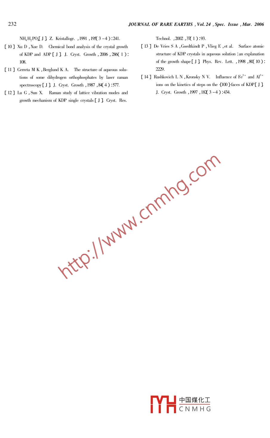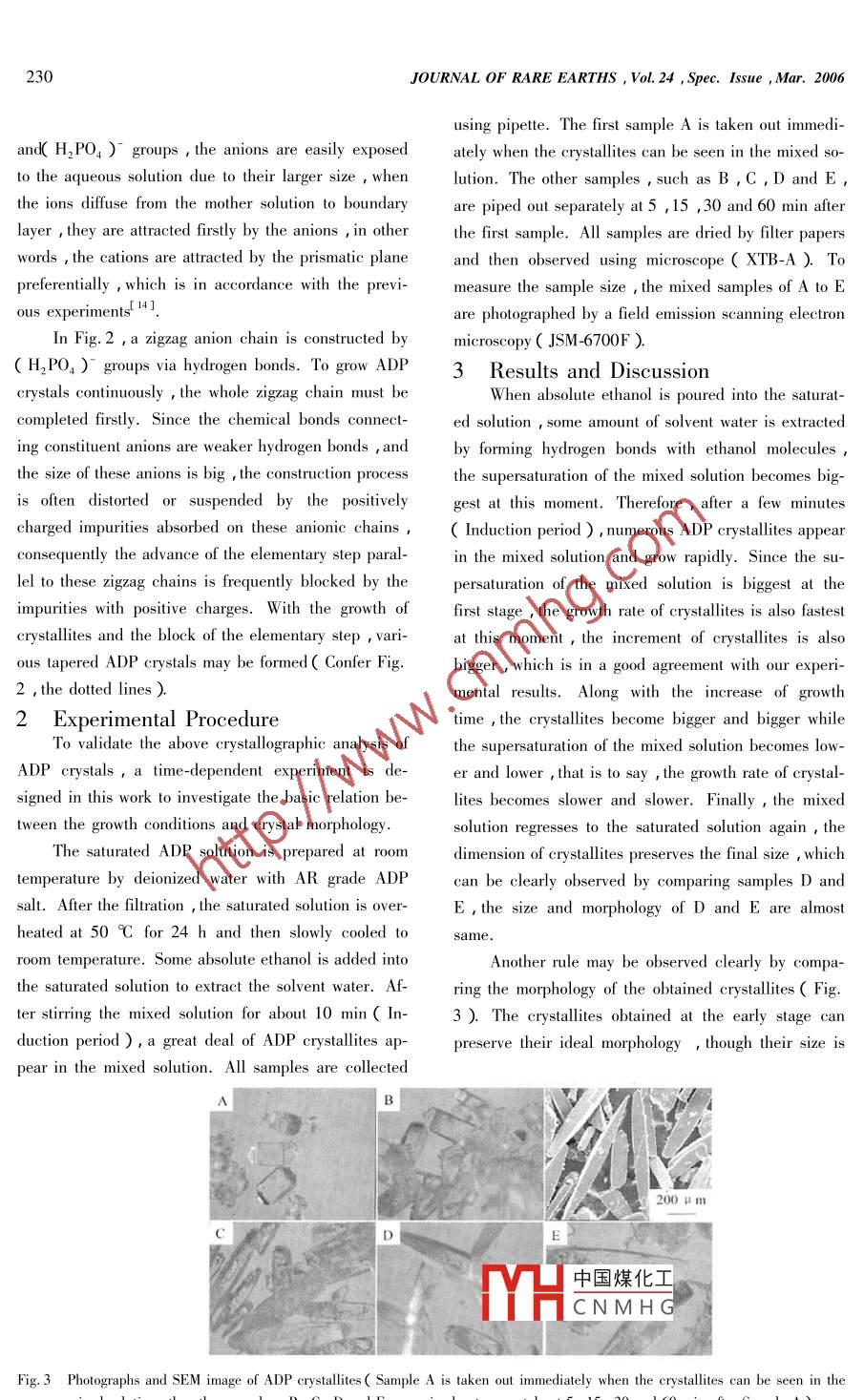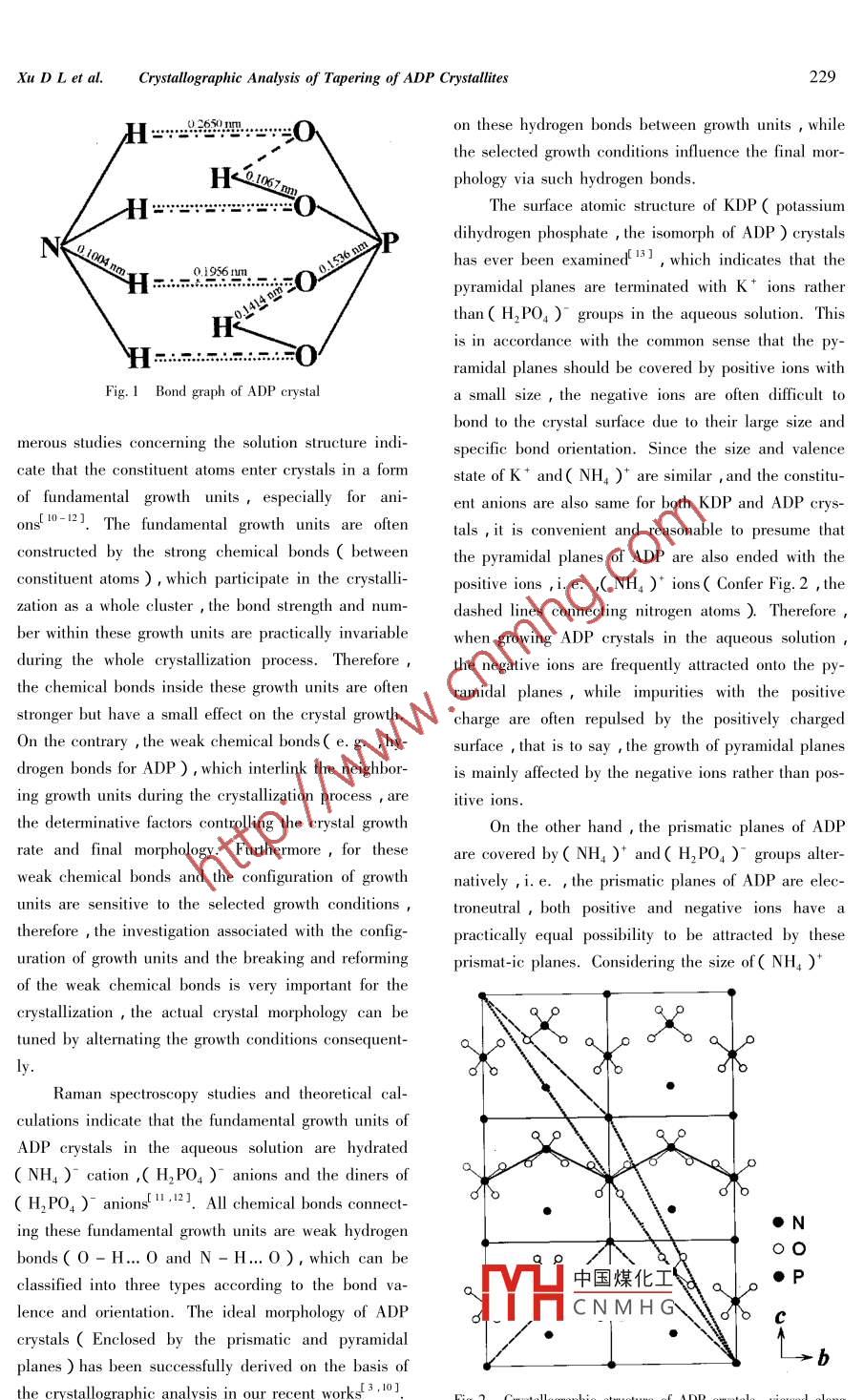 JOURNAL OF RARE EARTHSVol.24 , Spec. Issue , Mar.2006 ,p. 228Crystallographic Analysis of Tapering of ADP Crystallites"Xu Dongli( 許東利) , Xue Dongfeng( 薛冬峰)*( State Key Laboratory of Fine Chemicals , Department of Materials Science and Chemical Engineering , School ofChemical Enginering , Dalian University of Technology , Dalian 116012 , China )Abstract : On the basis of crystallographic characteristics of ADP ( ammonium dihydrogen phosphate ) crystals and the se-lected growth conditions , the growth habit of ADP crystals was studied. In comparison with pyramidal planes , the growthrate of prismatic faces is slower and more sensitive to the additives and impurities for ADP crystals. W hen the supersatura-tion is low , the advance of growth steps on prismatic face can be blocked by ethanol or impurities , the crystal morphologyis changed from the tetragonal prism to shuttle( i. e. ,the tapered shape ). The tapering formation of ADP crystallites wasstructurally studied in a novel view.Key words : crystal structure ; chemical bond ; growth habit ; ADP ; hydrogen bond ; taperingCLC number :0782*.1Document code :AArticle ID : 1002 - 0721( 2006 )- 0228 -05The crystal morphology ,as a synergetic result ofchemical properties of ADP crystals are clearlythe crystal structure and specific growth conditions ,changed. Therefore ,the investigation of the growthgenerally reflects the detailed growth history andhabit and its dependence on the selected growth condi-strongly affects many macroscopic properties of the ob-tions is helpful for us to understand the crystal growthtained crystals. Therefore , comprehensive understand-process and select growth conditions.ing and controlling of the crystal morphology is veryIn the present paper ,ADP erystallites with a reg-important and necessary , the crystallographic analysisular or tapered shape were prepared under water-etha-should be carefully performed when the optimal growthnol mixed solution. The dependence of the crystalconditions are to be determined.morphology on the growth time and supersaturetion wasADP ( ammonium dihydrogen phosphate ) crystalsinvestigated on the basis of crystallographic analysis ofare well known for their excellent piezoelectric , elec-ADP crystals.trooptic , and nonlinear optical properties , which areStructural Characteristics Analysisextensively used in the electrooptic and electroacousticADP crystallizes in the tetragonal system withfields and as a monochromator for X-ray analysis 1~4].space group I 42d at room temperature8,91.As shownDue to their rapid growth rate and relatively simplein Fig. 1 , the hydrogen bonds connecting the adjacentgrowth condition , ADP crystals with large size anddihydrogen phosphate anions are represented byhigh optical quality have been successfully grown indashed lines , while the hydrogen bonds between amthe aqueous solution by cooling or slow evaporationmonium ions and dihydrogen phosphates are distin-method15. Moreover , for the purpose of further in-guished by both dotted and chain dotted lines. Othercreasing the growth rate and enhancing the physico-stronger chemical bonds are depicted as solid lines ,chemical properties of ADP crystals , various kinds ofwhich are almost invariable during the whole crstalli-additives and dopant , such as EDTA , urea , KMnO4zationprocess.and phosphoric acid , are added into ADP aqueous so-Even there are various kinds of chemical bondslution to adjust the metastable zone width and theirexisting in ADP crystals ,only the weaker chemicalspecific properties 5-77. However , with including thebonds formed during the crystallization process havadditives and dopant , the growth habit ( or morpholo-the dominant influence on the crystal growth'31 . Nu-gy ), the growth rate and the corresponding physico-中國煤化工MYHCNM HGFoundation item : Project supprted by the National Natural Science Foundation of China ( 20471012 ) , the Foundation for the Author of NationalExcellent Doctoral Disertation of China ( 200322 ), the Research Fund for the Doctoral Program of Higher Education( 20040141004 ) and the Scienifice Research Foundaion for the Returned Overseas Chinese Scholars , State Education MinistryBiography iXye Dongli( 1975 - ) , Male , Doctoral candidate ; Working on crystal growth* Correspondinguthor ( E-mail :dfxue@ chem. dlut. edu. en)XuDLetal.Crystallographic Analysis of Tapering of ADP Crytalies229H ee=::0on these hydrogen bonds between growth units , while :the selected growth conditions influence the final mor-phology via such hydrogen bonds.The surface atomic structure of KDP ( potassiumdihydrogen phosphate , the isomorph of ADP ) crystalsNkhas ever been examined13] , which indicates that theH -.269.:0pyramidal planes are terminated with K + ions ratherthan( H2PO4 )~ groups in the aqueous solution. ThisHis in accordance with the common sense that the|H -........ramidal planes should be covered by positive ions withFig. 1 Bond graph of ADP crystala small size , the negative ions are often difficult tobond to the crystal surface due to their large size andmerous studies concerning the solution structure indi-specific bond orientation. Since the size and valencecate that the constituent atoms enter crystals in a formstate of K+ and( NH4 )* are similar , and the constitu-of fundamental growth units ,especially for ani-ent anions are also same for both KDP and ADP cry;ons 10-121. The fundamental growth units are oftentals ,it is convenient and reasonable to presume thatconstructed by the strong chemical bonds ( betweenthe pyramidal planes of ADP are also ended with theconstituent atoms ) , which participate in the crystalli-positive ions ,i.e. ,( NH4 )* ions( Confer Fig.2 , thezation as a whole cluster , the bond strength and num-dashed lines connecting nitrogen atoms ). Thereforeber within these growth units are practically invariablewhen growing ADP crystals in the aqueous solutionduring the whole crystallization proprocess.Therefore ,the negative ions
