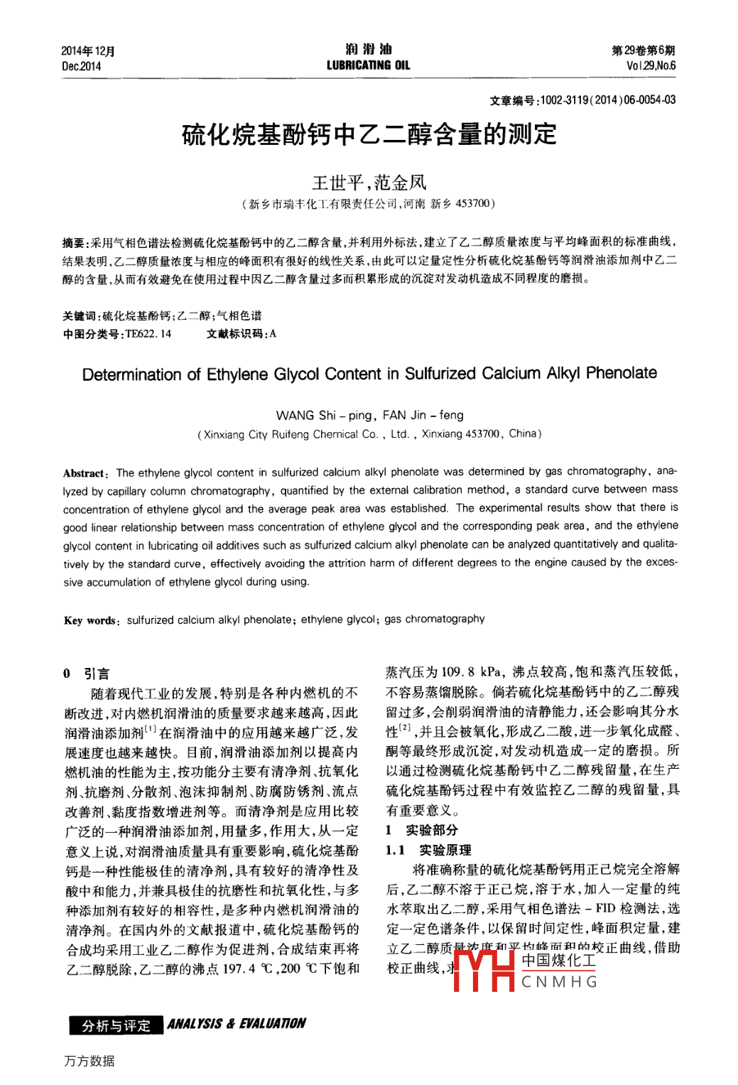 2014年12月潤滑油第29卷第6期Dec 2014LUBRICATING OILVol29. No 6文章編號:10023119(2014)06005403硫化烷基酚鈣中乙二醇含量的測定王世平,范金鳳新鄉(xiāng)市瑞豐化工有限責任公司,河南新鄉(xiāng)453700)摘要:采用氣相色譜法檢測硫化烷基酚鈣中的乙二醇含量,并利用外標法,建立了乙二醇質量濃度與平均峰面積的標準曲線結果表明,乙二醇質量濃度與相應的峰面積有很好的線性關系,由此可以定量定性分析硫化烷基酚鈣等潤滑油添加劑中乙二醇的含量,從而有效避免在使用過程中因乙二醇含量過多而積累形成的沉淀對發(fā)動機造成不同程度的磨損關鍵詞:硫化烷基酚鈣;乙二醇;氣相色譜中圖分類號:TE622,14文獻標識碼:ADetermination of Ethylene Glycol Content in Sulfurized Calcium Alkyl PhenolateWANG Shi-ping, FAN Jin-fengXinxiang City Ruifeng Chemical Co, Ltd, Xinxiang 453700, China)Abstract: The ethylene glycol content in sulfurized calcium alkyl phenolate was determined by gas chromatography, analyzed by capillary column chromatography, quantified by the external calibration method, a standard curve between massconcentration of ethylene glycol and the average peak area was established. The experimental results show that there isgood linear relationship between mass concentration of ethylene glycol and the corresponding peak area, and the ethyleneglycol content in lubricating oil additives such as sulfurized calcium alkyl phenolate can be analyzed quantitatively and qualita-tively by the standard curve, effectively avoiding the attrition harm of different degrees to the engine caused by the exces-sive accumulation of ethylene glycol during usingKey words: sulfurized calcium alkyl phenolate; ethylene glycol; gas chromatography引言蒸汽壓為109.8kPa,沸點較高,飽和蒸汽壓較低,隨著現(xiàn)代工業(yè)的發(fā)展,特別是各種內燃機的不不容易蒸餾脫除。倘若硫化烷基酚鈣中的乙二醇殘斷改進,對內燃機潤滑油的質量要求越來越高,因此留過多,會削弱潤滑油的清靜能力,還會影響其分水潤滑油添加劑在潤滑油中的應用越來越廣泛,發(fā)性2,并且會被氧化形成乙二酸,進一步氧化成醛、展速度也越來越快。目前,潤滑油添加劑以提高內酮等最終形成沉淀,對發(fā)動機造成一定的磨損。所燃機油的性能為主,按功能分主要有清凈劑、抗氧化以通過檢測硫化烷基酚鈣中乙二醇殘留量,在生產劑、抗磨劑、分散劑、泡沫抑制劑、防腐防銹劑、流點硫化烷基酚鈣過程中有效監(jiān)控乙二醇的殘留量,具改善劑、黏度指數增進劑等。而清凈劑是應用比較有重要意義廣泛的一種潤滑油添加劑,用量多,作用大,從一定1實驗部分意義上說,對潤滑油質量具有重要影響,硫化烷基酚1.1實驗原理鈣是一種性能極佳的清凈劑,具有較好的清凈性及將準確稱量的硫化烷基酚鈣用正己烷完全溶解酸中和能力,并兼具極佳的抗磨性和抗氧化性,與多后,乙二醇不溶于正己烷,溶于水,加人入一定量的純種添加劑有較好的相容性,是多種內燃機潤滑油的水萃取出乙二醇,采用氣相色譜法-FD檢測法,選凊凈劑。在國內外的文獻報道中,硫化烷基酚鈣的定一定色譜條件,以保留時間定性,峰面積定量,建合成均采用工業(yè)乙二醇作為促進劑,合成結束再將立乙二醇質均峰而和的校正曲線,借助乙二醇脫除,乙二醇的沸點197.4℃,200℃下飽和校正曲線,THE中國煤化工CNMHG分析與評定 ANALYS/S EVALUAnDl第6期王世平等硫化烷基酚鈣中乙二醇含量的測定1.2儀器和試劑中,加入一定量的正己烷,將試樣完全溶解,再加入儀器:島津GC-2014C色譜儀,氫火焰離子檢m2g水(精確至0.0001g),塞緊塞子,搖蕩5min,靜測器,GC- solutin工作站,島津自動進樣器,毛細柱:置后會出現(xiàn)分層現(xiàn)象。AC5(弱極性),離心機,具塞離心管,巴氏吸管。將離心管放入離心機中,調至離心力(RCF)為試劑:正己烷(分析純),蒸餾水,乙二醇(色譜級)。700g,離心30min。取出后,如果水層不清晰,則棄1.3實驗步驟除上層的油液,再加入一定量的正己烷,震蕩5min,1.3.1標準曲線繪制繼續(xù)離心30min,反復此操作,直至出現(xiàn)清晰的水選擇配制質量濃度的乙二醇水溶液作為標準樣層。品,在相同的色譜條件下重復進樣3次,測得相應的用一次性吸管吸取離心管中清晰的水層溶液乙二醇水溶液的峰面積,并求出峰面積的平均值,通加入到1.5m的進樣瓶中,設定相同的氣相色譜條過乙二醇水溶液的質量濃度和峰面積的擬合,繪制件,開始進樣分析,同一樣品重復進樣3次。標準曲線,保留時間為定性指標,見圖1,建立線性采樣分析結束后,可以得出試樣中乙二醇的平回歸方程,見圖2。均峰面積,根據標準曲線,再求出試樣中乙二醇的質1.3.2步驟量濃度。稱取試樣m1g(精確至0.0001g)于帶塞離心管1.3.3計算公式試樣中乙二醇含量=試樣中乙二醇的質量濃度x純水的質量×100%2結果與討論因為FD氫火焰離子檢測器檢測不出水的峰,21氣相色譜分析條件沒有響應因子,所以在保留時間為2.412mn左右色譜柱選擇:熔融石英毛細管柱(長30m,內徑的峰是乙二醇峰,由此可以定性為乙二醇峰。0.53mm,膜厚1.0μm),柱溫(初始):120℃,升溫2.3建立標準曲線(見圖2)速率:10℃/min,柱溫(終止):200℃,終點保留時間:10min,進樣口溫度:250℃,檢測器溫度:270℃,載氣氮氣流速:3mL/min,氫氣流速:40ml/min,空氣流速:400mL/min,自動進樣,進樣量:0.5μL,5.0分流進樣,分流比:60。4.0此條件得出的譜圖峰行比較對稱,重合性較好,2.0有利于峰面積的定性定量分析。2.2乙二醇的定性分析00.250500751001.251.501.752002252502%乙二醇水