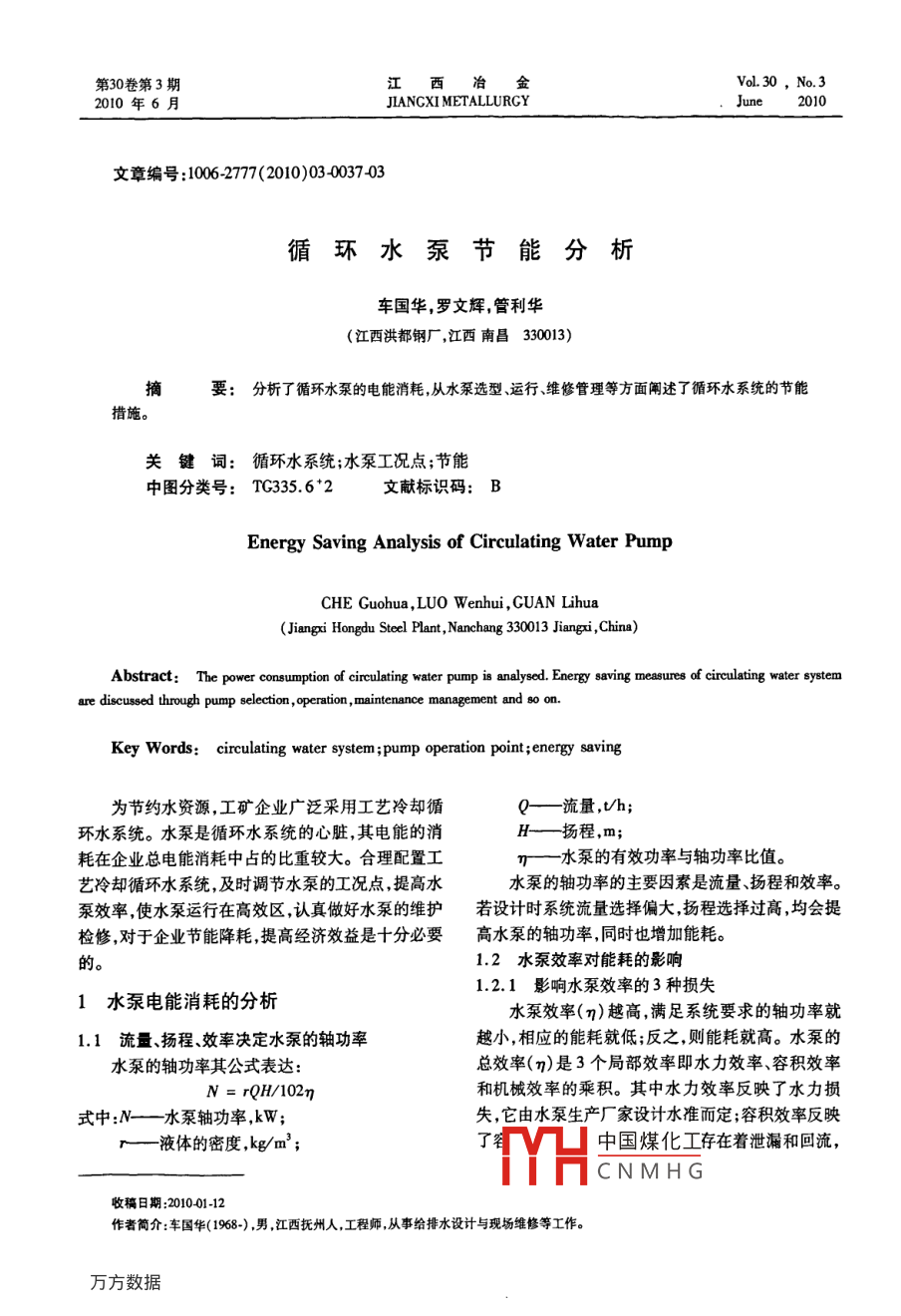 第30卷第3期江西冶金Vol 30 No. 32010年6月JIANGXI METALLURGYJune 2010文章編號:1006-277(2010)034003703循環(huán)水泵節(jié)能分析車國華,羅文輝,管利華(江西洪都鋼廠,江西南昌330013)摘要:分析了循環(huán)水泵的電能消耗,從水泵選型運(yùn)行、維修管理等方面闡述了循環(huán)水系統(tǒng)的節(jié)能措施關(guān)鍵詞:循環(huán)水系統(tǒng);水泵工況點(diǎn);節(jié)能中圖分類號:TG335.6·2文獻(xiàn)標(biāo)識碼:BEnergy Saving Analysis of Circulating Water PumpCHE Guohua, LUO Wenhui GUAN Lihua(Jiangxi Hongdu Steel Plant, Nanchang 330013 Jiangxi, ChinaAbstract: The power consumption of circulating water pump is analysed. Energy saving measures of circulating water systemare discussed through pump selection, operation, maintenance management and so onKey wordsting water system pump operation point energy saving為節(jié)約水資源,工礦企業(yè)廣泛采用工藝?yán)鋮s循Q—流量,t/h環(huán)水系統(tǒng)。水泵是循環(huán)水系統(tǒng)的心臟,其電能的消H—揚(yáng)程,m耗在企業(yè)總電能消耗中占的比重較大。合理配置工T——水泵的有效功率與軸功率比值。藝?yán)鋮s循環(huán)水系統(tǒng),及時調(diào)節(jié)水泵的工況點(diǎn),提高水水泵的軸功率的主要因素是流量、揚(yáng)程和效率。泵效率,使水泵運(yùn)行在髙效區(qū),認(rèn)真做好水泵的維護(hù)若設(shè)計(jì)時系統(tǒng)流量選擇偏大揚(yáng)程選擇過高均會提檢修對于企業(yè)節(jié)能降耗提高經(jīng)濟(jì)效益是十分必要高水泵的軸功率同時也增加能耗。的1.2水泵效率對能耗的影響1.2.1影響水泵效率的3種損失1水泵電能消耗的分析水泵效率(η)越高滿足系統(tǒng)要求的軸功率就1.1流量揚(yáng)程、效率決定水泵的軸功率越小,相應(yīng)的能耗就低;反之,則能耗就高。水泵的水泵的軸功率其公式表達(dá):總效率(n)是3個局部效率即水力效率、容積效率N=rQH/102n和機(jī)械效率的乘積。其中水力效率反映了水力損式中:N水泵軸功率kW失,它由水泵生產(chǎn)廠家設(shè)計(jì)水準(zhǔn)而定;容積效率反映液體的密度,kg/m3;TH中國煤化工存在著泄漏和回流CNMHG收稿日期:201001-12作者簡介:車國華(1968-)男江西撫州人,工程師從事給排水設(shè)計(jì)與現(xiàn)場維修等工作38江西冶金2010年6月也就是說水泵的出水量總要比通過葉輪的流量小,此,在對舊泵挖潛、擴(kuò)建時,不能簡單地理解為增加形成流量減少的能量損失;機(jī)械效率反映了機(jī)械損一倍并聯(lián)水泵臺數(shù),流量就會增加一倍。而必須要失,其包括泵軸在軸承內(nèi)轉(zhuǎn)動的摩擦損失,軸與軸封考慮管道的過水能力,經(jīng)過并聯(lián)工況的計(jì)算和分析,之間的摩擦損失,葉輪兩側(cè)蓋板和液體間發(fā)生的摩才能下結(jié)論。故對于水泵站設(shè)計(jì)時,若所選的水泵擦損失。是以經(jīng)常單獨(dú)運(yùn)行為主的,并聯(lián)工作時,各單泵的流1.2.2離心水泵選型對水泵效率的影響量減少揚(yáng)程會提高。當(dāng)不同型號的水泵進(jìn)行并聯(lián)離心水泵的特性曲線有流量與揚(yáng)程(QH)、時,這種現(xiàn)象就更明顯流量與軸功率(QN)流量與效率(Qη)流量與允許吸上真空高度(Q-H3)4種(圖1),在QH曲線上的流量和揚(yáng)程處在高效段,相應(yīng)于效率最高值的A點(diǎn)各參數(shù)是該水泵最經(jīng)濟(jì)的工作點(diǎn)。當(dāng)實(shí)際出口流量發(fā)生較大變化時,其水泵曲線中參數(shù)發(fā)生5臺變化,從而導(dǎo)致該水泵效率不在高效范圍內(nèi)。選擇水泵,一般是根據(jù)最大用水量來選擇水泵的流量滿1臺足最不利點(diǎn)來選擇水泵的揚(yáng)程,水泵在實(shí)際運(yùn)行時會發(fā)生用水量的偏差,使水泵工況點(diǎn)處在該水泵的非高效區(qū)。這樣,當(dāng)用水量很小時,水泵揚(yáng)程很高,2 Q3 0405余壓較大,造成電能浪費(fèi);當(dāng)用水量很大時,雖然水(100(190)(251)(284)(300泵揚(yáng)程較低,但此時效率更低,功率很大,也造成電能浪費(fèi)。圖1中的4種曲線變化規(guī)律說明應(yīng)在水泵圖2水泵并聯(lián)時流量與揚(yáng)程的關(guān)系髙效段內(nèi)選擇適合管路系統(tǒng)要求的水泵。2水泵節(jié)能措施N/W2.1合理選擇水泵在整個管路系統(tǒng)中,通過經(jīng)濟(jì)技術(shù)比較,合理計(jì)算流量和確定揚(yáng)程。若水泵站服務(wù)范圍不是很大盡量減少水泵的富余流量和富余揚(yáng)程,保證水泵工況在正常運(yùn)行時處于高效段,同時選用高效、可靠耐用、性能好的水泵。0801602403204004802.2在定速運(yùn)行情況下調(diào)節(jié)離心水泵工況點(diǎn)離心水泵裝置的工況點(diǎn),是建立于水泵和管道圖1轉(zhuǎn)速為1450v/min時的特性曲線系統(tǒng)能量供求關(guān)系的平衡上,只要兩者之一情況發(fā)生改變時,其工況點(diǎn)就會發(fā)生轉(zhuǎn)移。當(dāng)管網(wǎng)中壓力1.3水泵并聯(lián)運(yùn)行增加了電耗的變化幅度太大時,水泵的工況點(diǎn)將會移出其高效水泵并聯(lián)臺數(shù)過多,水總量增加將非常有限卻段在低效率段工作。運(yùn)行過程中應(yīng)注意水泵的運(yùn)過多地消耗了電能圖2為5臺同型號水泵并聯(lián)工行參數(shù)準(zhǔn)確判斷水泵的工況點(diǎn)是否處于高效段,這作的情況。由圖2可知:以1臺水泵工作時的流量樣對于提高水泵效率,節(jié)約能源十分重要。有時用Q1為100h;2臺水泵并聯(lián)的總流量Q