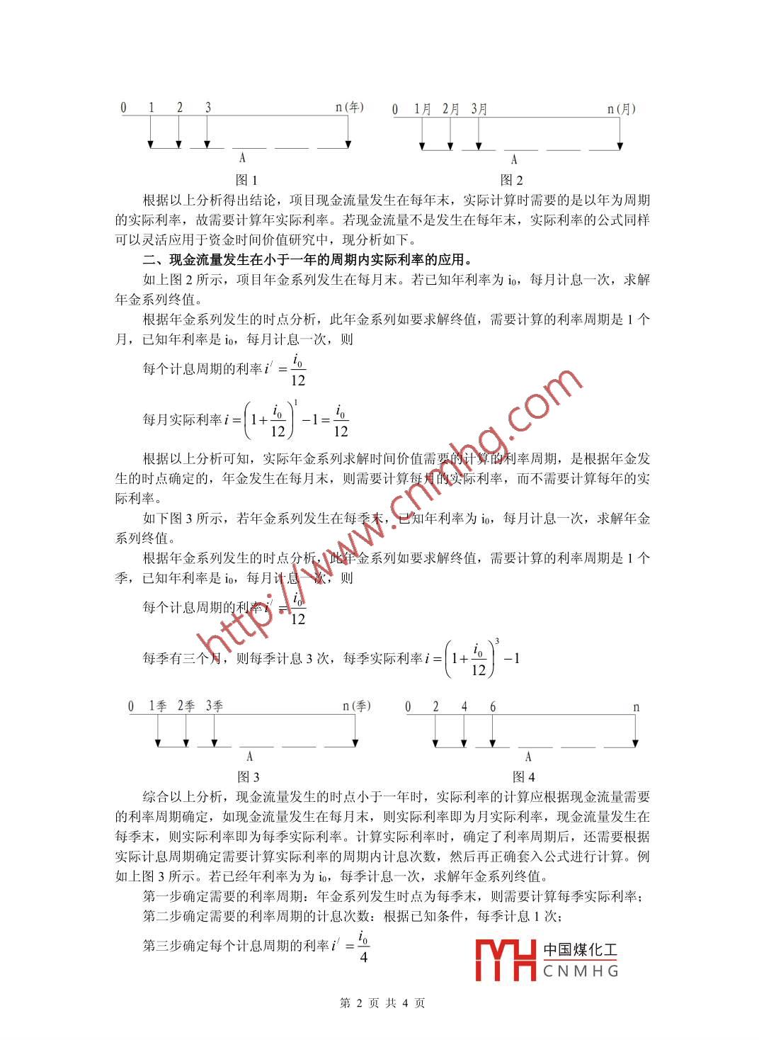 實際利率的應(yīng)用分析常輝四川交通職業(yè)技術(shù)學(xué)院四川成都 611130[摘要]工程經(jīng)濟(jì)分析中已知的利率周期和計息周期與實際需要的利率周期通常不-致,這時需要計算實際利率。實際利率的計算除了通常意義上研究的年實際利率外,實際應(yīng)用中需要根據(jù)項目現(xiàn)金流量的特點,綜合現(xiàn)金流量發(fā)生的時點和間隔周期,計算不是一年的情況下的實際利率,通過不同情況下實際利率的計算,擴(kuò)大實際利率的應(yīng)用范圍,簡化經(jīng)濟(jì)分析計算過程,提高計算速度。[關(guān)鍵詞]實際利率計息周期中圖分類號: 0121.2文獻(xiàn)標(biāo)識碼: A文章編號:在工程經(jīng)濟(jì)分析中,常用到實際利率這個概念,通常的教材中對實際利率的解釋是當(dāng)計息周期小于一年時的年利率即為實際利率。而實際利率在應(yīng)用中并不只局限于一年的實際利率,實際利率應(yīng)該是實際需要的計息周期的利率,這個實際的計息周期可以是-年,可以是一個月、 一個季度,還可以是兩年或者更多年。在進(jìn)行實際利率研究時,首先明確以下幾個概念: .名義利率:工程經(jīng)濟(jì)分析中名義利率即通常意義上的年利率,產(chǎn)生名義利率的條件是當(dāng)計息周期不是- -年時,這時的已知年利率即為名義利率。實際利率:實際利率周期的利率。即某個時間間隔內(nèi)的實際利息與本金的比值。實際利率計算時的時間間隔可以是一-年, 也可以是一一個月,還可以是兩年或其他任意- - 個時間周期。計息周期利率:即每一個計息周期的利率,計息周期即實際計息的間隔。按月計息,計息周期利率即為月利率,按年計息,計息周期利率即為年利率。--、--般情況下的實際利率應(yīng)用如下圖1所示,項目等額年金系列發(fā)生在每年末,如一年計息m次,給定年利率為io,對此等額年金系列求終值。實際應(yīng)用中需要根據(jù)一次支付終值公式求解年實際利率i。若現(xiàn)值是P,- -年計息計息m次,則每一個計息周期的利率i/ =現(xiàn)值P在一年末的終值F=P(+i)=p(1+燕)°年實際利息1=F-P=p1+ | -Pn)p|1+'°| - P。)"年實際利率i=1+D|-1則年金終值F, = A(FiA,i,n)中國煤化工YHCNMH G第1頁共4頁02n(年)01月2月3月n(月)A圖1圖2根據(jù)以上分析得出結(jié)論,項目現(xiàn)金流量發(fā)生在每年末,實際計算時需要的是以年為周期的實際利率,故需要計算年實際利率。若現(xiàn)金流量不是發(fā)生在每年末,實際利率的公式同樣可以靈活應(yīng)用于資金時間價值研究中,現(xiàn)分析如下。二二、現(xiàn)金流量發(fā)生在小于-年的周期內(nèi)實際利率的應(yīng)用。如上圖2所示,項目年金系列發(fā)生在每月末。若已知年利率為io,每月計息一次,求解年金系列終值。根據(jù)年金系列發(fā)生的時點分析,此年金系列如要求解終值,需要計算的利率周期是1個月,已知年利率是io,每月計息一次,則每個計息周期的利率i' ='012ig每月實際利率i=2)根據(jù)以上分析可知,實際年金系列求解時間價值需要的計算的利率周期,是根據(jù)年金發(fā)生的時點確定的,年金發(fā)生在每月末,則需要計算每月的實際利率,而不需要計算每年的實際利率。如下圖3所示,若年金系列發(fā)生在每季末,已知年利率為io,每月計息- -次,求解年金系列終值。季,已知年利率是io,每月計息一次,則每個計息周期的利率i' =每季有三個月,則每季計息3次,每季實際利率i=+號-10 1季2季3季n(季)圖3圖4綜合以上分析,現(xiàn)金流量發(fā)生的時點小于一年時, 實際利率的計算應(yīng)根據(jù)現(xiàn)金流量需要的利率周期確定,如現(xiàn)金流量發(fā)生在每月末,則實際利率即為月實際利率,現(xiàn)金流量發(fā)生在每季末,則實際利率即為每季實際利率。計算實際利率時,確定了利率周期后,還需要根據(jù)實際計息周期確定需要計算實際利率的周期內(nèi)計息次數(shù),然后再正確套入公式進(jìn)行計算。例如上圖3所示。若已經(jīng)年利率為為io,每季計息一次, 求解年金系列終值。第一步確定需要的利率周期:年金系列發(fā)生時點為每季末,則需要計算每季實際利率;第二步確定需要的利率周期的計息次數(shù):根據(jù)已知條件,每季計息1次;第三步確定每個計息周期的利率i'=中國煤化工4MYHCNMH G第2頁共4頁第四步確定需要的利率周期的實際利率i=2第五步計算資金時間價值F, = A(F/A,i,n)三、現(xiàn)金流量發(fā)生在大于-年的周期內(nèi)實際利率的應(yīng)用上面分析過程是計息周期小于一年的情況,實際中計息周期通常是一一年,而現(xiàn)金流量發(fā)生的時點可能大于一年。比如道路橋梁的大修費用的發(fā)生,設(shè)備機(jī)器的修理養(yǎng)護(hù)等。如圖4所示,若年金系列每2年發(fā)生,已知年利率為i0,每年計息一次,求解年金系列終值。第一步確定需要的利率周期:年金系列發(fā)生時點為每兩末,則需要計算每兩年為一一個周期的實際利率;第二步確定需要的利率周期的計息次數(shù):根據(jù)已知條件,每年計息1次,則每兩年計息2次;第三步確定每個計息周期的利率i =ig第四步確定需要的利率周期的實際利率i=(1+i)-1第五步計算資金時間價值F, = A(F/A,n/2)通過以上分析得出,當(dāng)計息周期為- -年,實際現(xiàn)金流量間隔K年發(fā)生一次時,則按現(xiàn)金流量發(fā)生的時點周期計算的實際利率i=(+i)*-1。當(dāng)計息周期小于