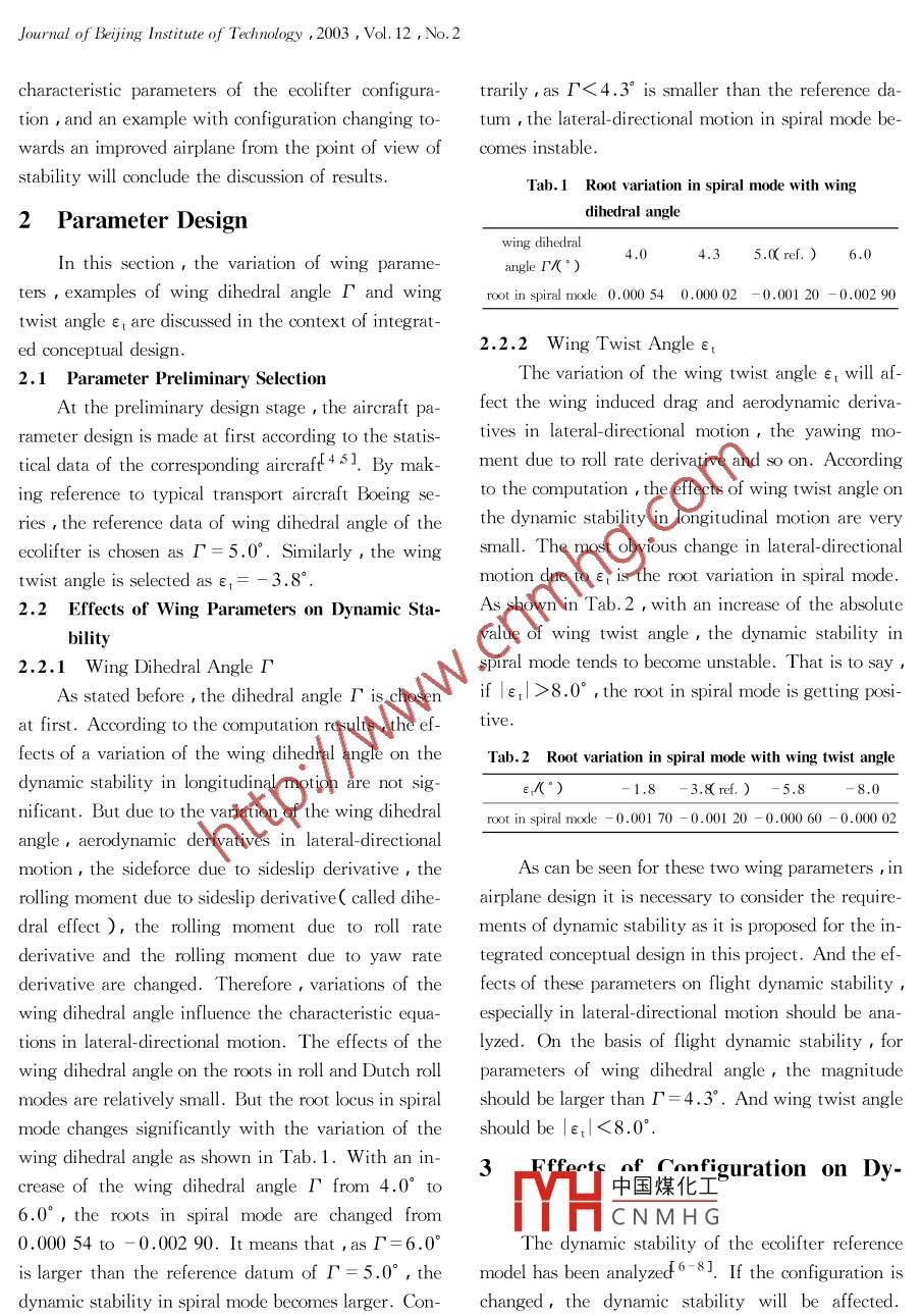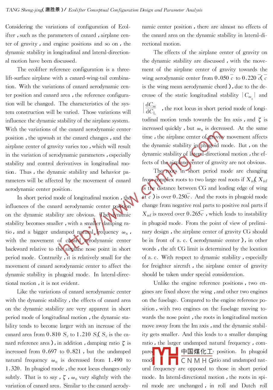 Journal of Beijing Institute of Technology ,2003 , Vol. 12 ,No.2Ecolifter Conceptual Configuration Design andParameter AnalysisTANG Sheng-jing( 唐勝景)( School of Mechatronics Engineering , Beiing Institute of Technology , Beijing 100081 , China)Abstract : In the phase of conceptually designing , the Ecolifter with three lift surface configuration , the infu-ences of aircraft geometric parameters and configuration such as wing geomtric parameters , canard parameters ,aircraft center of gravity and engine positions and so on,on flight dynamic stability are discussed with the inte-grated analysis method. On the basis of the analysis of flight dynamic stability , the suitable wing geometric pa-rameters are given and the improved aircraft configuration is proposed.Key words : aircraft design ; transport plane ; flight dynamicsCLC number :V211.92Document code :AArticle ID : 1004-0579 2003 )02-0149-05The Ecolifter121, a new type of transportplane ,is studied by the ACRT( i.e. Air Cargo Re>8.0° ,the root in spiral mode is getting posi-at first. According to the computation results , the ef-tive. .fects of a variation of the wing dihedral angle on theTab.2 Root variation in spiral mode with wing twist angledynamic stability in longitudinal motion are not sig-e,(°)-1.8 -3.8(ref. ) - 5.8-8.0nificant. But due to the variation of the wing dihedralroot in spiral mode -0.001 70 - 0.001 20 -0.000 60 - 0.00002angle , aerodynamic derivatives in lateral-directionalmotion, the sideforce due to sideslip derivative , theAs can be seen for these two wing parameters , inrolling moment due to sideslip derivative( called dihe-airplane design it is necessary to consider the require-dral effect ), the rolling moment due to roll ratements of dynamic stability as it is proposed for the in-derivative and the rolling moment due to yaw ratetegrated conceptual design in this project. And the ef-derivative are changed. Therefore ,variations of thefects of these parameters on flight dynamic stabilty ,wing dihedral angle influence the characteristic equa-especially in lateral-directional motion should be ana-tions in lateral-directional motion. The effects of thelyzed. On the basis of flight dynamic stability ,forwing dihedral angle on the roots in roll and Dutch rollparameters of wing dihedral angle ,the magnitudemodes are relatively small. But the root locus in spiralshould be larger than F=4.3° . And wing twist anglemode changes significantly with the variation of theshould be |e1<8.0°.wing dihedral angle as shown in Tab.1. With an in-3Fffertf. of Configuration on Dy-crease of the wing dihedral angle T from 4.0° tc中國(guó)煤化工6.0°,the roots in spiral mode are changed fromYHCNMHG0.00054 to - 0.002 90. It means that ,as F=6.0°The dynamic stability of the ecolifter referenceis larger than the reference datum of T= 5.0° , themodel has been analyzed6-81. If the configuration is .dynamic stability in spiral mode becomes larger. Con-changed,the dynamic stability will be affected.一150一TANG Sheng-jing(唐勝景)/ Ecolifter Conceptual Con. figuratio Design and Parameter AnalysisConsidering the variations of configuration of Ecol-namic center position , there are almost no effects ofifter , such as the parameters of canard , airplane cen-the canard area on the dynamic stability in lateral-di -ter of gravity , and engine positions and so on , therectional motion.dynamic stability in longitudinal and lateral-direction-The effects of the airplane center of gravity onal motion have been discussed.the dynamic stability are discussed , with the move-The ecclifter reference configuration is a three-ment of the airplane center of gravity towards thelift-surface airplane with a canard-wing- tail combina-wing aerodynamic center from 0.050c to0.220 c( ction. With the variations of canard aerodynamic cen-is the wing mean aerodynamic chord ) , due to the de-ter position and canard area , the reference configura-crease of the static longitudinal stability |Cm| andtion will be changed. The characteristics of the sys-tem construction will be varied. Those variations willdCL, the root locus in short period mode of longi-influence the dynamic stability of the airplane system.tudinal motion tends towards the Im axis , and ζ isWith the variations of the canard aerodynamic centerincreased quickly , but con is decreased. At the sameposition , the upwash at the canard changes , and thetime , the airplane center of gravity movement affectsairplane center of gravity varies too , which will resultthe dynamic stability in phugoid mode. But , on thein the variation of aerodynamic parameters , especiallydynamic stability of lateral- directional motion , the ef-stability and control derivatives in longitudinal mo-fects of the airplane center of gravity are not obvious.tion. Thus , the dynamic stability and behavior pa-The roots in short period mode are changingrameters will be affected by the movement of canardfrom complex roots to two large real rootsif Xr{ Xrefaerodynamic center position.is the distance between CG and leading edge of wingIn short period mode of longitudinal motion , theat c )is over 0.250c. And the roots in phugoid modeinfluences of the canard aerodynamic center positionchange from negative real parts to positive real parts ifon the dynamic stability are obvious. The dynamicXref is moved over 0.265c , which leads to instabilitystability becomes smaller , with a smaller damping ra-in phugoid mode. From the point of view of prelimi-tio, and a bigger undamped natural frequency wn,nary design , the airplane center of gravity CG shouldwith the movement of canard aerodynamic centerbein front of a. c. ( aerodynamic center ), in otherbackward relative to the airplane nose point in shortwords , the aft CG limit is determined by the locationperiod mode. Contrarily ,it is relatively small for theofa.c. With respect to dynamic stability,especiallymovement of canard aerodynamic center to affect thefor freighter aircraft , the air