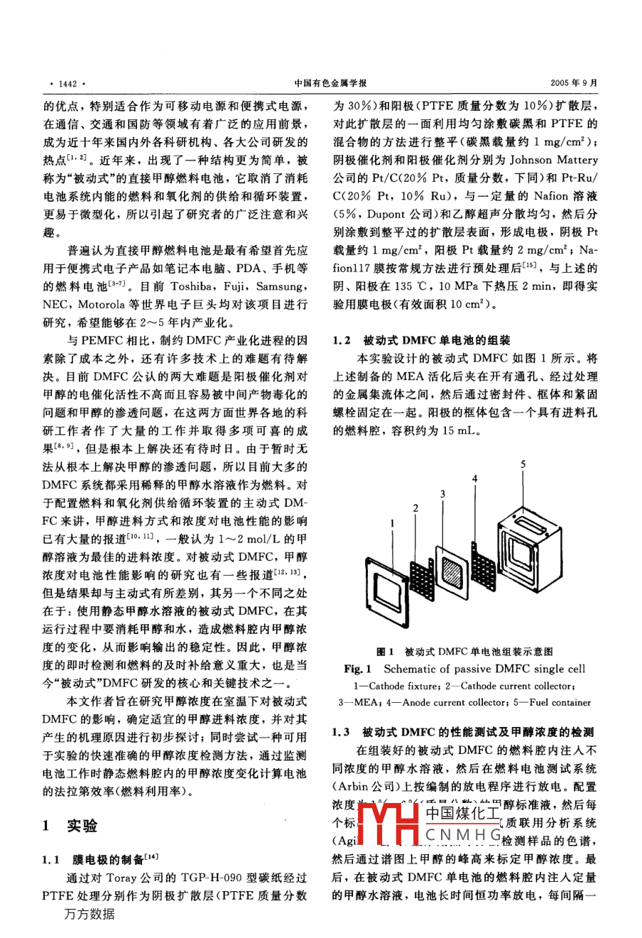 第15卷第9期中國有色金屬學(xué)報2005年9月Vol 15 No 9The Chinese Journal of Nonferrous Metals文章編號:1004-0609(2005)09-1441-05甲醇濃度對被動式直接甲醇燃料電池性能的影響曾毓群3,陳杰,許瑞,趙豐剛邱祎翎2,杜鴻達(dá)2,李寶華2,康飛宇2,陳立泉3(1.東莞新能源電子科技有限公司,東莞523080;2.清華大學(xué)深圳研究生院,深圳518055;3.中國科學(xué)院物理所,北京100080)摘要:利用自制的膜電極組件和自行設(shè)計開發(fā)的模具,組裝成被動式直接甲醇燃料電池,測量其在不同甲醇供給濃度下的放電性能。結(jié)果表明:隨著甲醇濃度的逐漸增加,被動式電池的放電性能先上升后下降,在濃度為2mol/L時性能達(dá)到最佳。對其放電行為的分析表明,這一現(xiàn)象是陽極濃差極化和甲醇滲透共同作用的結(jié)果。采用GC熱導(dǎo)的方法,對甲醇溶液的濃度進(jìn)行標(biāo)定,結(jié)果表明只需微量樣品就可以快速、準(zhǔn)確地測量出甲醇濃度采用該方法對被動式單電池在長時間放電過程中燃料腔內(nèi)的甲醇濃度的變化進(jìn)行了檢測,通過實(shí)驗對此系統(tǒng)的法拉第效率進(jìn)行了估算,結(jié)果表明該被動式直接甲醇燃料電池的法拉第效率可以達(dá)到44%。關(guān)鍵詞:被動式直接甲醇燃料電池;甲醇濃度;甲醇滲透;氣相色譜熱導(dǎo)檢測;法拉第效率中圖分類號:TM911.4文獻(xiàn)標(biāo)識碼:AEffect of methanol concentration onperformance of passive dMFCZENG Yu-qun.3, CHEN Jie, XU Rui, ZHAO Feng-gang,QIU Yi-lin, DU Hong-da, LI Bao-hua, KANG Fei-yu, CHEN Li-quan(l. Dongguan Amperex Electronics Technology Co, Ltd, Dongguan 523080, China2. Graduate School at Shenzhen, Tsinghua University, Shenzhen 518055, China;3. Institute of Physics, Chinese Academy of Sciences, Beijing 100080, China)Abstract: A passive liquid feed direct methanol fuel cell(DMFC) was assembled with MEA and self-fabricated.The discharge performance were tested with different feed methanol concentration at room temperature. The resultsshow that the cell discharge performance increases at the beginning then drops with the increasing methanol concentration,and reaches the optimum at 2 mol/L methanol, which is caused by anode concentration polarization andmethanol crossover. Attempts to character the methanol concentration were made. The results show the gC thermalconductivity method can be used to character the methanol concentration practically. Then this method was appliedto detect the methanol concentration change in the fuel container during the cells long term discharge. Rough calculation shows that Faradic efficiency of our passive cell system is about 44%Key words: passive DMFC; methanol concentration; methanol crossover; GC thermal conductivity; Faradic effi液態(tài)進(jìn)料的直接甲醇燃料電池(DMFC)具有結(jié)構(gòu)簡H中國煤化工系統(tǒng)體積比能量高CNMHG①收稿日期:2005-05-12;修訂日期:2005-07-12作者簡介:曾毓群(1968-),男,博士研究生通訊作者:趙豐剛,高級工程師;電話:07692405338-1265;E-mail:zhaofrank@ATLbattery.com1442中國有色金屬學(xué)報2005年9月的優(yōu)點(diǎn),特別適合作為可移動電源和便攜式電源,為30%)和陽極(PTFE質(zhì)量分?jǐn)?shù)為10%)擴(kuò)散層,在通信、交通和國防等領(lǐng)域有著廣泛的應(yīng)用前景,對此擴(kuò)散層的一面利用均勻涂敷碳黑和PTFE的成為近十年來國內(nèi)外各科研機(jī)構(gòu)、各大公司研發(fā)的混合物的方法進(jìn)行整平(碳黑載量約1mg/cm2);熱點(diǎn),2。近年來,出現(xiàn)了一種結(jié)構(gòu)更為簡單,被陰極催化劑和陽極催化劑分別為 Johnson Mattery稱為“被動式”的直接甲醇燃料電池,它取消了消耗公司的PtC(20%Pt,質(zhì)量分?jǐn)?shù),下同)和PtRu/電池系統(tǒng)內(nèi)能的燃料和氧化劑的供給和循環(huán)裝置,C(20%Pt,10%Ru),與一定量的 Nafion溶液更易于微型化,所以引起了研究者的廣泛注意和興(5%, Dupont公司)和乙醇超聲分散均勻,然后分別涂敷到整平過的擴(kuò)散層表面,形成電極,陰極Pt普遍認(rèn)為直接甲醇燃料電池是最有希望首先應(yīng)載量約1mg/cm2,陽極Pt載量約2mg/cm2;Na用于便攜式電子產(chǎn)品如筆記本電腦、PDA、手機(jī)等fion7膜按常規(guī)方法進(jìn)行預(yù)處理后15,與上述的的燃料電池。目前 Toshiba,Fuji, Samsung,陰、陽極在135℃,10MPa下熱壓2min,即得實(shí)NEC, Motorola等世界電子巨頭均對該項目進(jìn)行驗用膜電極(有效面積10cm2)。研究,希望能夠在2~5年內(nèi)產(chǎn)業(yè)化。與 PEMFC相比,制約DMFC產(chǎn)業(yè)化進(jìn)程的因1.2被動式DMFC單電池的組裝素除了成本之外,還有許多技術(shù)上的難題有待解本實(shí)驗設(shè)計的被動式DMFC如圖1所示。將決。目前DMFC公認(rèn)的兩大難題是陽極催化劑對上述制備的MEA活化后夾在開有通孔、經(jīng)過處理甲醇的電催化活性不高而且容易被中間產(chǎn)物毒化的的金屬集流體之間,然后通過密封件、框體和緊固問題和甲醇的滲透問題,在這兩方面世界各地的科螺栓固定在一起。陽極的框體包含一個具有進(jìn)料孔研工作者作了大量的工作并取得多項可喜的成的燃料腔,容積約為15mL果[.,但是根本上解決還有待時日。由于暫時無法從根本上解決甲醇的滲透問題,所以目前大多的DMFC系統(tǒng)都采用稀釋的甲醇水溶液作為燃料。對于配置燃料和氧化劑供給循環(huán)裝置的主動式DMFC來講,甲醇進(jìn)料方式和濃度對電池性能的影響已有大量的報道01,一般認(rèn)為1~2mol/L的甲醇溶液為最佳的進(jìn)料濃度。對被動式DMFC,甲醇