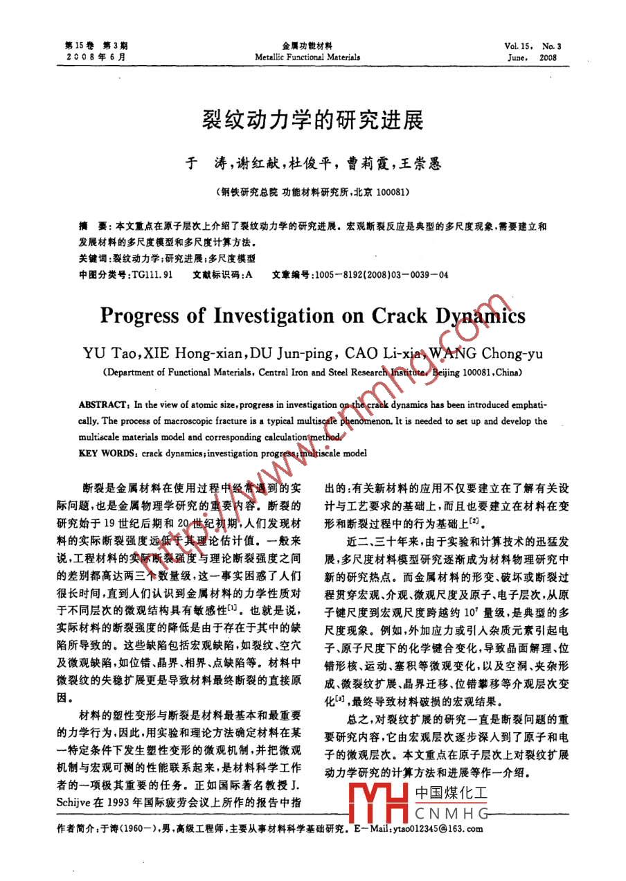 第15卷第3期金屬功能材料2008年6月Metallic Functionel MaterialJune, 2008裂紋動力學的研究進展于濤,謝紅獻,杜俊平,曹莉霞,王崇愚(鋼鐵研究總院功能材料研究所北京100081)摘要:本文重點在原子層次上介紹了裂紋動力學的研究進展。宏觀斷裂反應(yīng)是典型的多尺度現(xiàn)象,需要建立和發(fā)展材料的多尺度模型和多尺度計算方法關(guān)鍵詞:裂紋動力學;研究進展;多尺度模型中圖分類號:TG1191文獻標識碼:A文章編號:1005-8192(2008)03-0039-04Progress of Investigation on Crack DynamicsYU Tao, XIE Hong-xian, DU Jun-ping, CAO Li-xia, WANG Chong-yuDepartment of Functional Materials, Central Iron and Steel Research Institute, Beijing 100081, China)ABSTRACT: In the view of atomic size, progress in investigation on the crack dynamics has been introduced emphati-cally. The process of macroscopic fracture is a typical multiscale phenomenon. It is needed to set up and develop themultiscale materials model and corresponding calculation method.EY WORDS: crack dynamics; investigation progress; multiscale model斷裂是金屬材料在使用過程中經(jīng)常遇到的實出的:有關(guān)新材料的應(yīng)用不僅要建立在了解有關(guān)設(shè)際問題,也是金屬物理學研究的重要內(nèi)容。斷裂的計與工藝要求的基礎(chǔ)上,而且也要建立在材料在變研究始于19世紀后期和20世紀初期,人們發(fā)現(xiàn)材形和斷裂過程中的行為基礎(chǔ)上(2料的實際斷裂強度遠低于其理論估計值。一般來近二、三十年來,由于實驗和計算技術(shù)的迅猛發(fā)說,工程材料的實際斷裂強度與理論斷裂強度之間展,多尺度材料模型研究逐漸成為材料物理研究中的差別都高達兩三個數(shù)量級這一事實困惑了人們新的研究熱點。而金屬材料的形變破壞或斷裂過很長時間,直到人們認識到金屬材料的力學性質(zhì)對程貫穿宏觀、介觀、微觀尺度及原子、電子層次,從原于不同層次的微觀結(jié)構(gòu)具有敏感性,也就是說,子鍵尺度到宏觀尺度跨越約107量級,是典型的多實際材料的斷裂強度的降低是由于存在于其中的缺尺度現(xiàn)象。例如,外加應(yīng)力或引入雜質(zhì)元素引起電陷所導致的。這些缺陷包括宏觀缺陷如裂紋、空穴子原子尺度下的化學鍵合變化,導致晶面解理位及微觀缺陷如位錯、晶界、相界、點缺陷等。材料中錯形核、運動、塞積等微觀變化以及空洞夾雜形微裂紋的失穩(wěn)擴展更是導致材料最終斷裂的直接原成、微裂紋擴展、晶界遷移、位錯攀移等介觀層次變因化,最終導致材料破損的宏觀結(jié)果。材料的塑性變形與斷裂是材料最基本和最重要總之,對裂紋擴展的研究一直是斷裂問題的重的力學行為因此用實驗和理論方法確定材料在某要研究內(nèi)容它由宏觀層次逐步深入到了原子和電一特定條件下發(fā)生塑性變形的微觀機制,并把微觀子的微觀層次。本文重點在原子層次上對裂紋擴展機制與宏觀可測的性能聯(lián)系起來是材料科學工作動力學研究的計算方法和進展等作一介紹者的一項極其重要的任務(wù)。正如國際著名教授J中國煤化工Schijve在1993年國際疲勞會議上所作的報告中指CNMHG作者簡介:于濤(1960-),男,高級工程師主要從事材料科學基礎(chǔ)研究.E- Mail: ytaol012345@163.cm金屬功能材料2008年1計算方法我們討論的韌性一脆性轉(zhuǎn)變是指材料由于溫度降低導致的由韌性斷裂轉(zhuǎn)變?yōu)榇嘈詳嗔训牧W現(xiàn)國際學術(shù)界近年來取得的幾項研究成果為材料象,這是材料使用中的一個十分重要的問題。1990微觀力學行為的研究奠定了基礎(chǔ):(1)Rce·提出了年, Cheng和Yip采用鑲嵌原子勢,運用應(yīng)力邊位錯發(fā)射不穩(wěn)定堆垛能y這一固體物理參數(shù),用來界條件,模擬研究了aFe100](011)裂紋在不同溫描述裂紋尖端的位錯發(fā)射;(2)微觀實驗技術(shù)的重要度條件下的裂紋擴展狀態(tài),原子體系包含了2400到突破0,已實現(xiàn)了原子分辨率的觀察和測量,為原3000個原子。結(jié)果表明,當溫度為200K時,裂紋解子尺度微觀力學理論分析提供了實驗數(shù)據(jù);(3)鑲嵌理擴展;當溫度達到400K時,裂尖附近出現(xiàn)刃型位原子法的提出為原子多體勢理論注入了活力,錯,并且裂尖明顯張開,這都是韌性斷裂的典型特它為描述原子尺度的微觀現(xiàn)象提供了有力工具。另征。他們得出結(jié)論:脆一韌轉(zhuǎn)變發(fā)生的機制是由于外,大容量高速電子計算機的出現(xiàn),為計算微觀力學裂尖的位錯發(fā)射及對應(yīng)于裂紋取向的特殊滑移系的提供了計算工具,使大規(guī)模的計算成為可能。激活。隨后, Cheng和Yip用MD方法研究了<微觀領(lǐng)域往往研究單個粒子的行為,宏觀性質(zhì)100>110),<100>{100}和<110>{100}三種裂是大量粒子的綜合行為。解決由大量原子組成的非紋取向的aFe的韌一脆轉(zhuǎn)變行為。低溫時(200K線性多體動力學問題可采用分子動力學方法及其以下溫度),三種裂紋模型均呈現(xiàn)脆性行為,解( molecular dynamics簡稱MD方法)。MD方法能理發(fā)生于{100}或{110}平面上。當溫度升高超過韌夠準確地再現(xiàn)宏觀性質(zhì),同時又儲藏了大量的微觀脆轉(zhuǎn)變溫度時,觀察到大量的位錯發(fā)射出來,同時信息,因此,它是聯(lián)系宏觀尺度和微觀尺度的重要工伴隨著裂尖的鈍化。另外,對于<110>{100}裂紋具。目前,分子動力學方法已經(jīng)與蒙特卡羅方法一取向,還觀察到了局域結(jié)構(gòu)轉(zhu